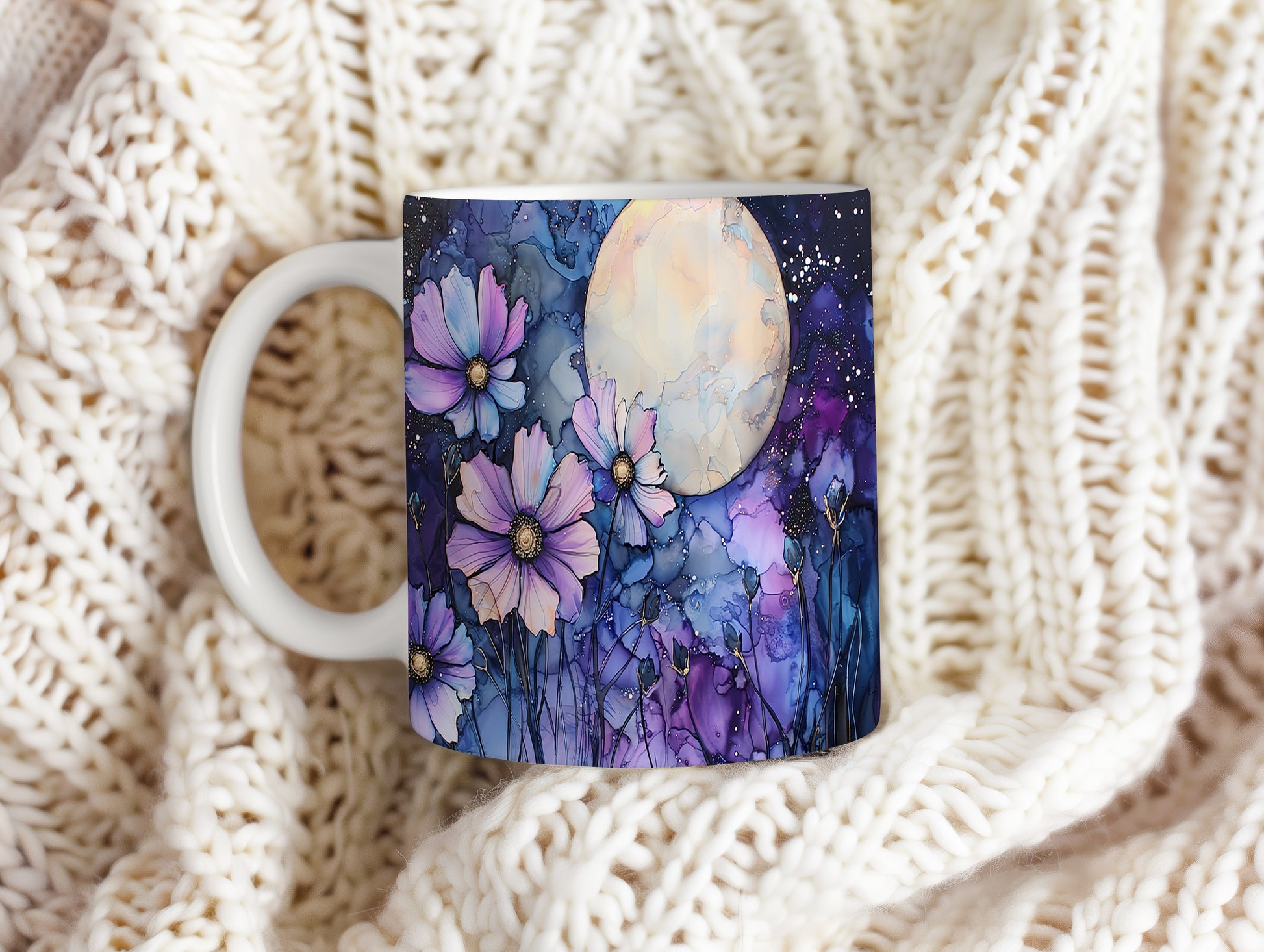 Hrnek s květinovým motivem a měsícem v noční obloze