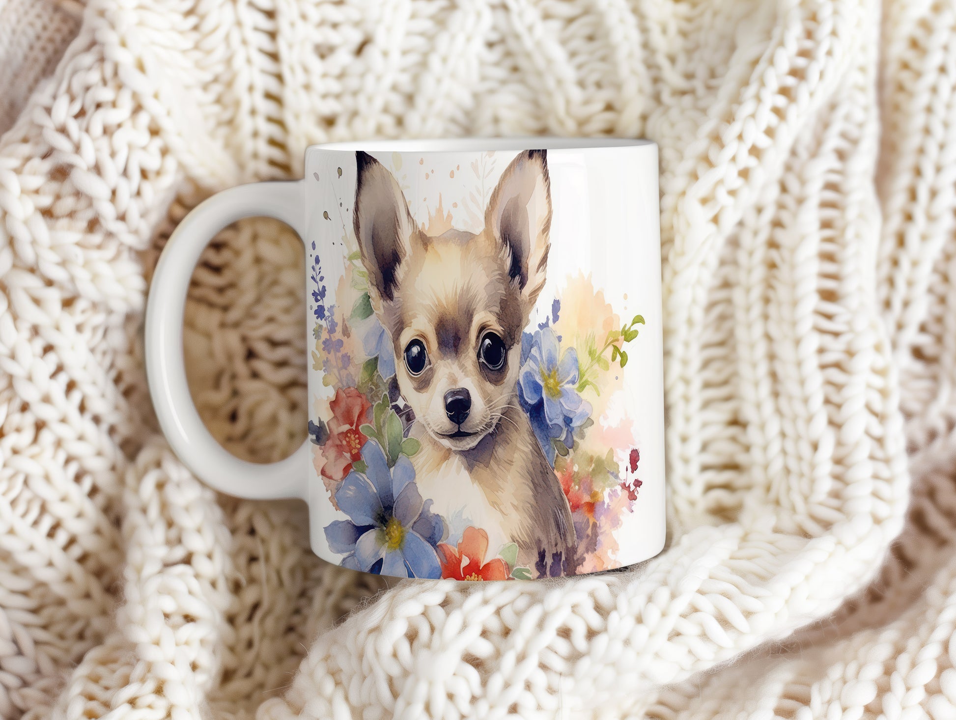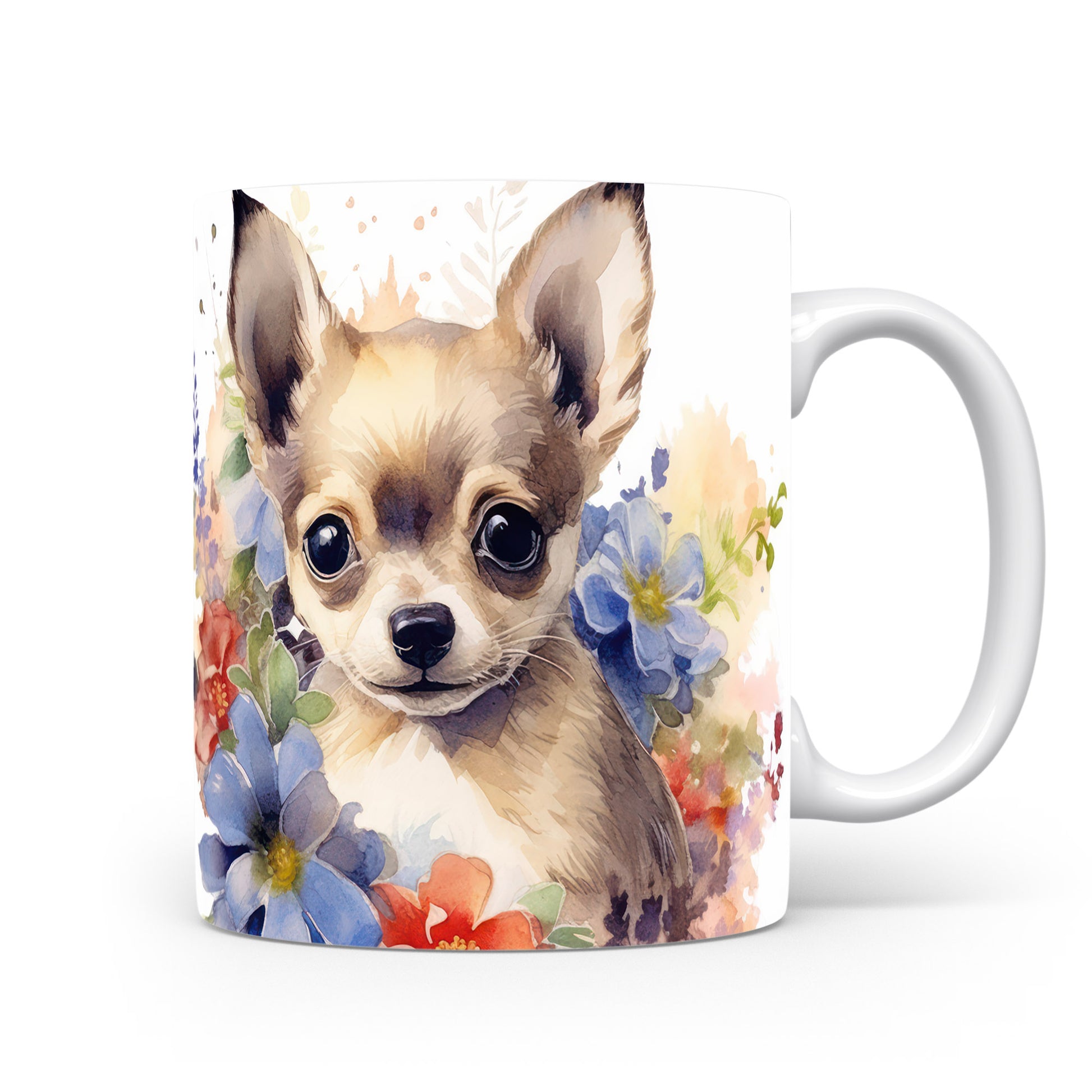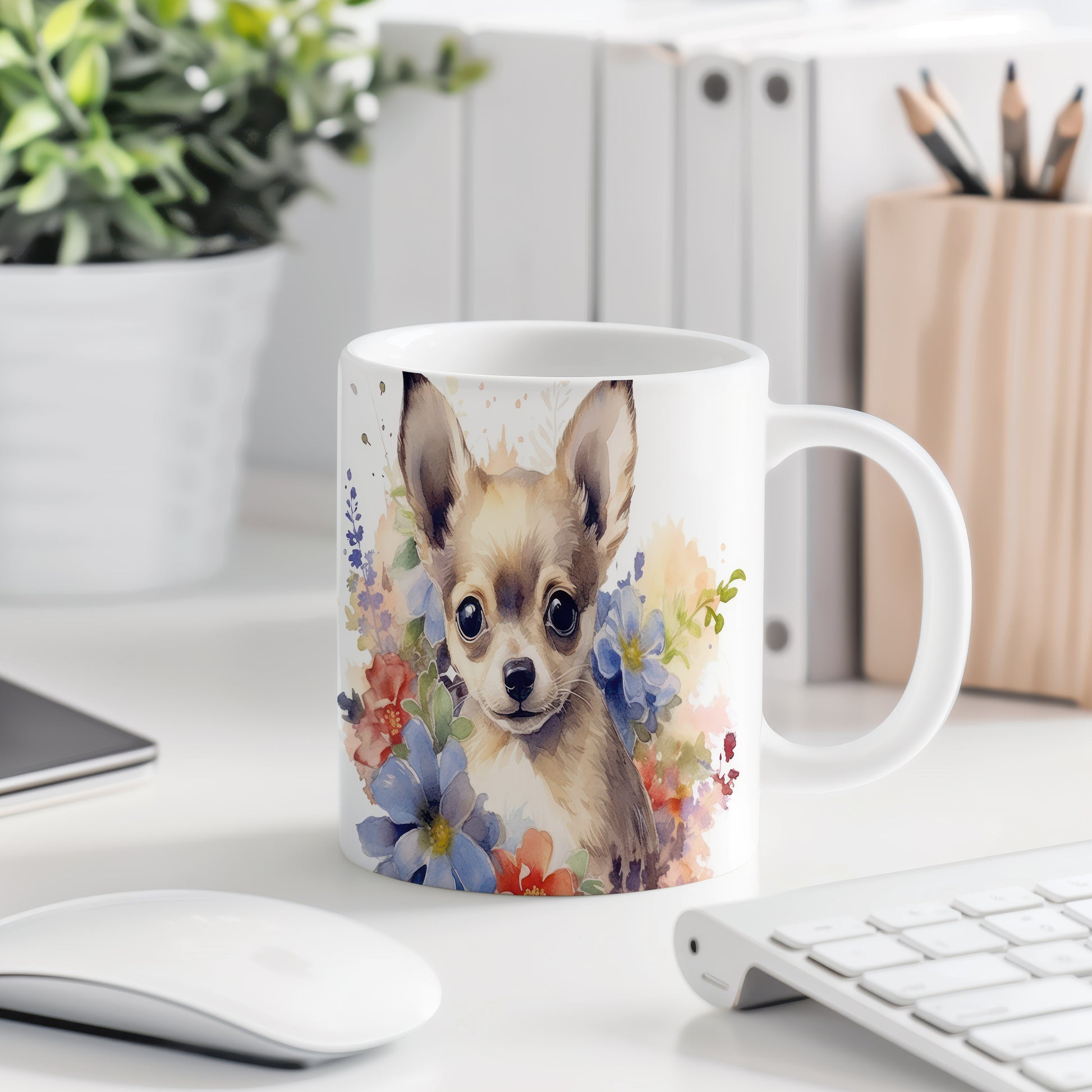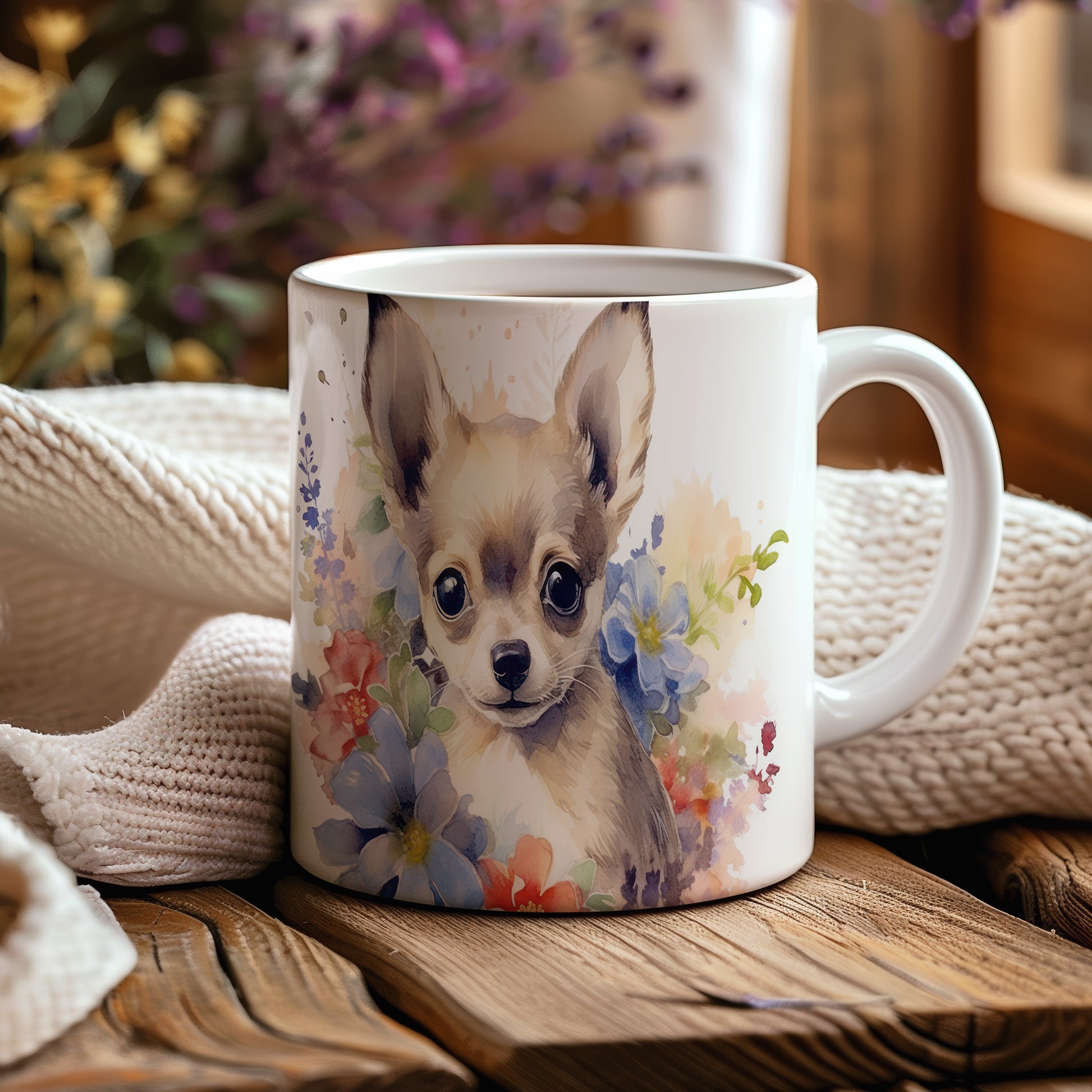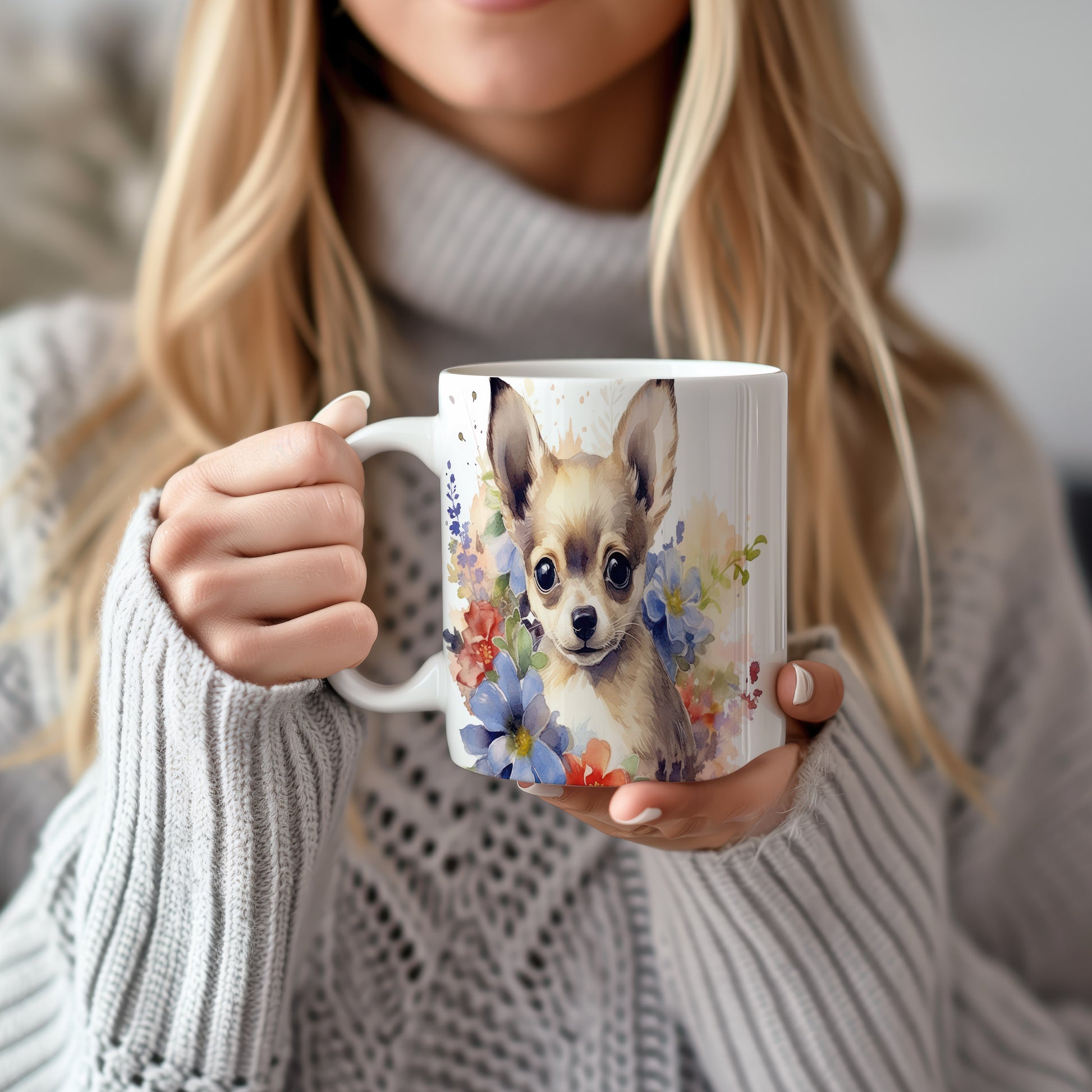 Tento hrnek s nádherným motivem čivavy a barevných květin přinese radost do každého dne. Ideální jako dárek pro milovníky psů a stylové doplnění vaší kuchyně.