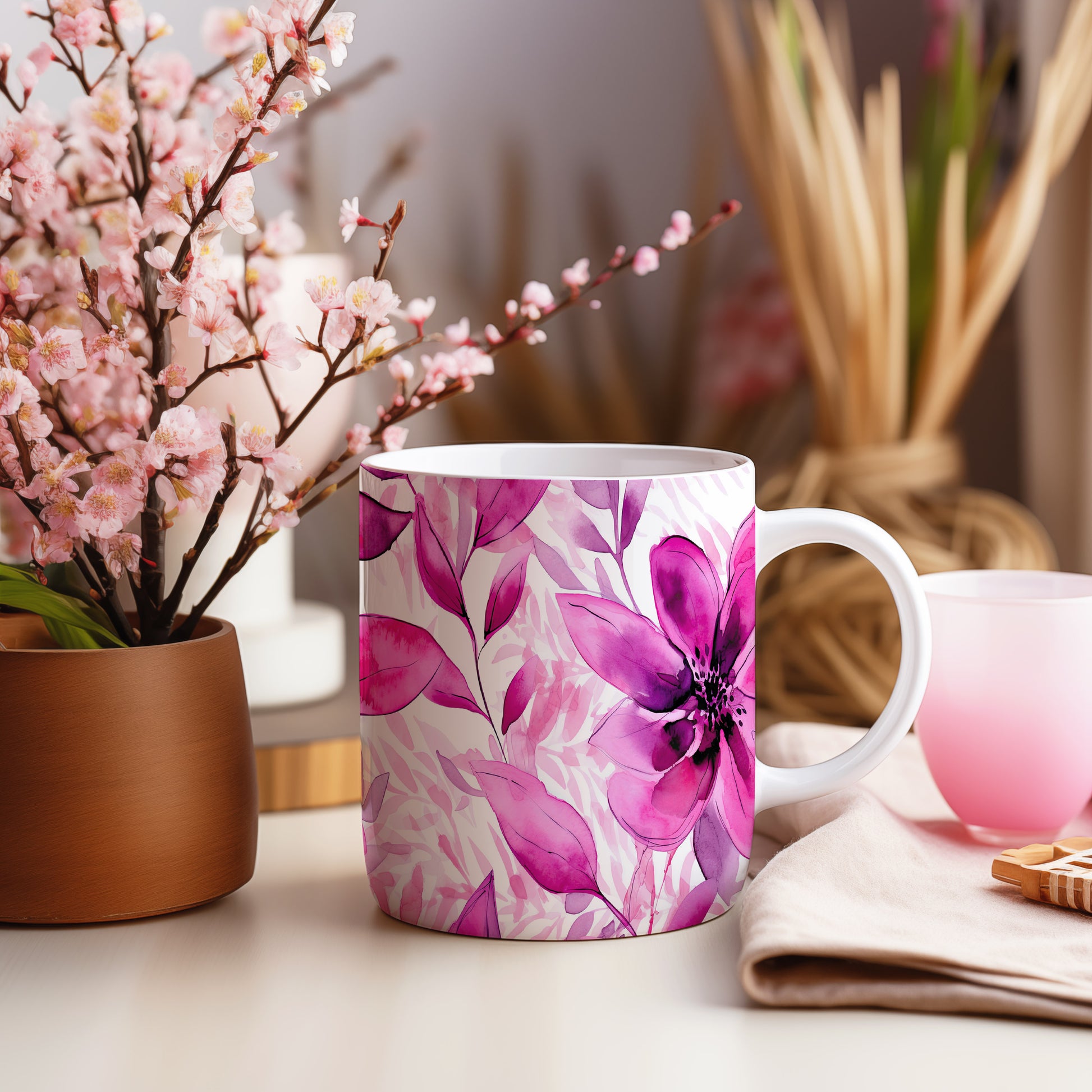 Elegantní hrnek s květinovým motivem v růžových tónech