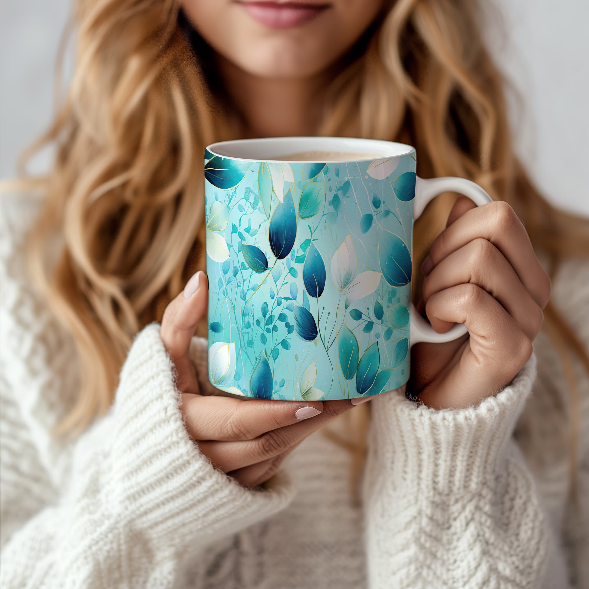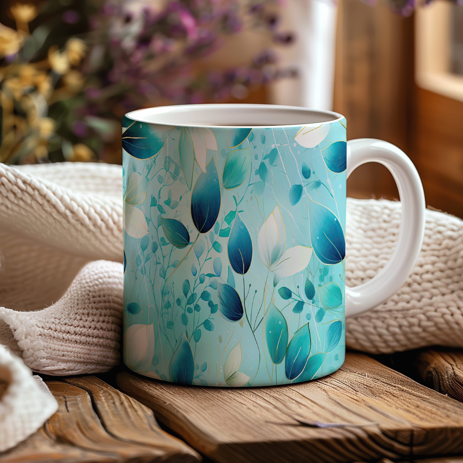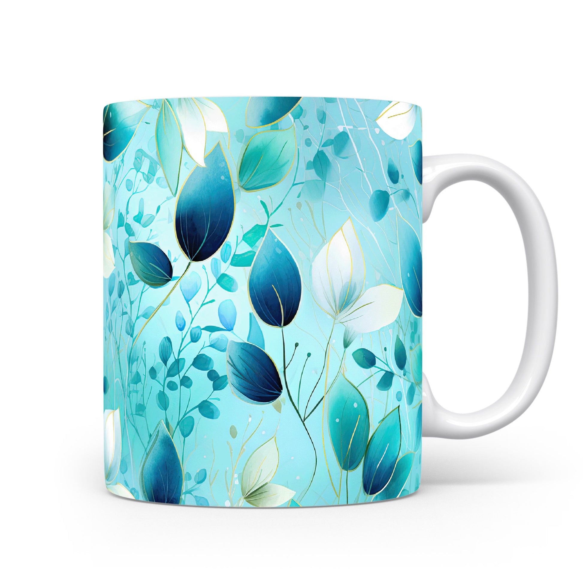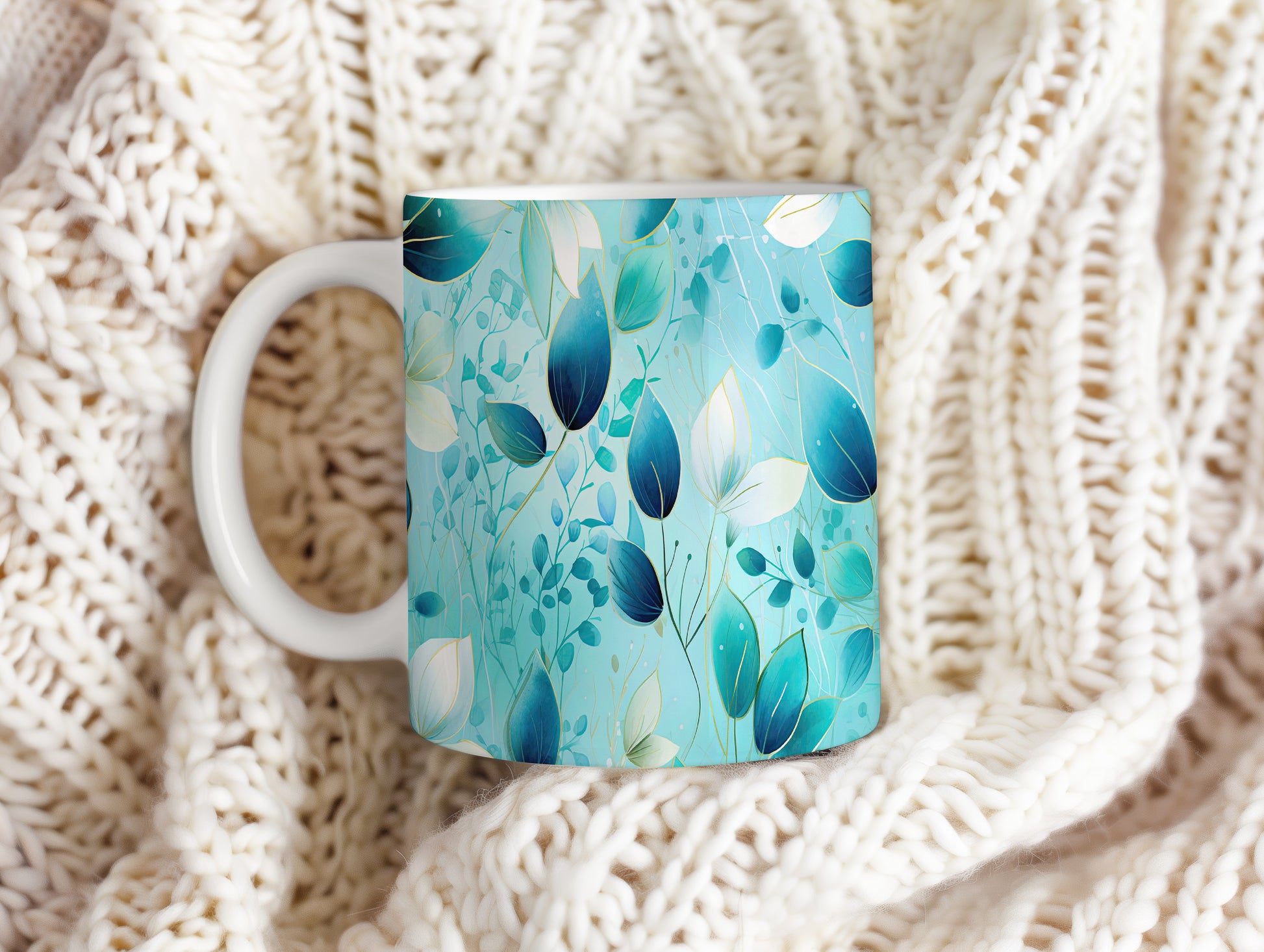 Hrnek s akvarelovými listy v modrých a zelených tónech