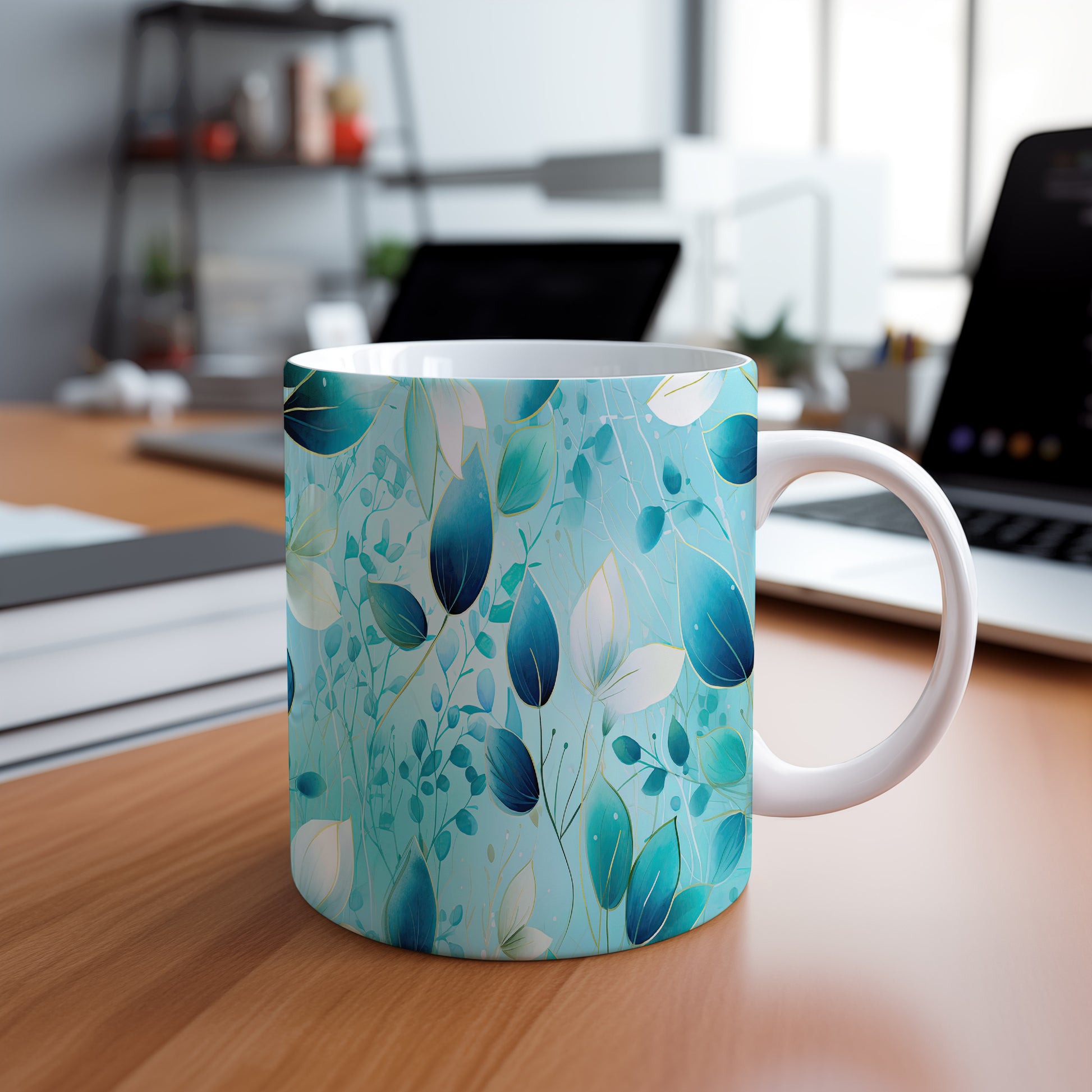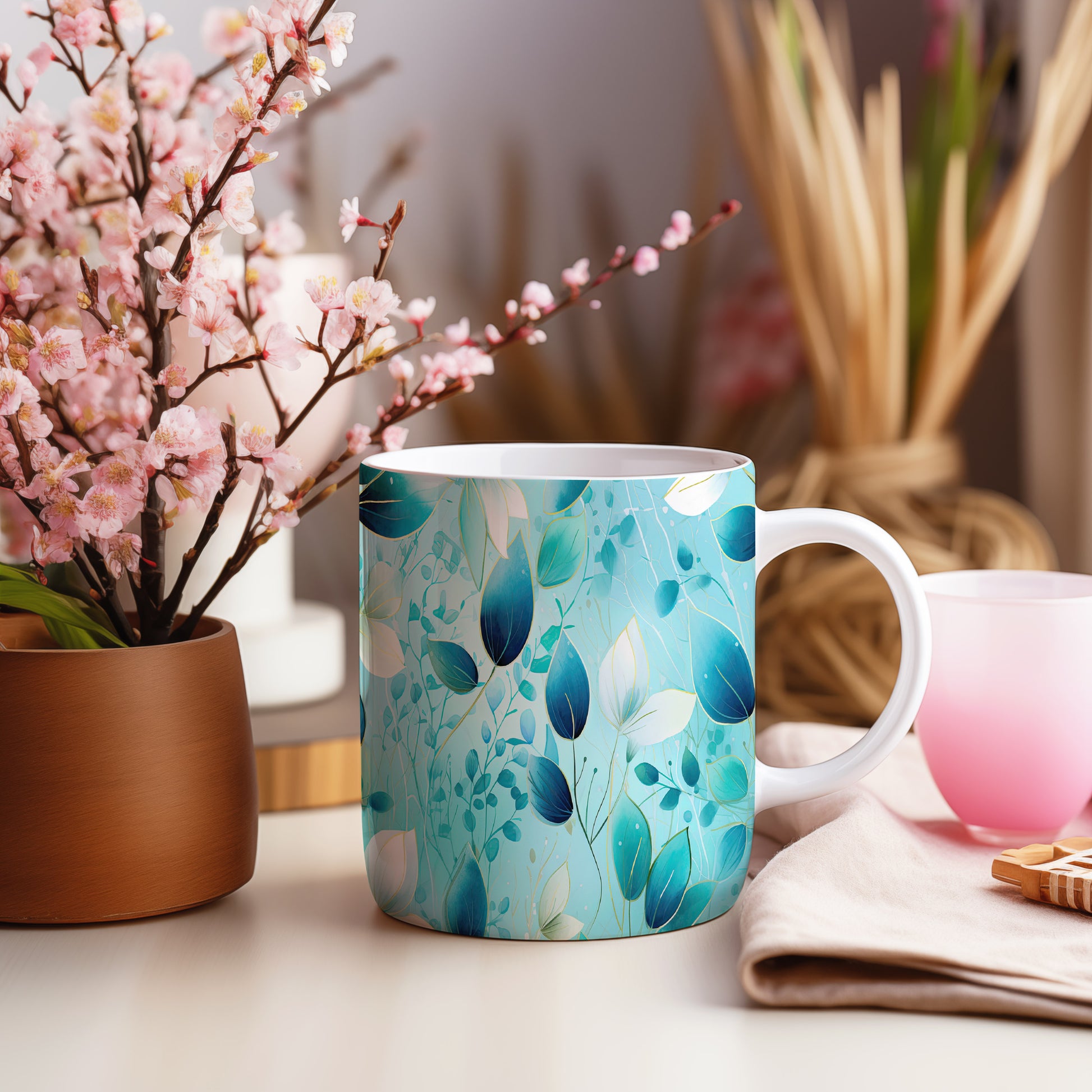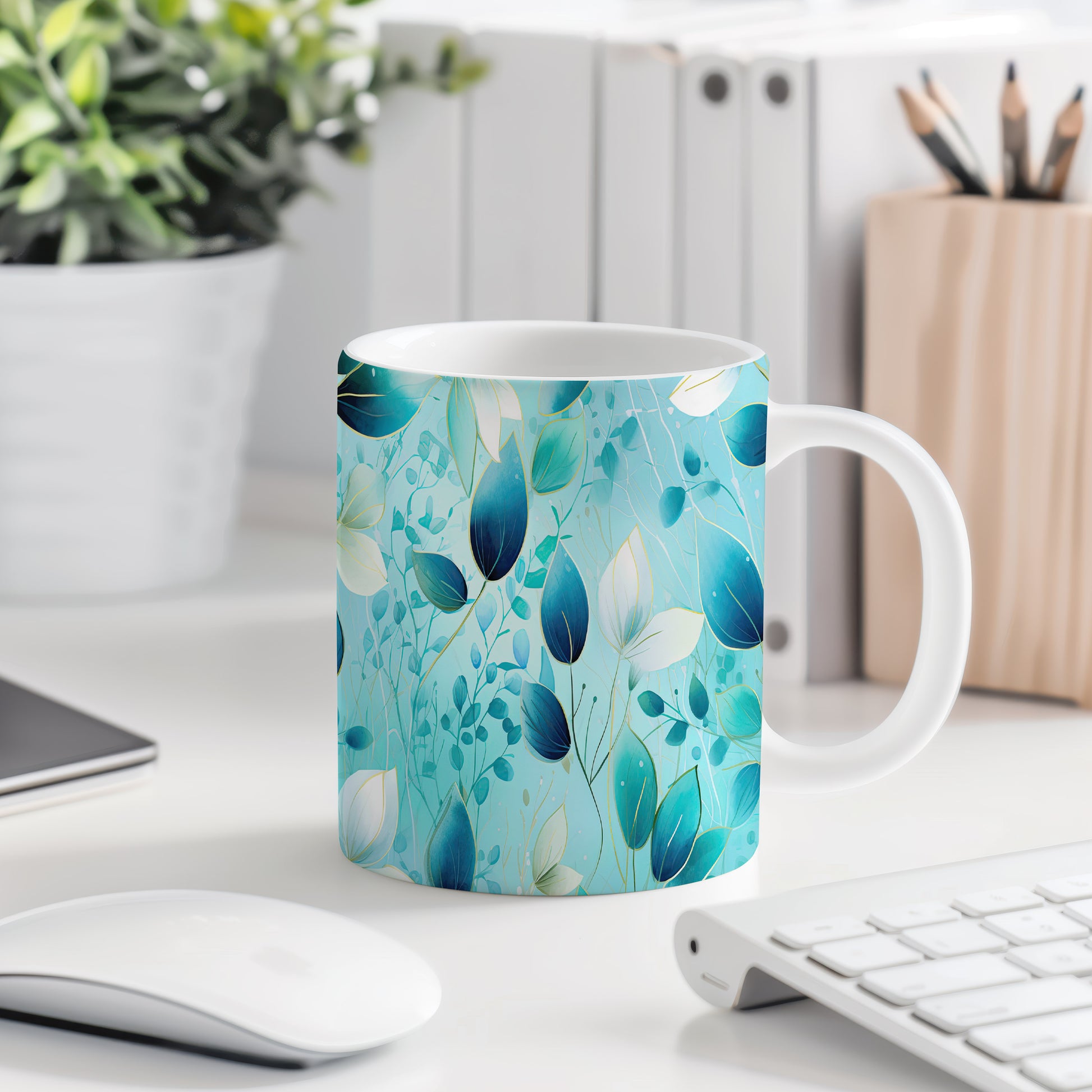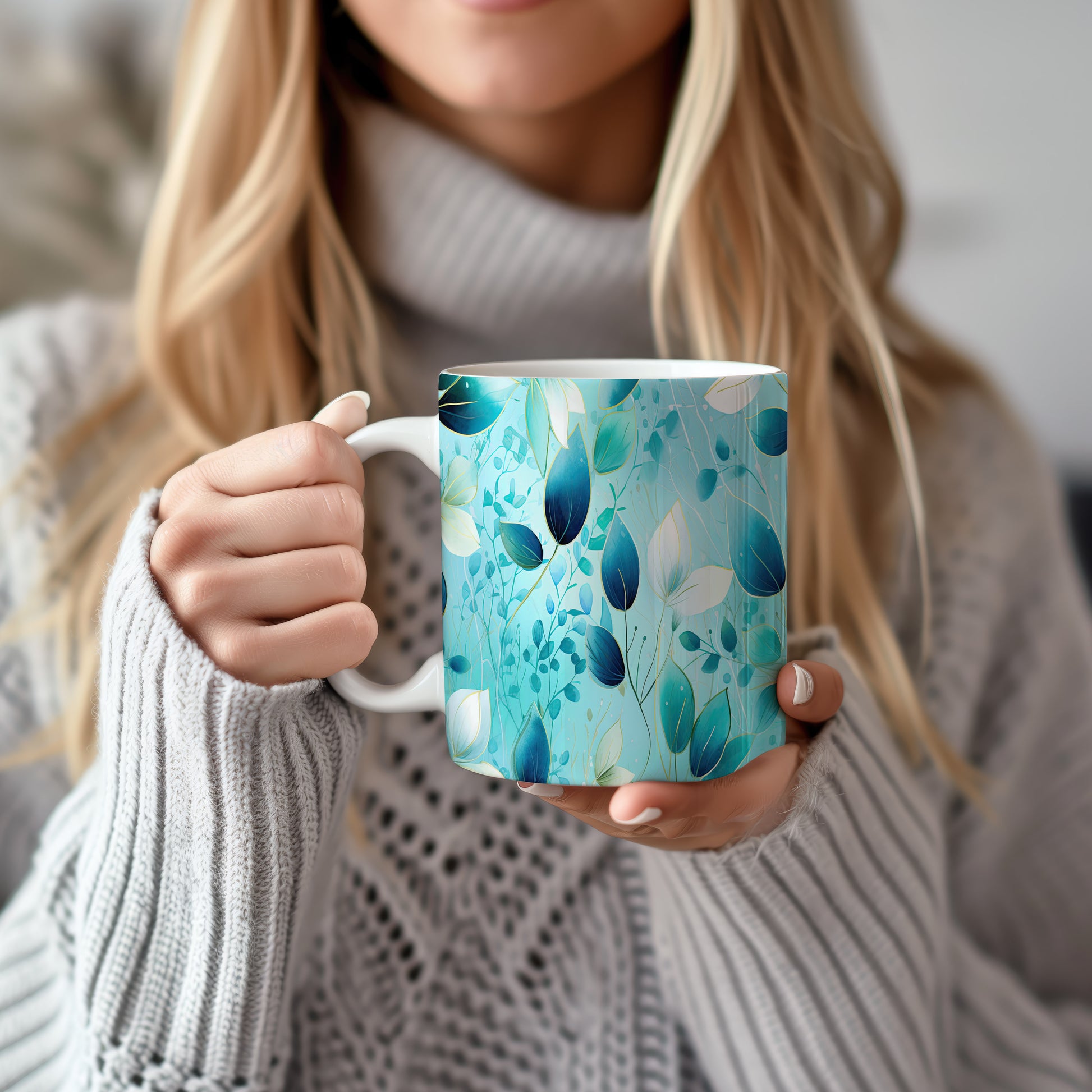 Hrnek s akvarelovými listy v modrých a zelených tónech