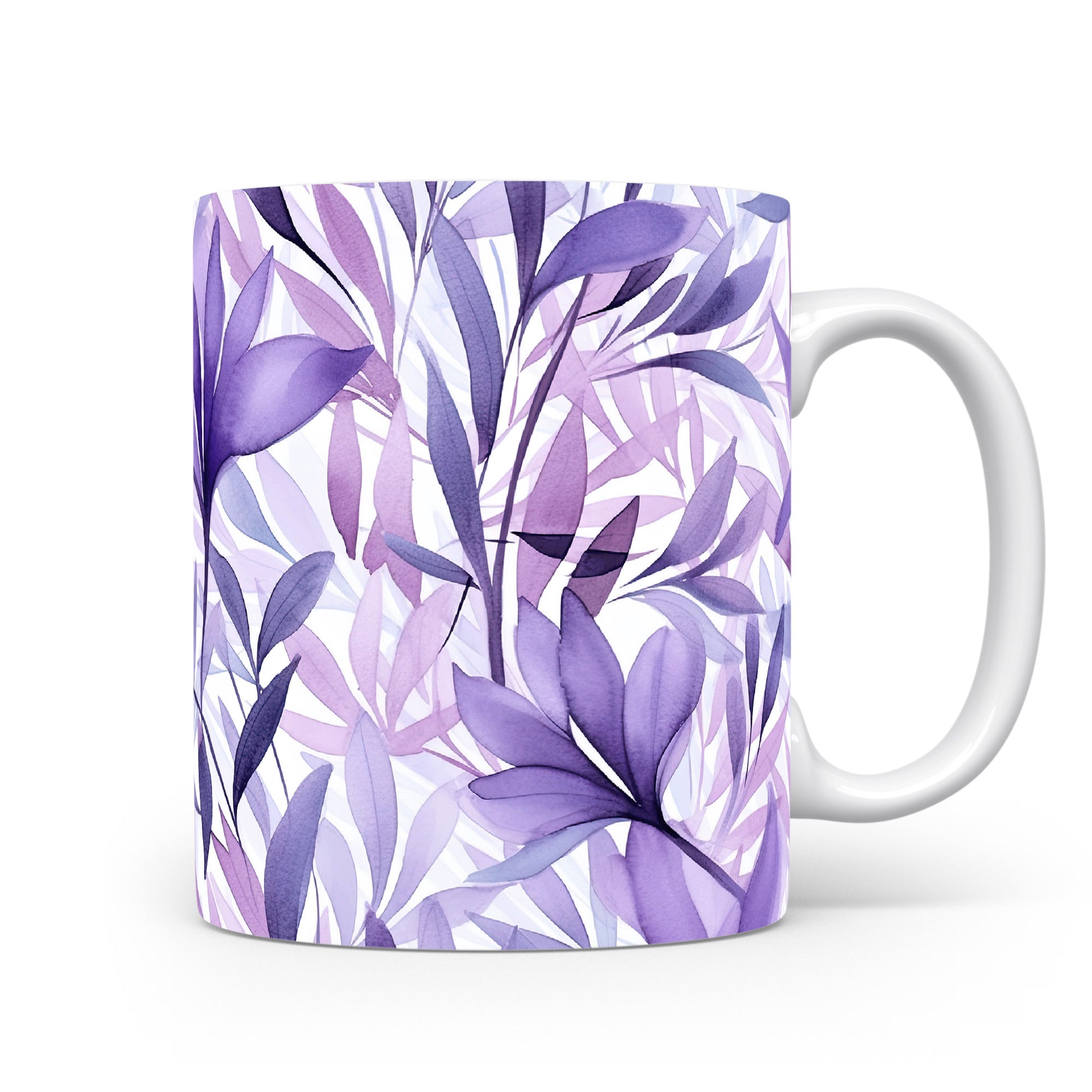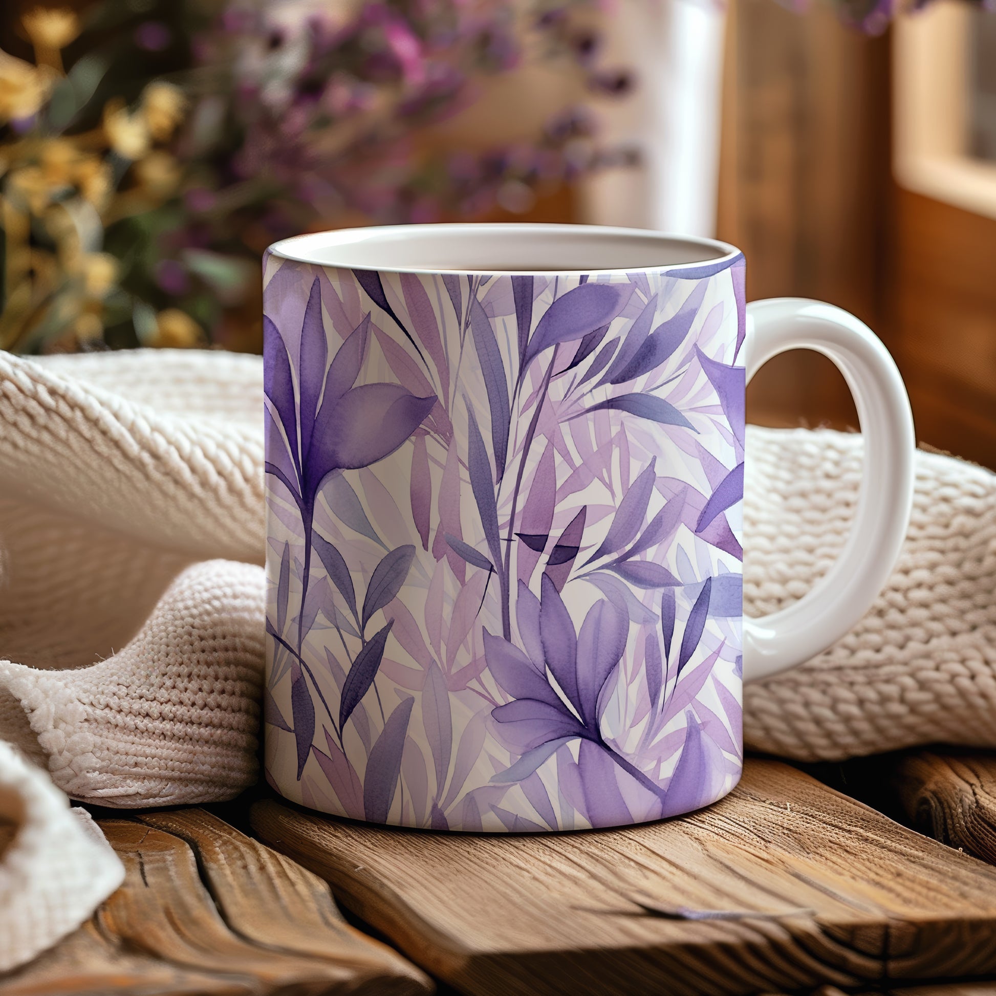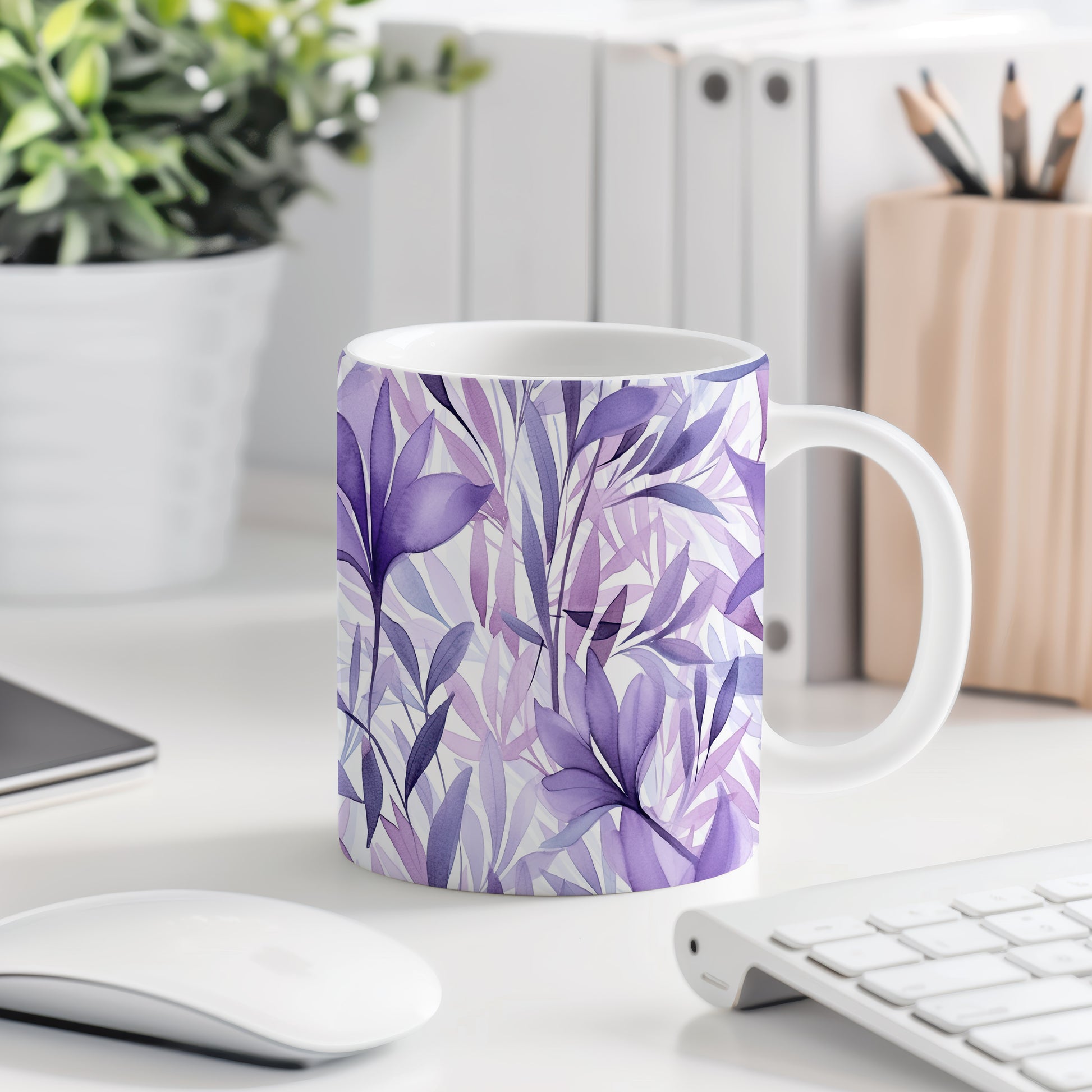 Hrnek s akvarelovými listy ve fialových tónech