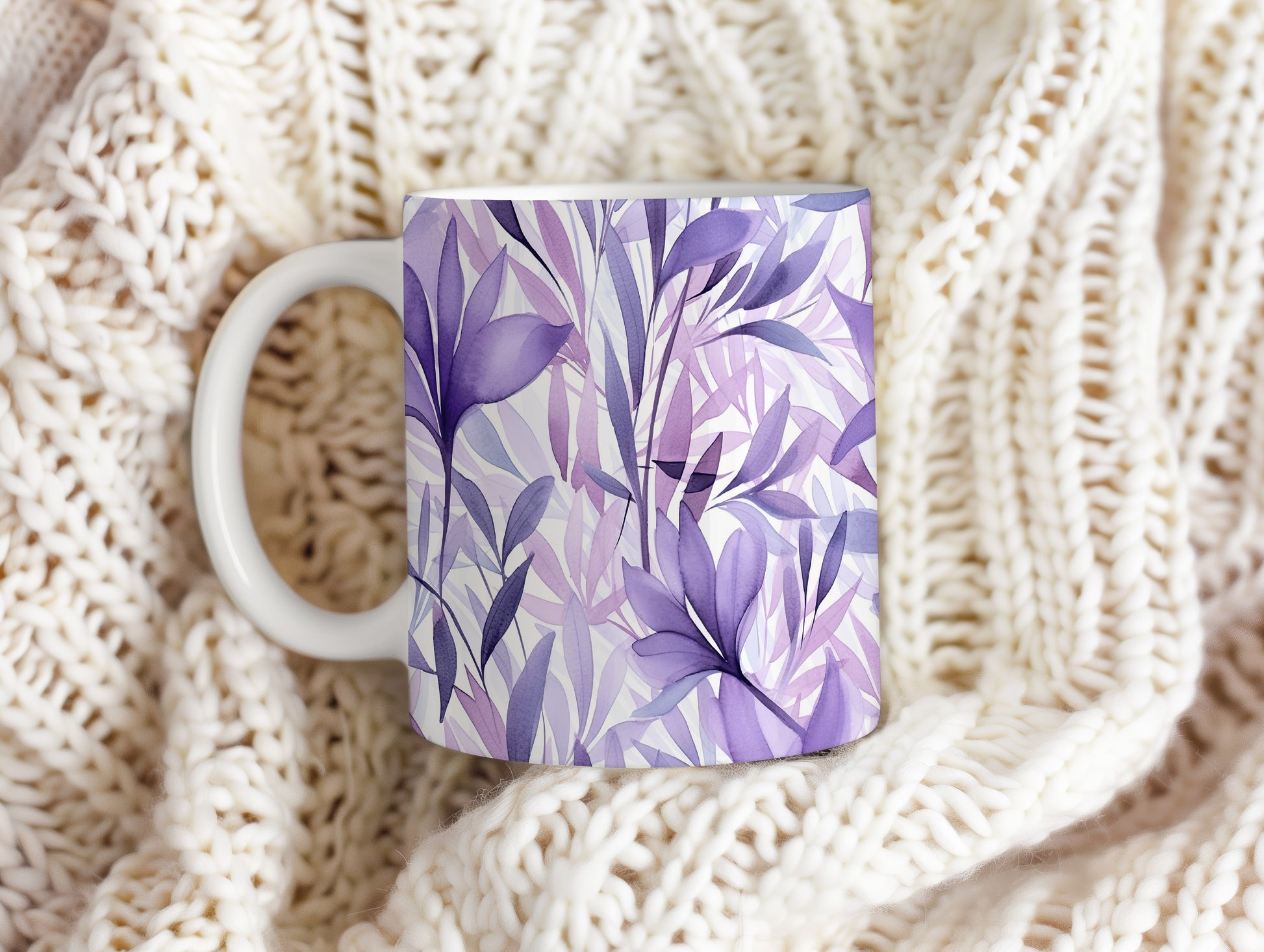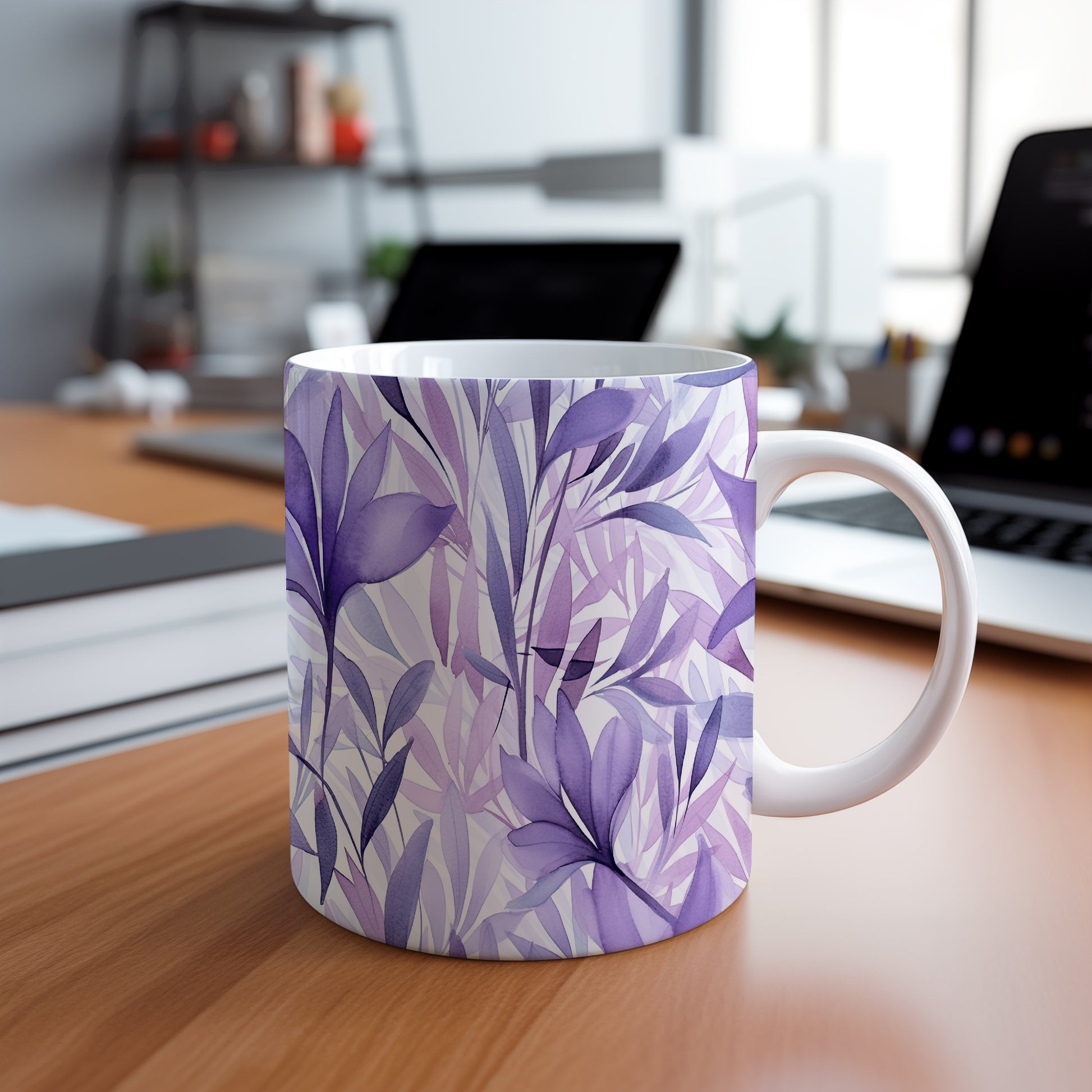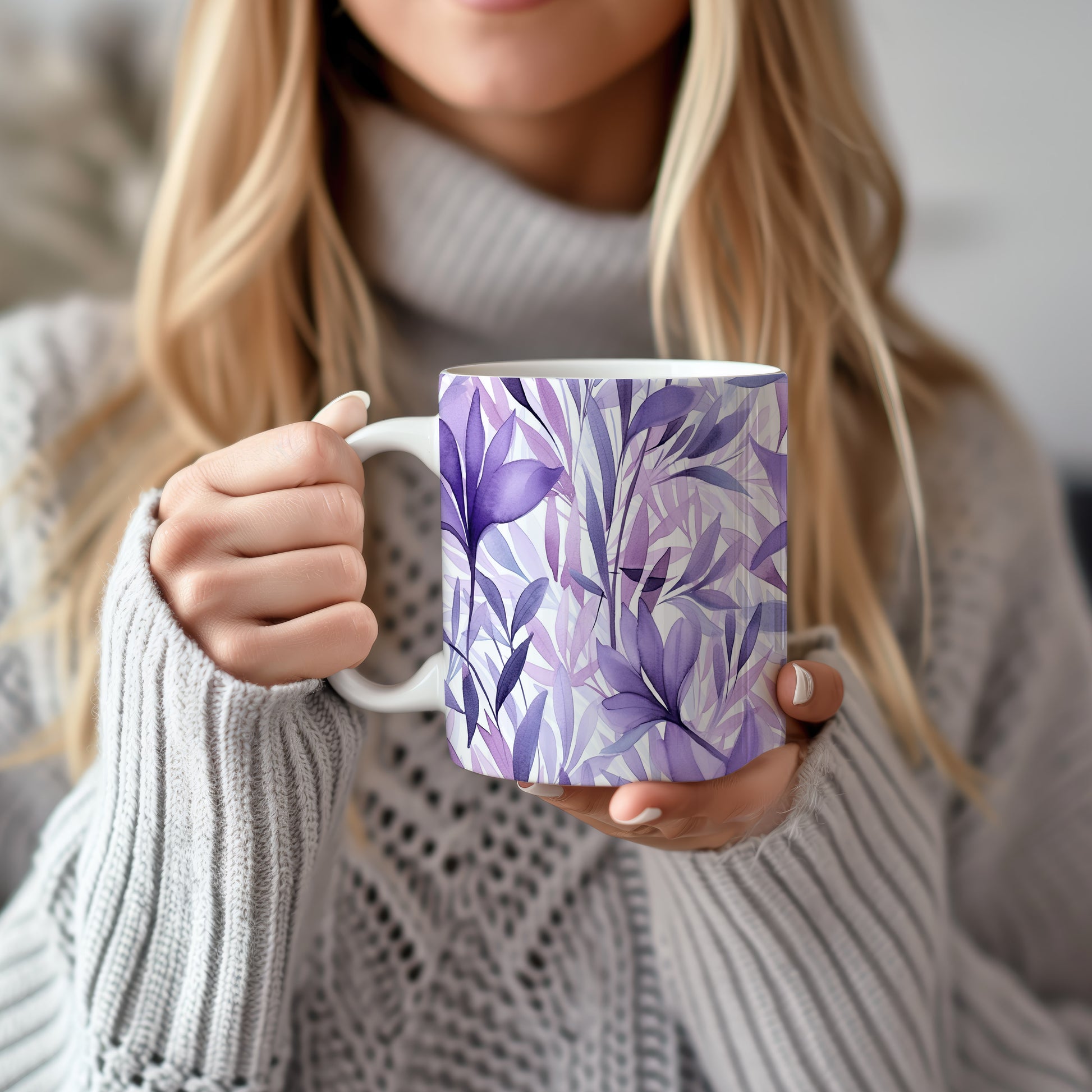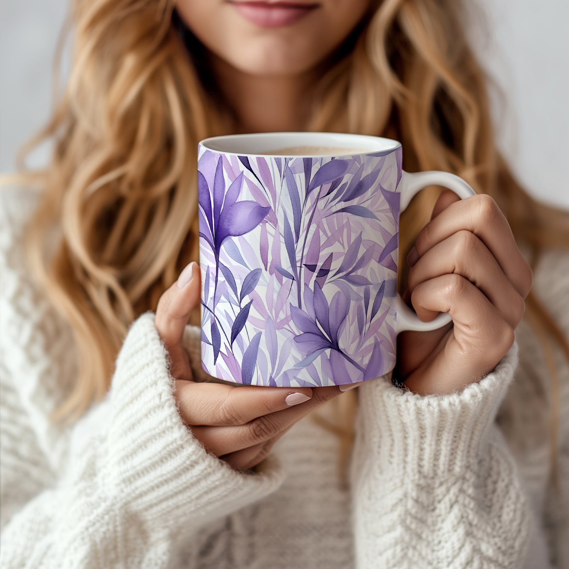 Hrnek s akvarelovými listy ve fialových tónech