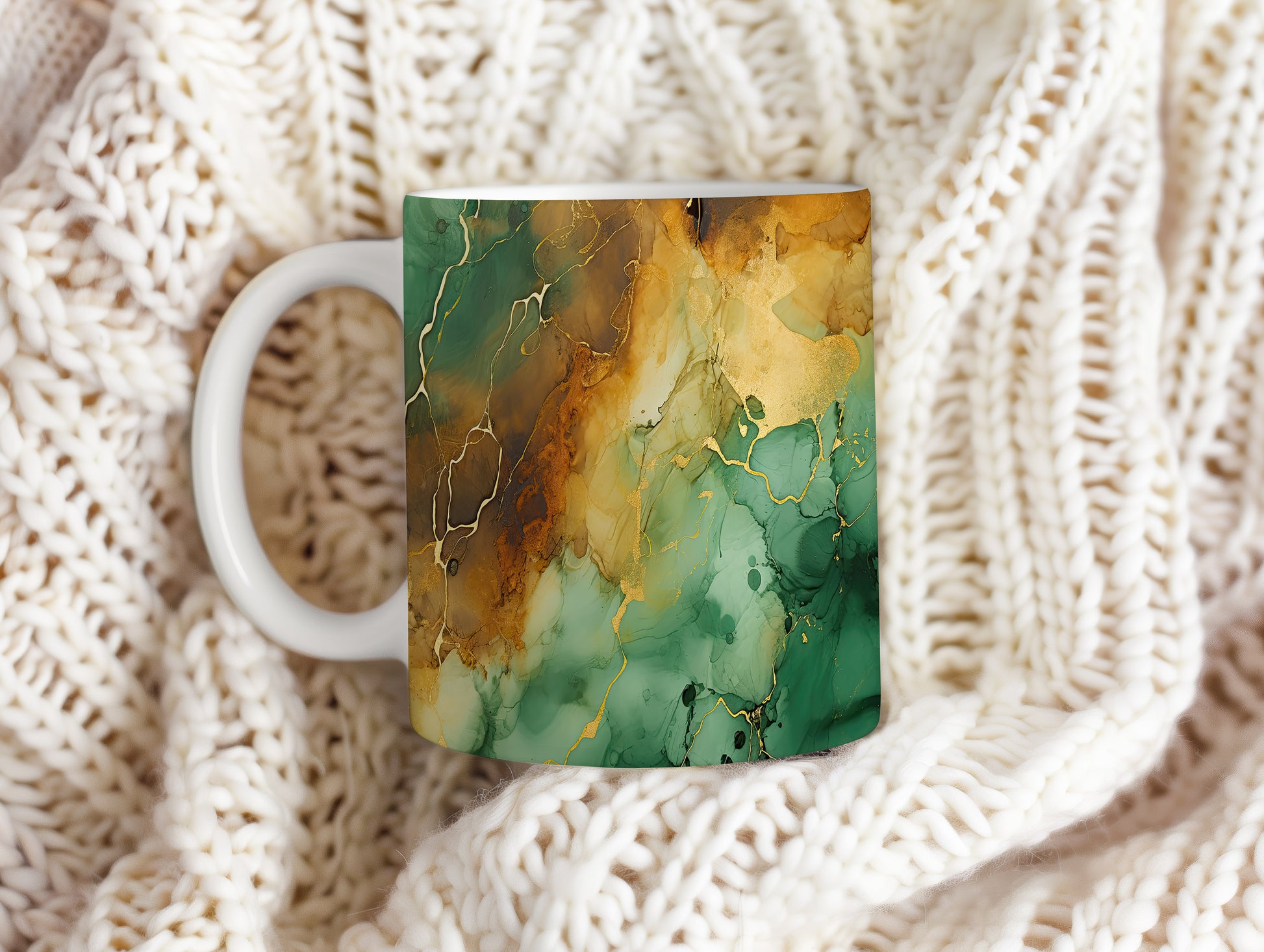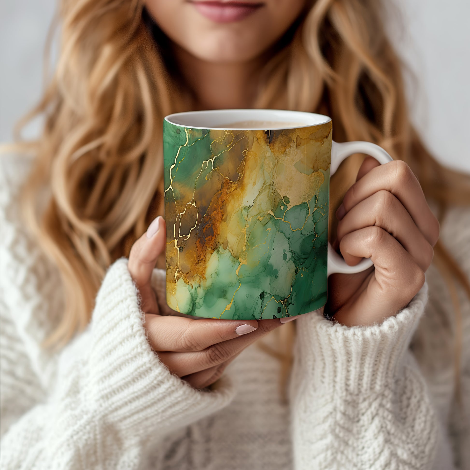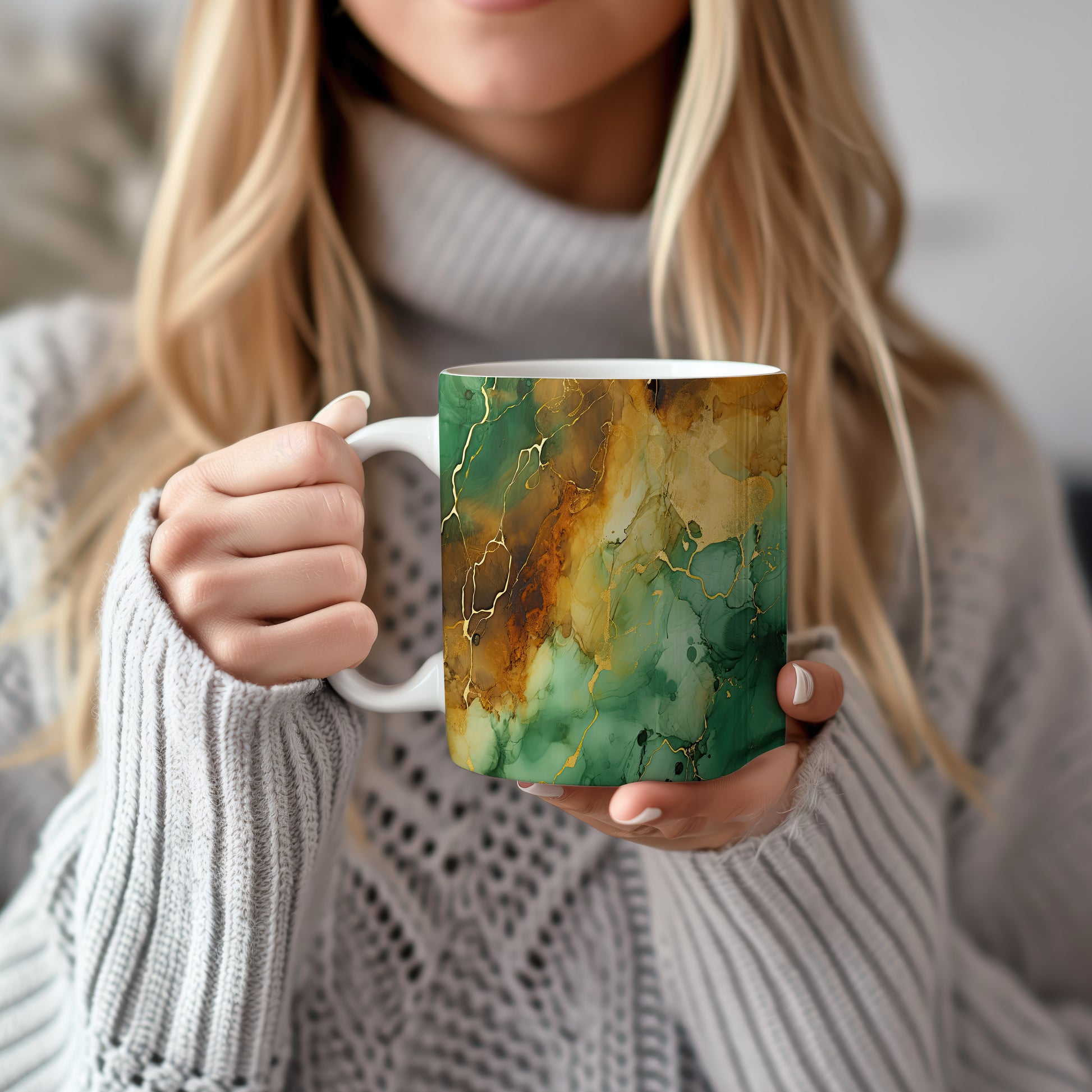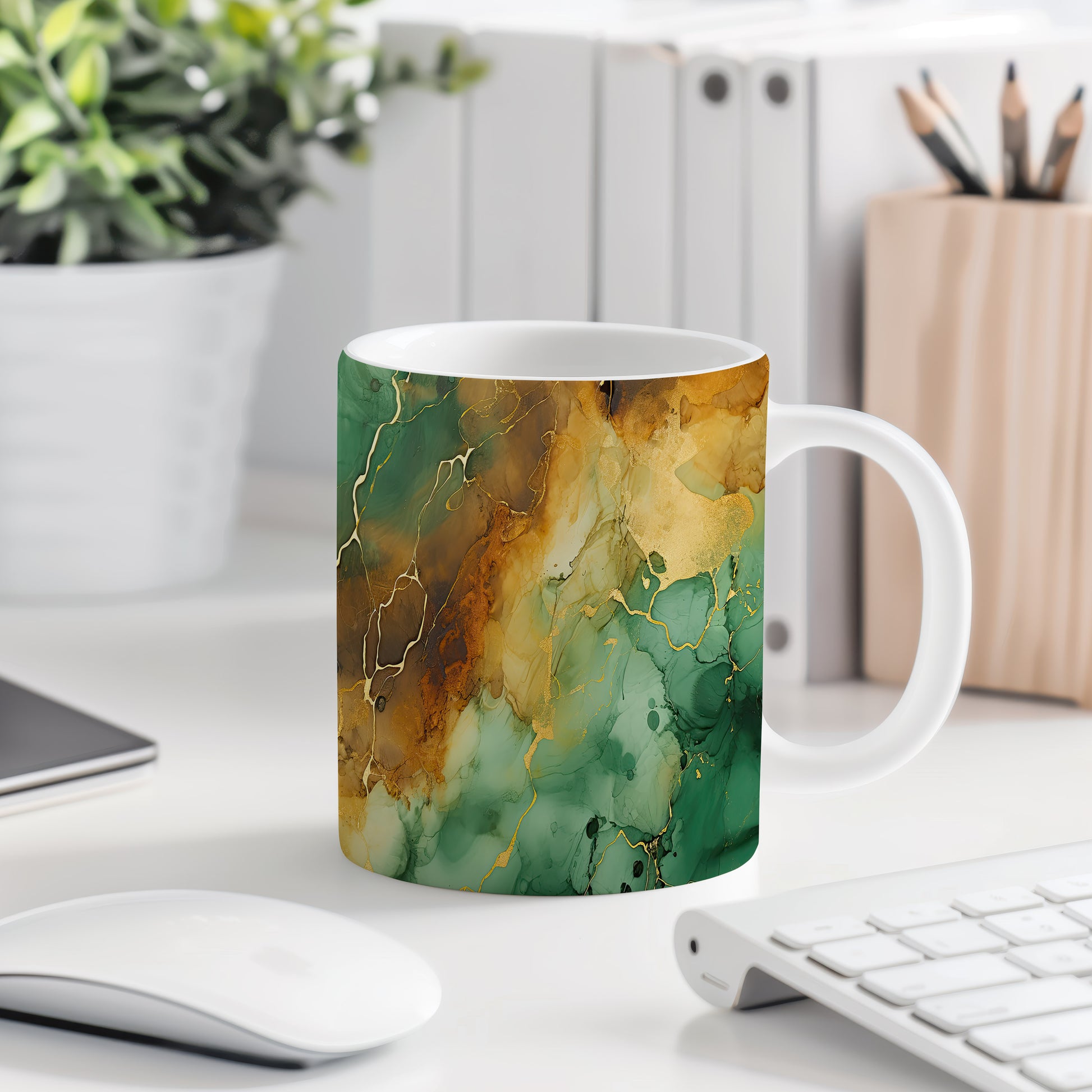 Hrnek s akvarelovými mozaikami v zelených a zlatých tónech