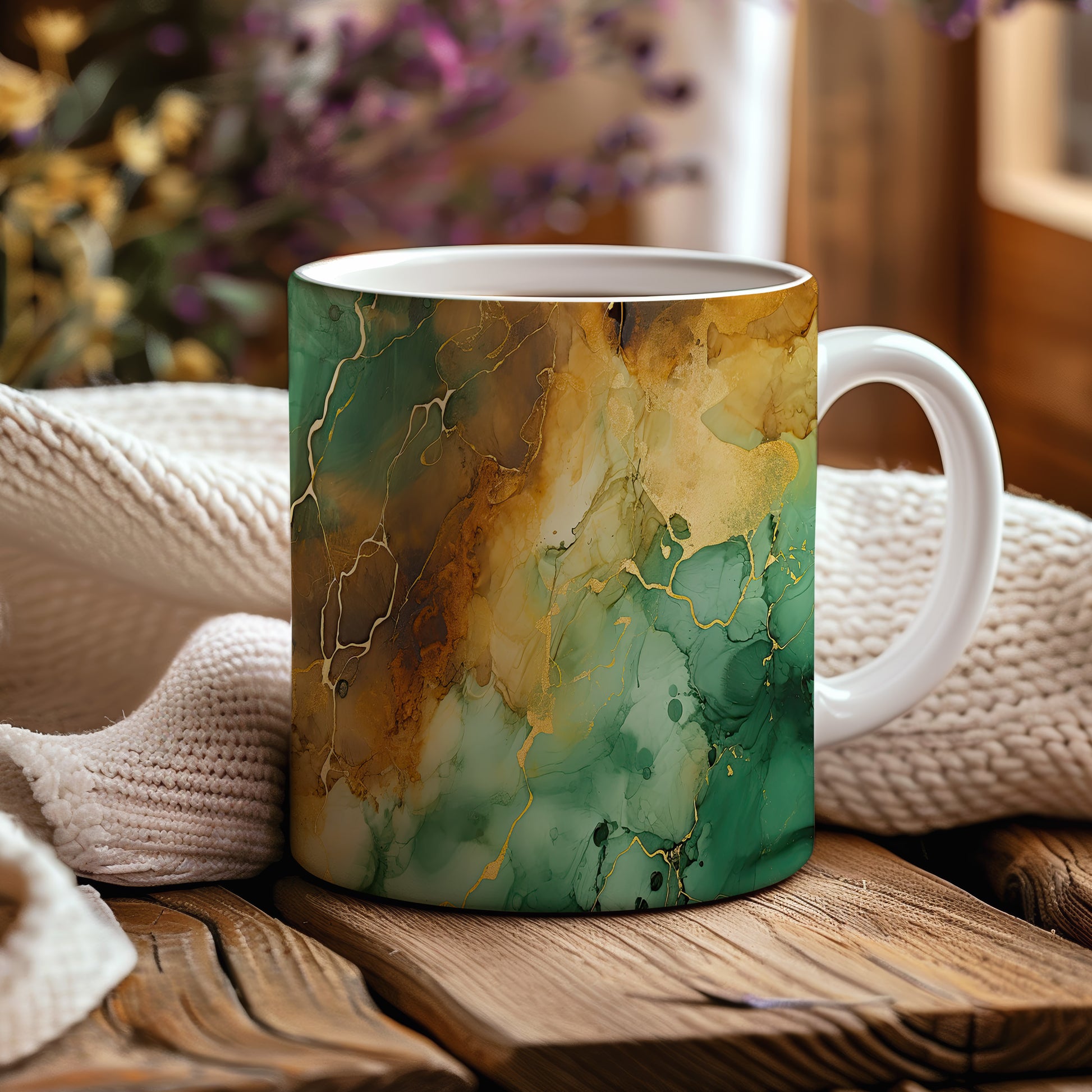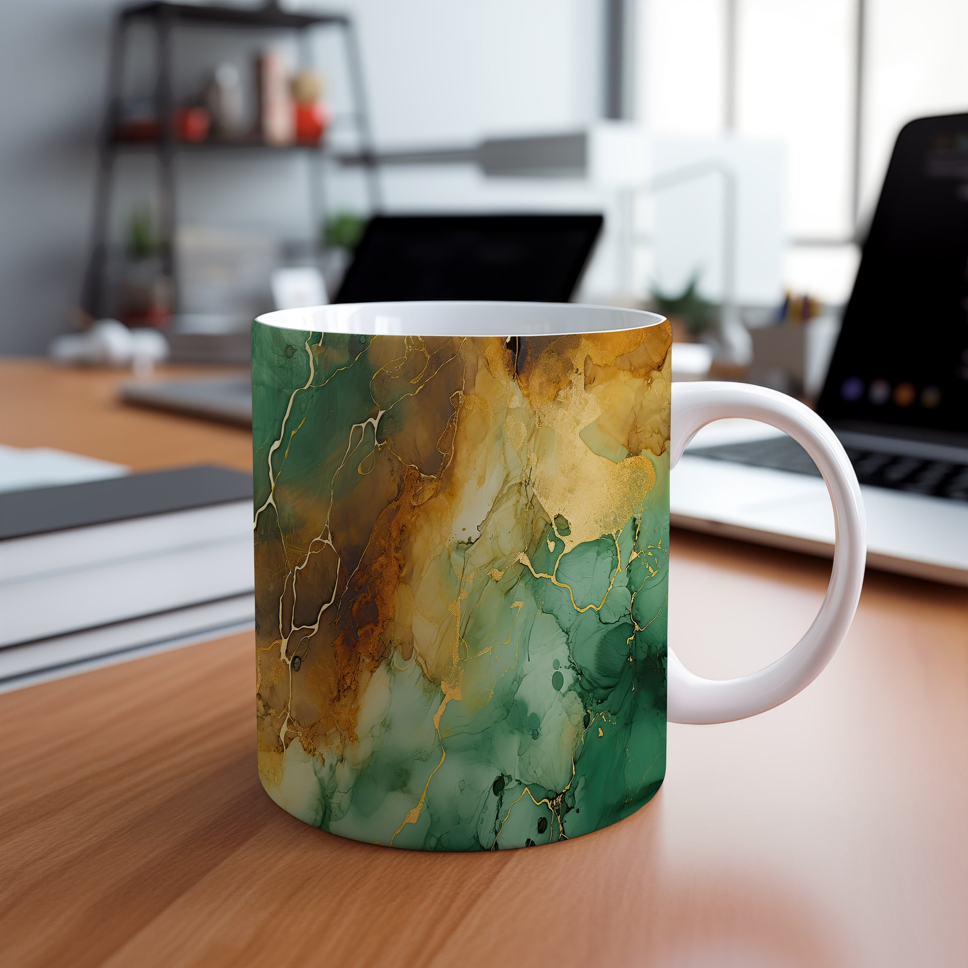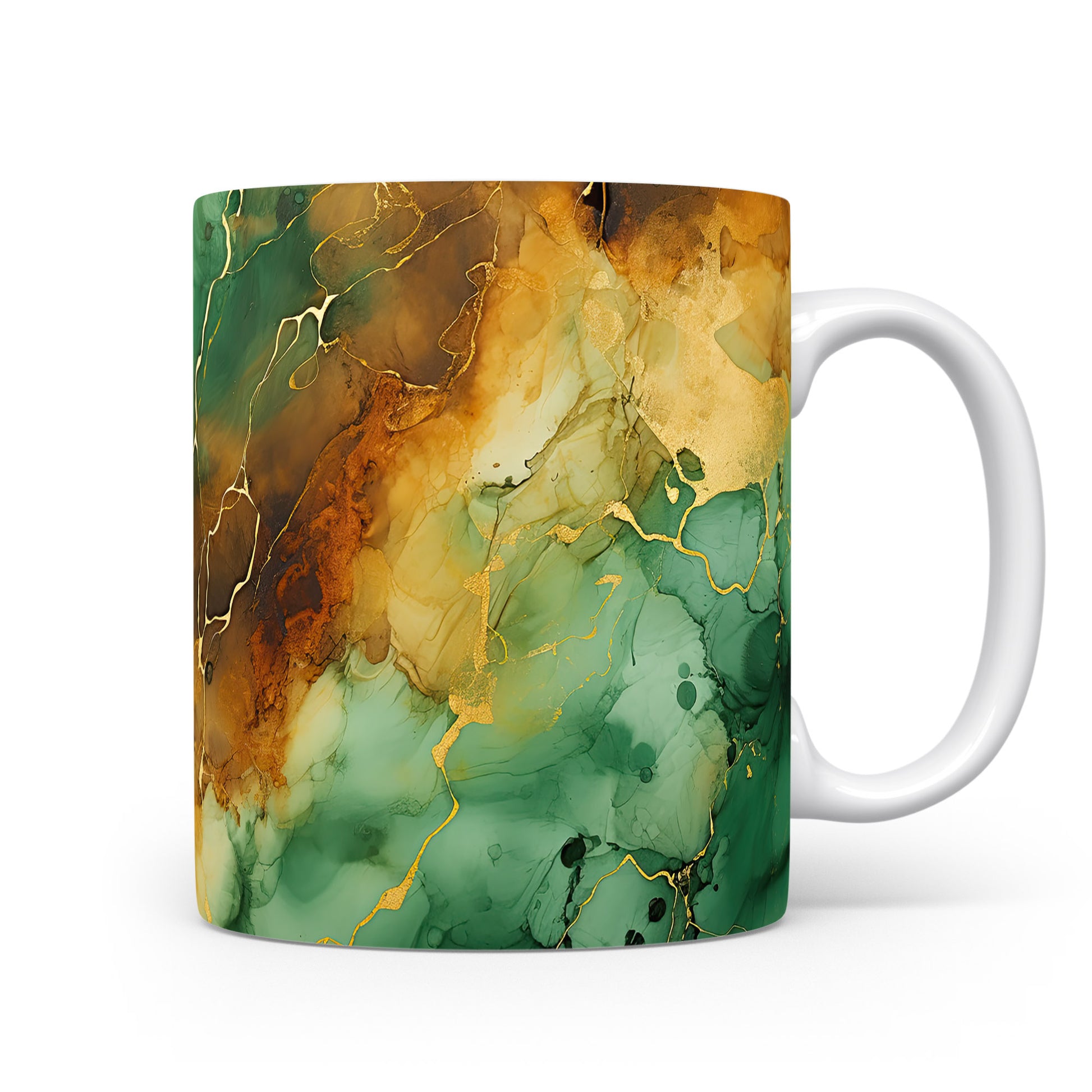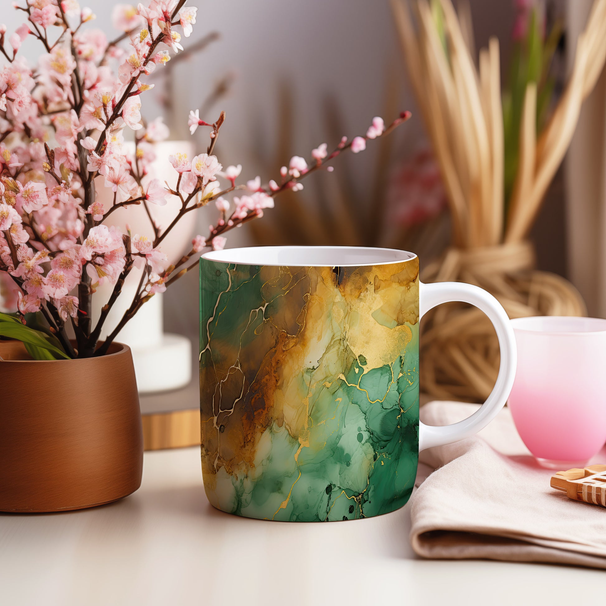 Hrnek s akvarelovými mozaikami v zelených a zlatých tónech