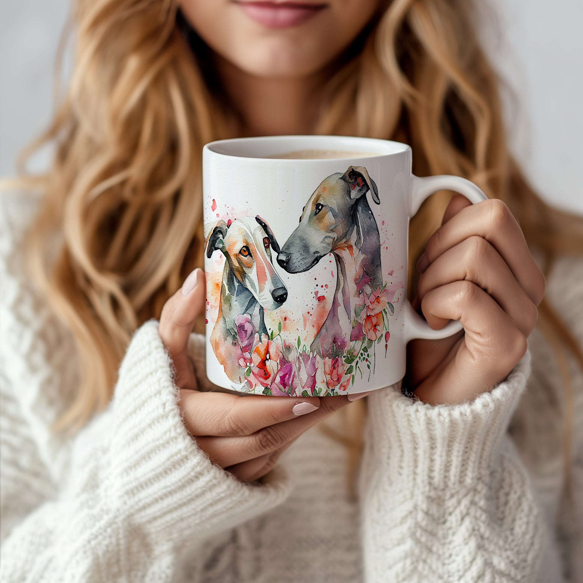Hrnek s akvarelovými greyhoundy v květinovém designu