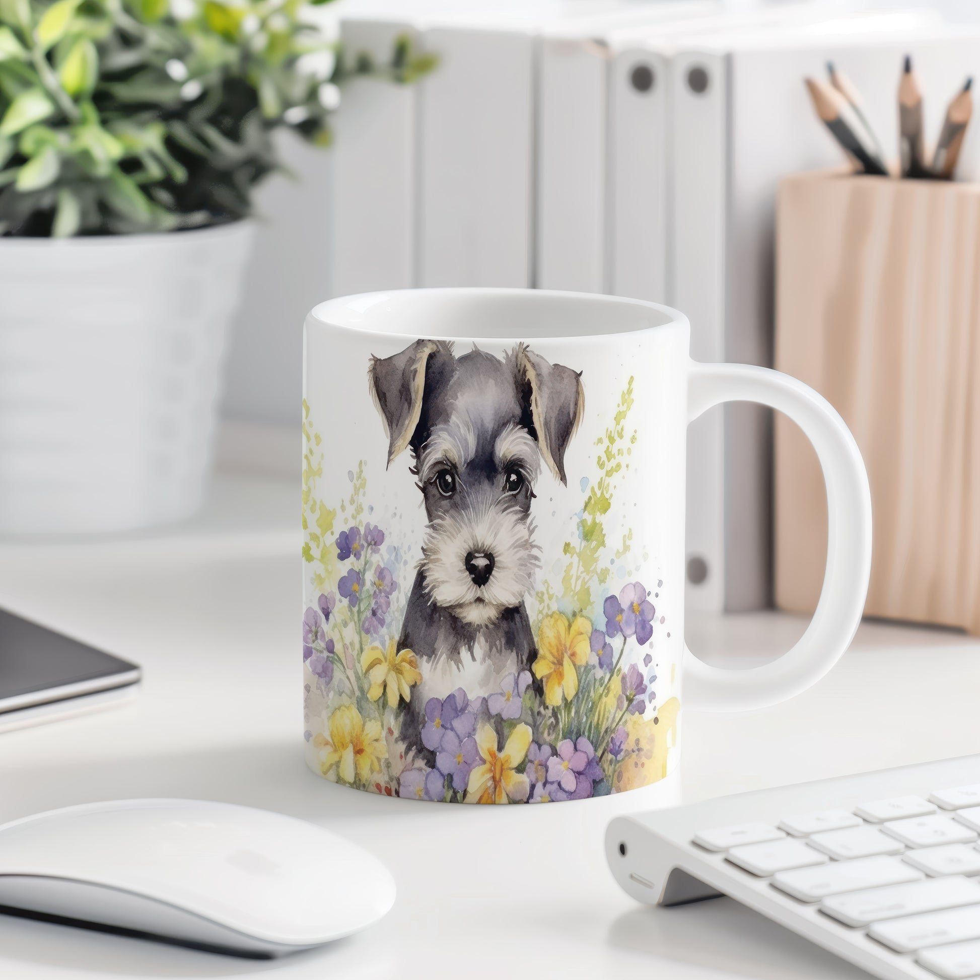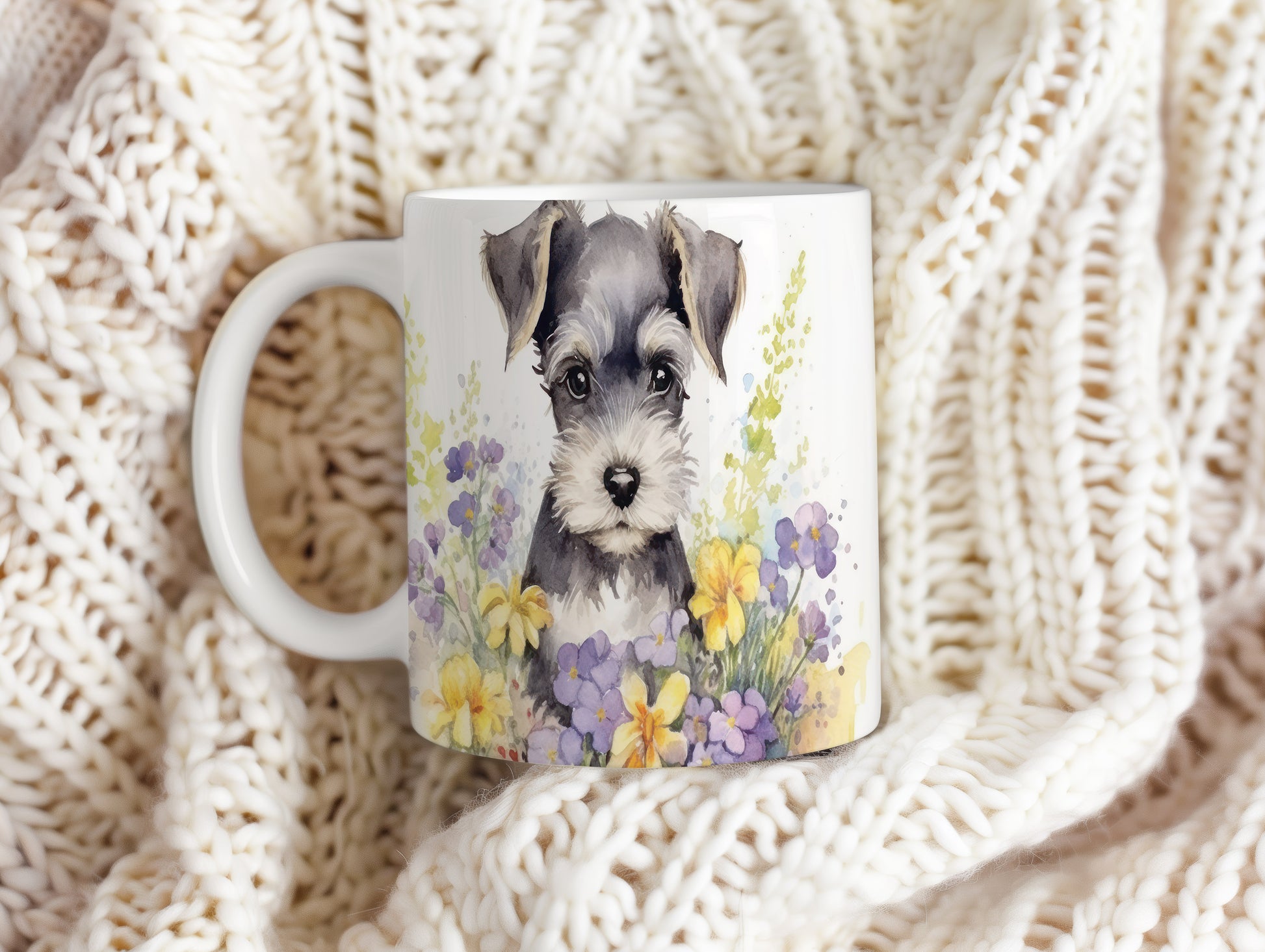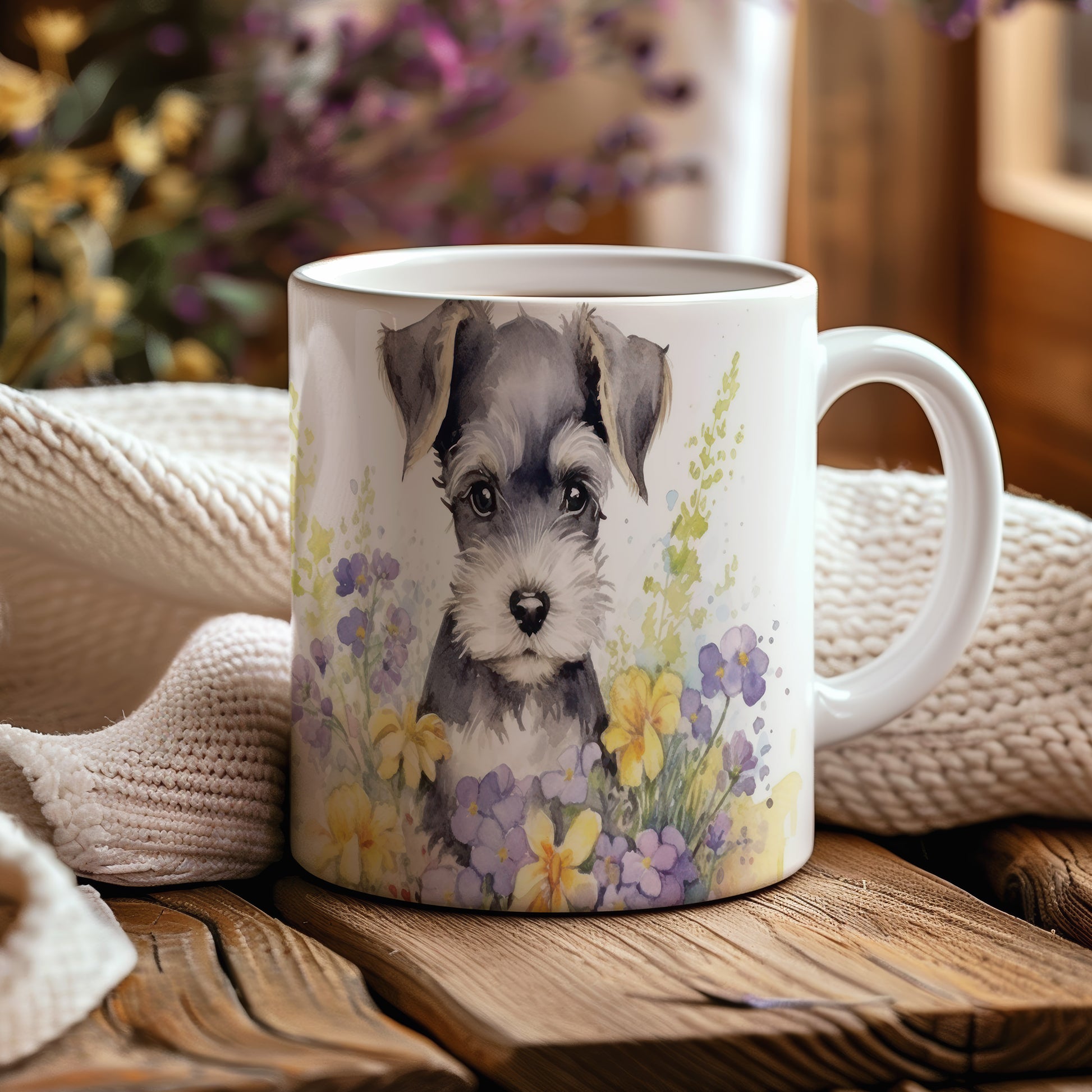 Stylový hrnek s designem štěněte knírače obklopeného květinami. Ideální pro milovníky psů a kávových chvil.