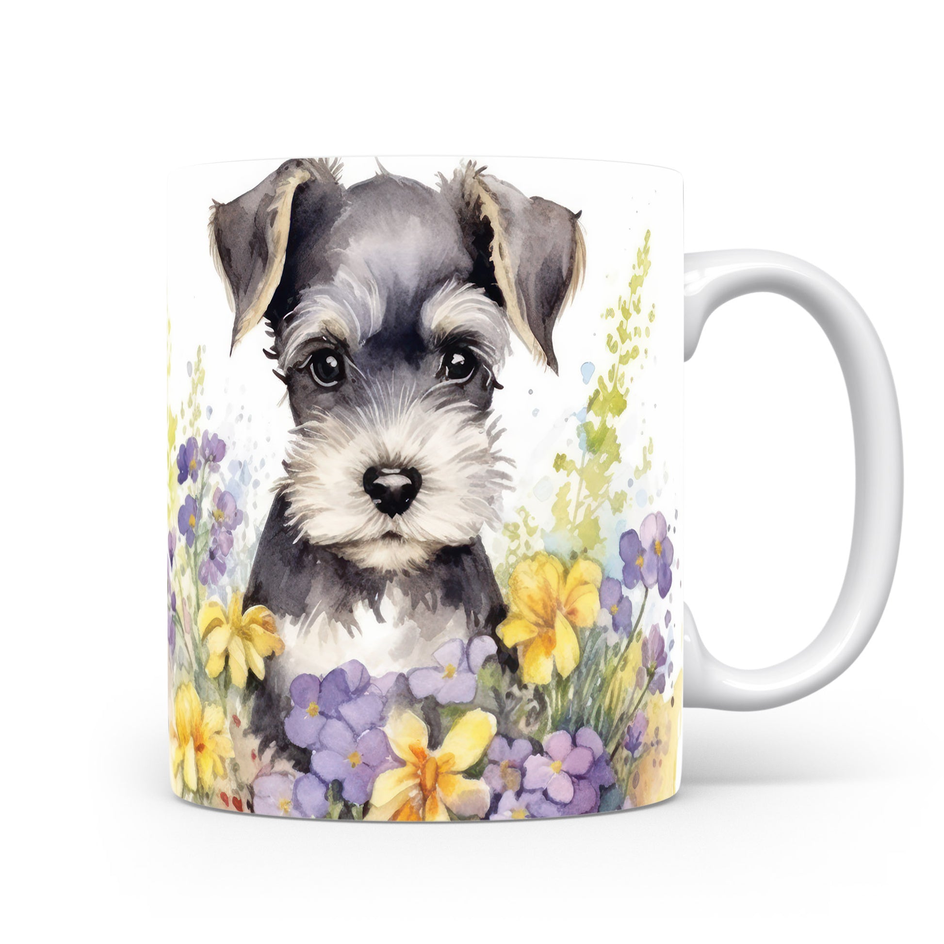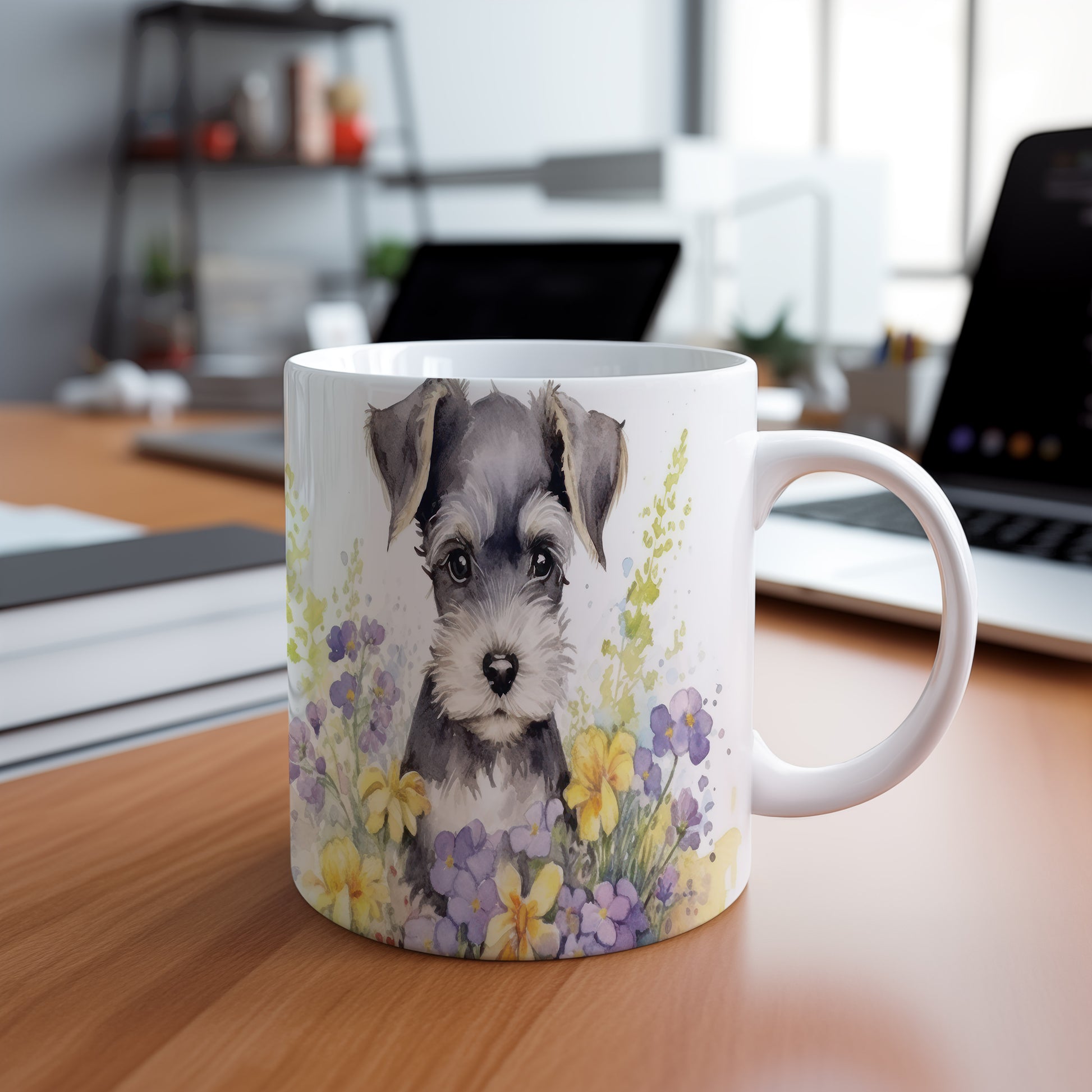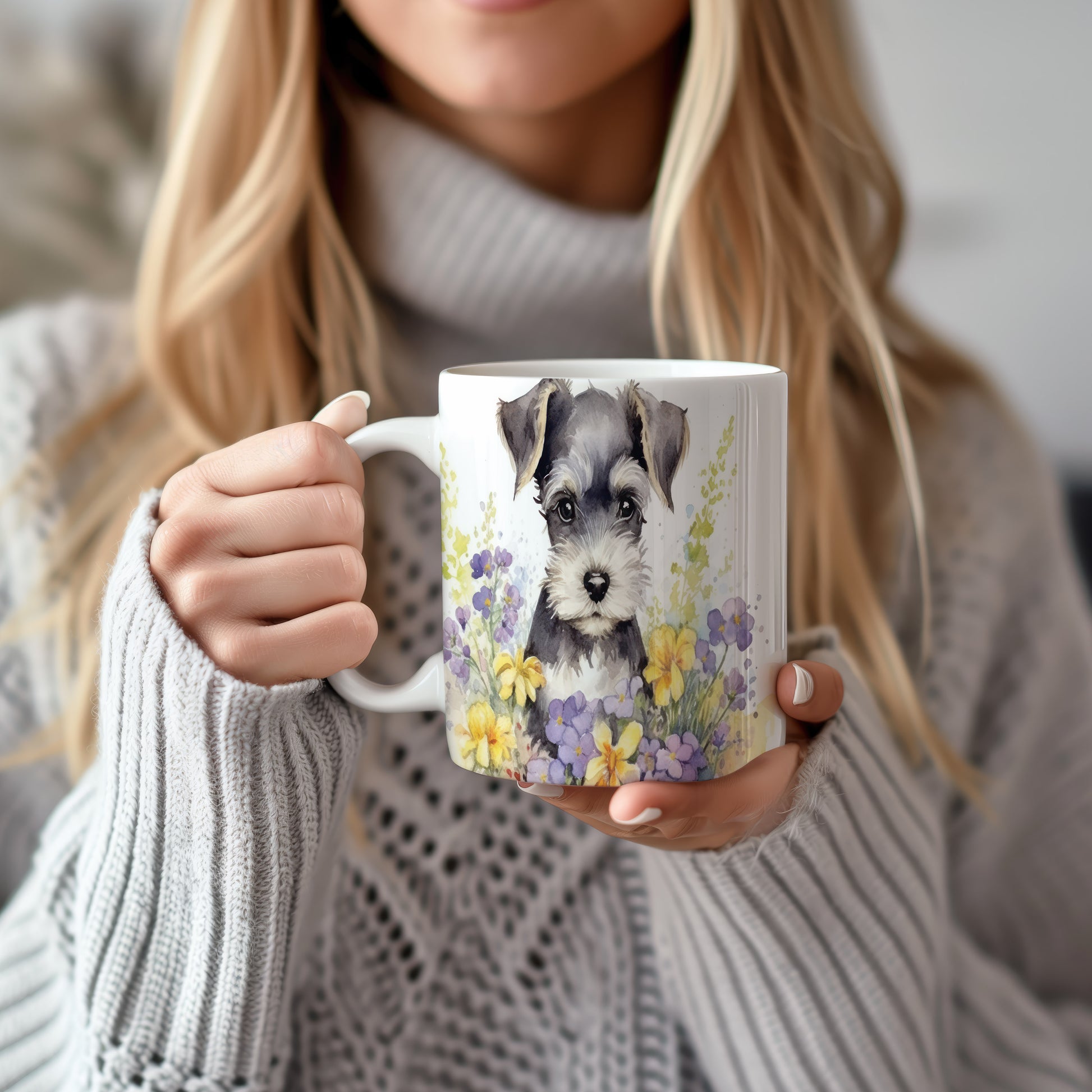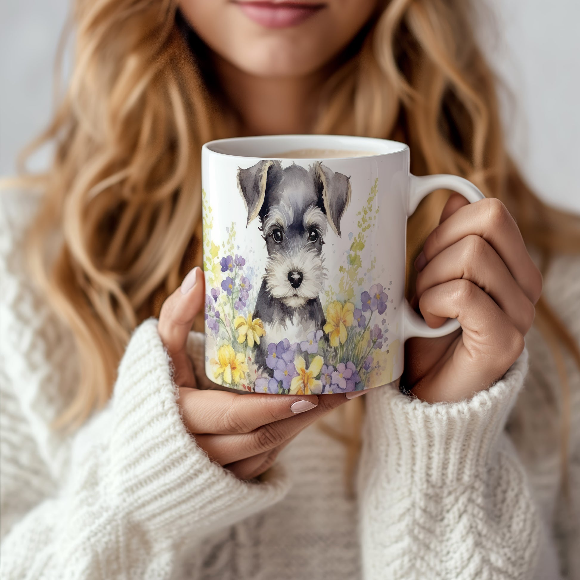 Stylový hrnek s designem štěněte knírače obklopeného květinami. Ideální pro milovníky psů a kávových chvil.