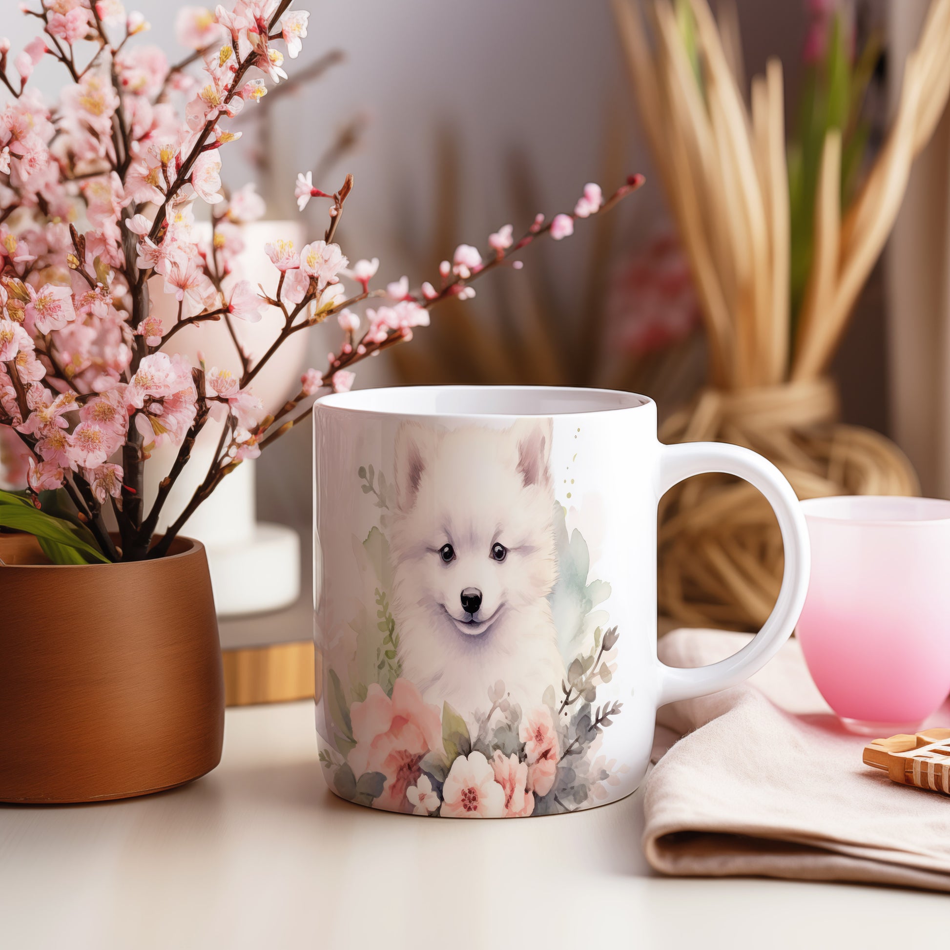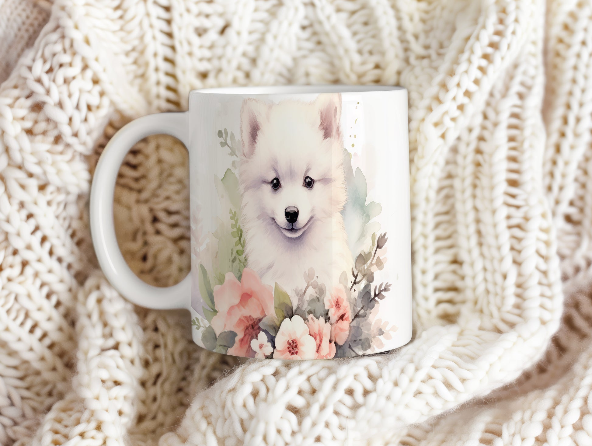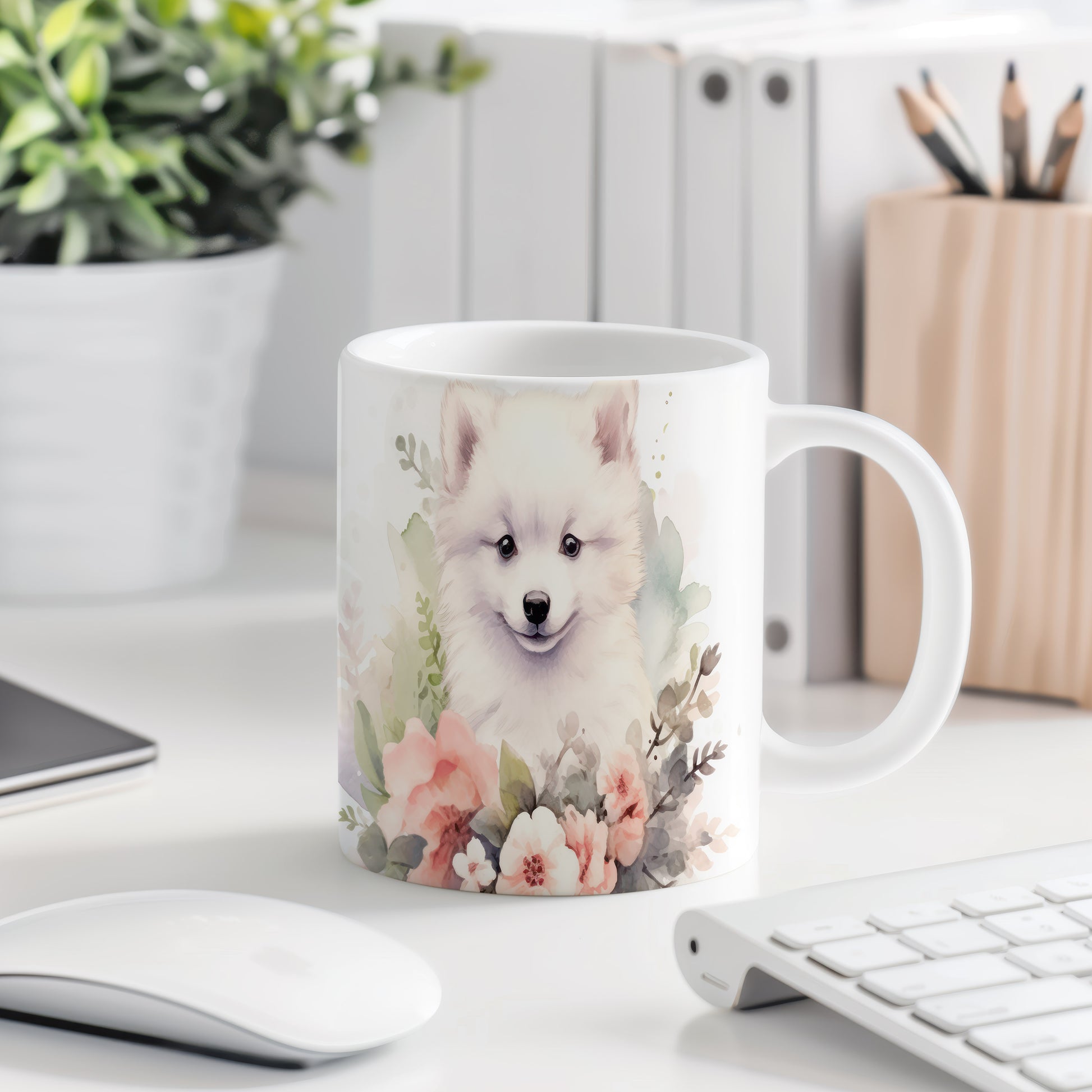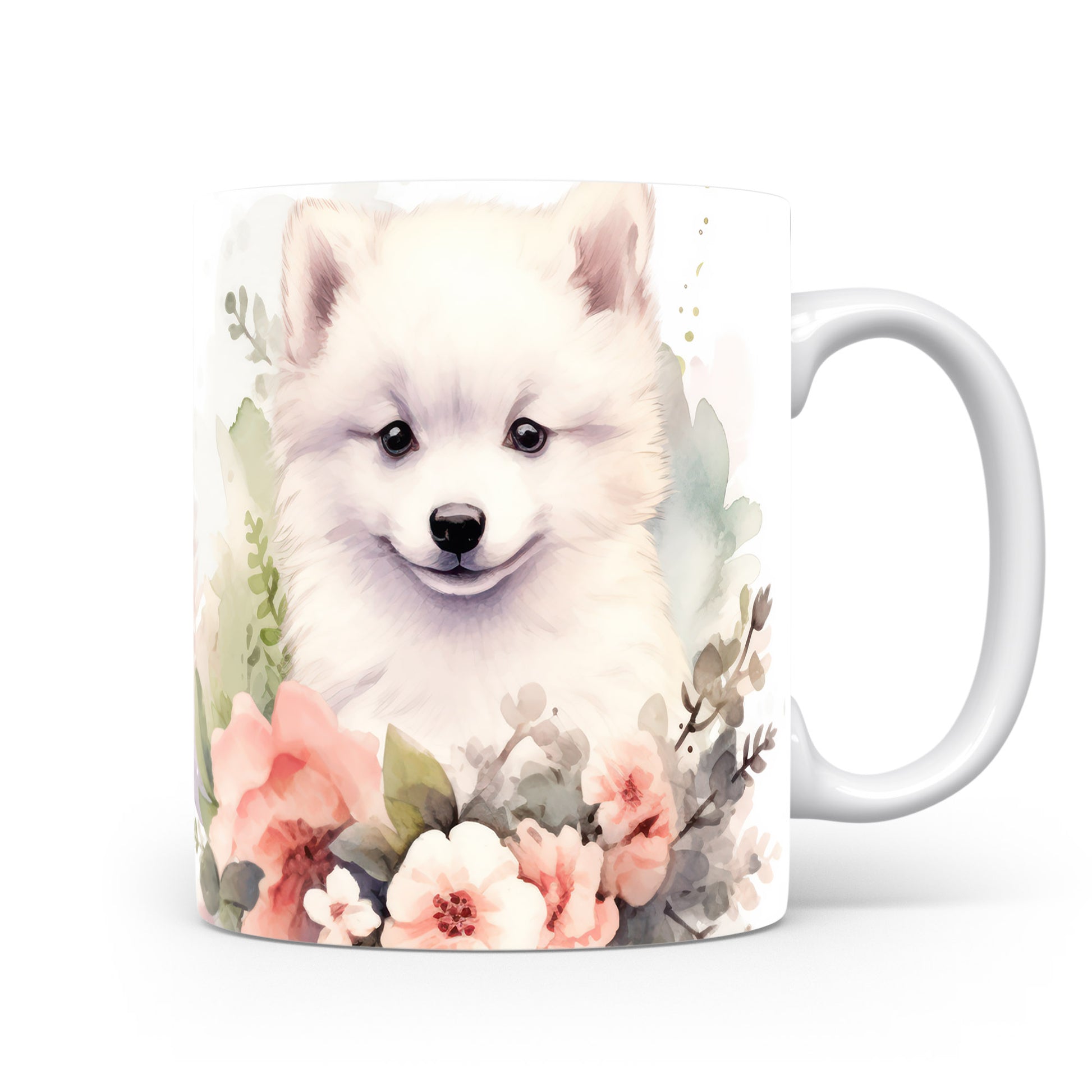 Hrnek s obrázkem samojeda a květinovým vzorem