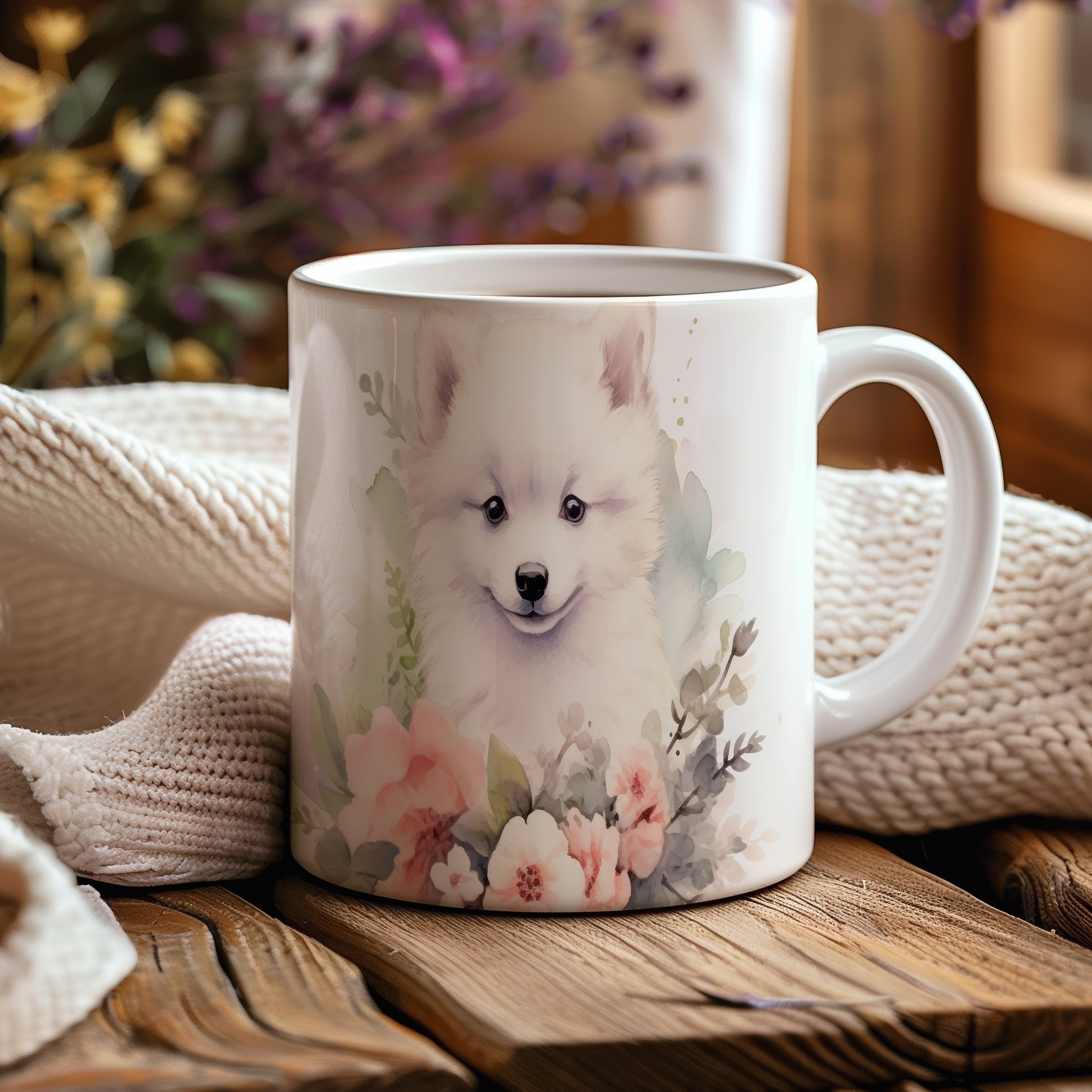 Tento hrnek je ideální pro milovníky psů a přírody. S jemným motivem samojeda a květin přináší radost do každého dne.
