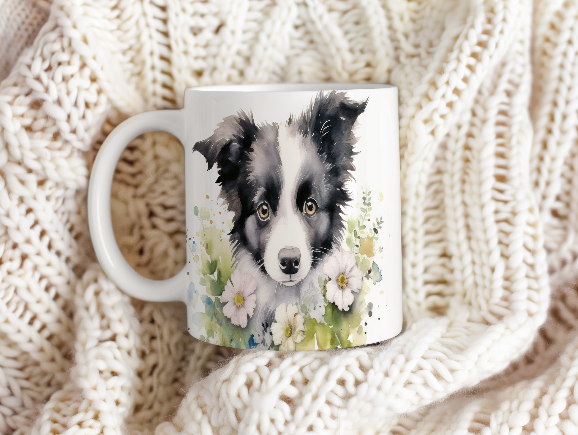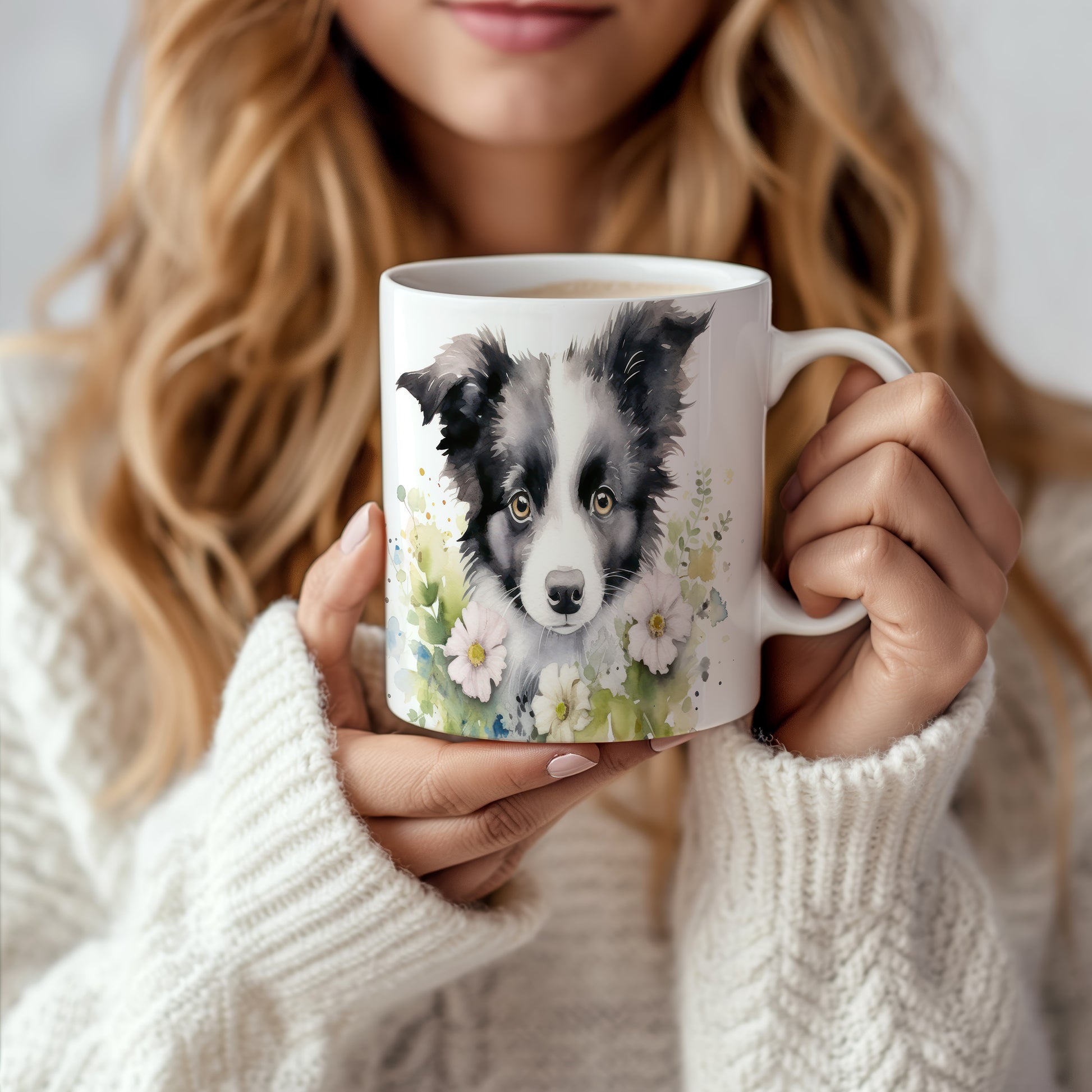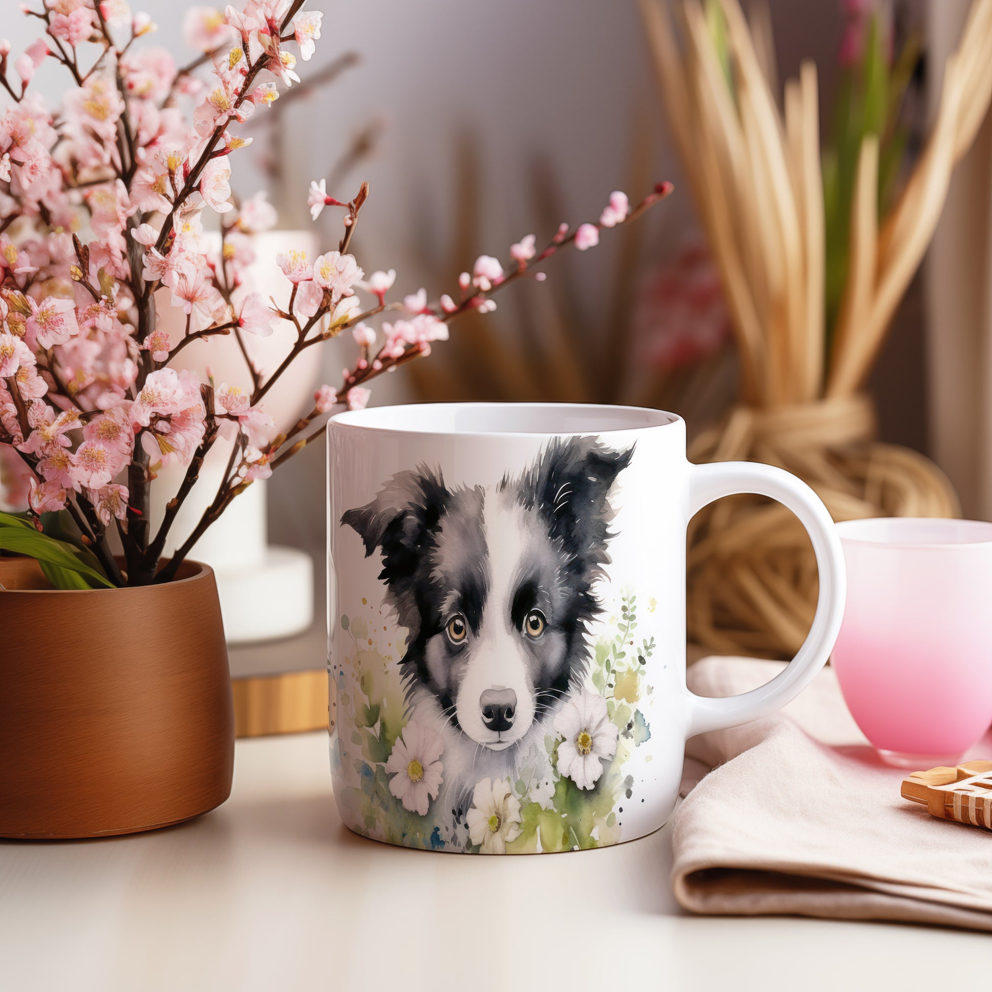 Stylový hrnek s krásným obrázkem border kolie mezi květinami. Ideální pro milovníky psů a přírody.