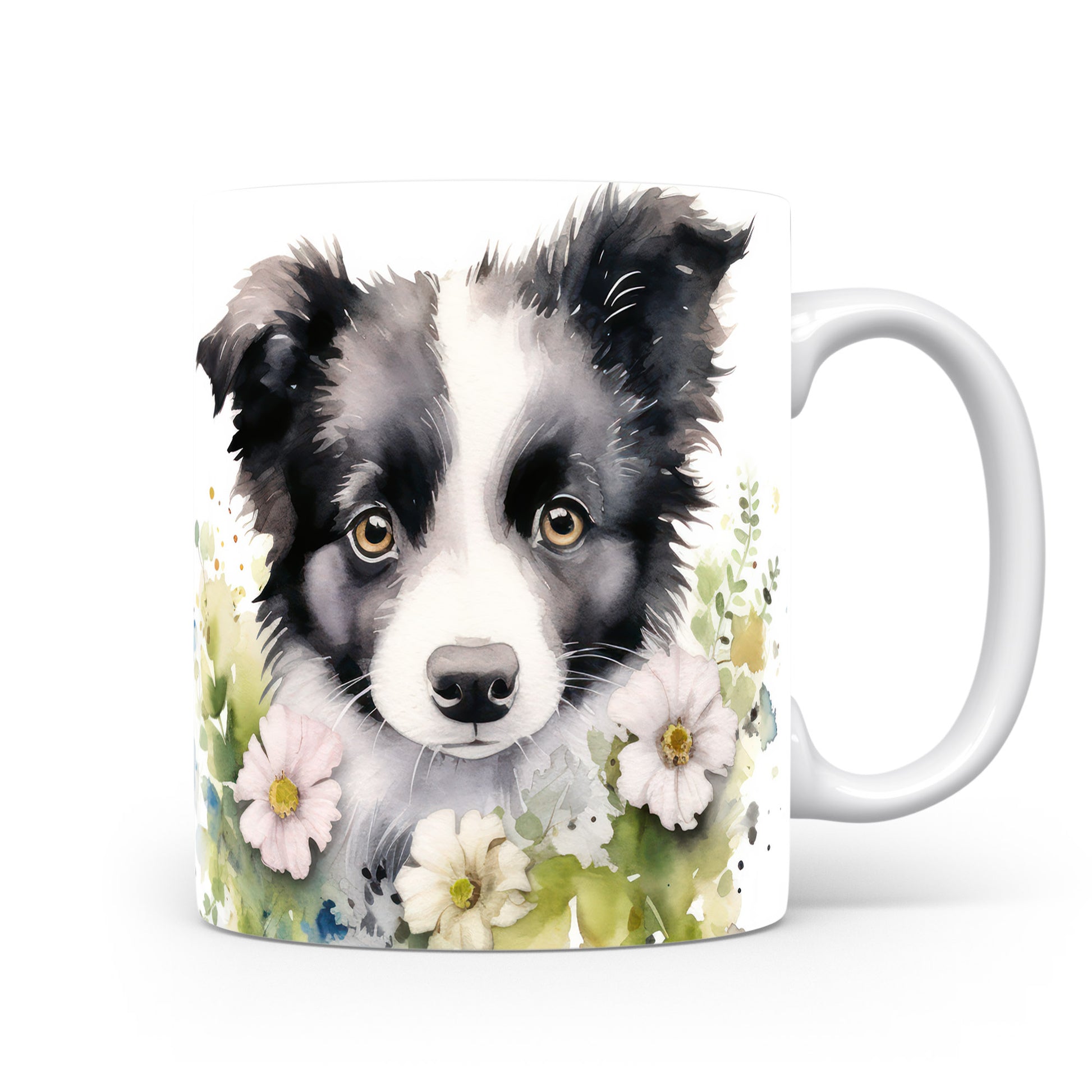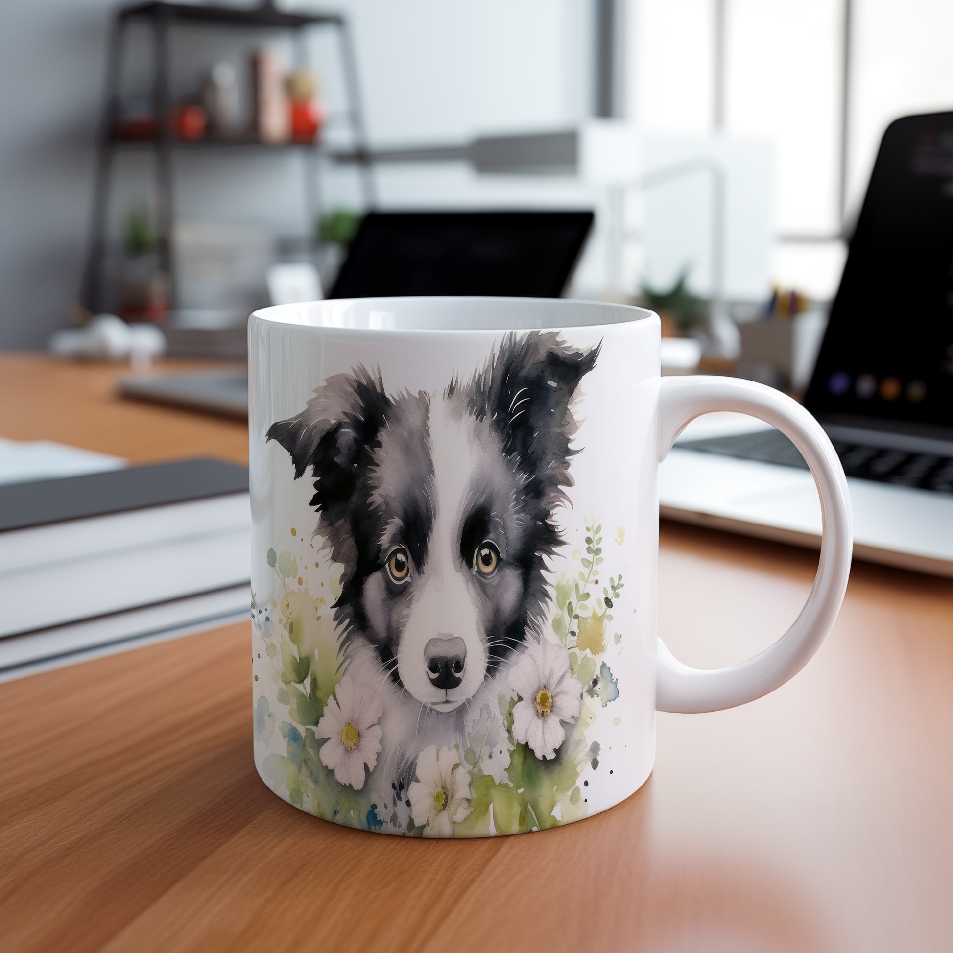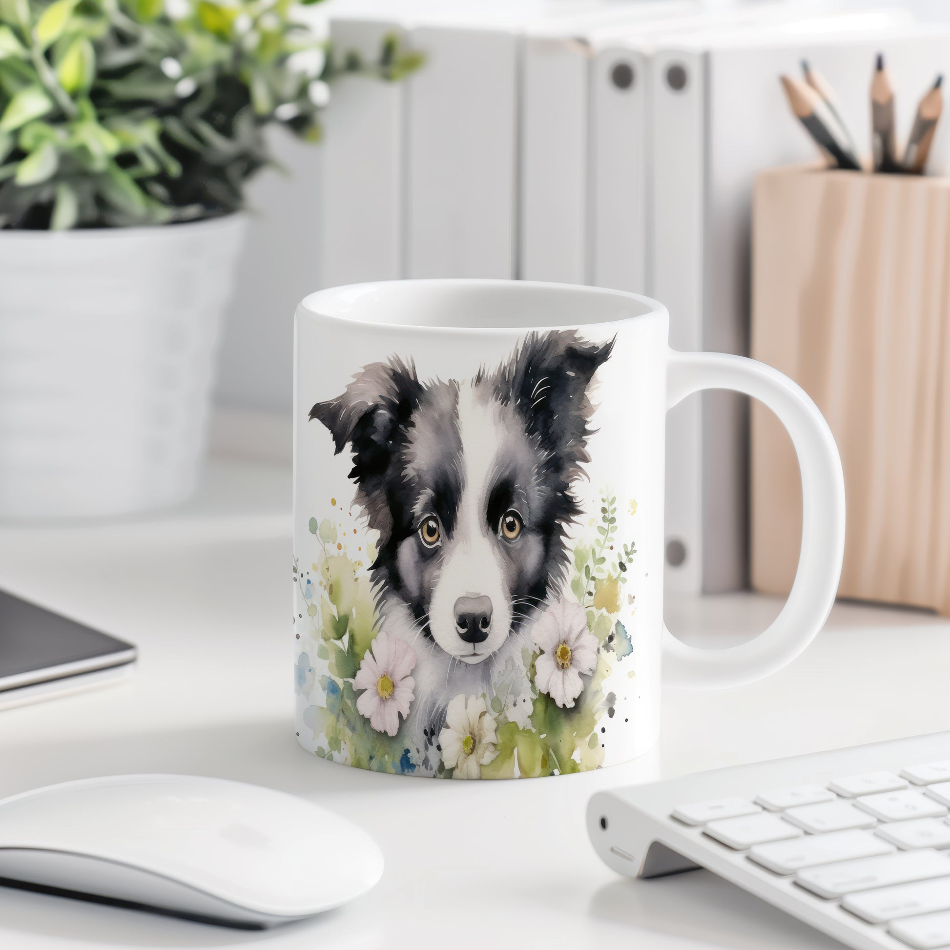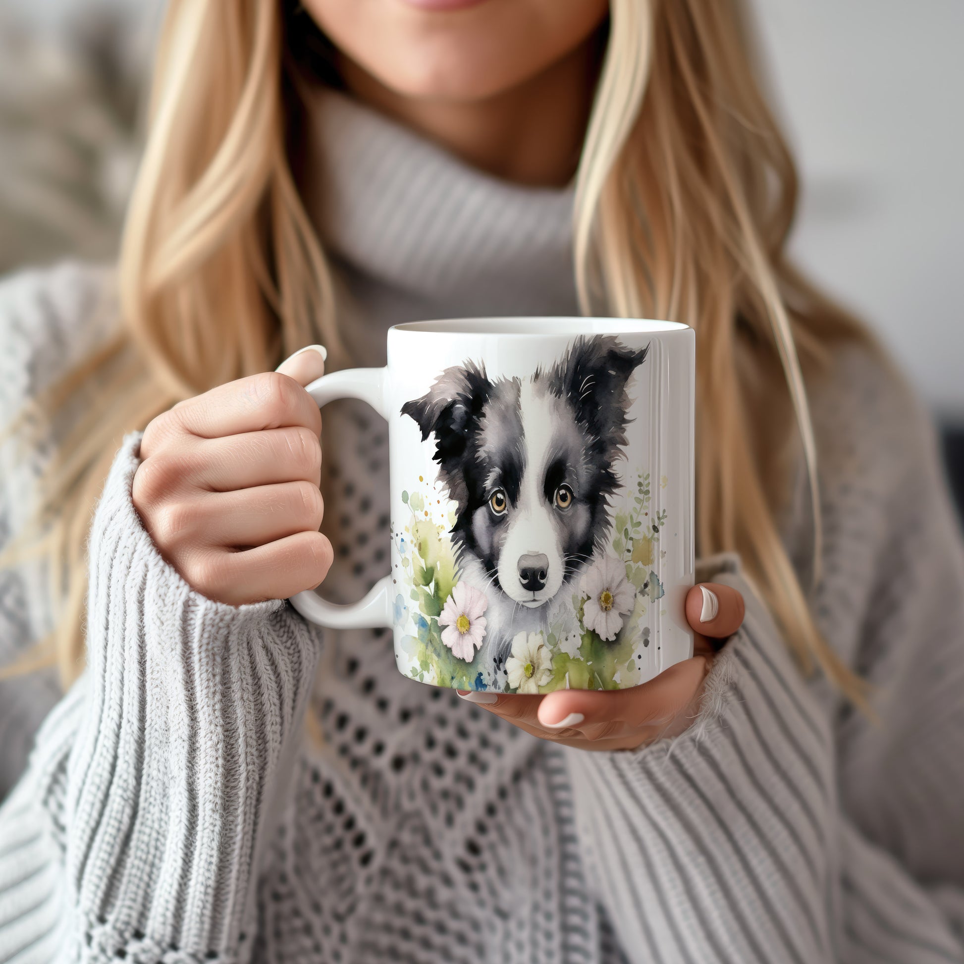 Stylový hrnek s krásným obrázkem border kolie mezi květinami. Ideální pro milovníky psů a přírody.