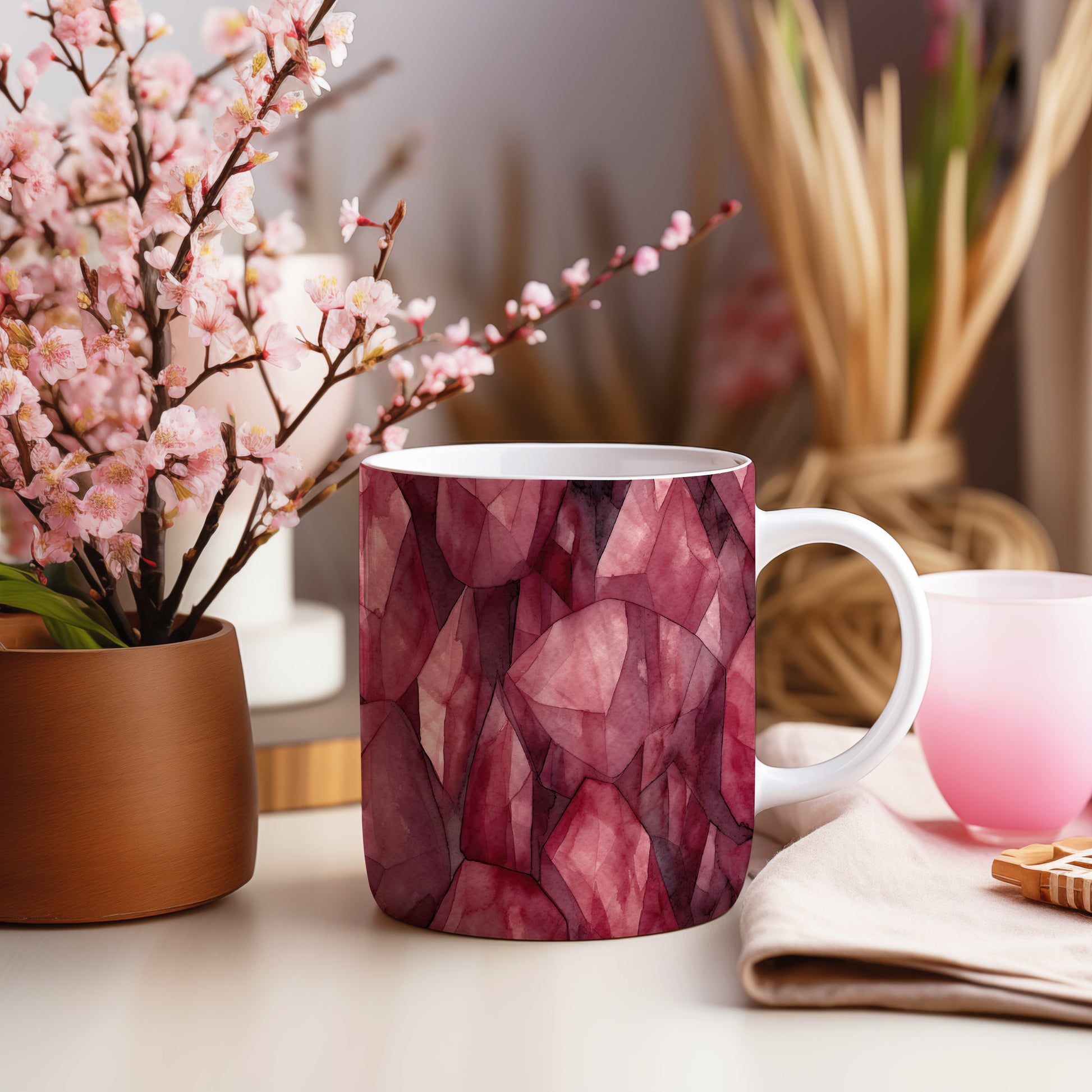 Hrnek s vodovodním motivem v odstínech růžové a červené