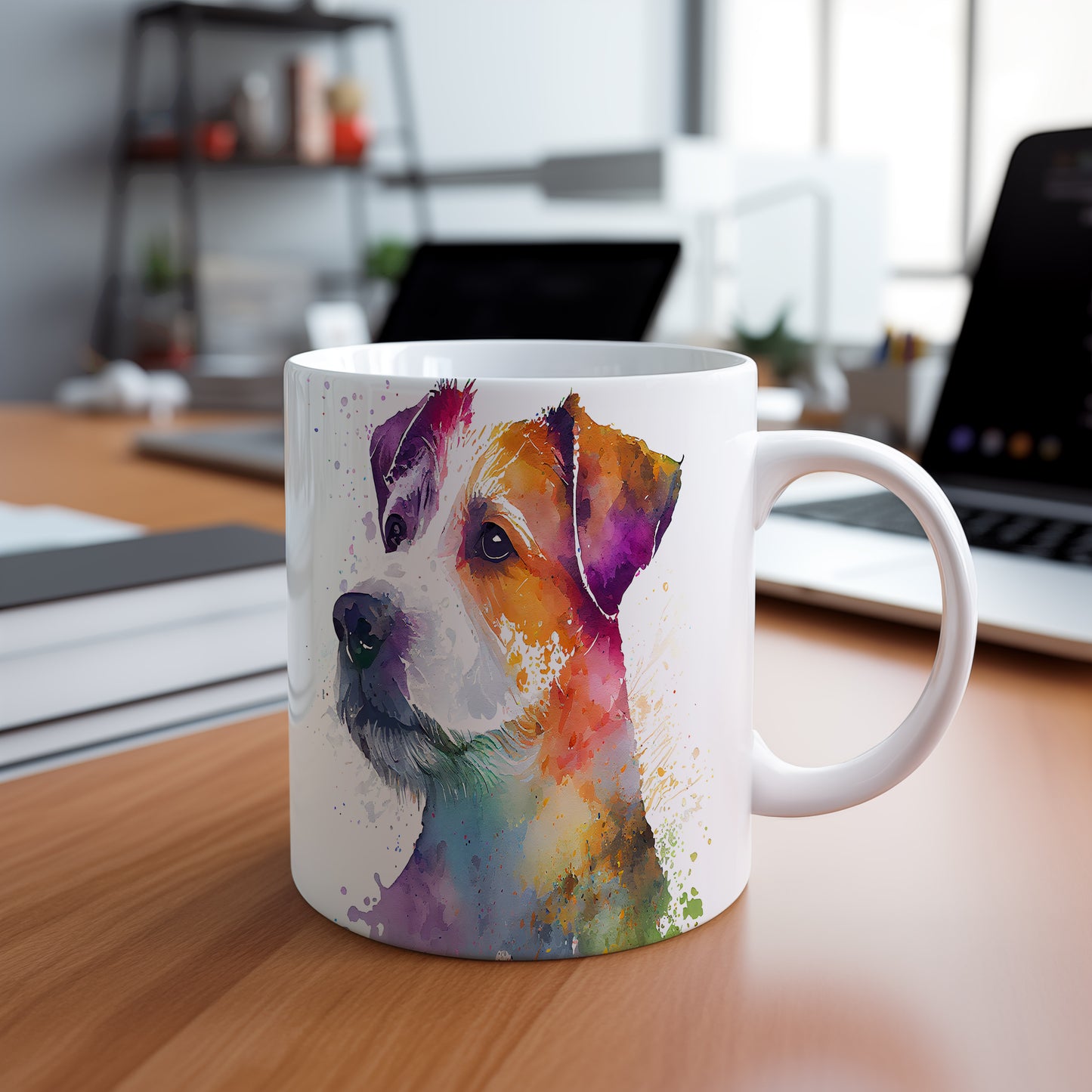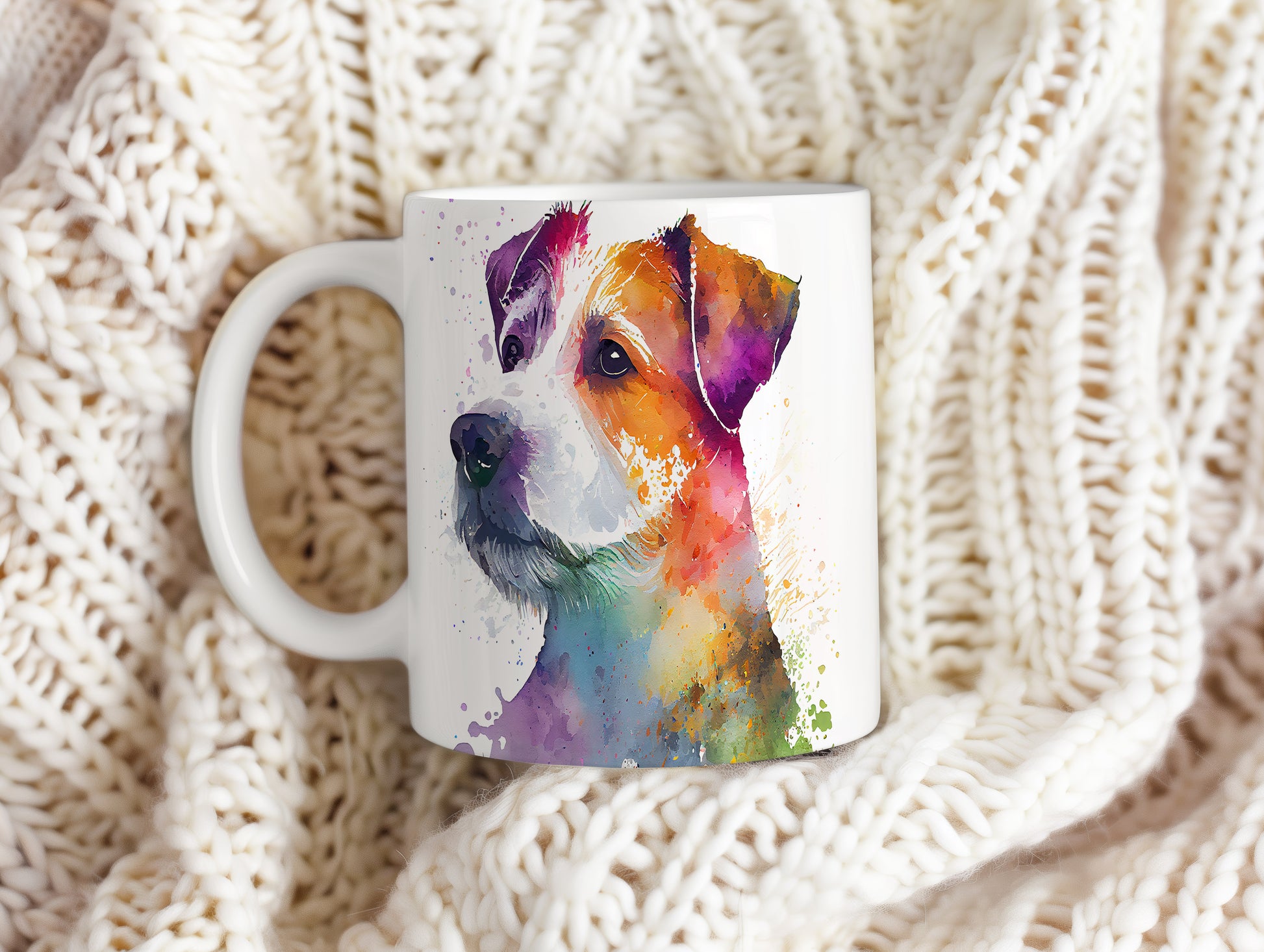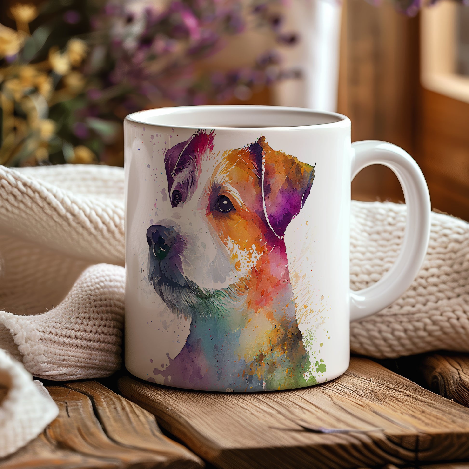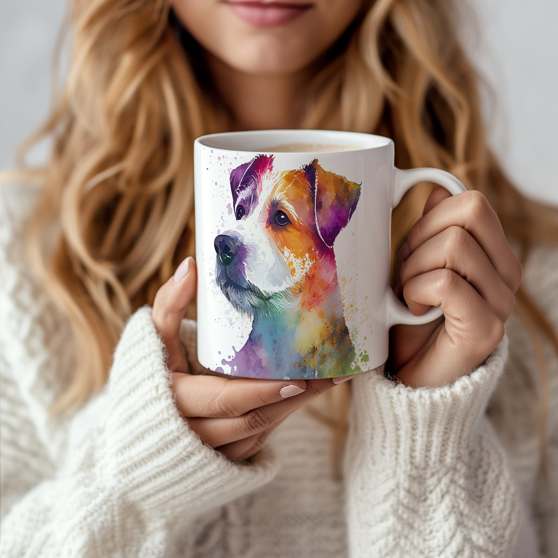Barevný hrnek s portrétem psa v akvarelovém stylu