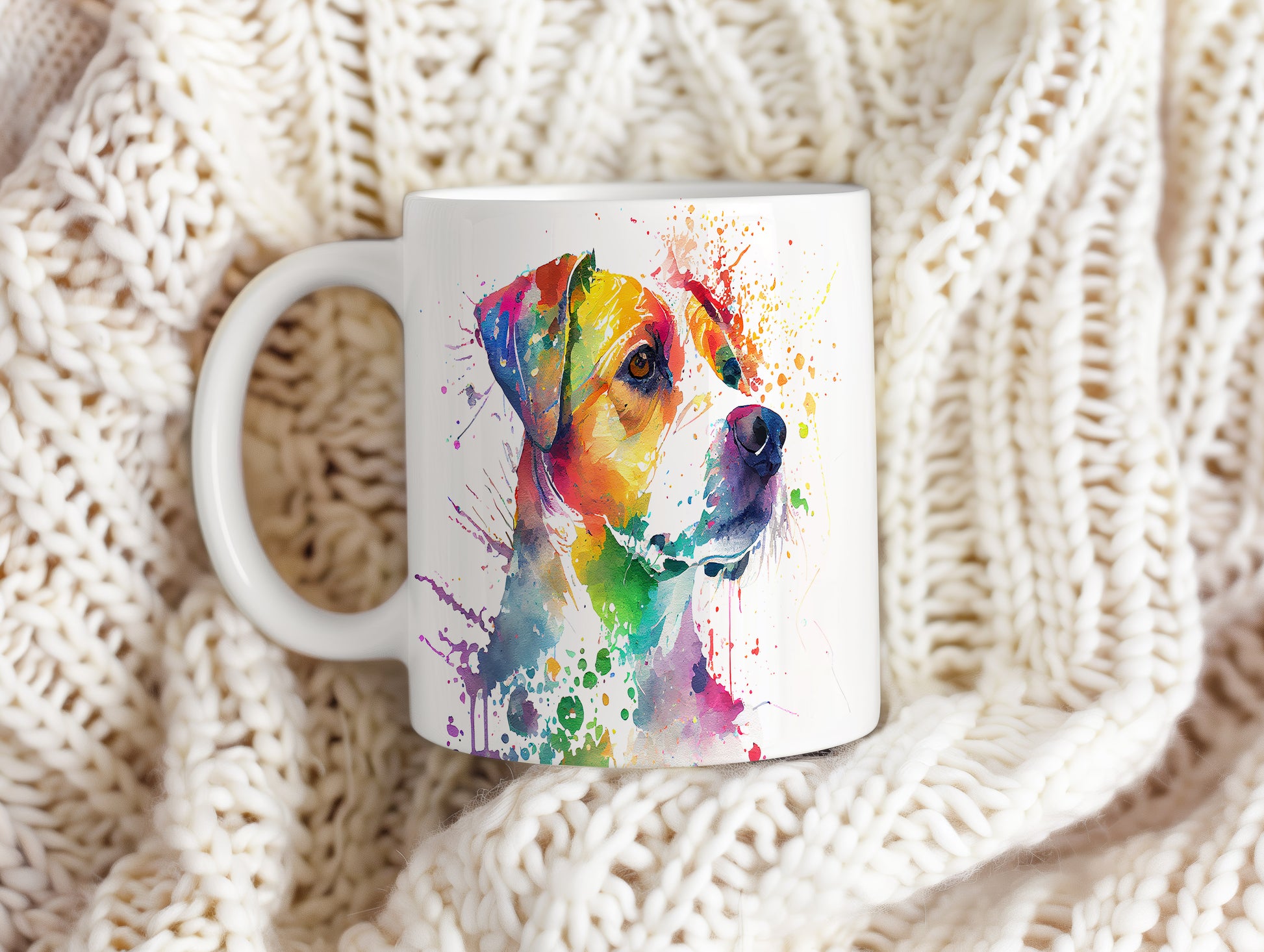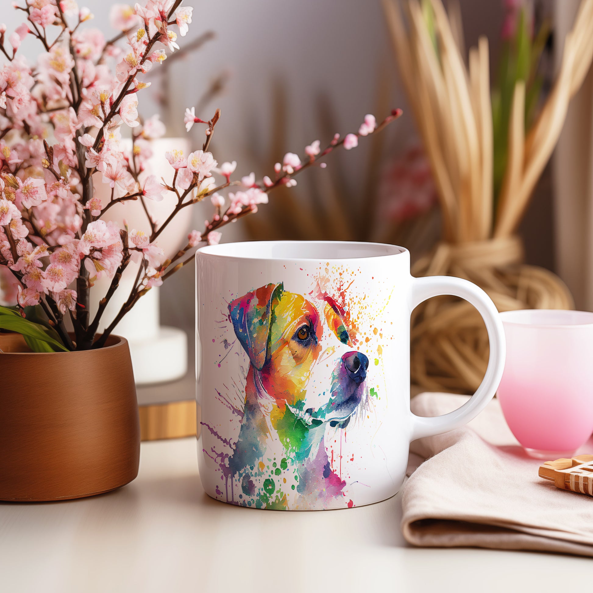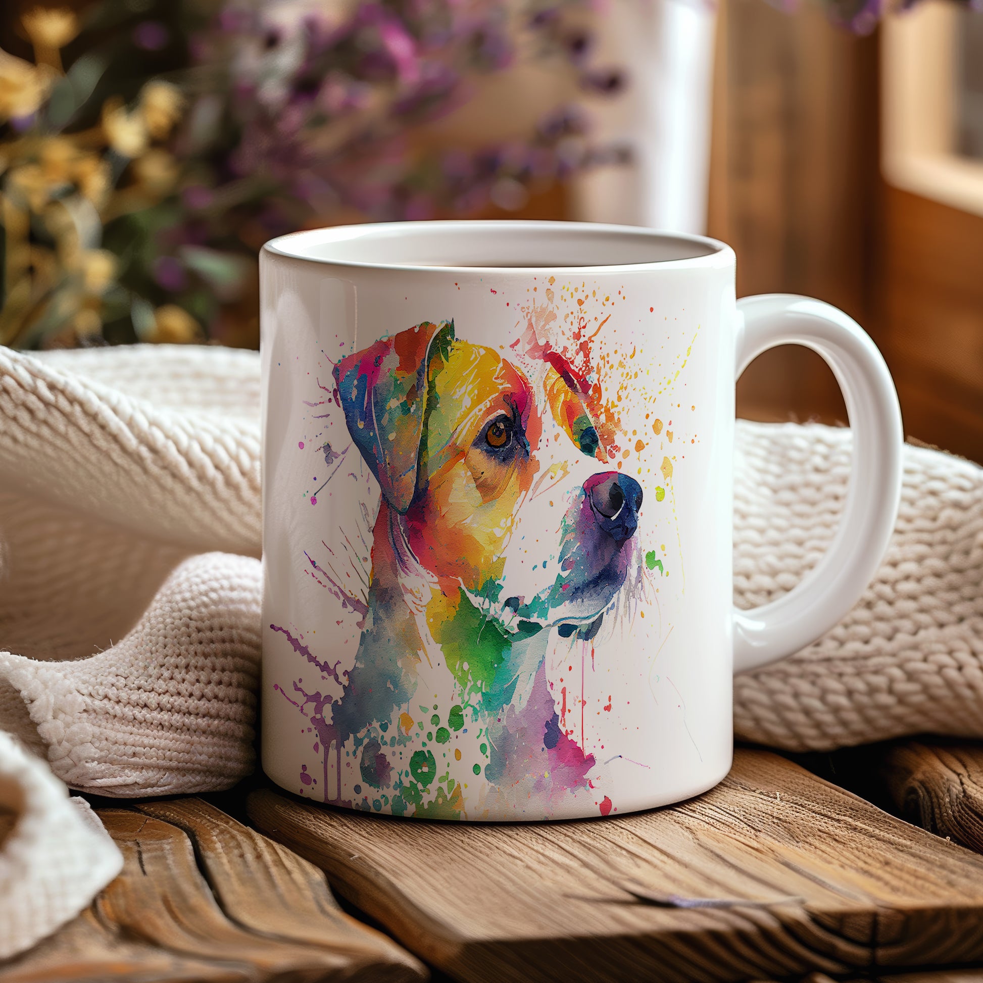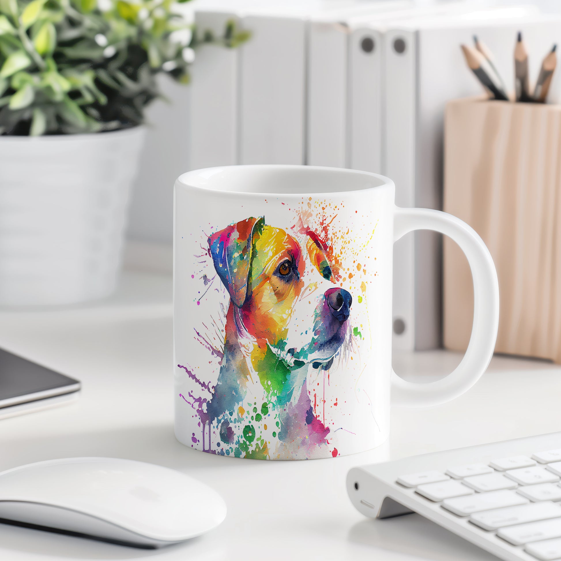Barevný hrnek s motivem psa v akvarelovém stylu