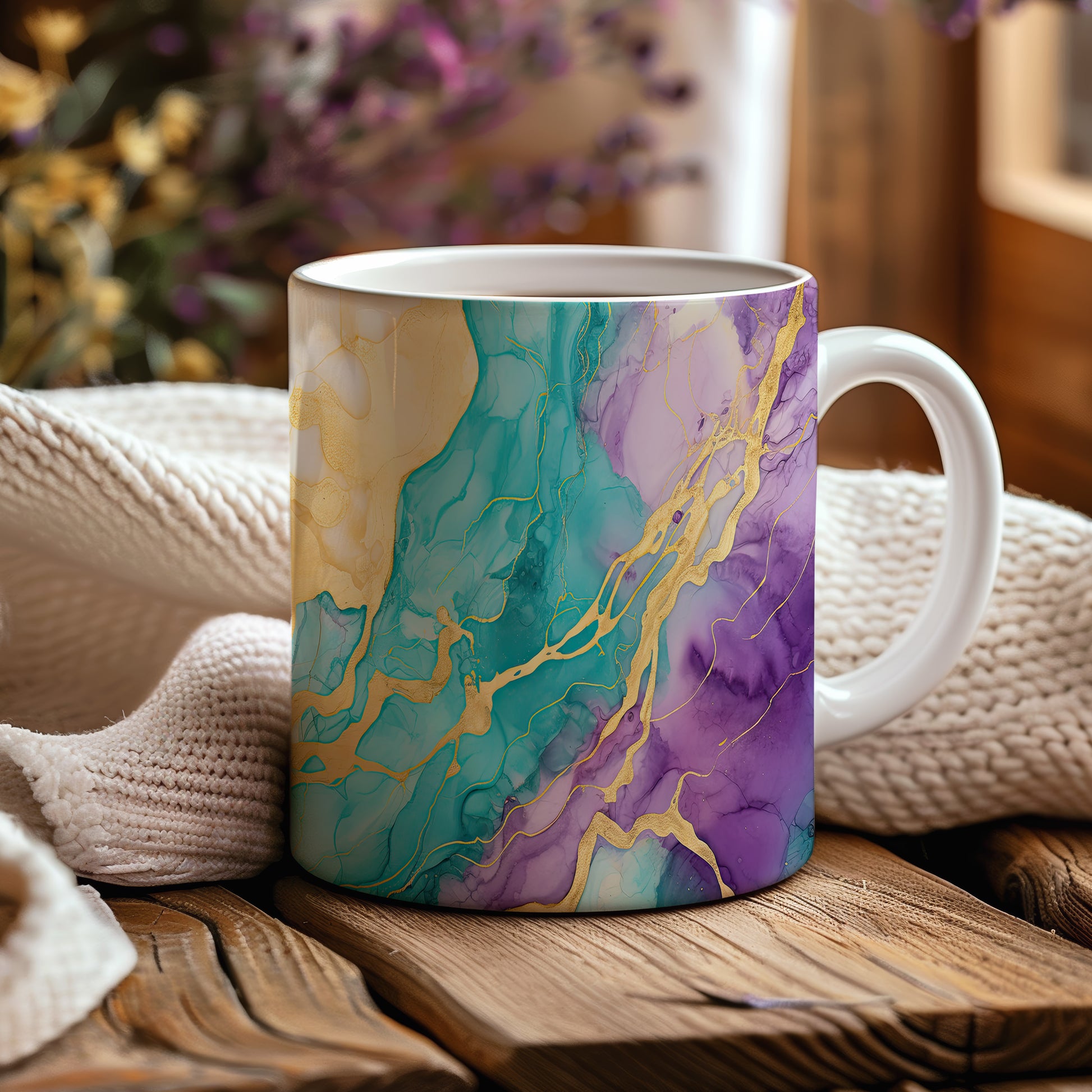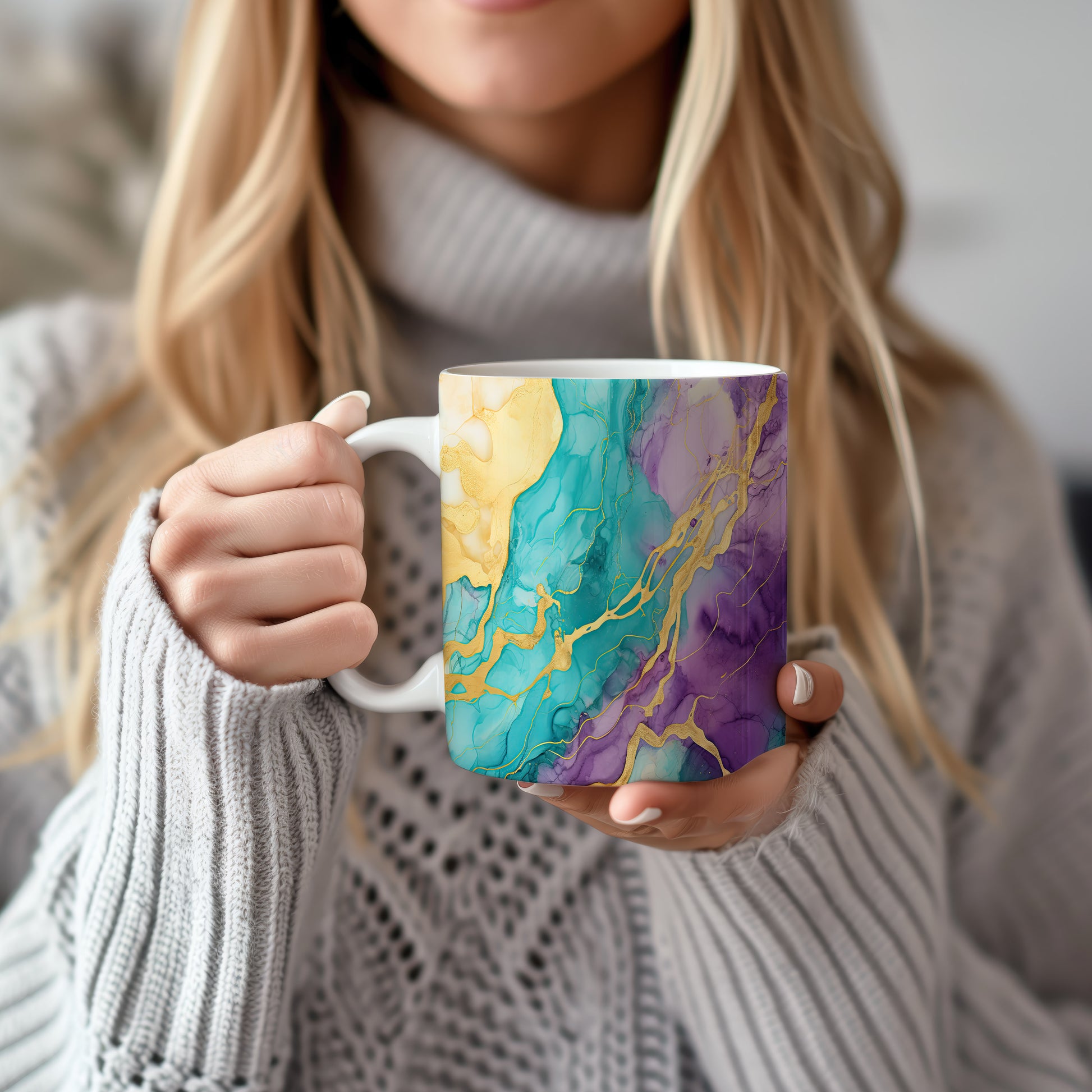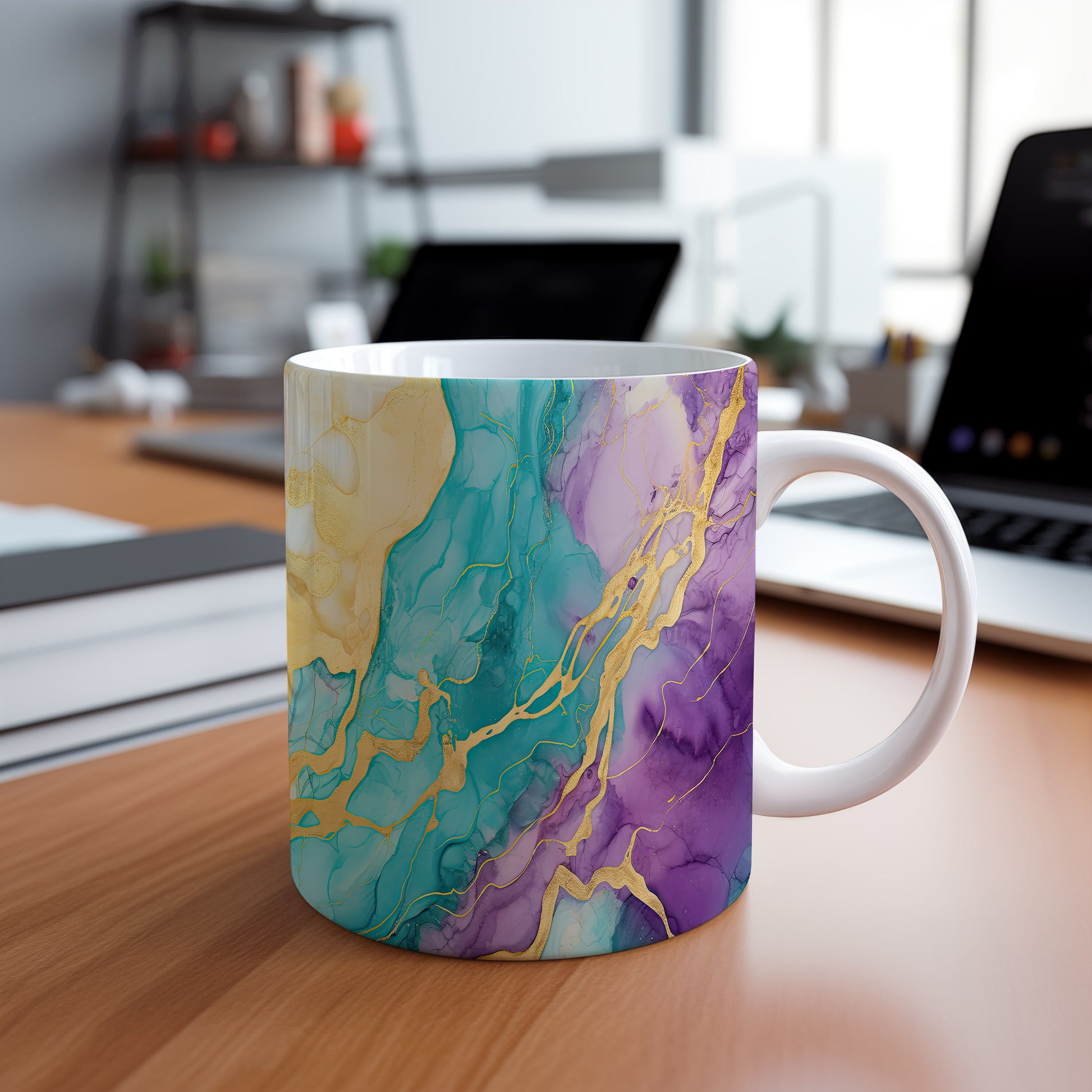 Tento stylový hrnek s unikátním akvarelovým designem je ideální pro vaše oblíbené nápoje. Díky kombinaci modré, fialové a zlaté barvy přinese do vaší domácnosti elegance.