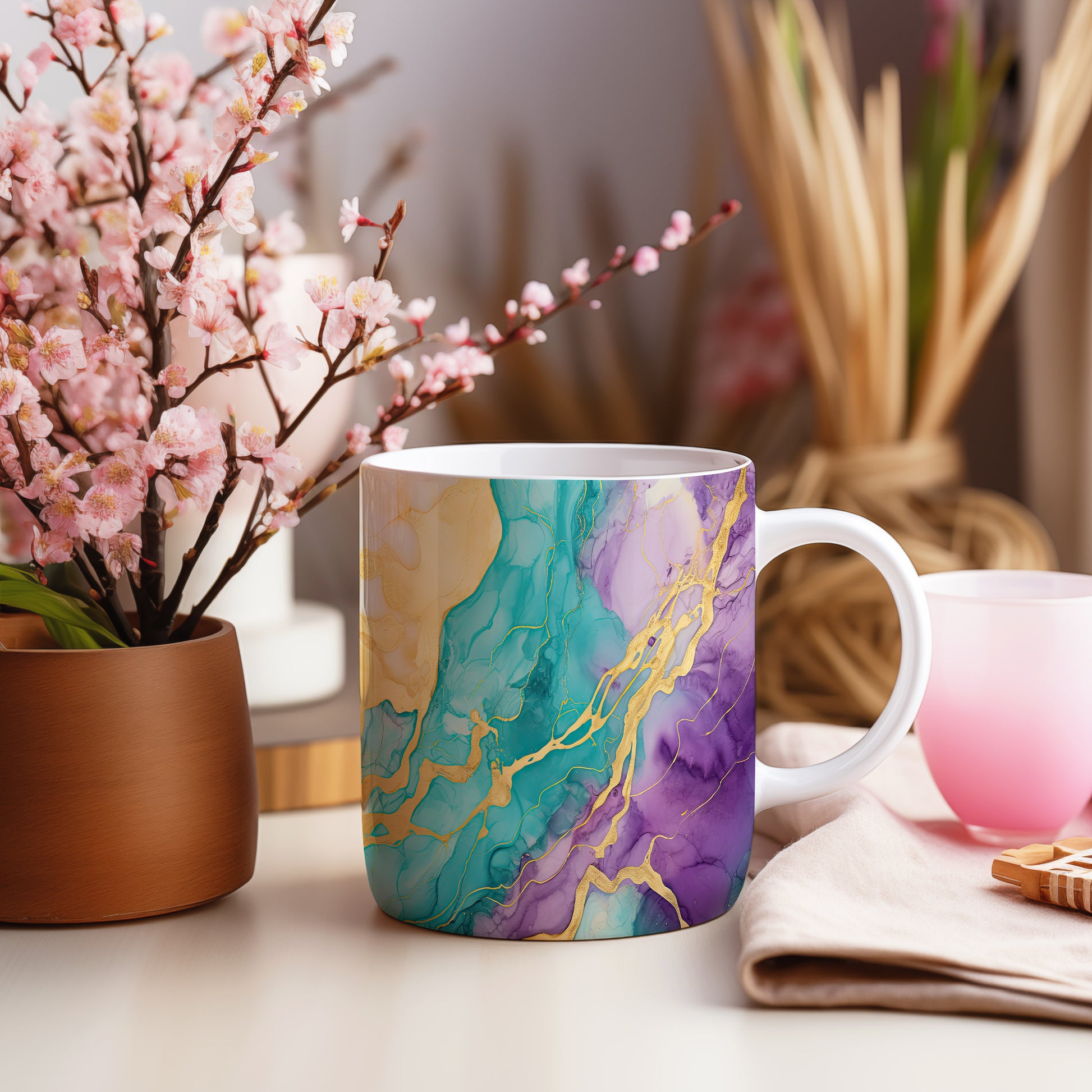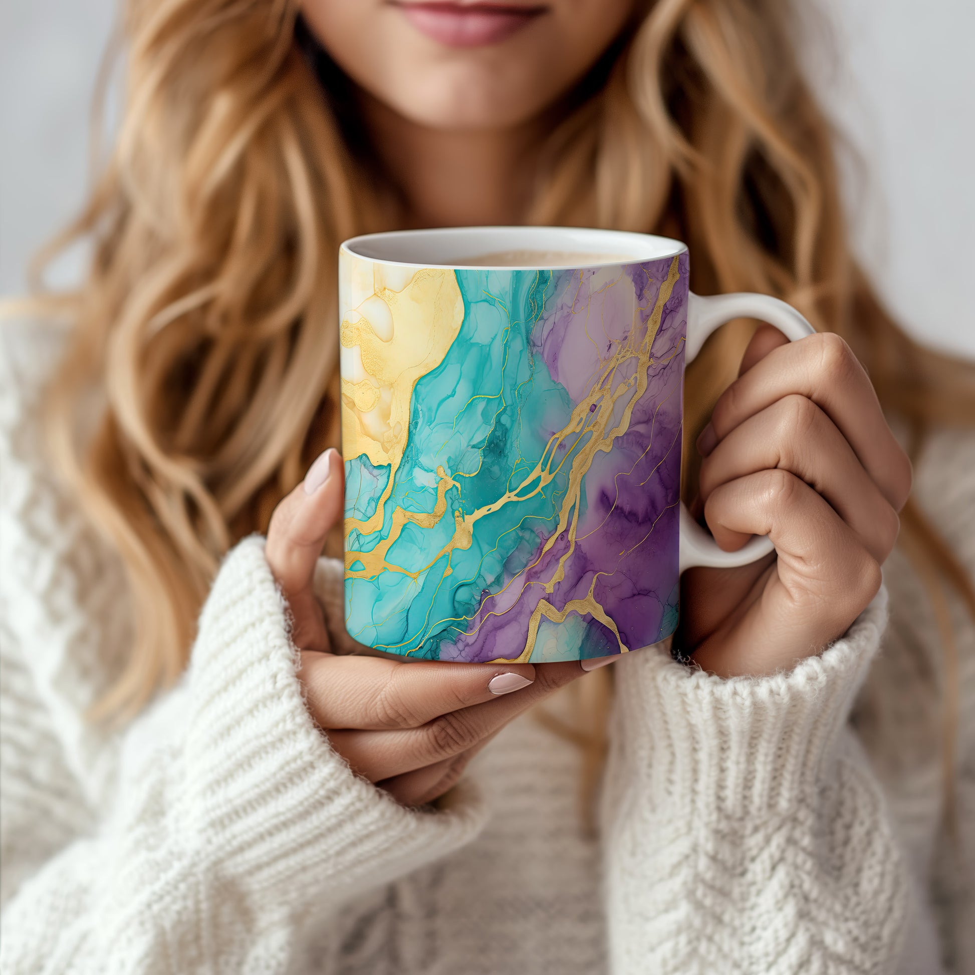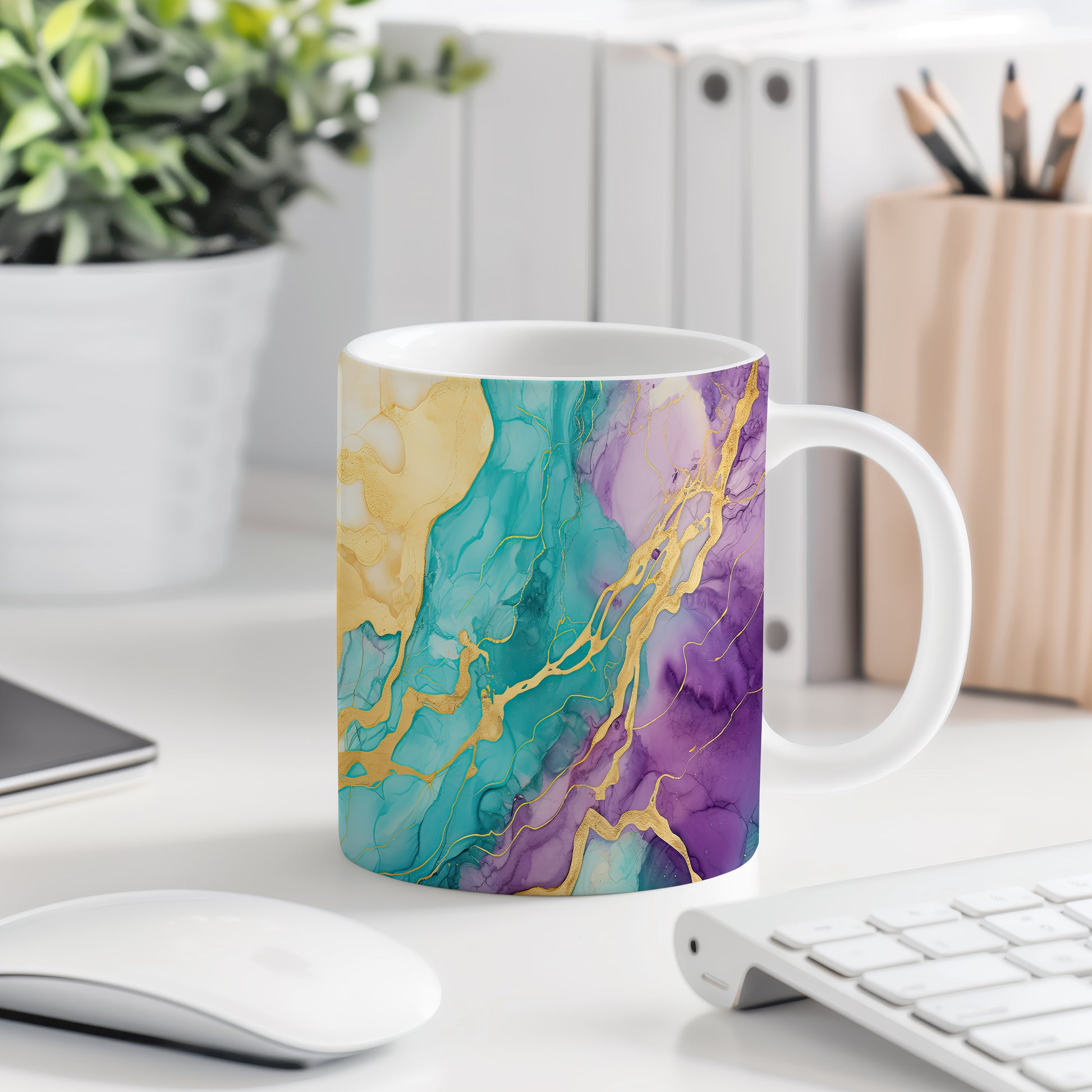 Tento stylový hrnek s unikátním akvarelovým designem je ideální pro vaše oblíbené nápoje. Díky kombinaci modré, fialové a zlaté barvy přinese do vaší domácnosti elegance.
