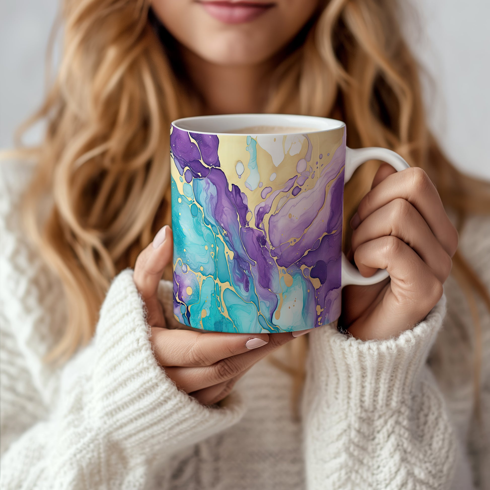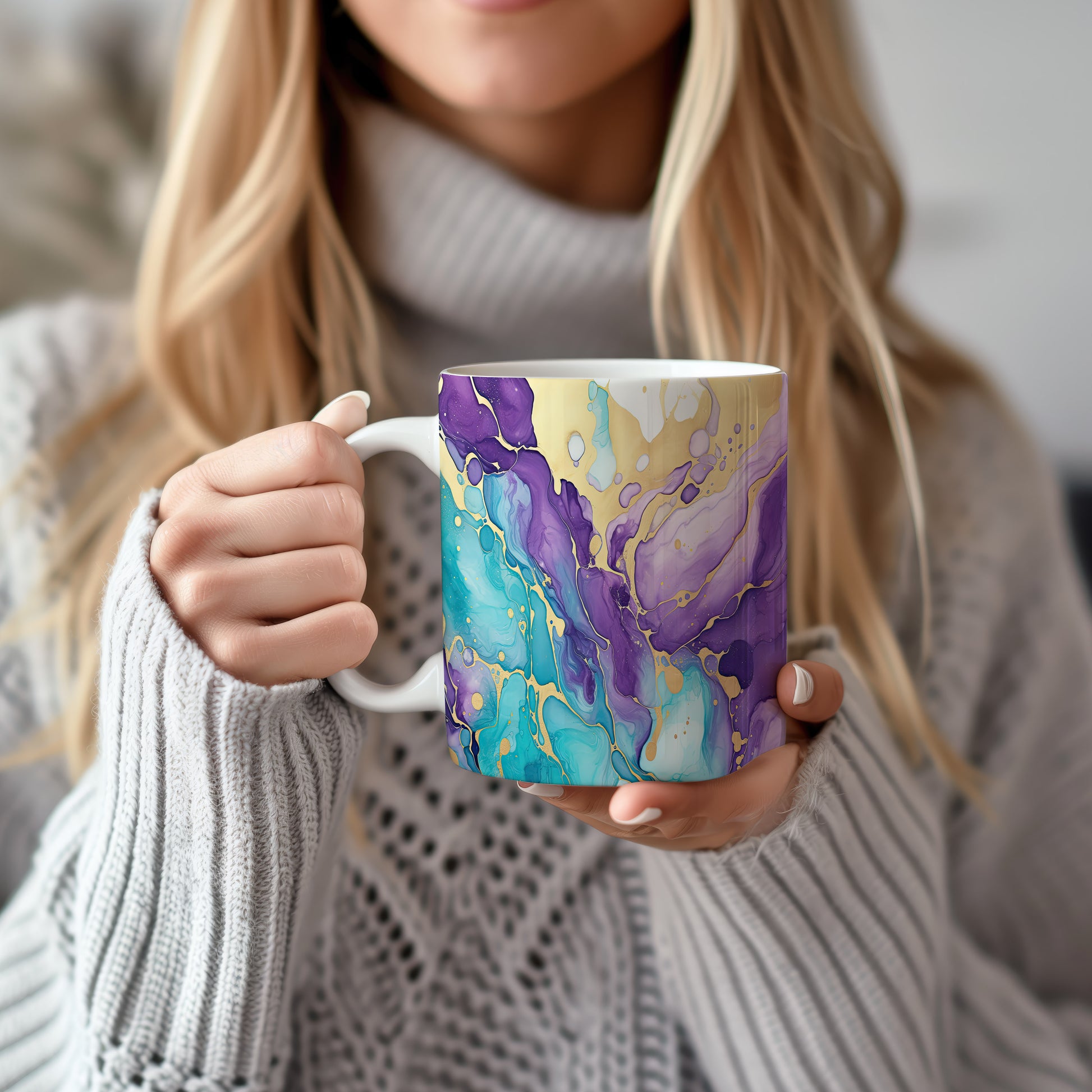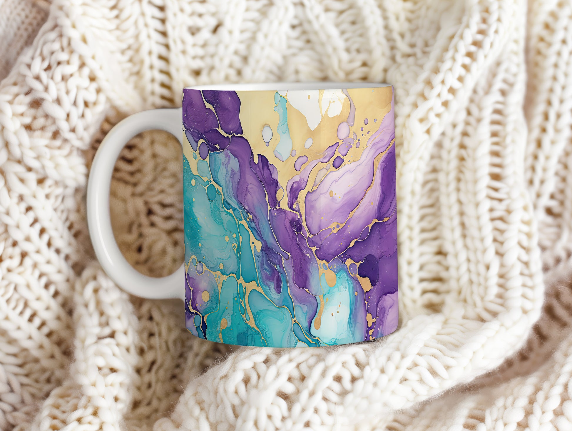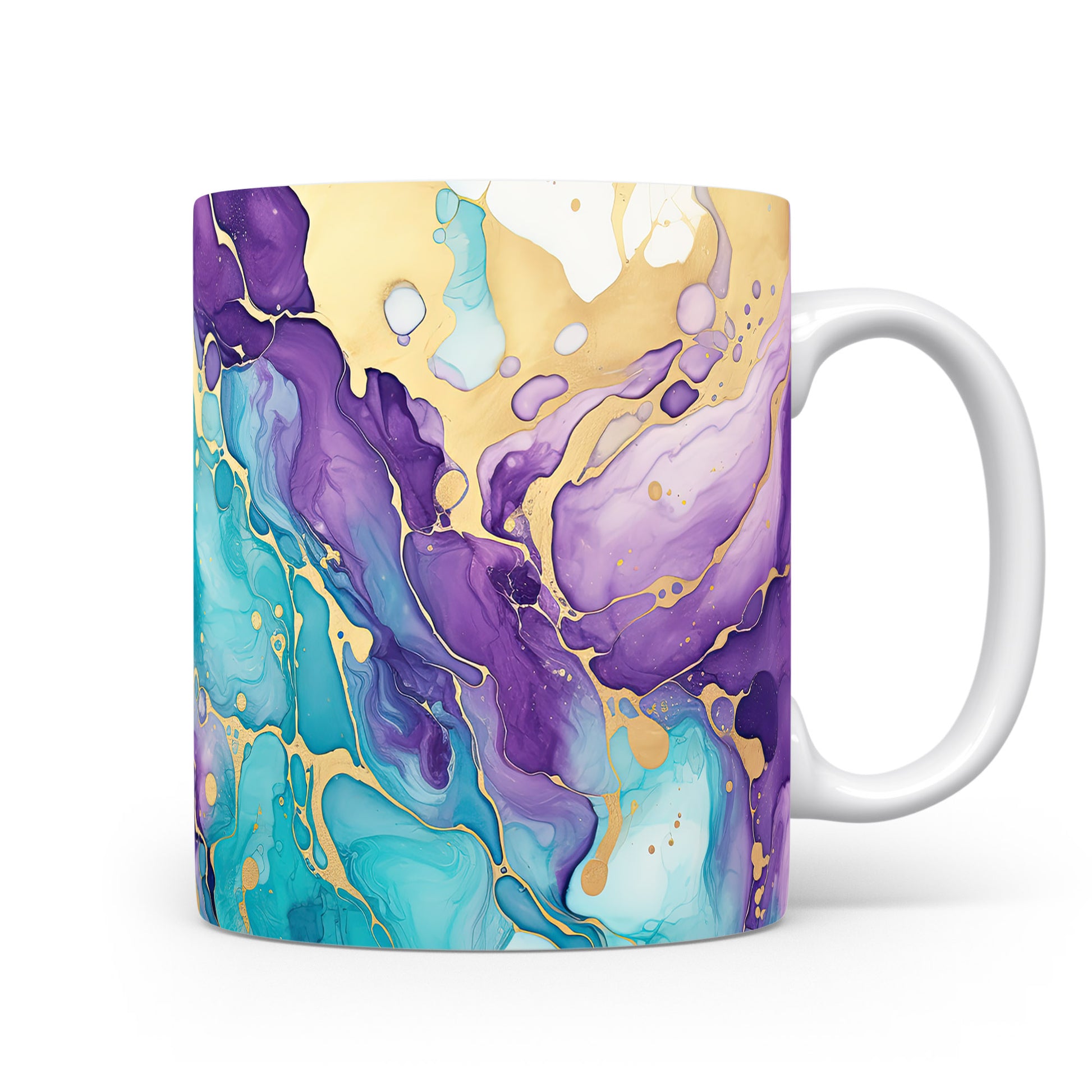 Tento hrnek kombinuje jemné barvy modré a fialové s elegantními zlatými akcenty. Ideální pro každodenní používání nebo jako stylový dárek.