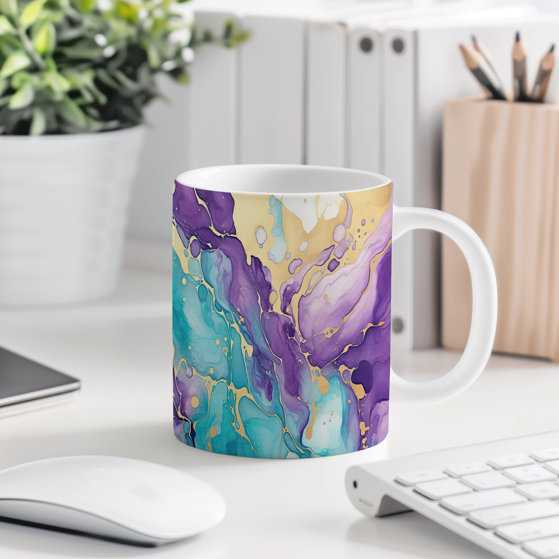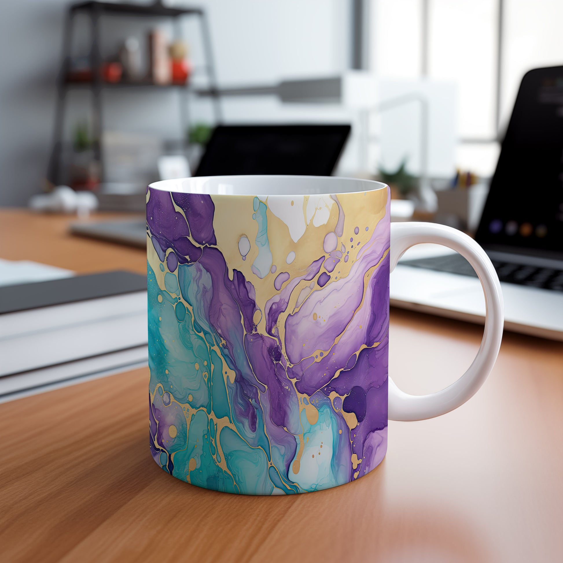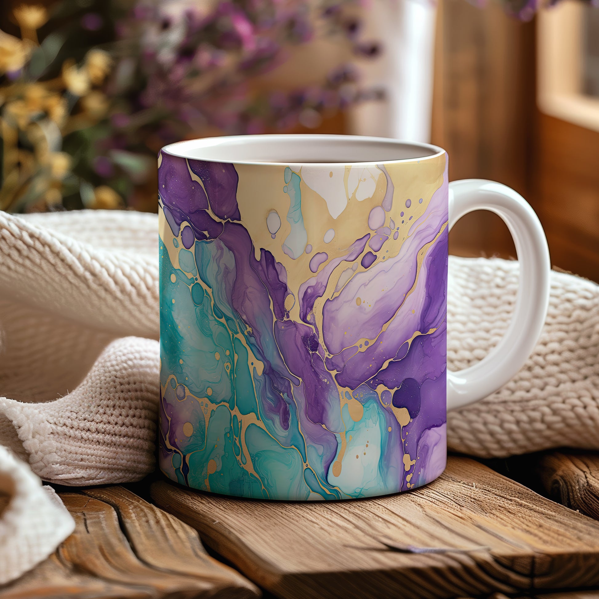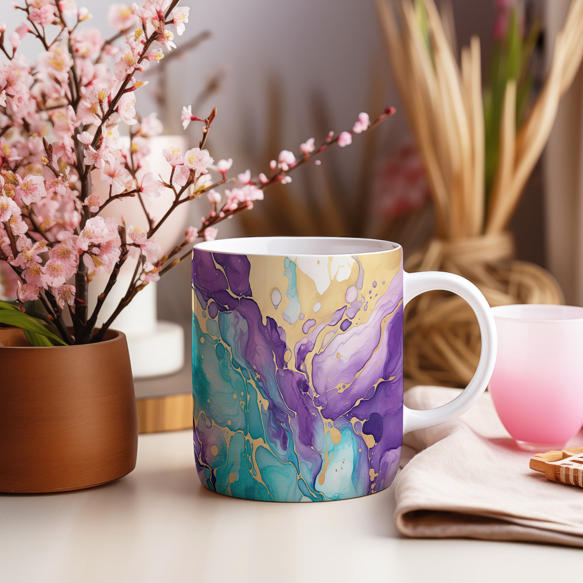 Tento hrnek kombinuje jemné barvy modré a fialové s elegantními zlatými akcenty. Ideální pro každodenní používání nebo jako stylový dárek.