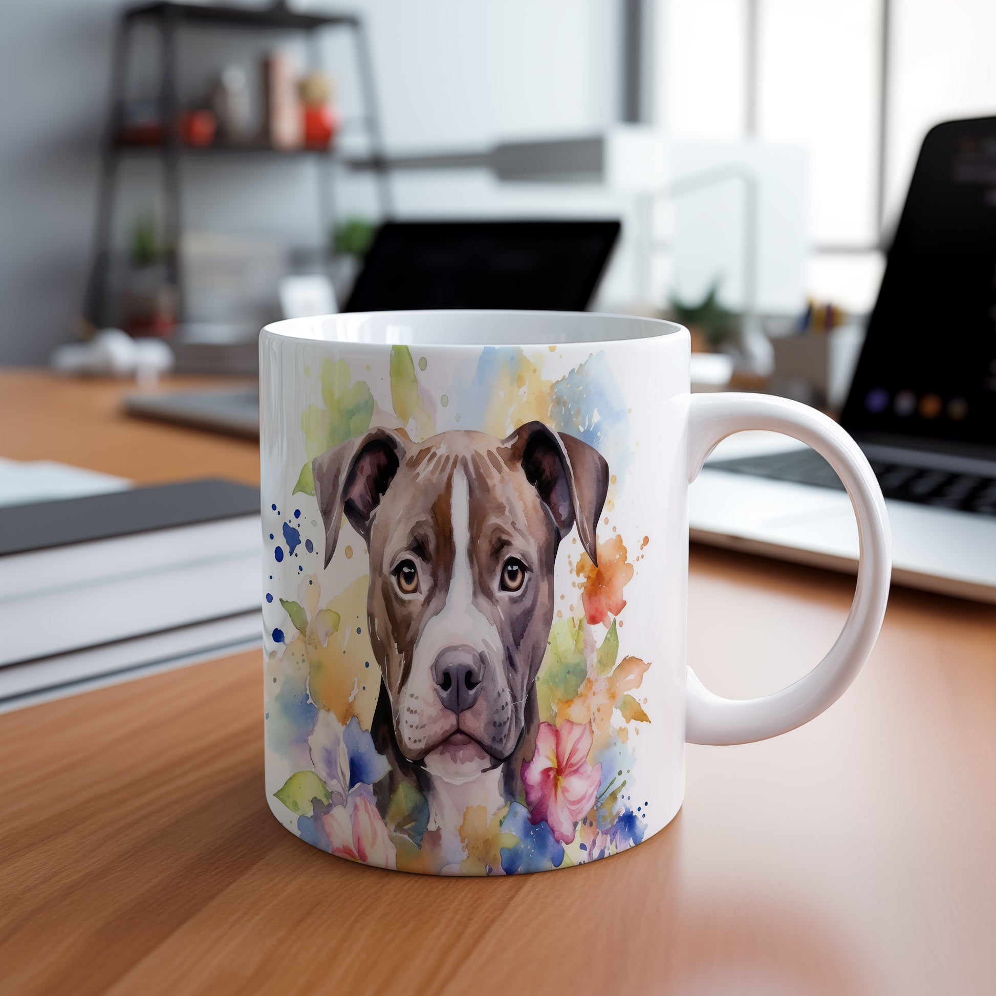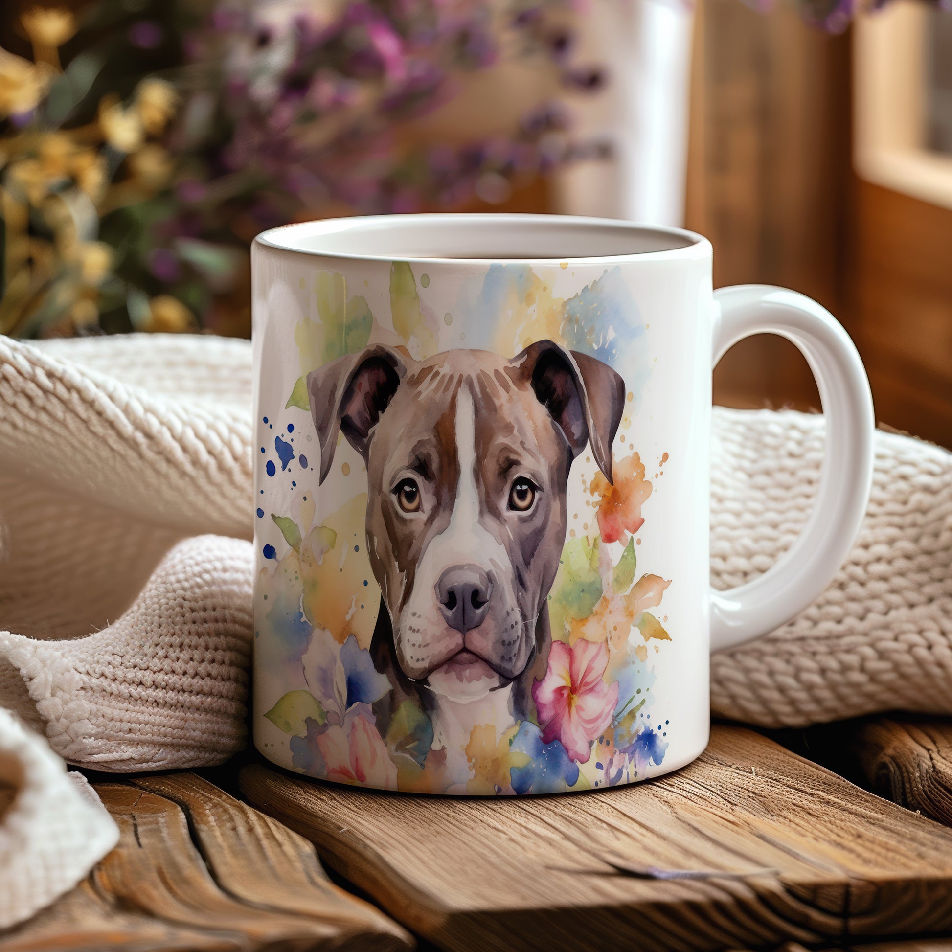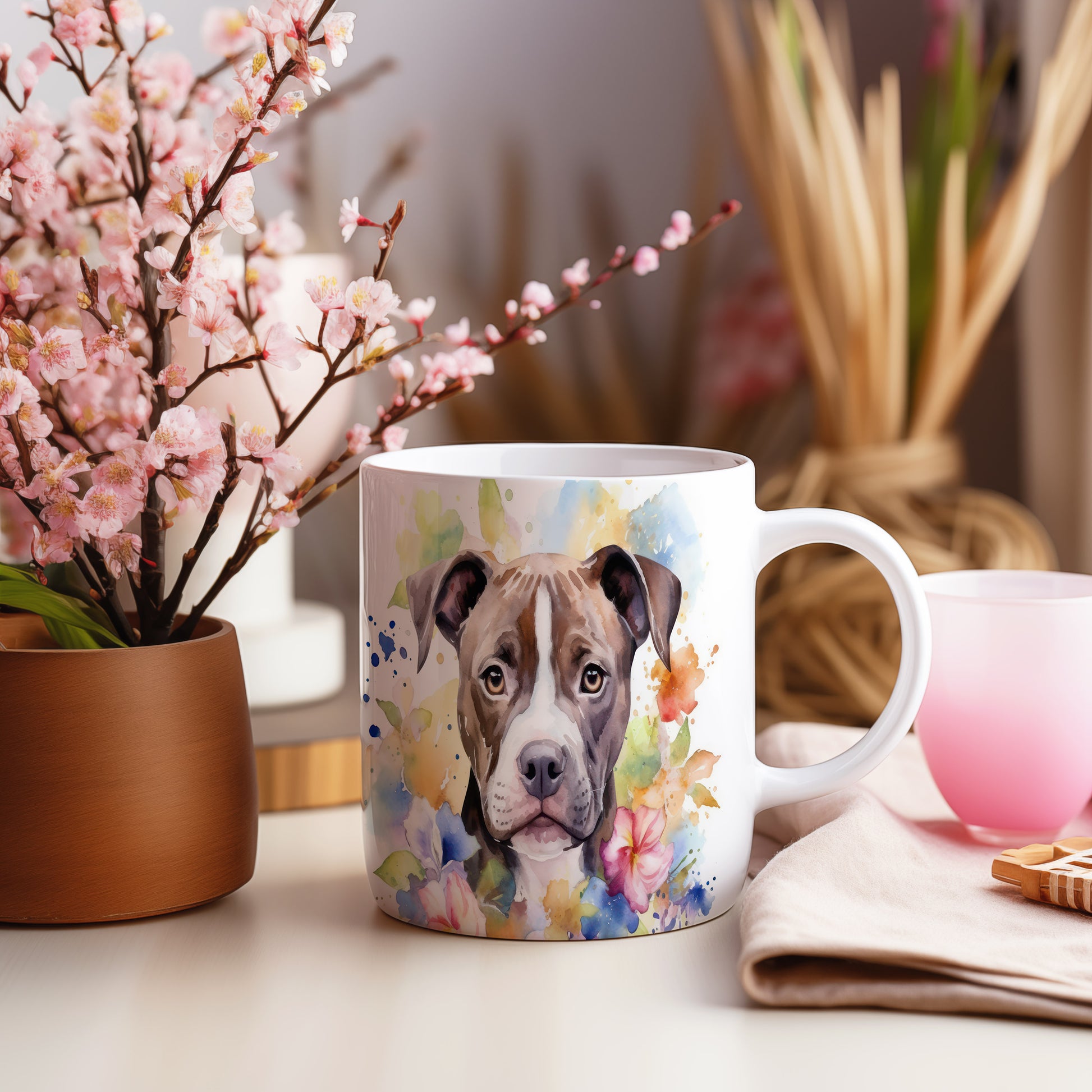 Tento hrnek s krásným vyobrazením pitbula a barevnými květinami ozdobí každý stůl. Ideální pro milovníky psů a originální dárky.