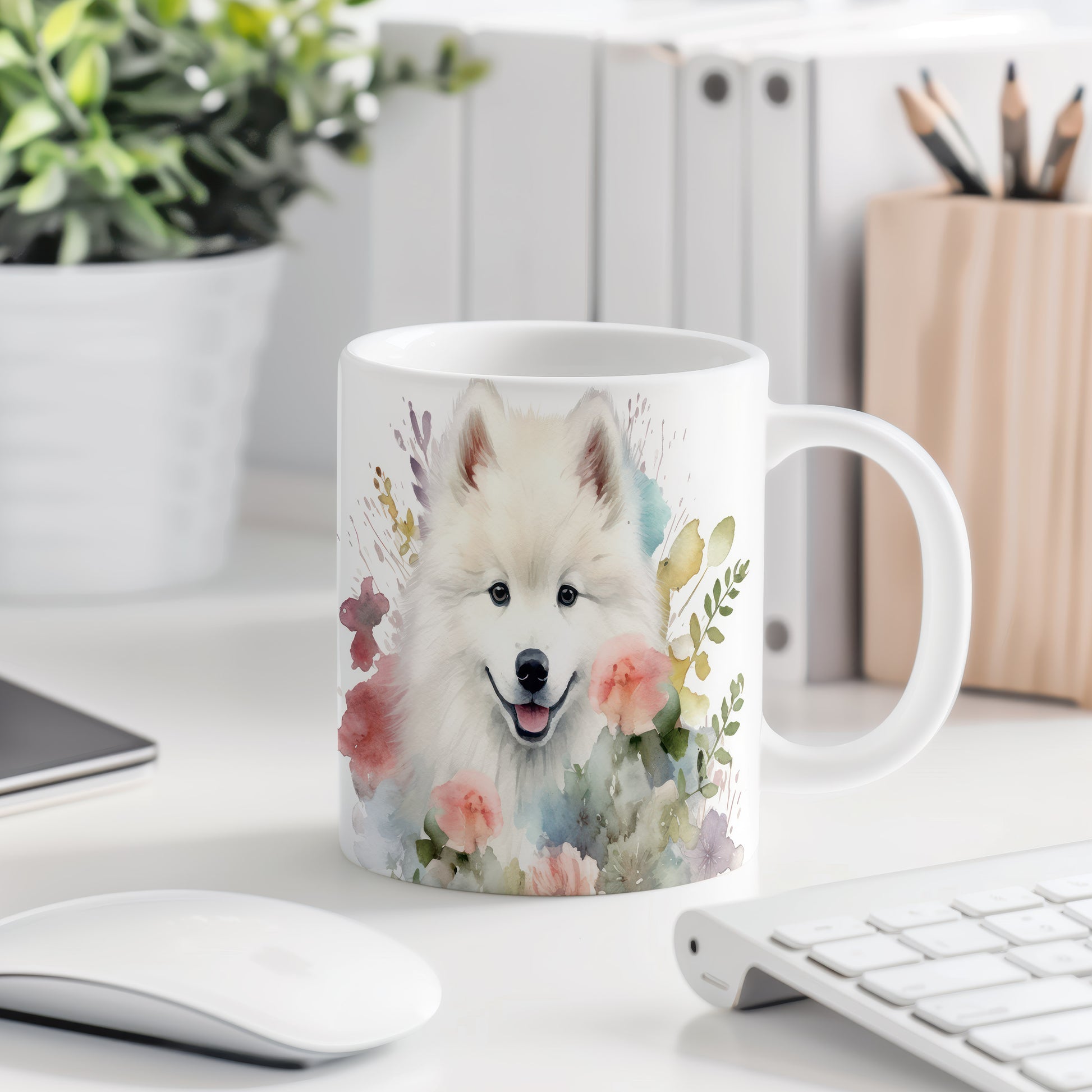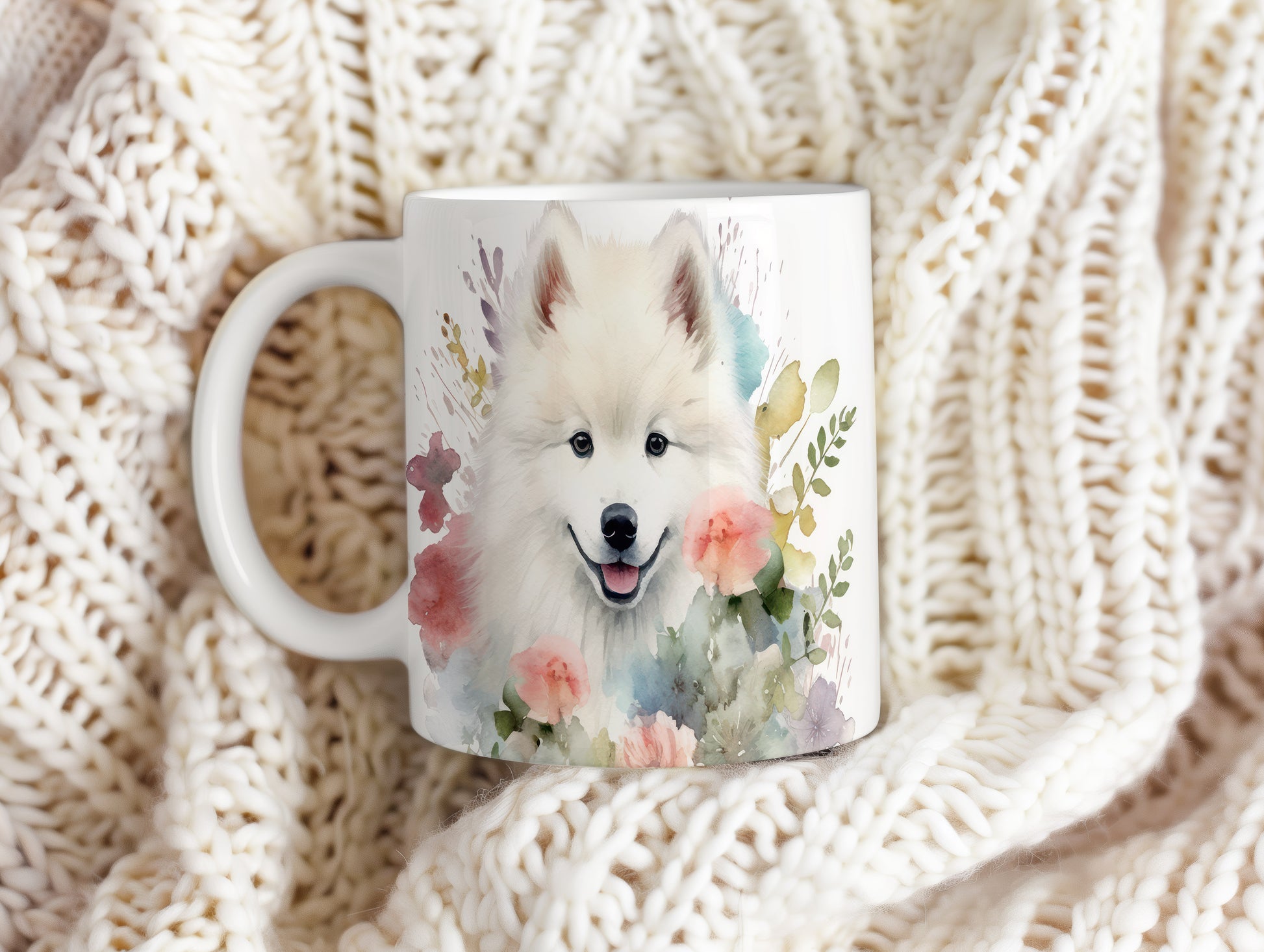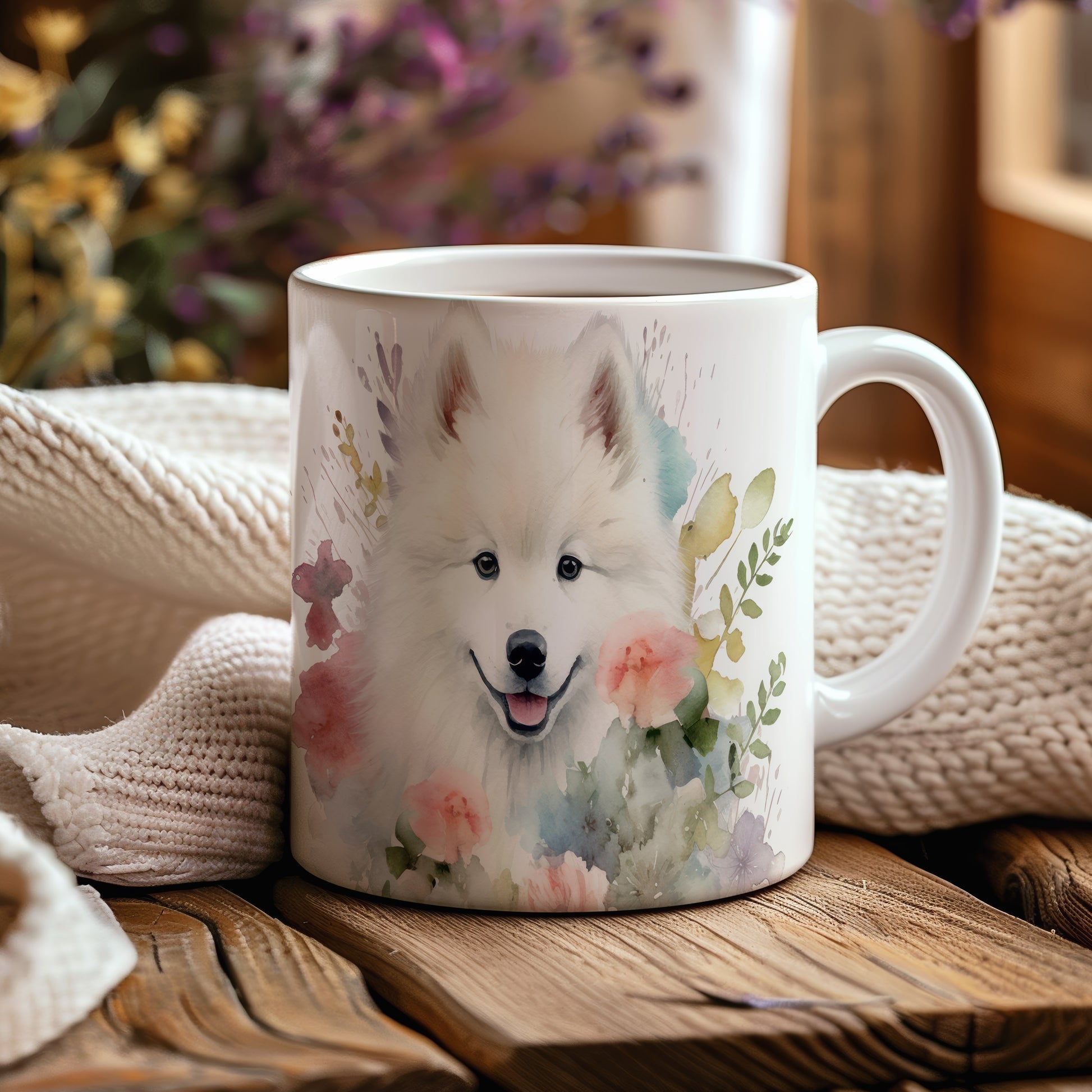 Hrnek s motivem samojeda a květin – originální dárek pro milovníky psů