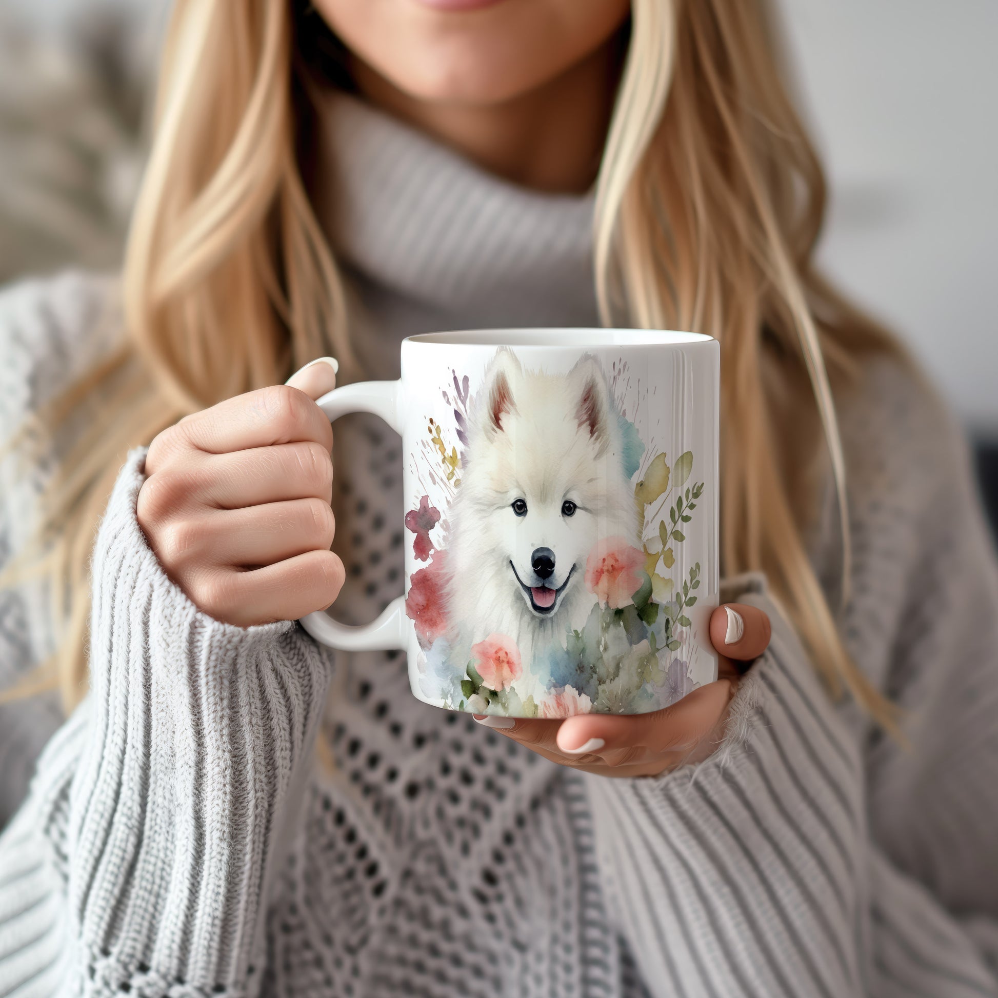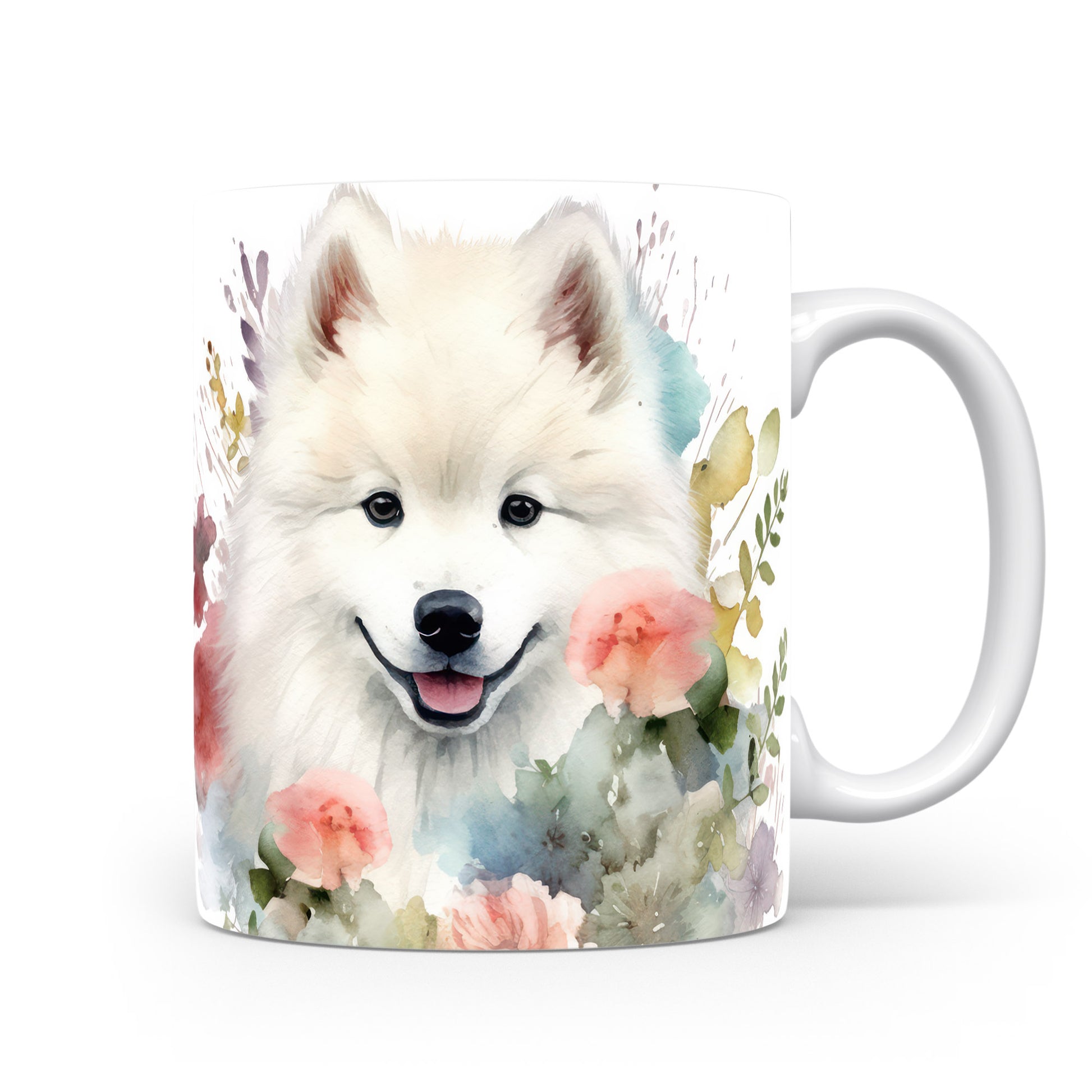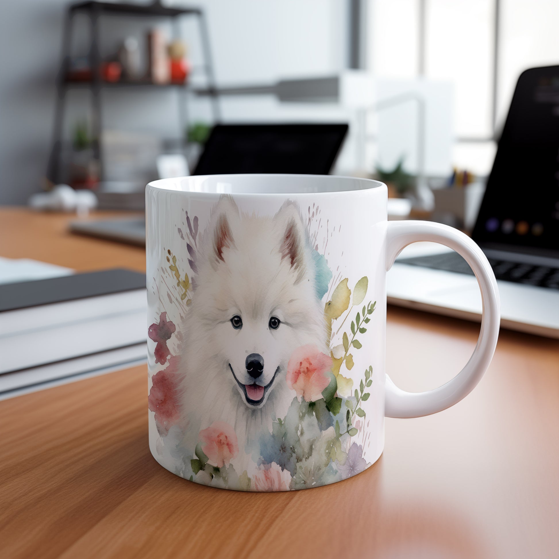 Hrnek s motivem samojeda a květin – originální dárek pro milovníky psů