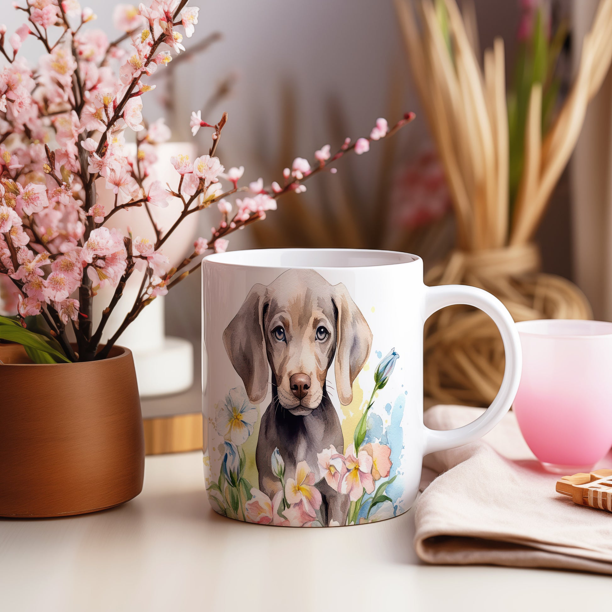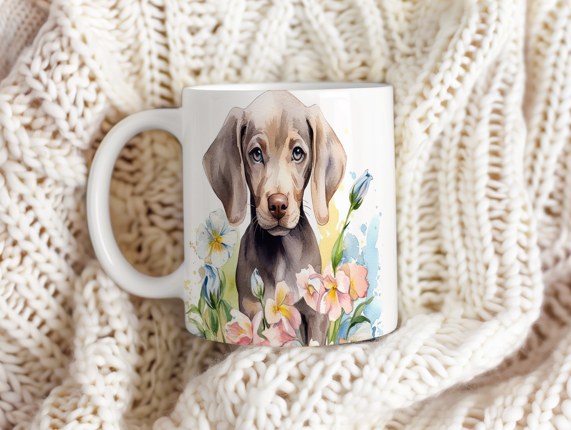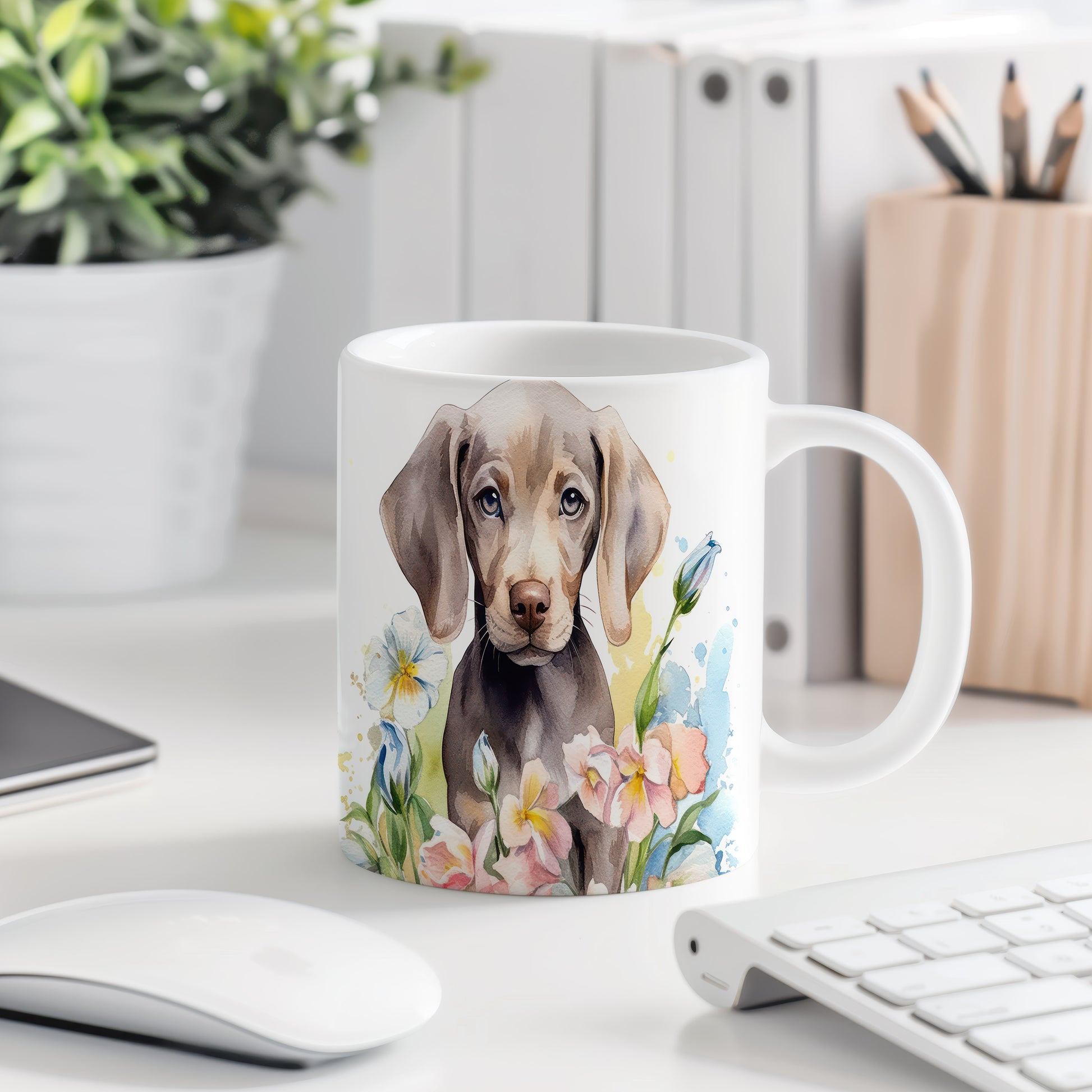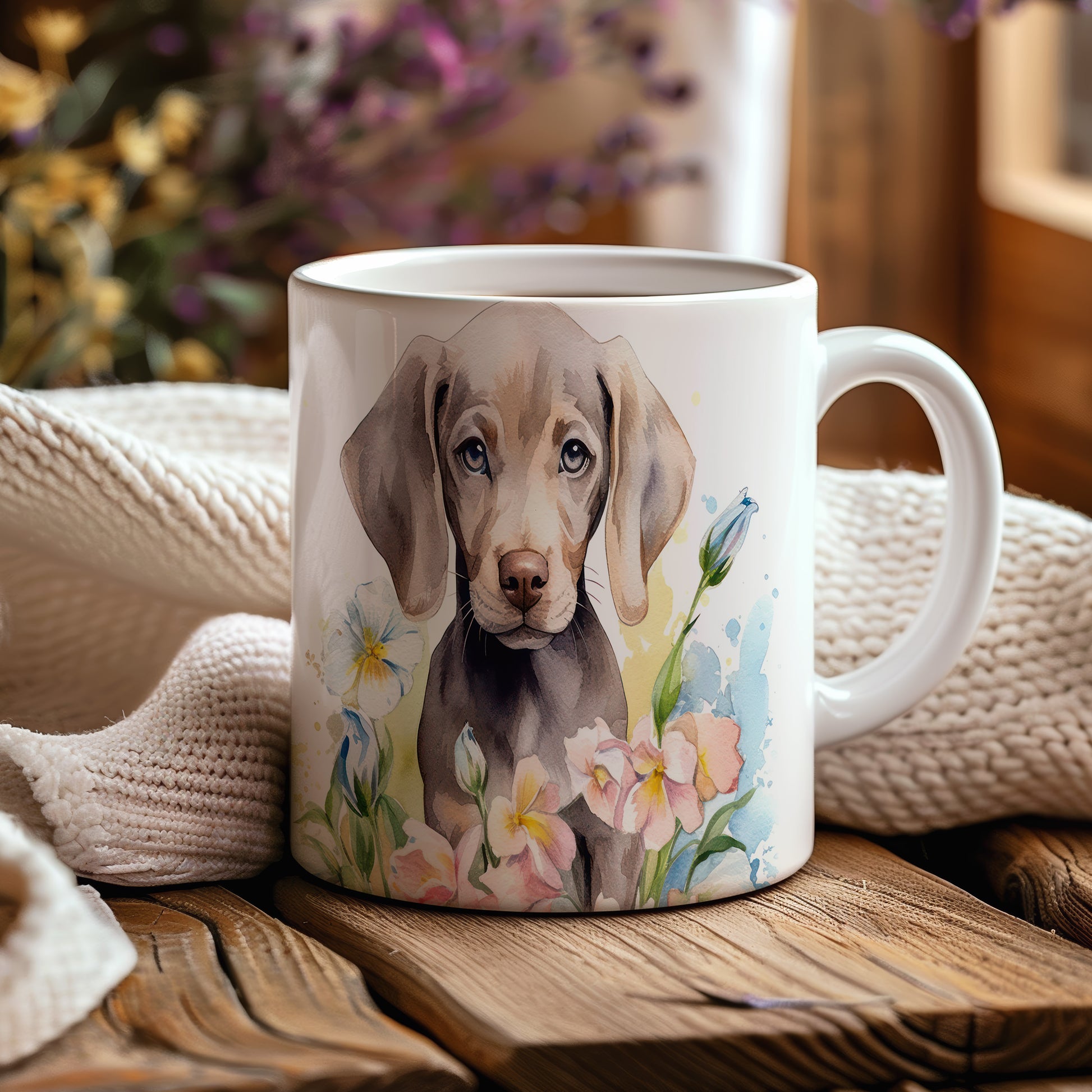 Tento hrníček s ilustrací roztomilého štěněte a barevnými květinami je ideální pro milovníky psů. Skvěle se hodí na kávu nebo čaj, a přináší radost do každého dne.
