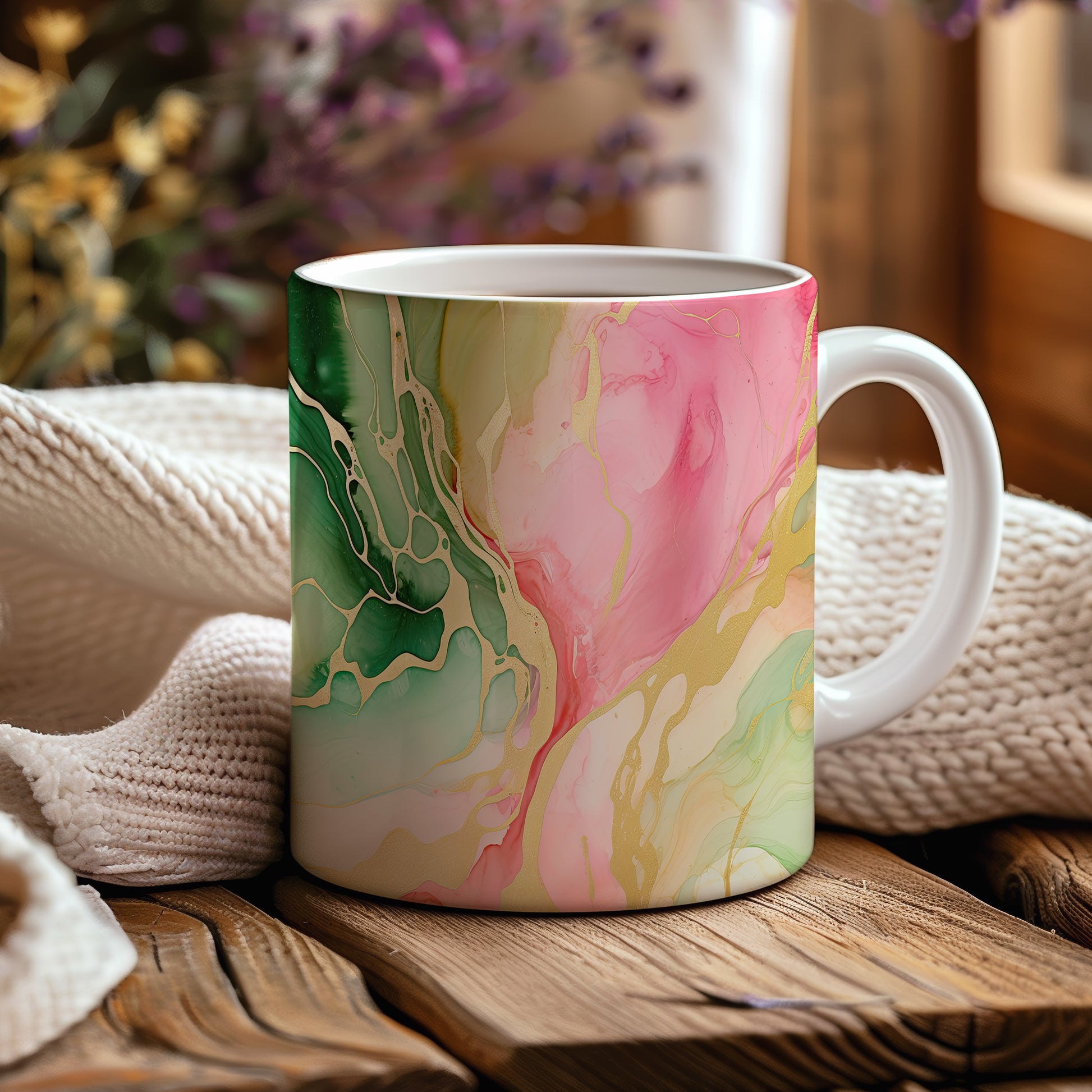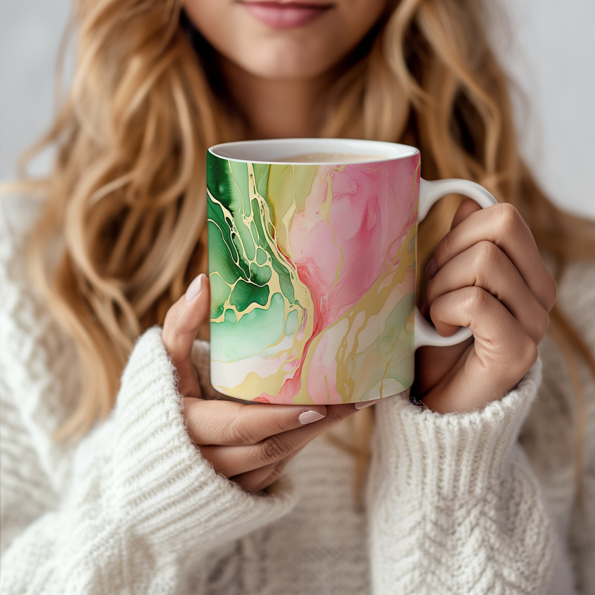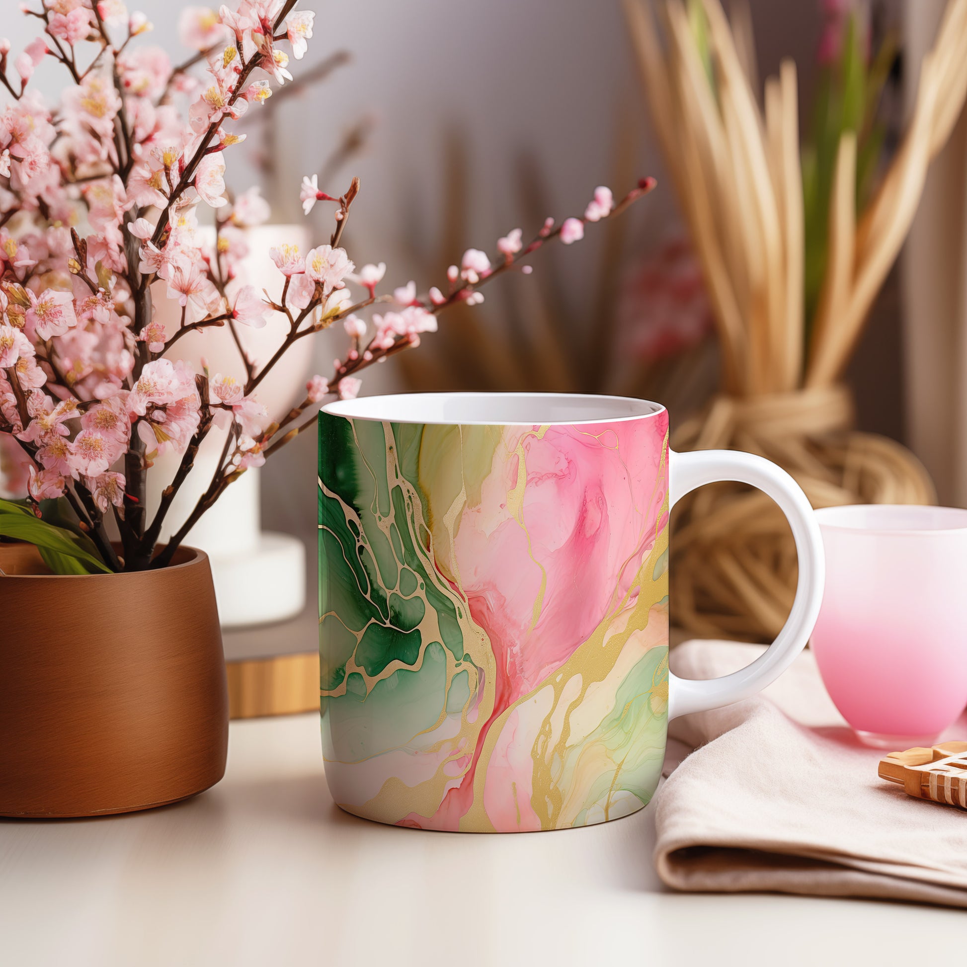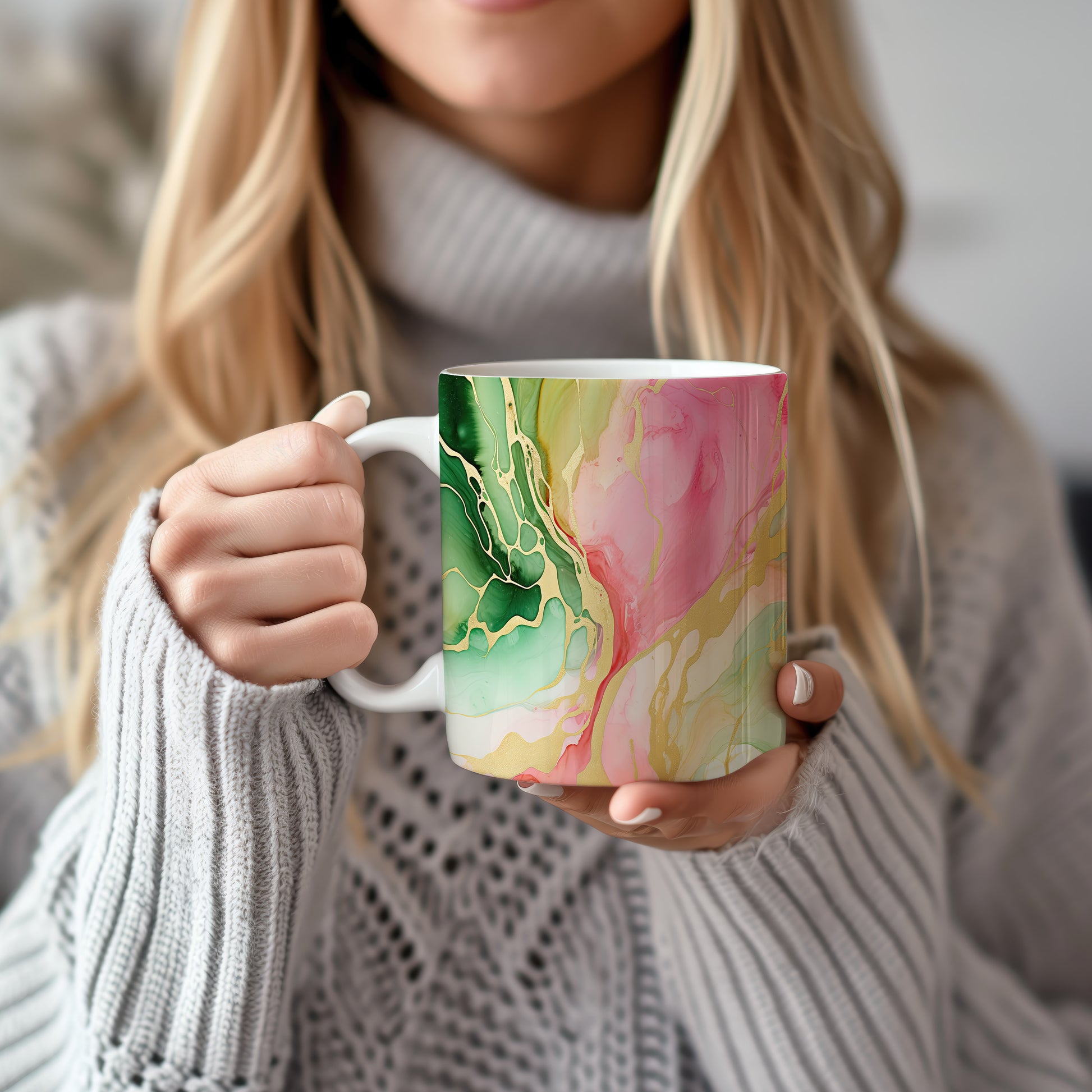 Tento stylový hrnek s unikátními abstraktními vzory v růžových a zelených barvách je ideální pro každodenní použití. Přidejte do svého domácího vybavení kousek umění a užijte si svůj oblíbený nápoj s elegancí.