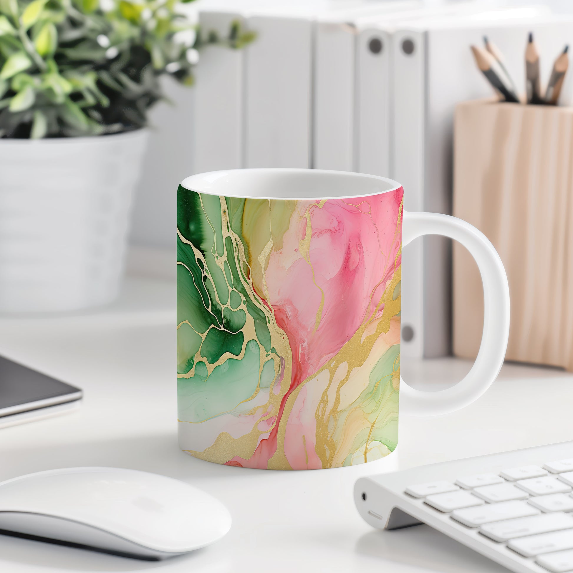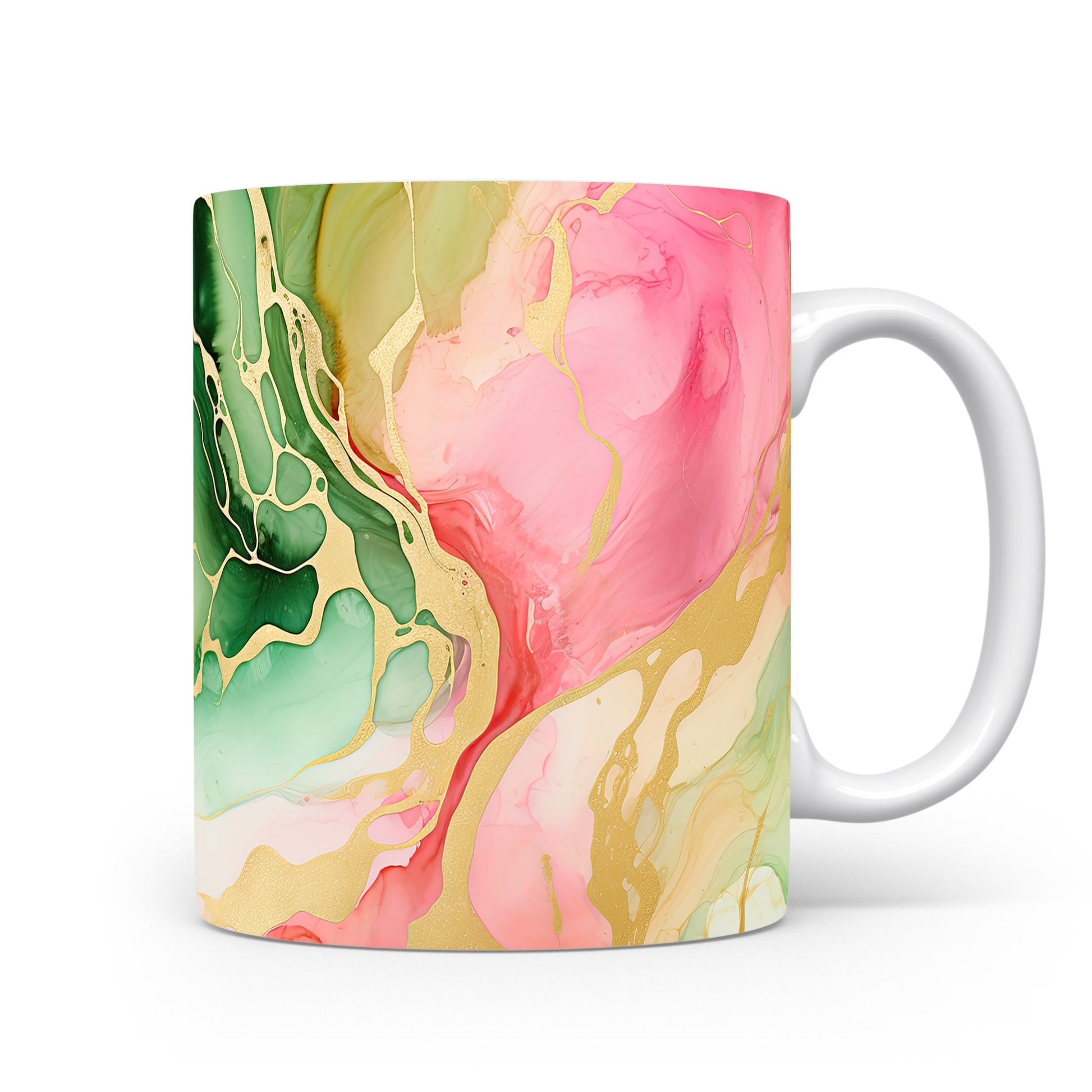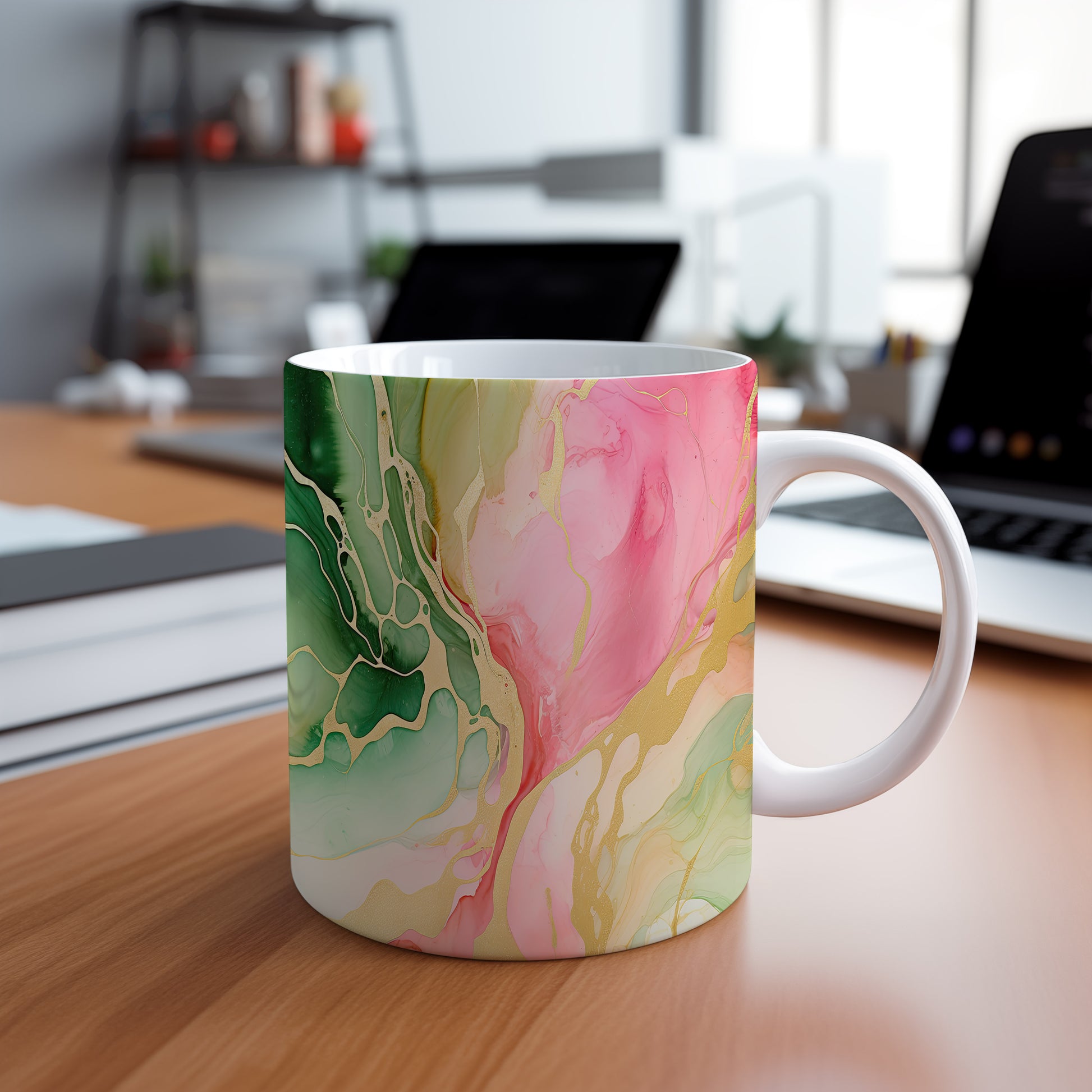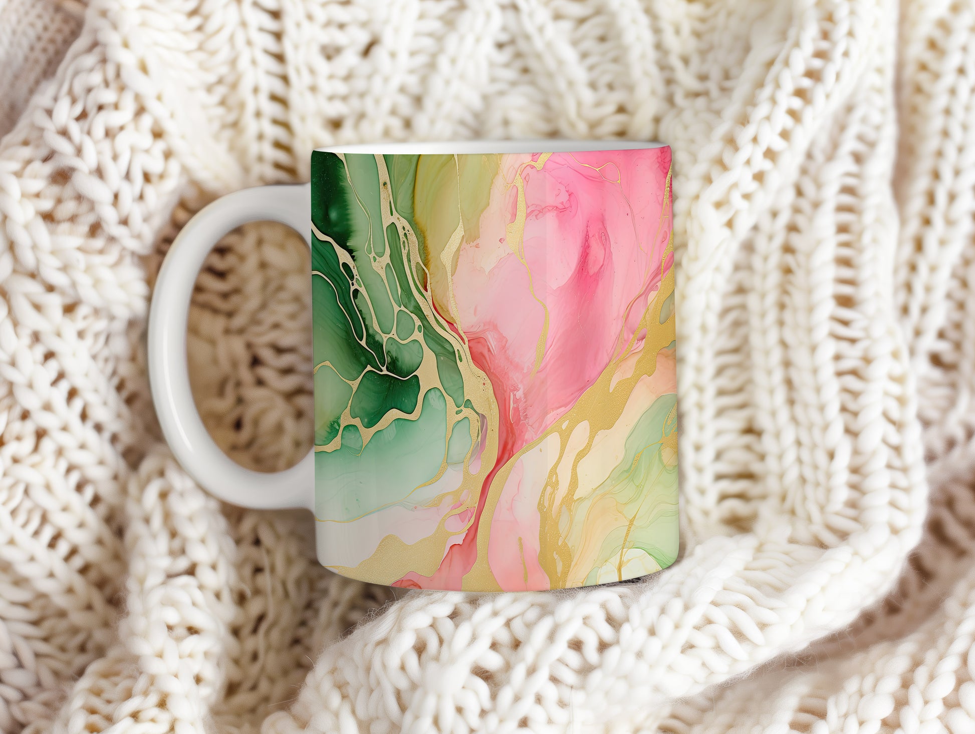 Tento stylový hrnek s unikátními abstraktními vzory v růžových a zelených barvách je ideální pro každodenní použití. Přidejte do svého domácího vybavení kousek umění a užijte si svůj oblíbený nápoj s elegancí.
