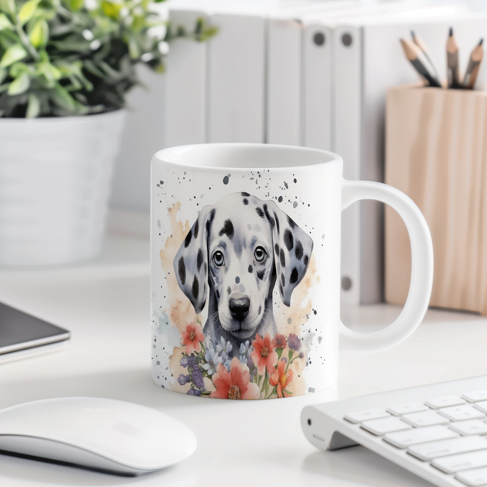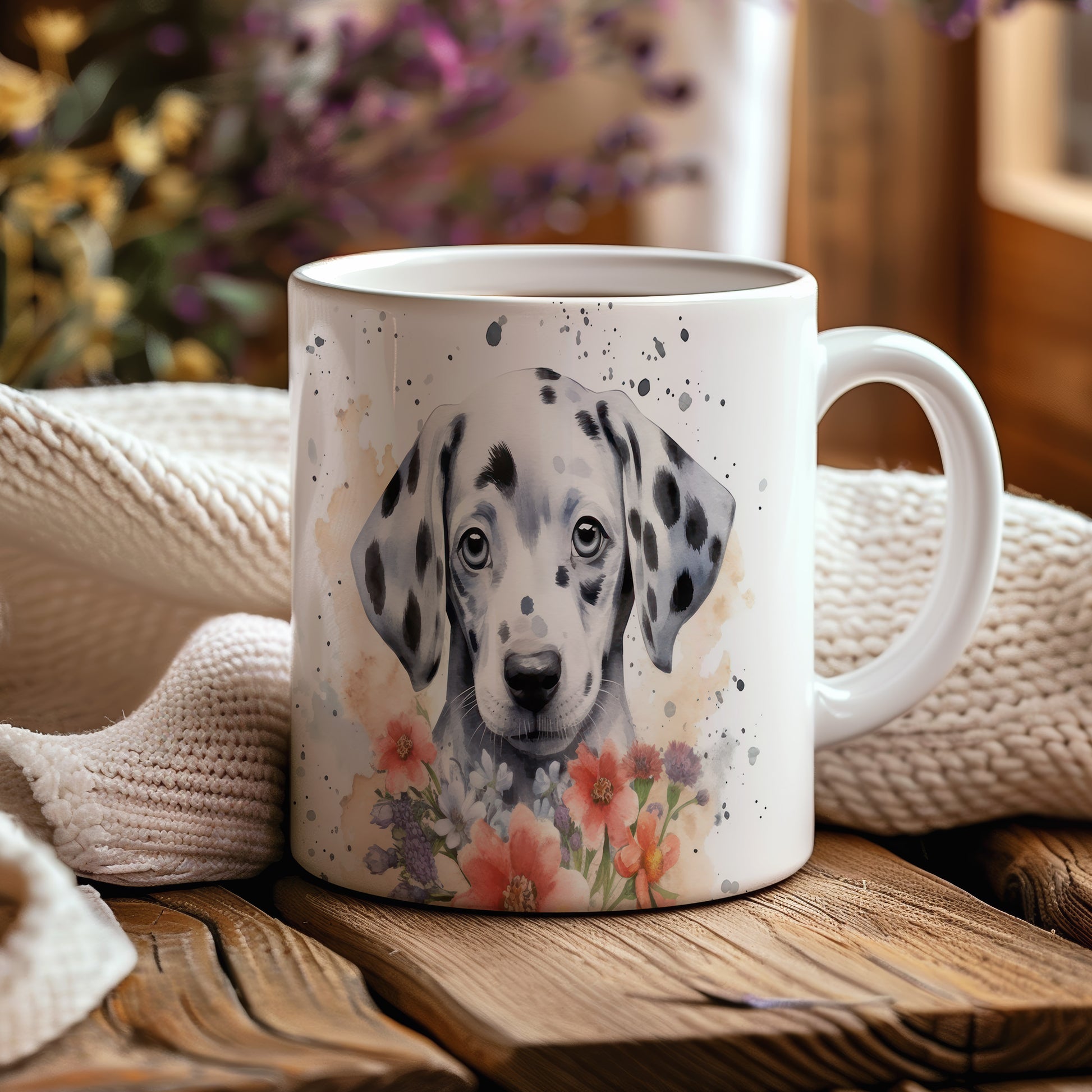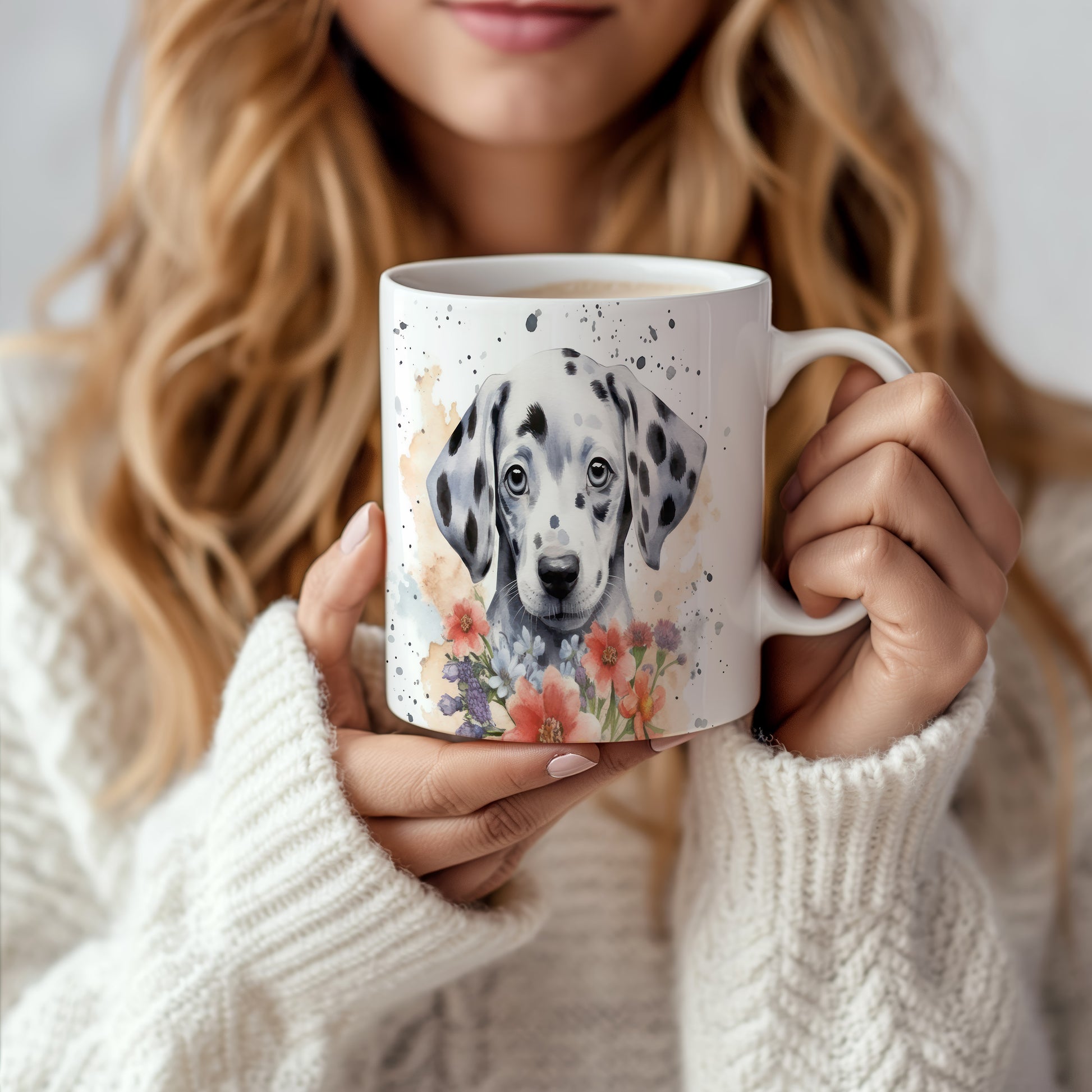 Tento hrníček s ilustrací dalmatinského štěněte a barevných květin přináší radost do každého dne. Skvělý dárek pro milovníky psů a přírody.