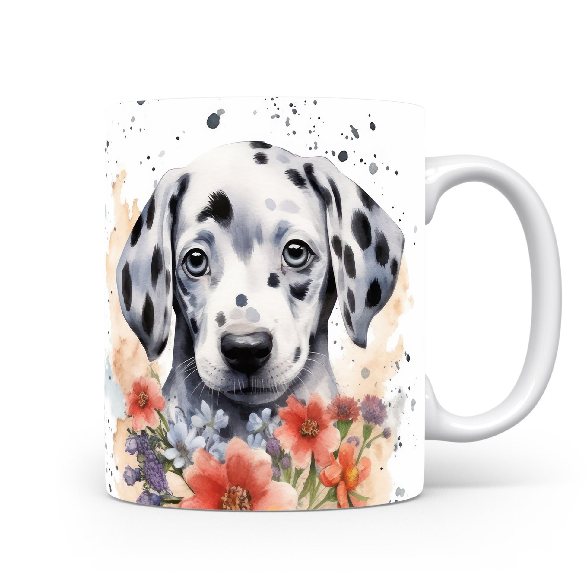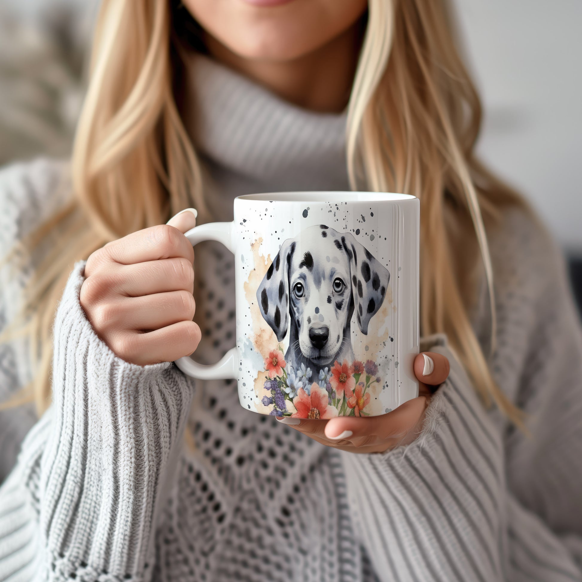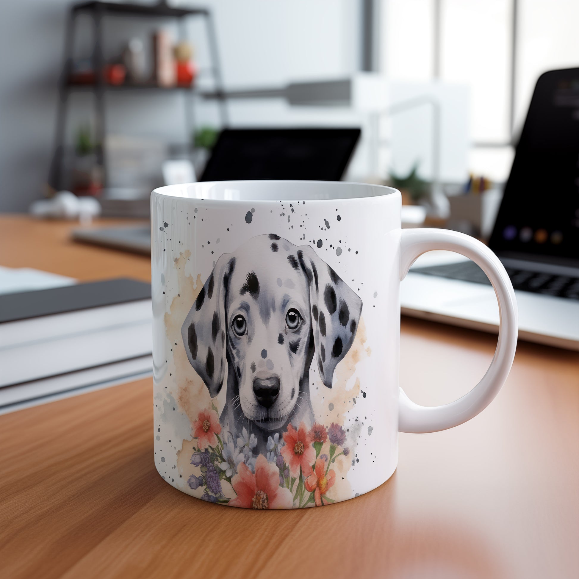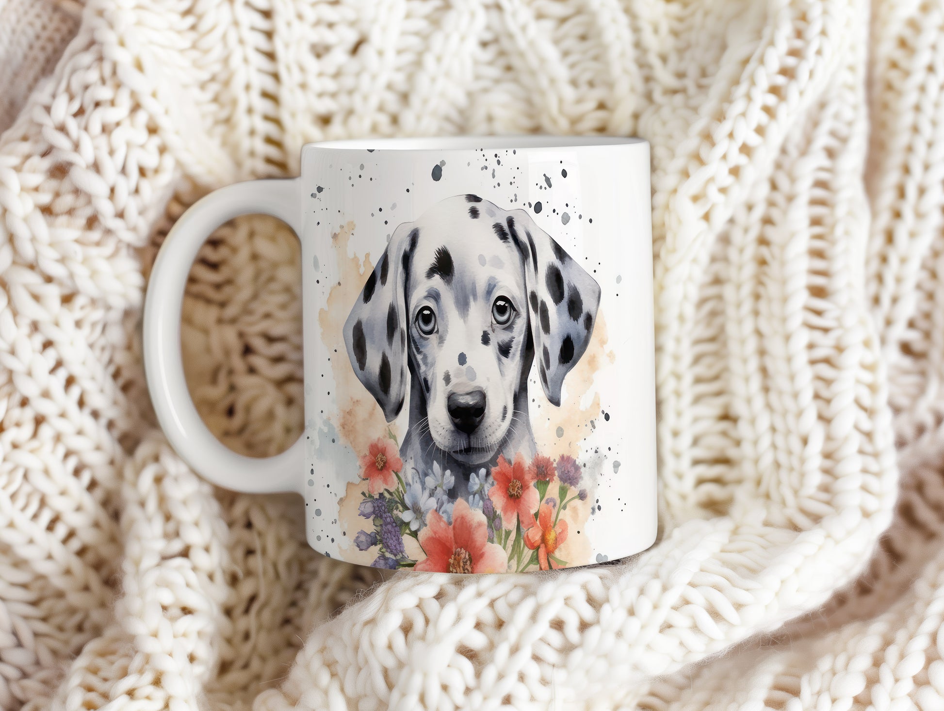 Tento hrníček s ilustrací dalmatinského štěněte a barevných květin přináší radost do každého dne. Skvělý dárek pro milovníky psů a přírody.