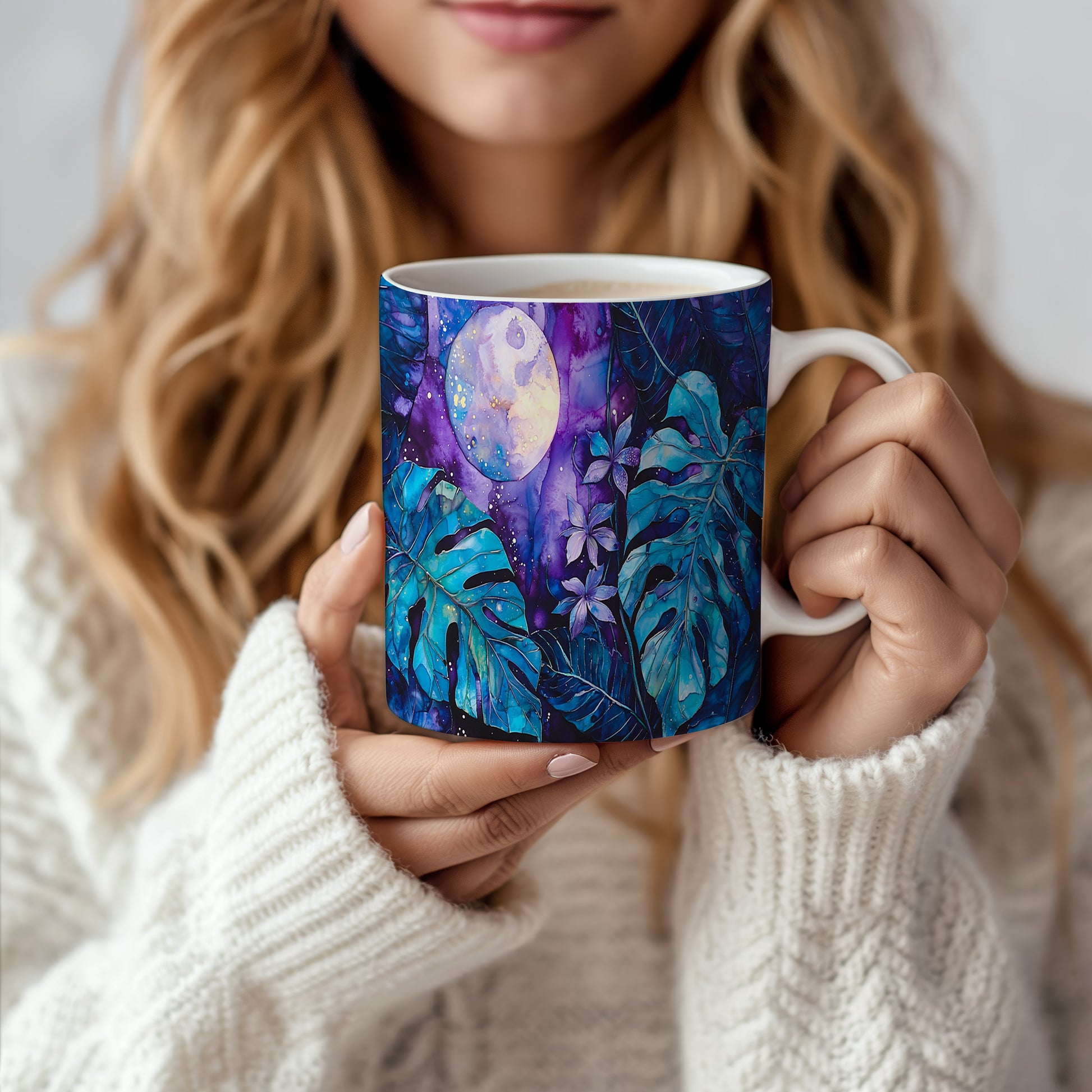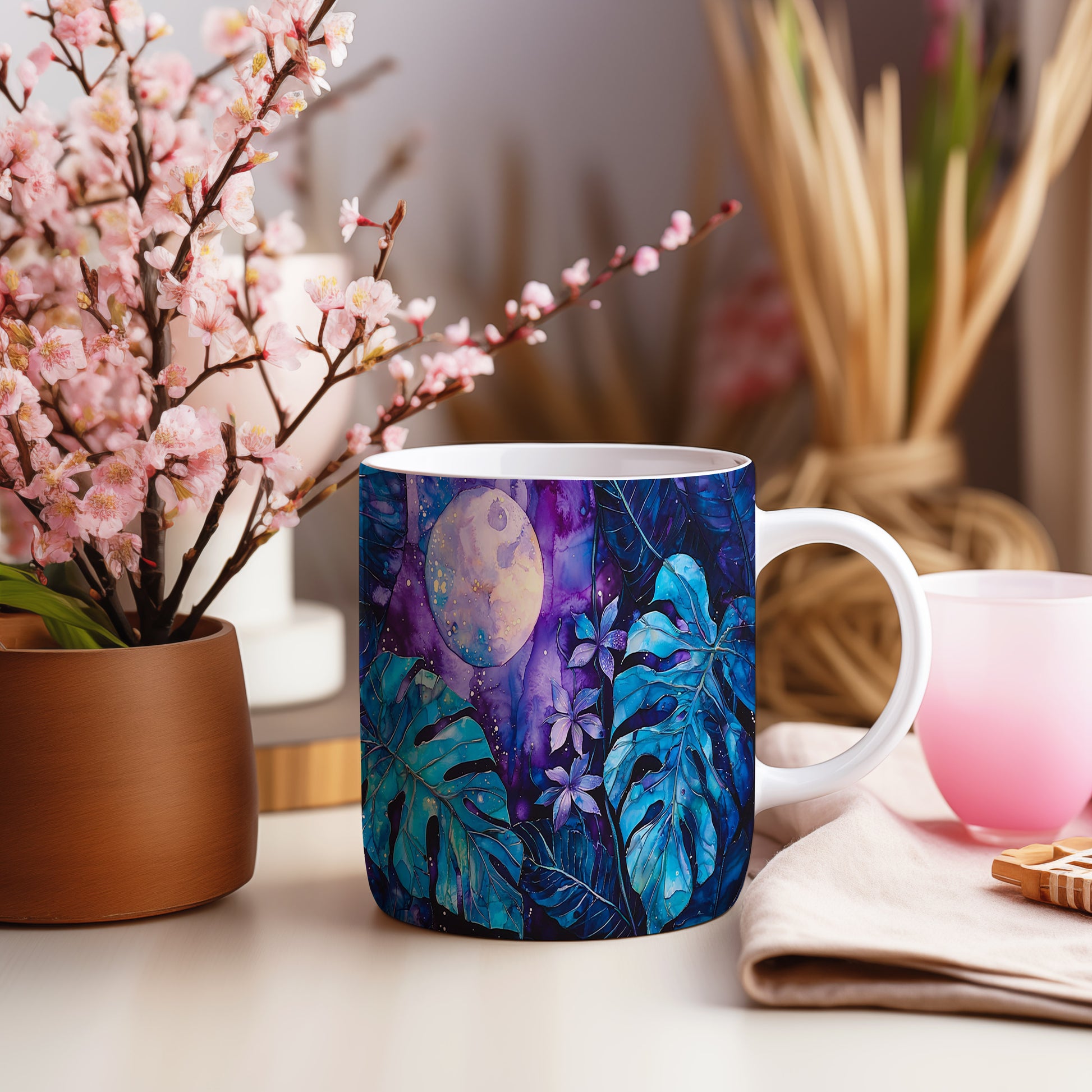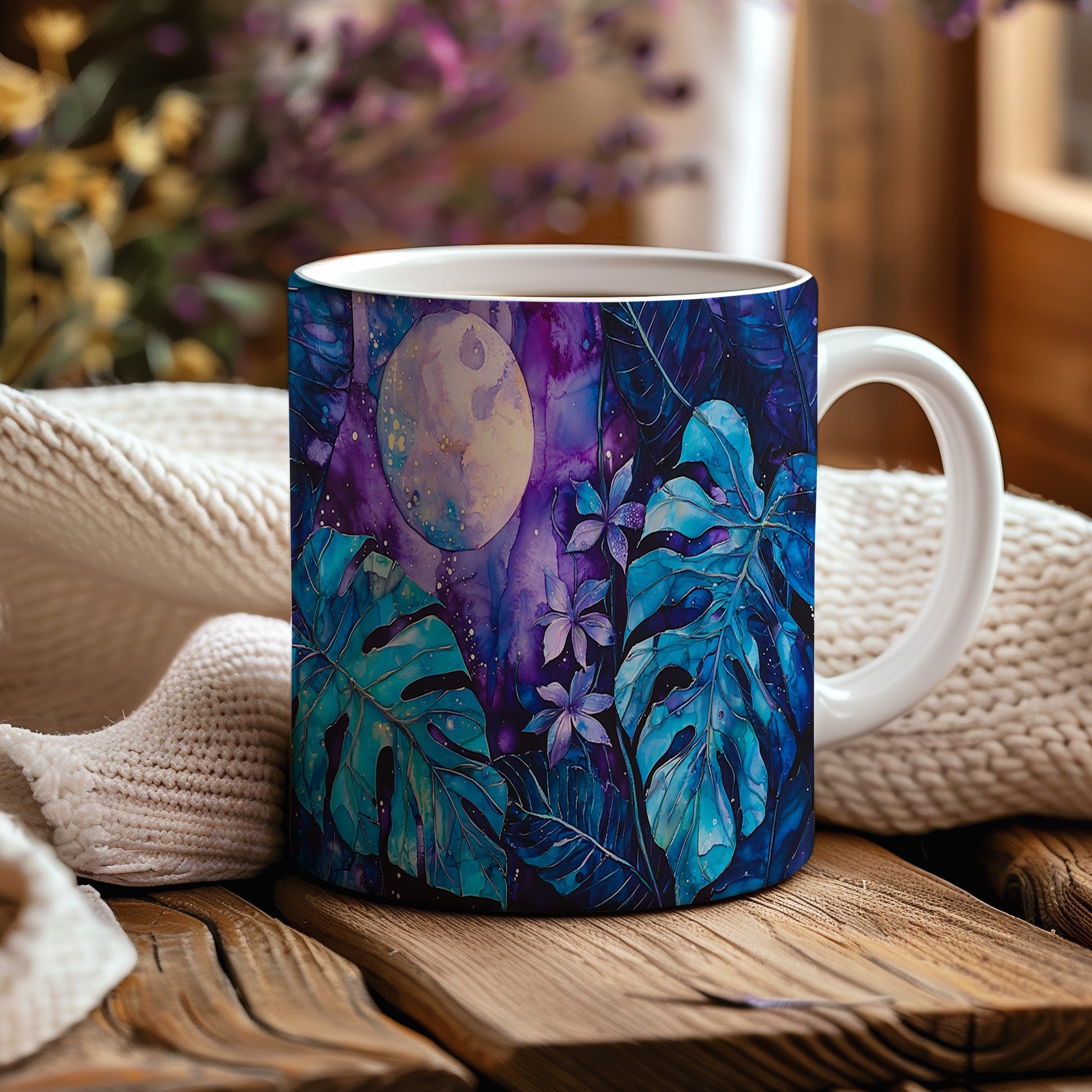 Tento hrnek přináší kouzlo noční přírody s krásným designem modro-fialových listů a měsíce. Ideální pro milovníky přírody a umění.