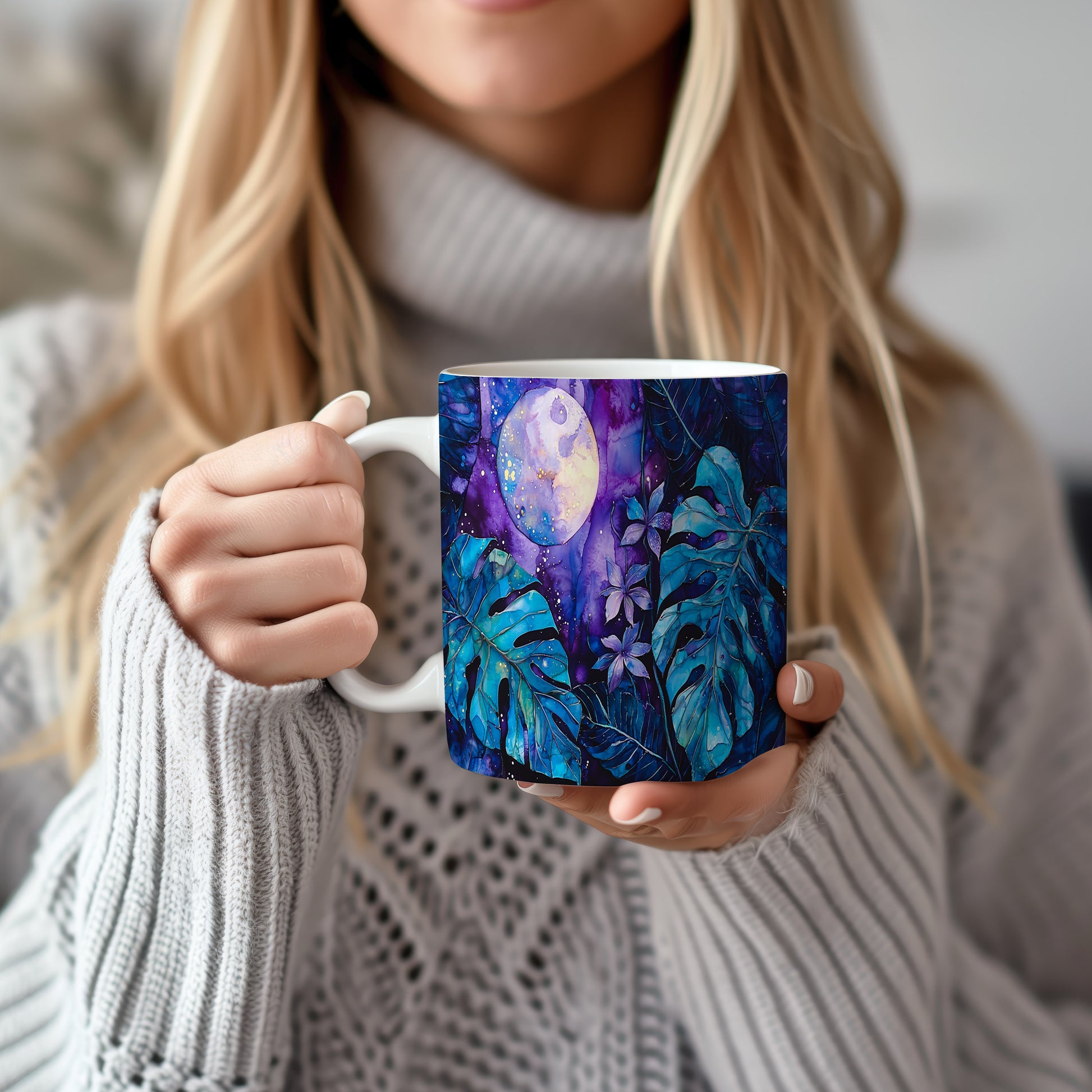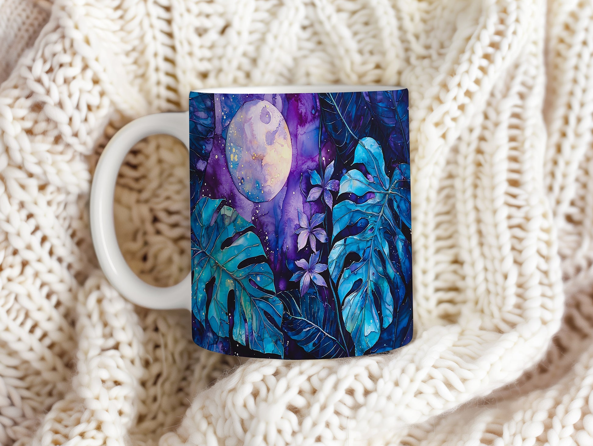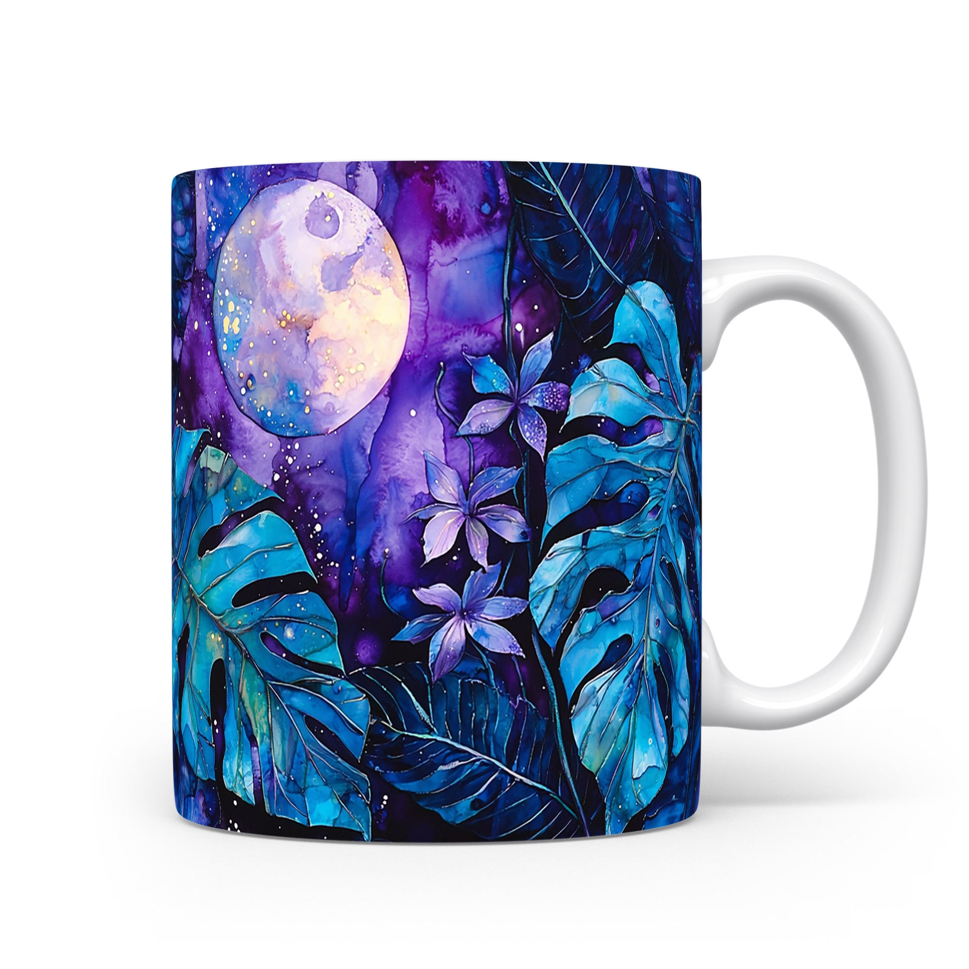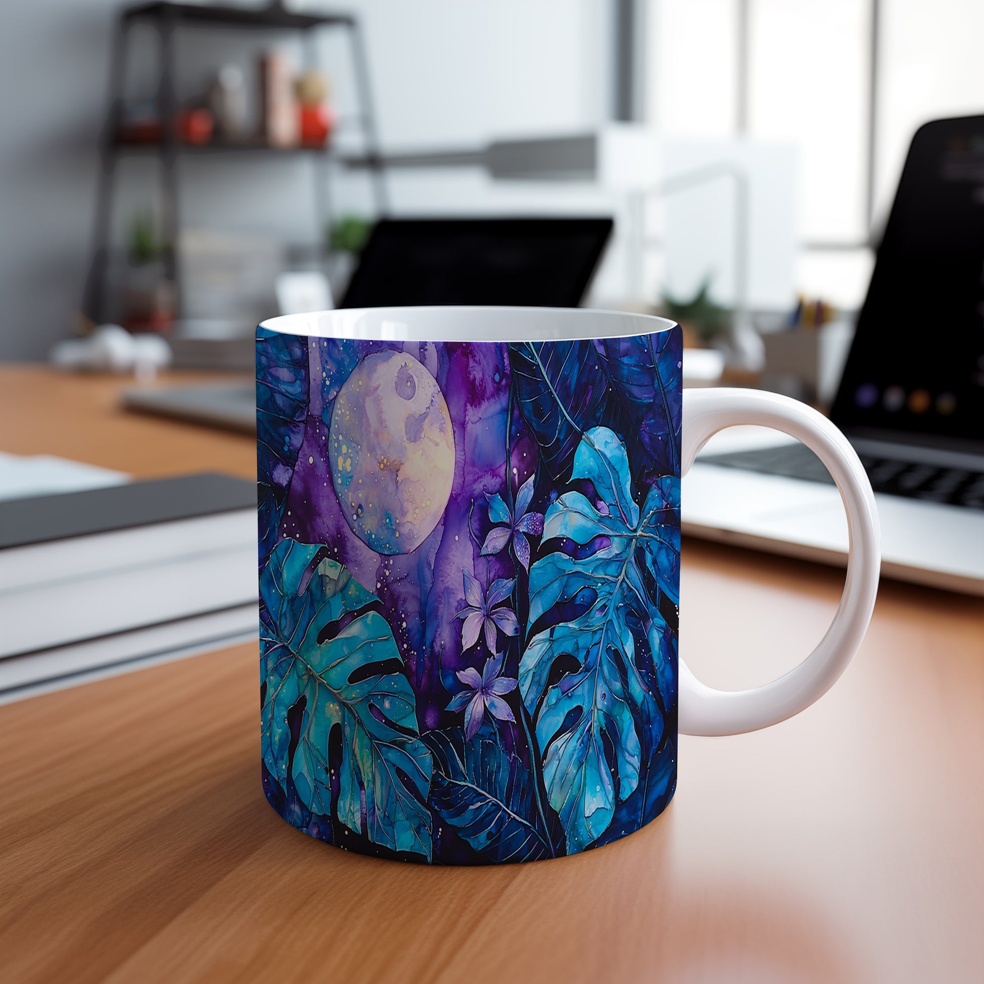 Tento hrnek přináší kouzlo noční přírody s krásným designem modro-fialových listů a měsíce. Ideální pro milovníky přírody a umění.