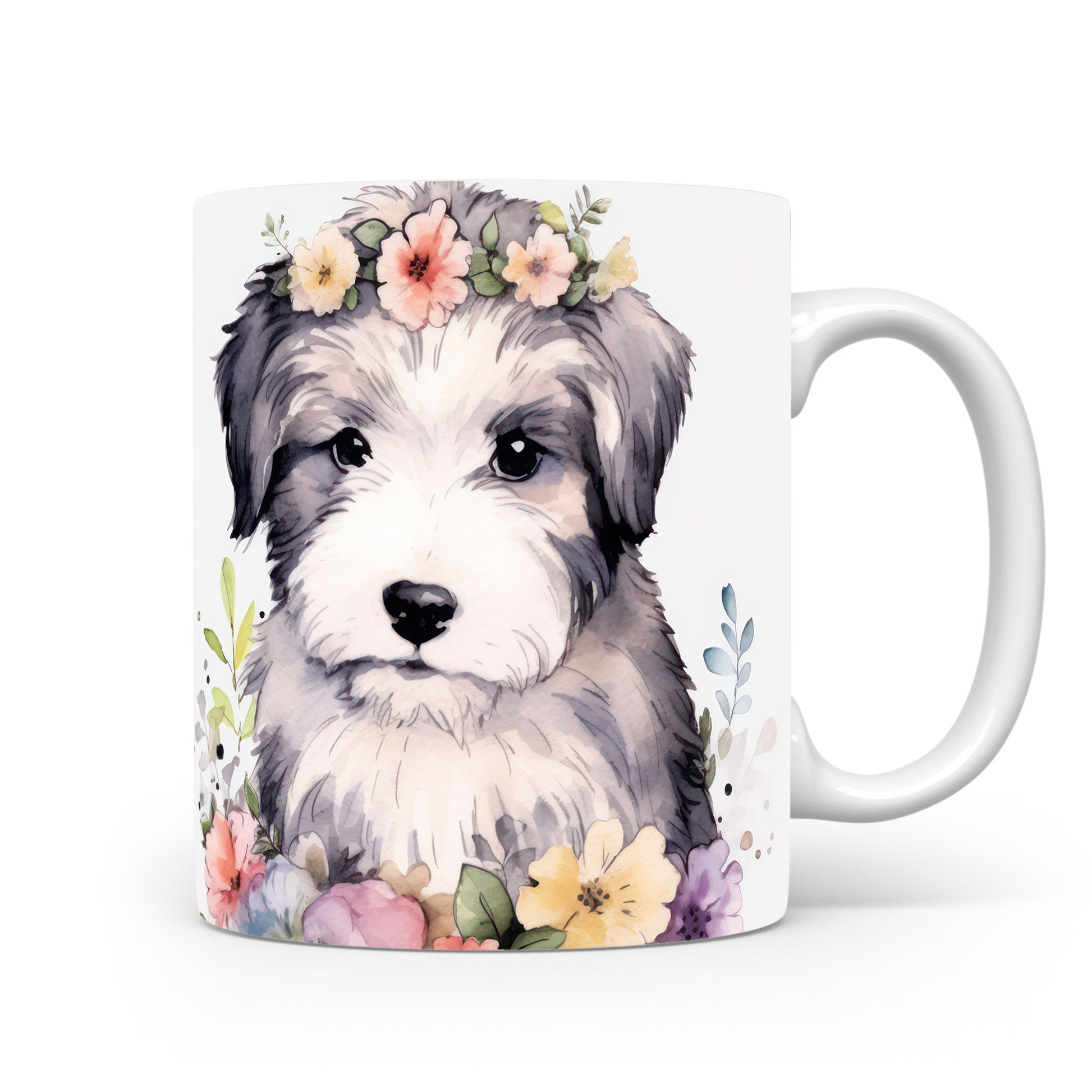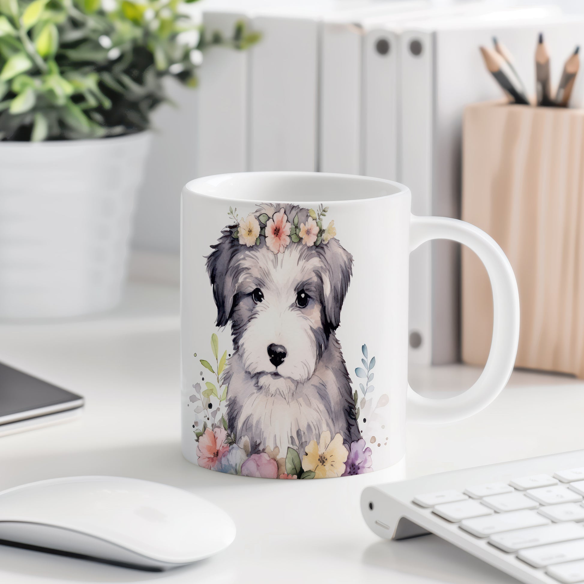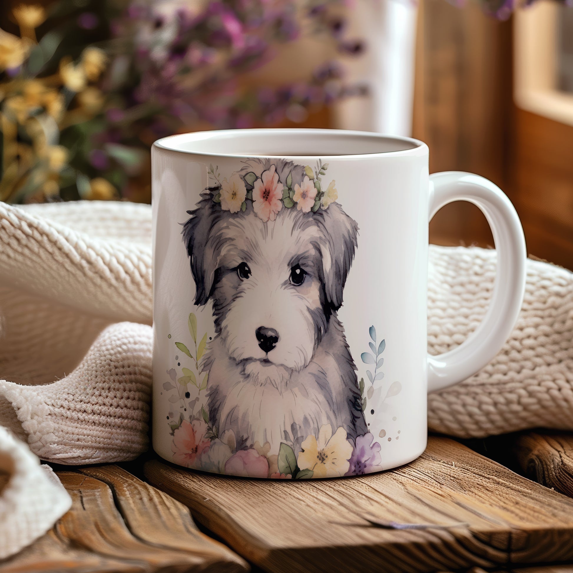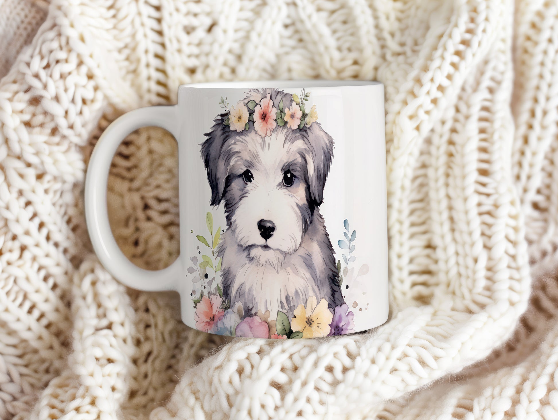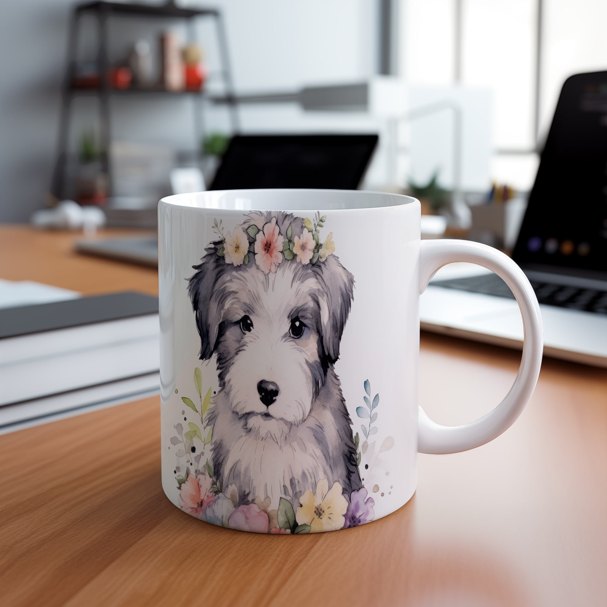 Hrnek s roztomilým štěnětem a květinovým věncem