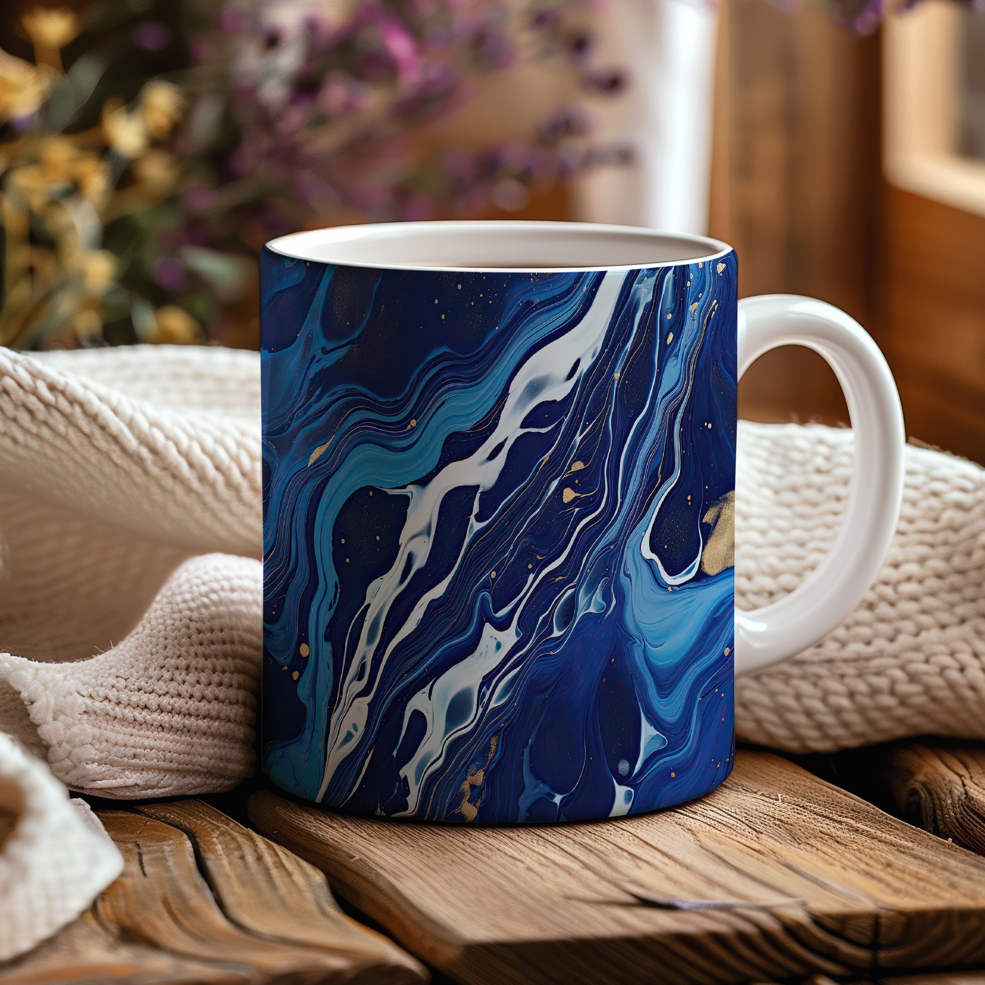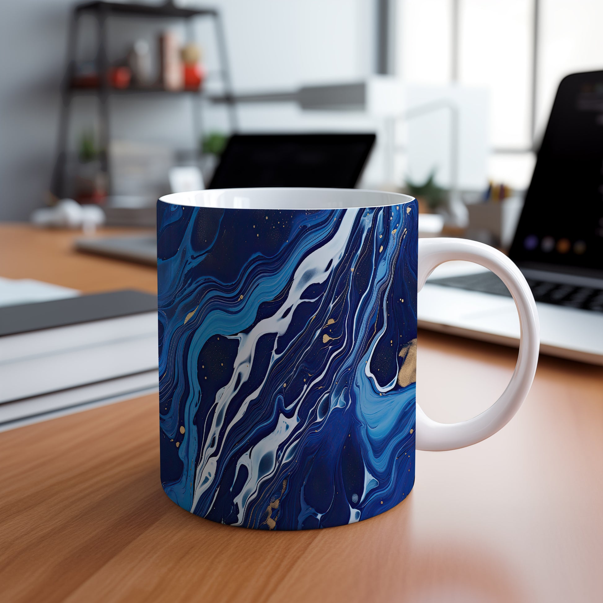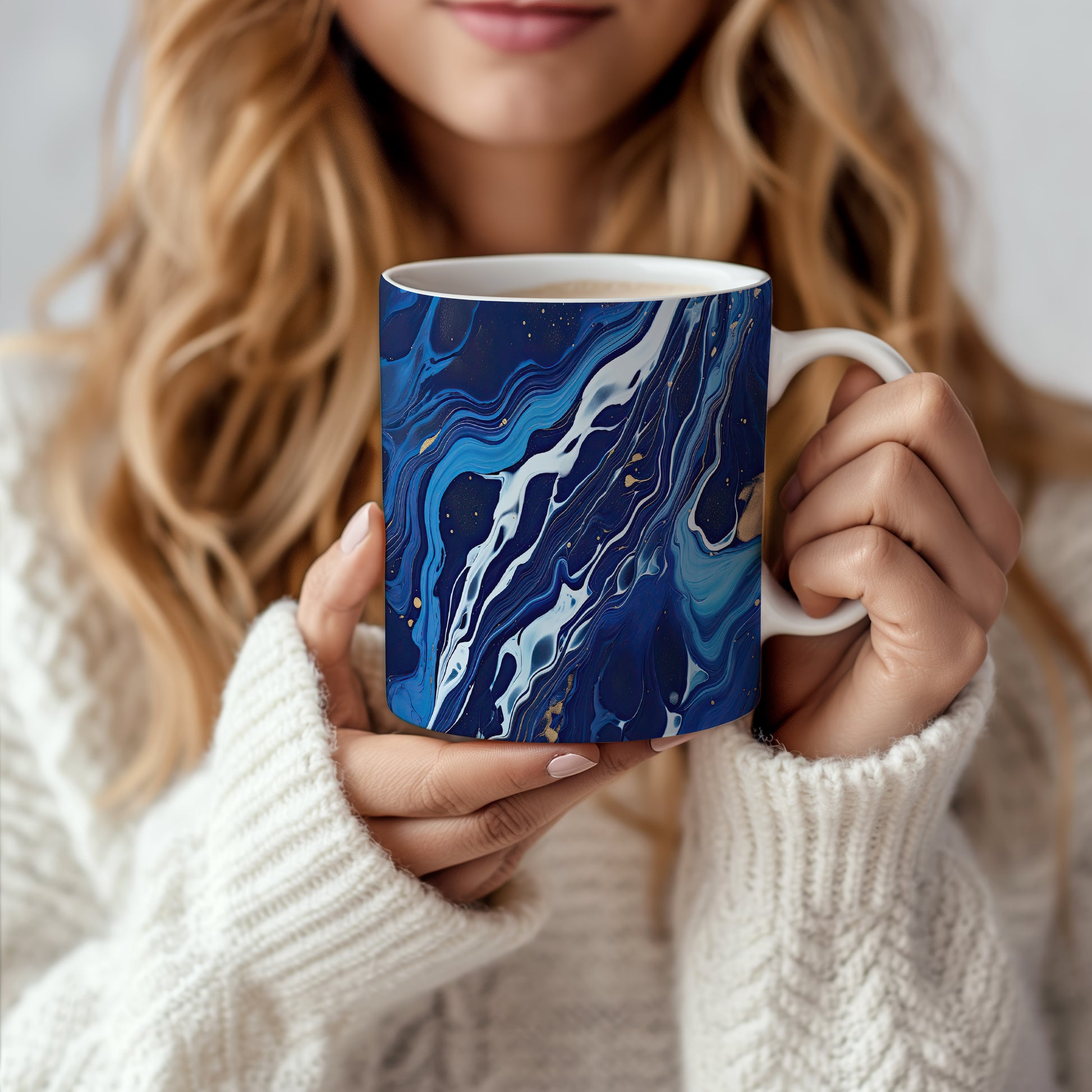 Tento hrníček s unikátním modrým a bílým abstraktním vzorem je ideální pro každodenní použití. Obohaťte své chvíle s kávou nebo čajem originálním kouskem.