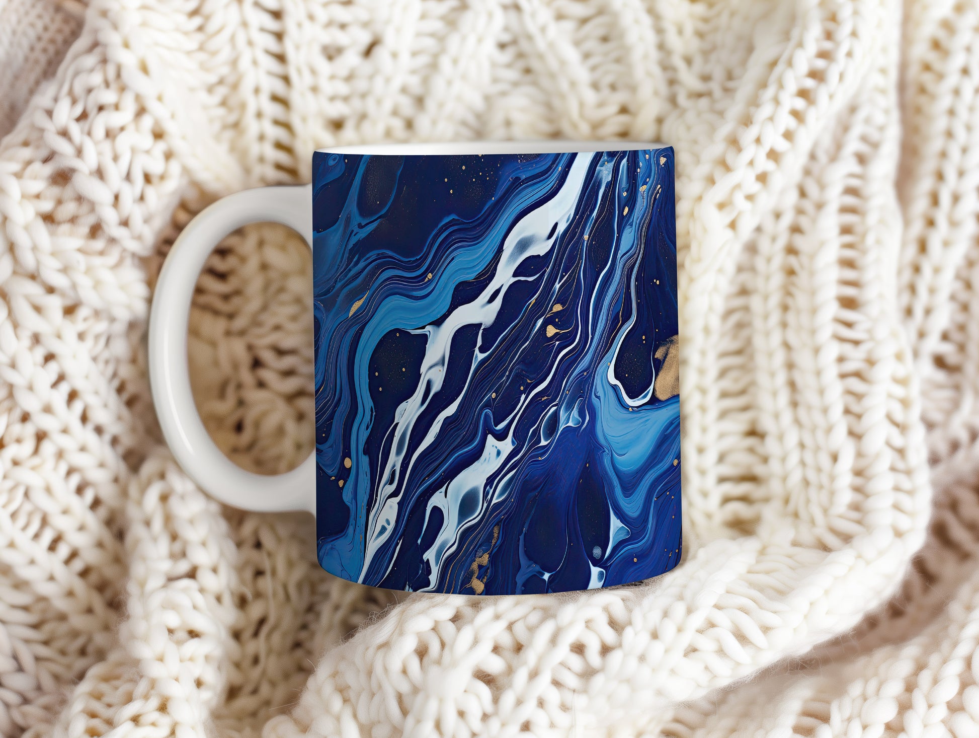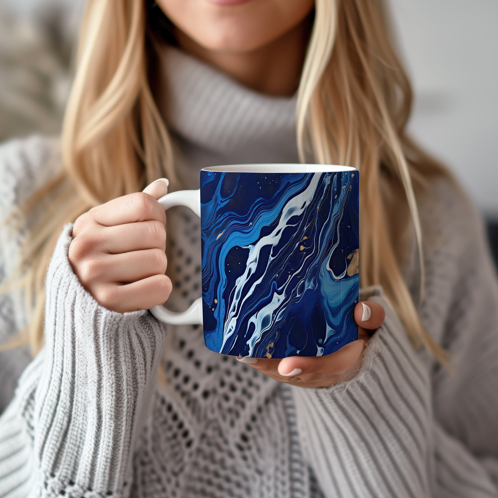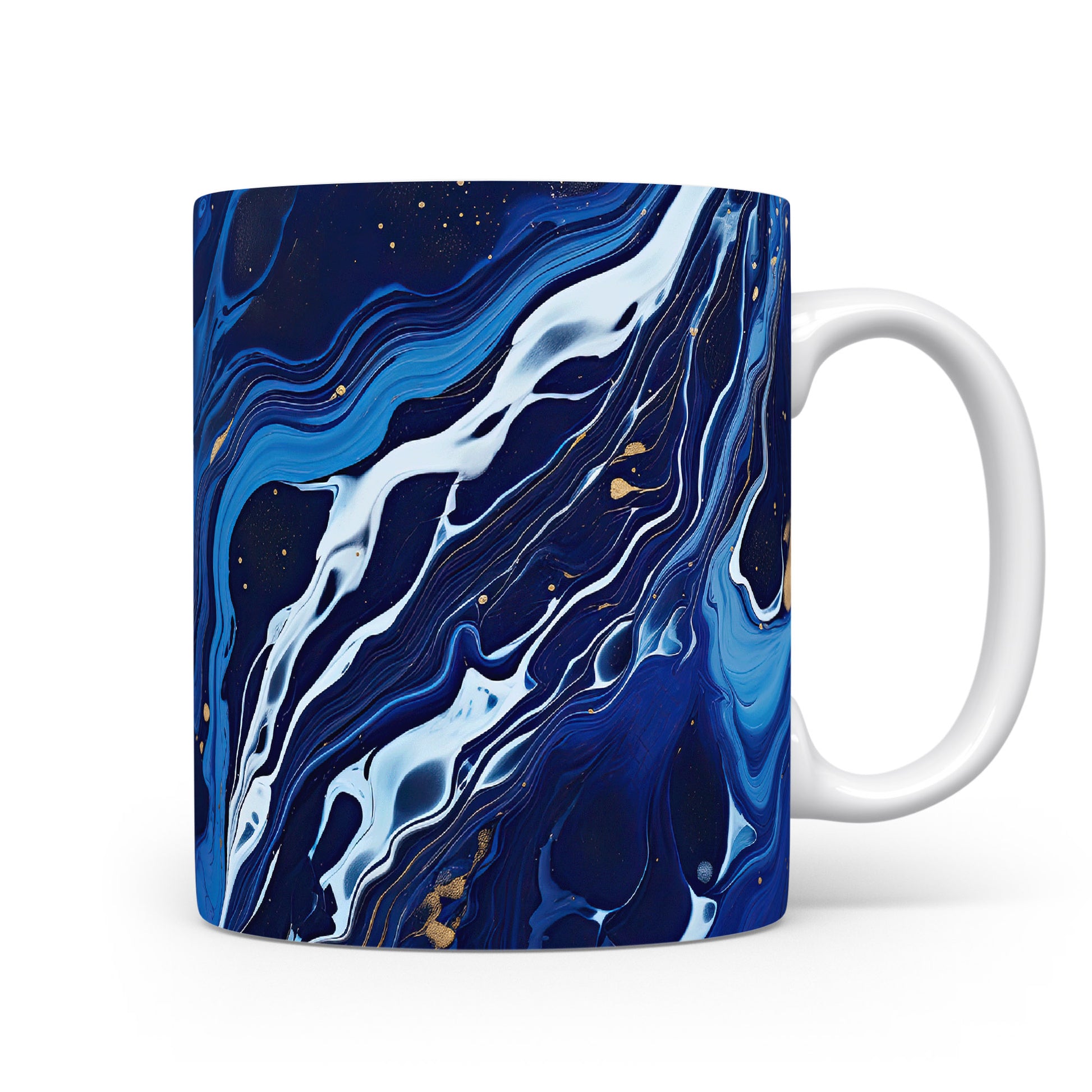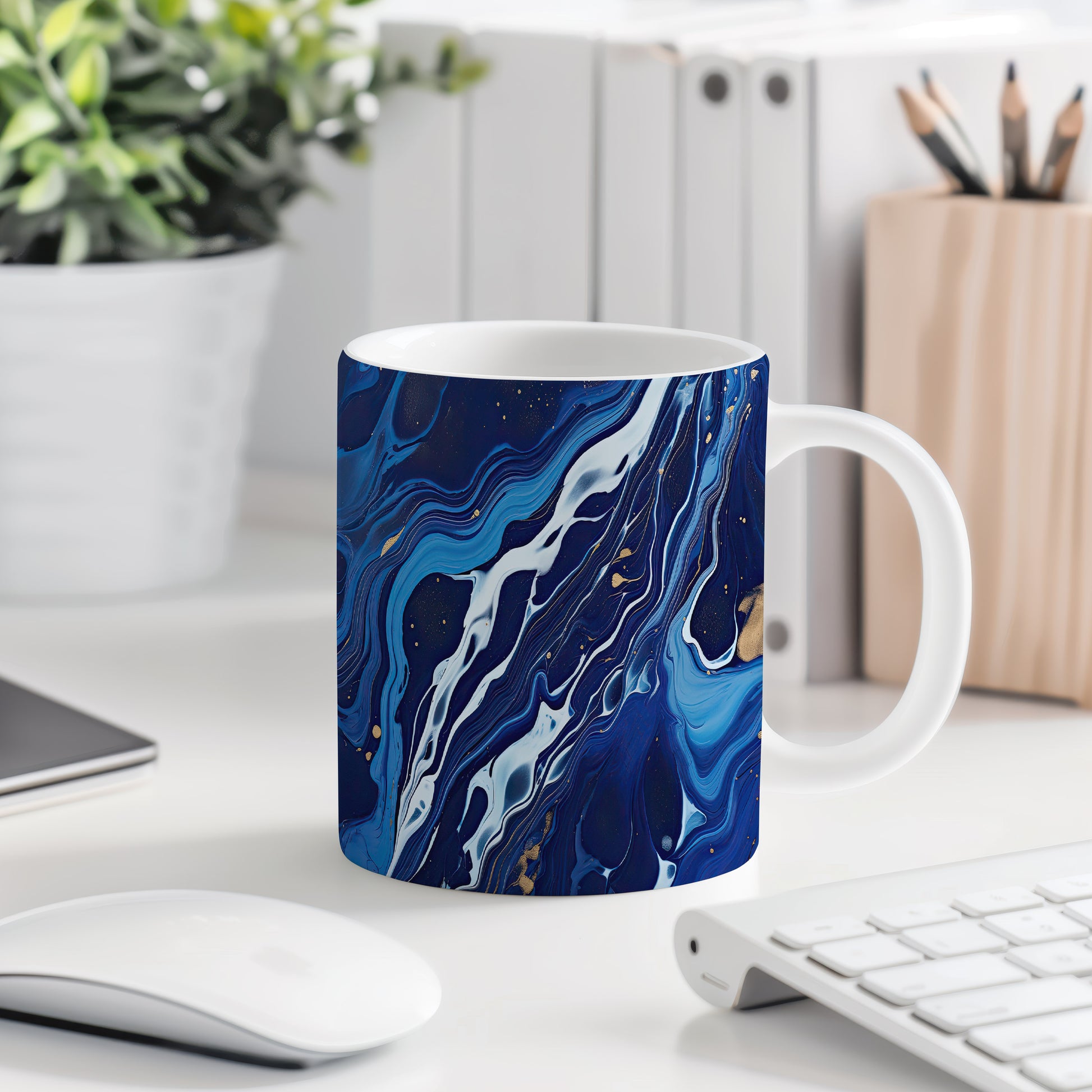 Tento hrníček s unikátním modrým a bílým abstraktním vzorem je ideální pro každodenní použití. Obohaťte své chvíle s kávou nebo čajem originálním kouskem.