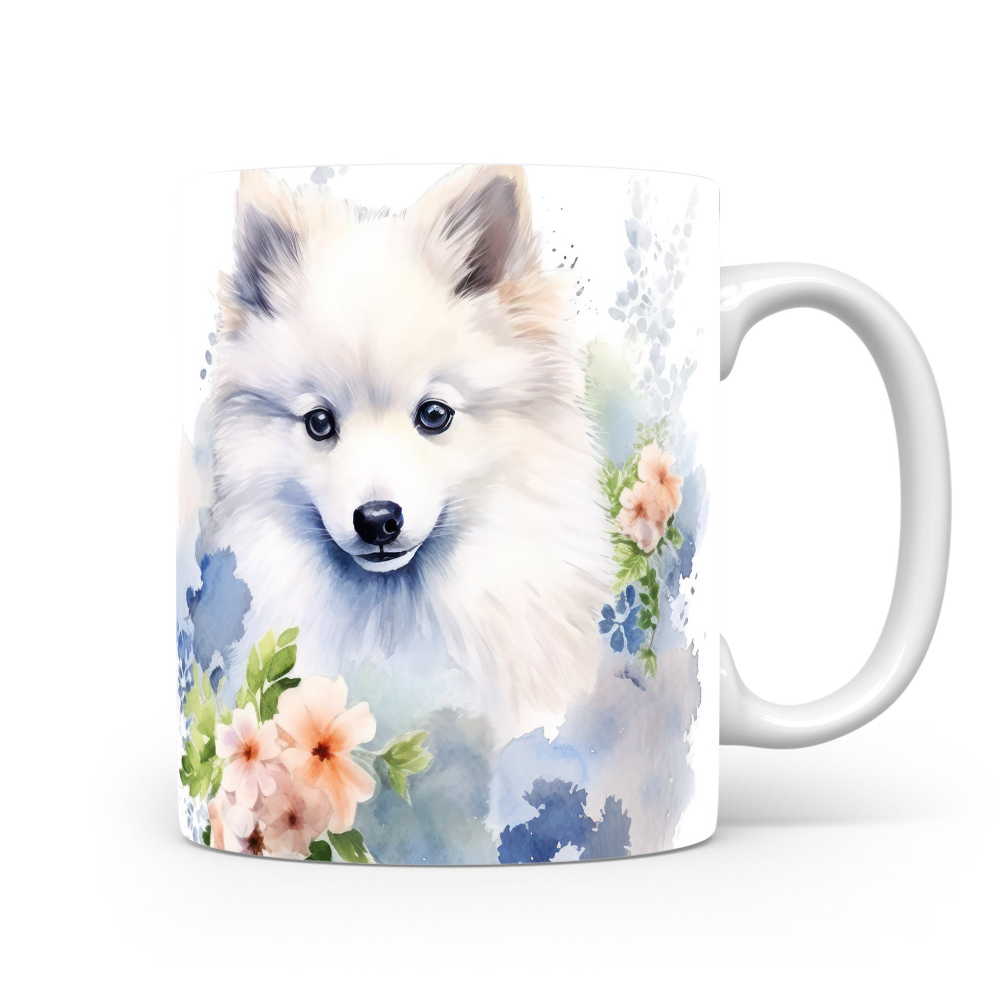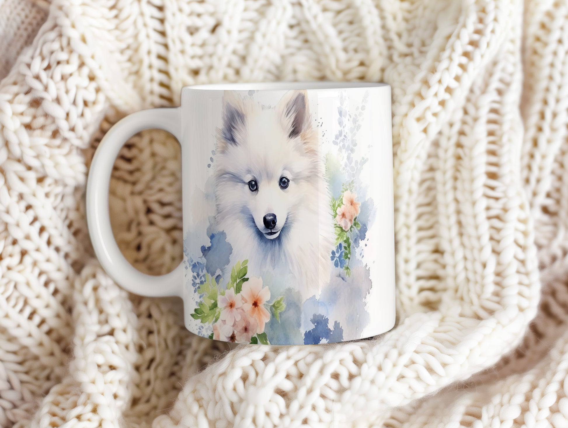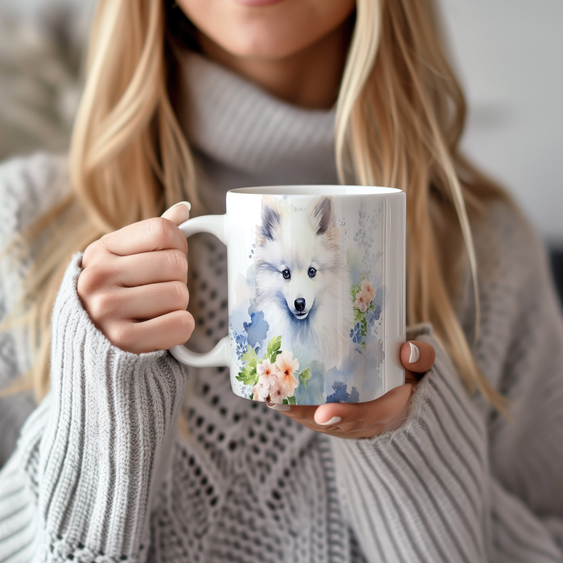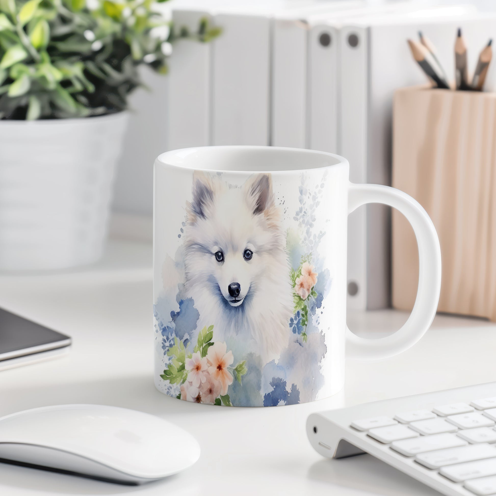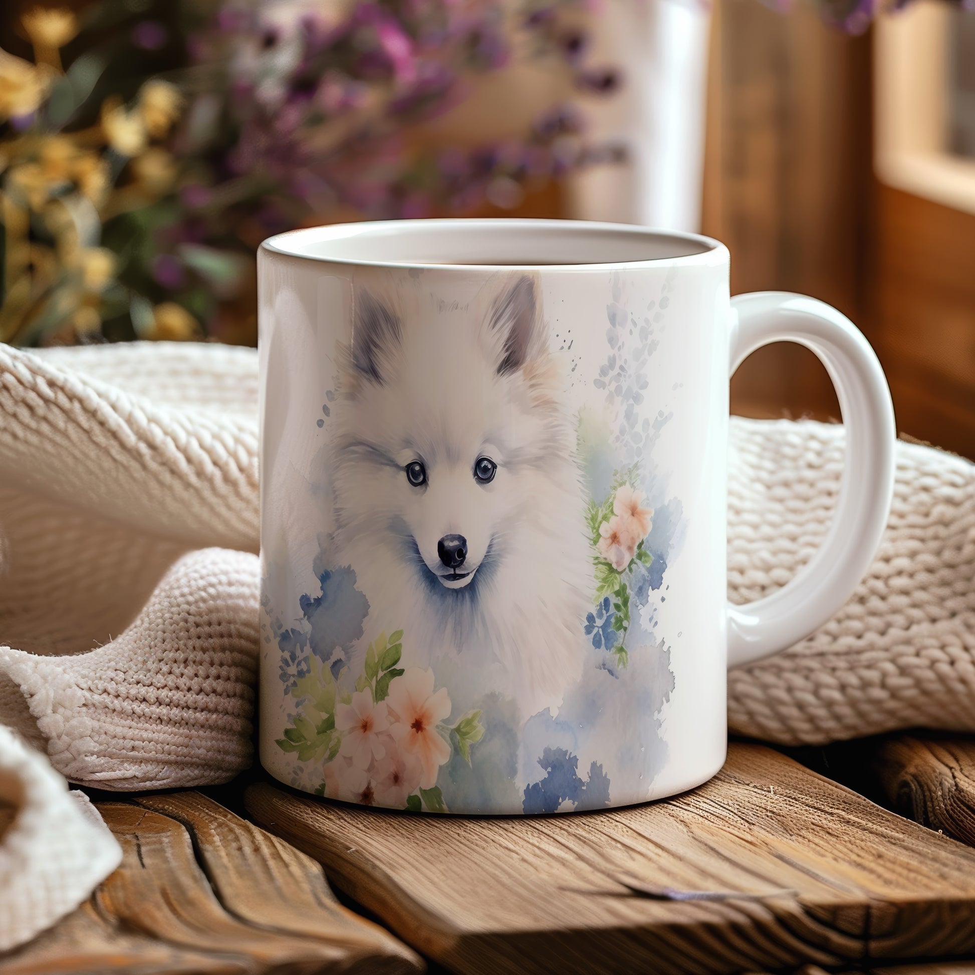 Stylový hrnek s motivem roztomilého štěňátka samojeda obklopeného květinami. Ideální pro milovníky psů a jako dárek pro každou příležitost.