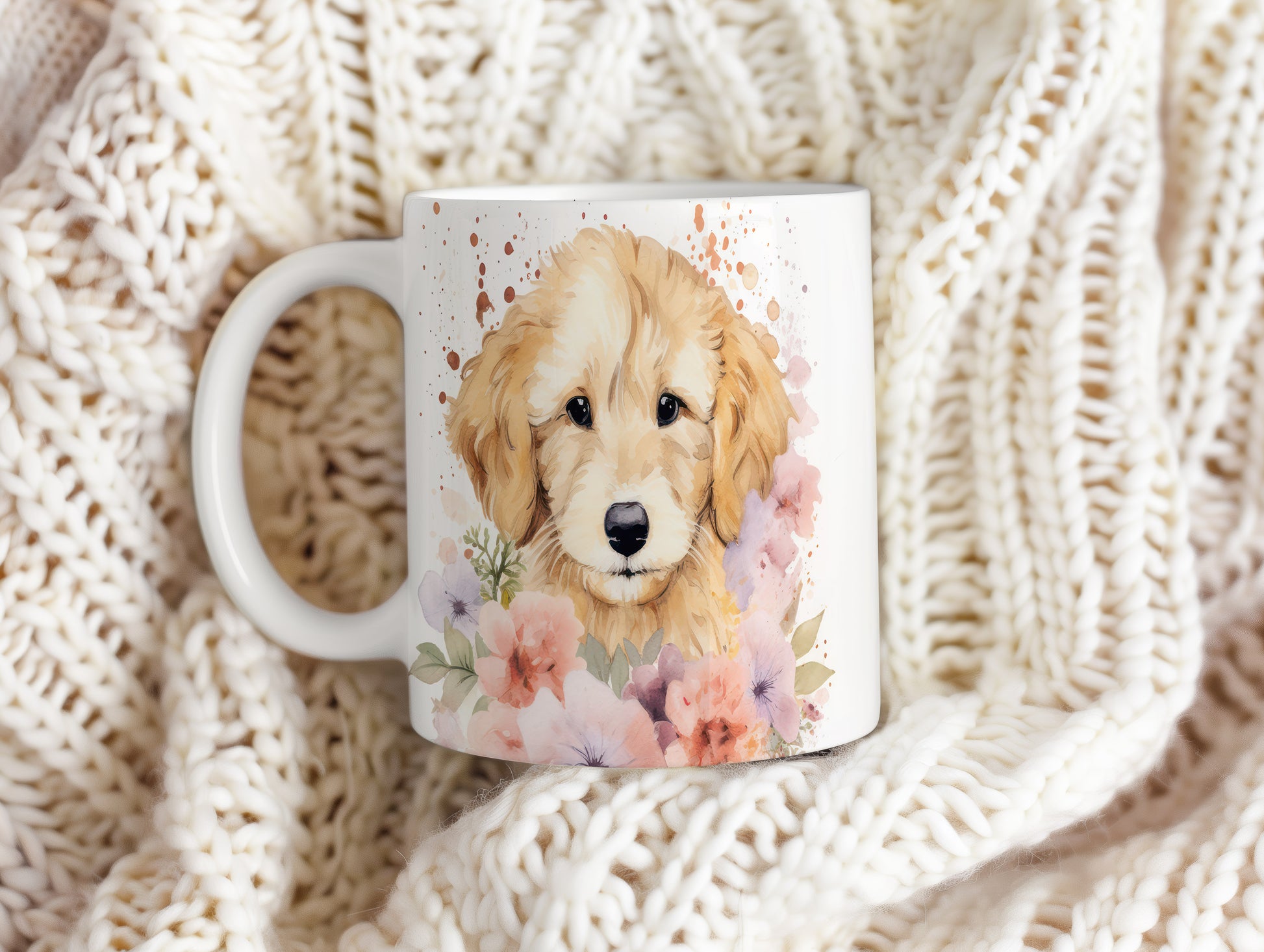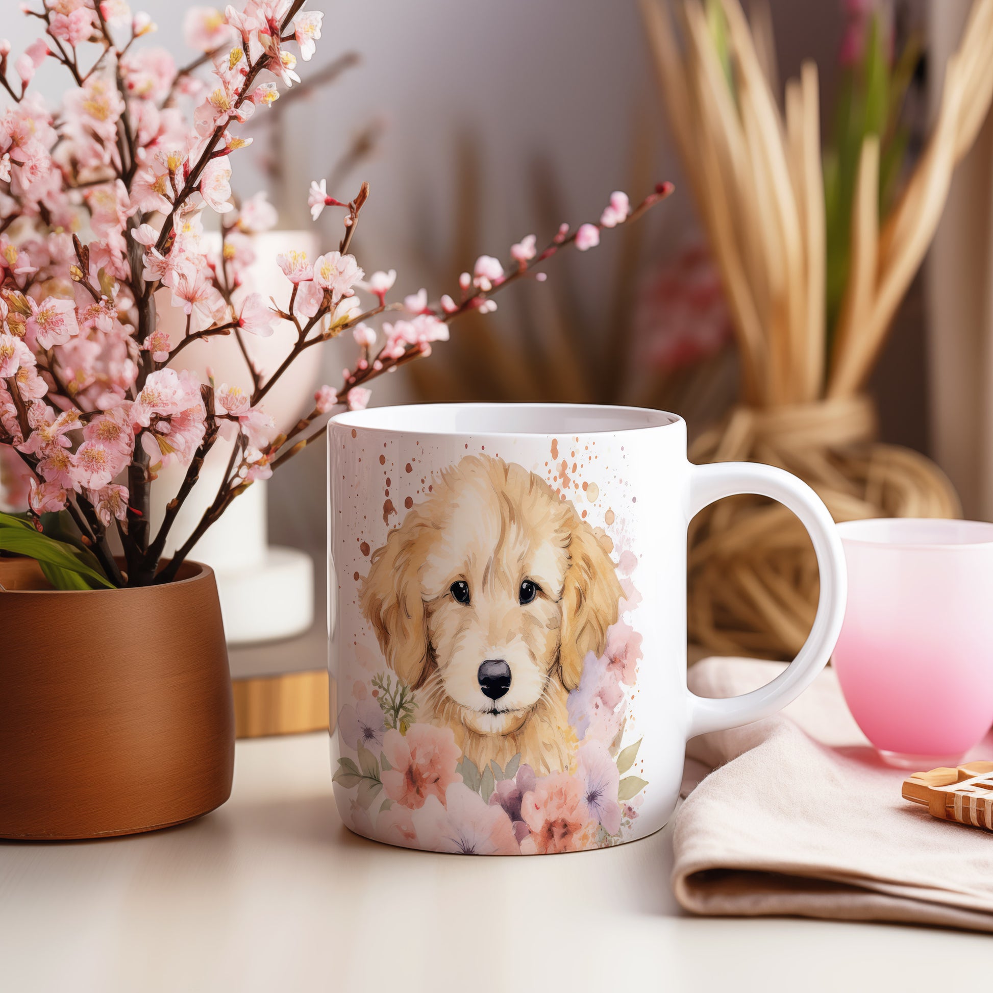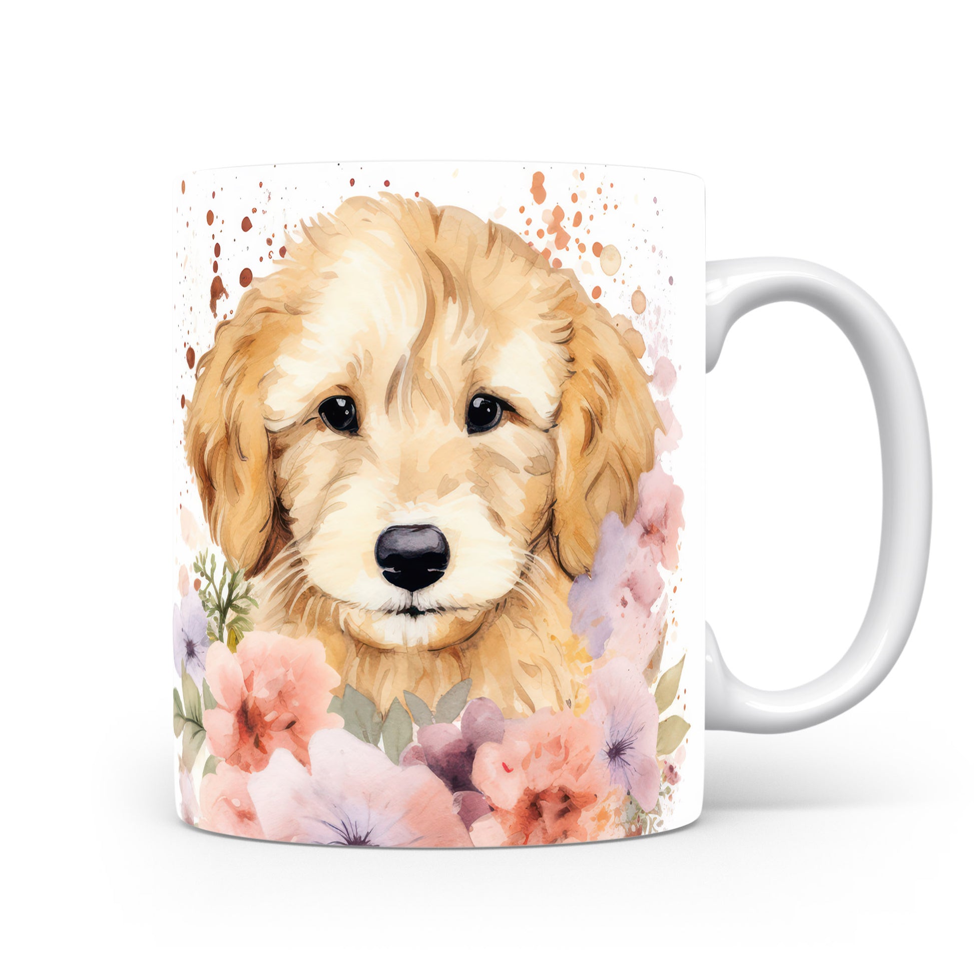 Hrnek se štěňátkem zlatého retrívra a květinami