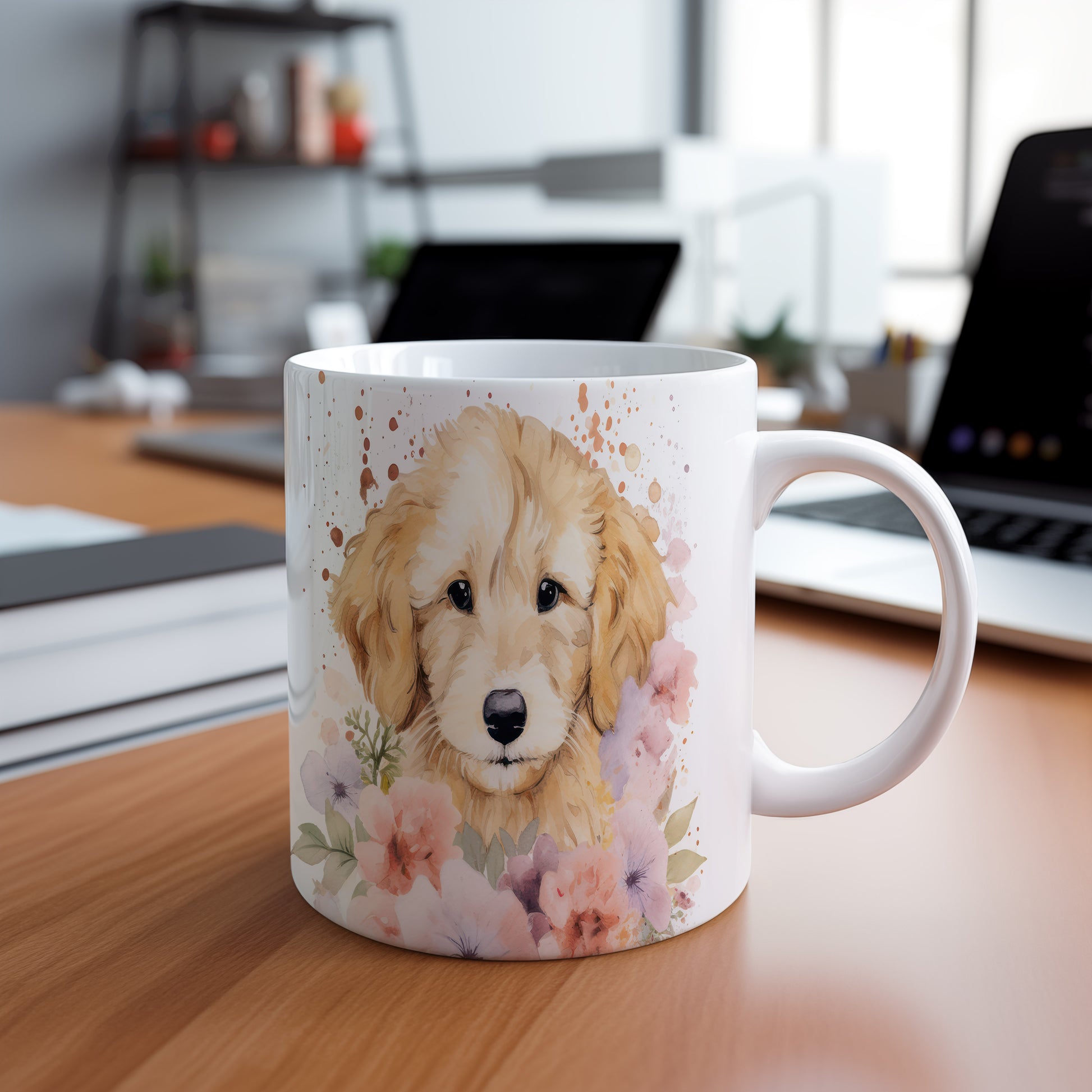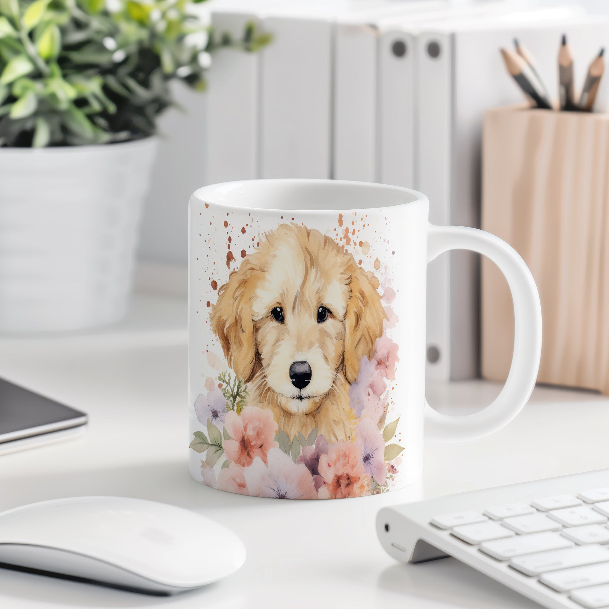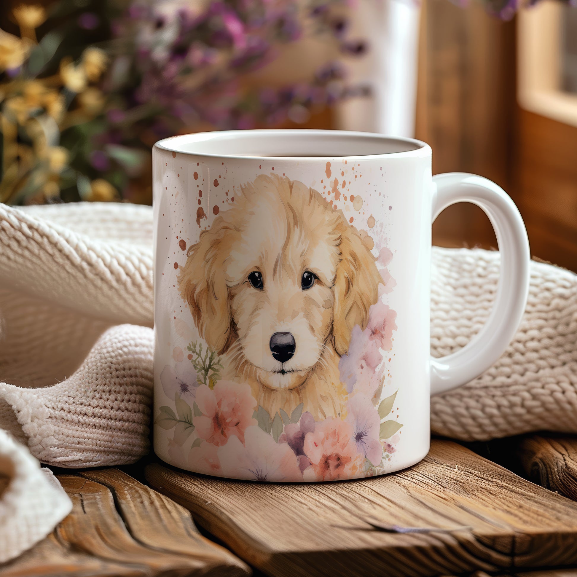 Tento hrnek s krásným motivem štěňátka zlatého retrívra a květin je ideální pro milovníky psů. Přináší radost každému doušku kávy nebo čaje.