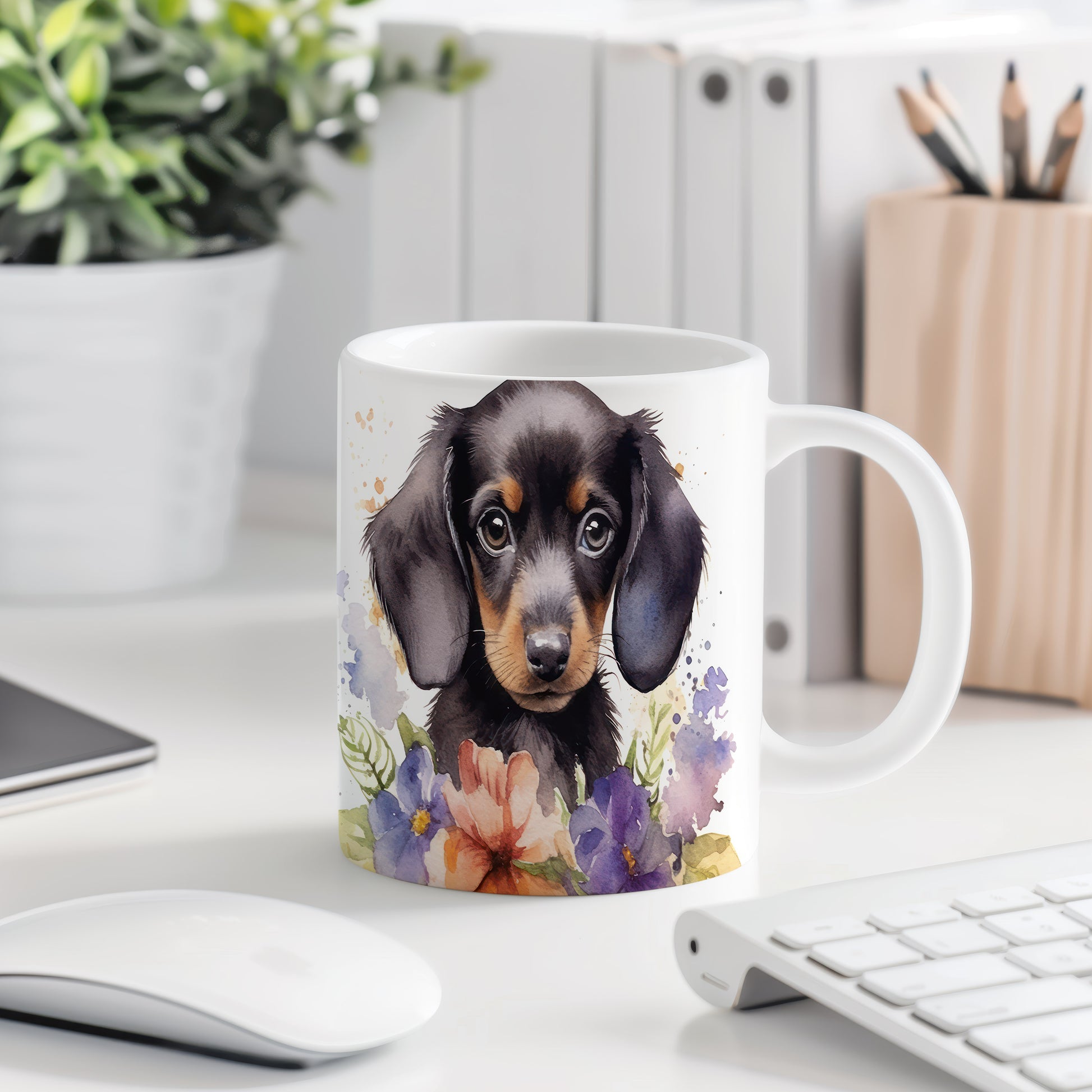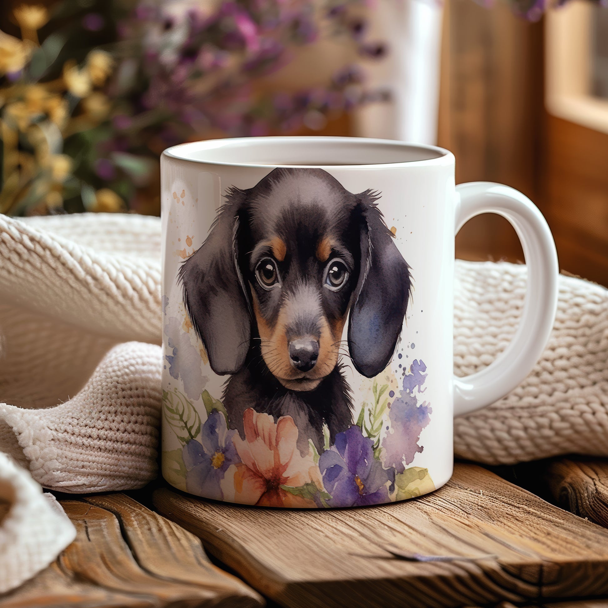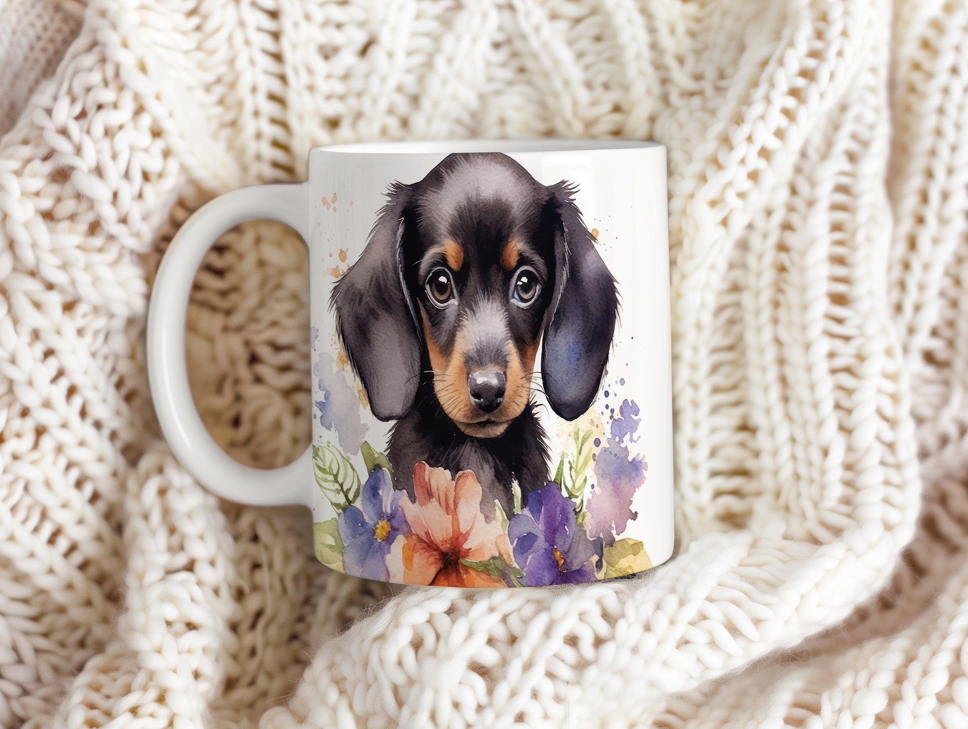 Hrnek s obrázkem roztomilého jezevčíka a květinami
