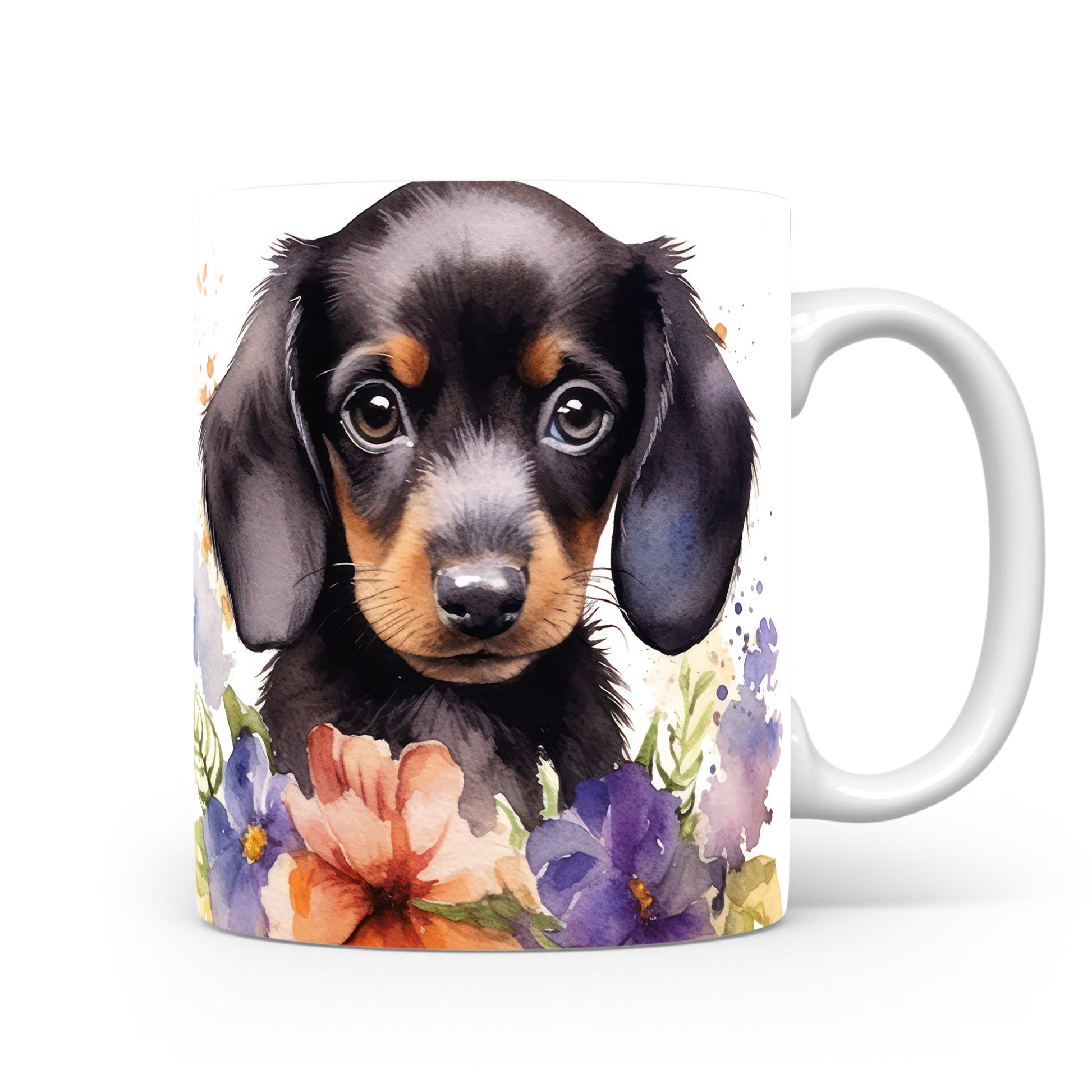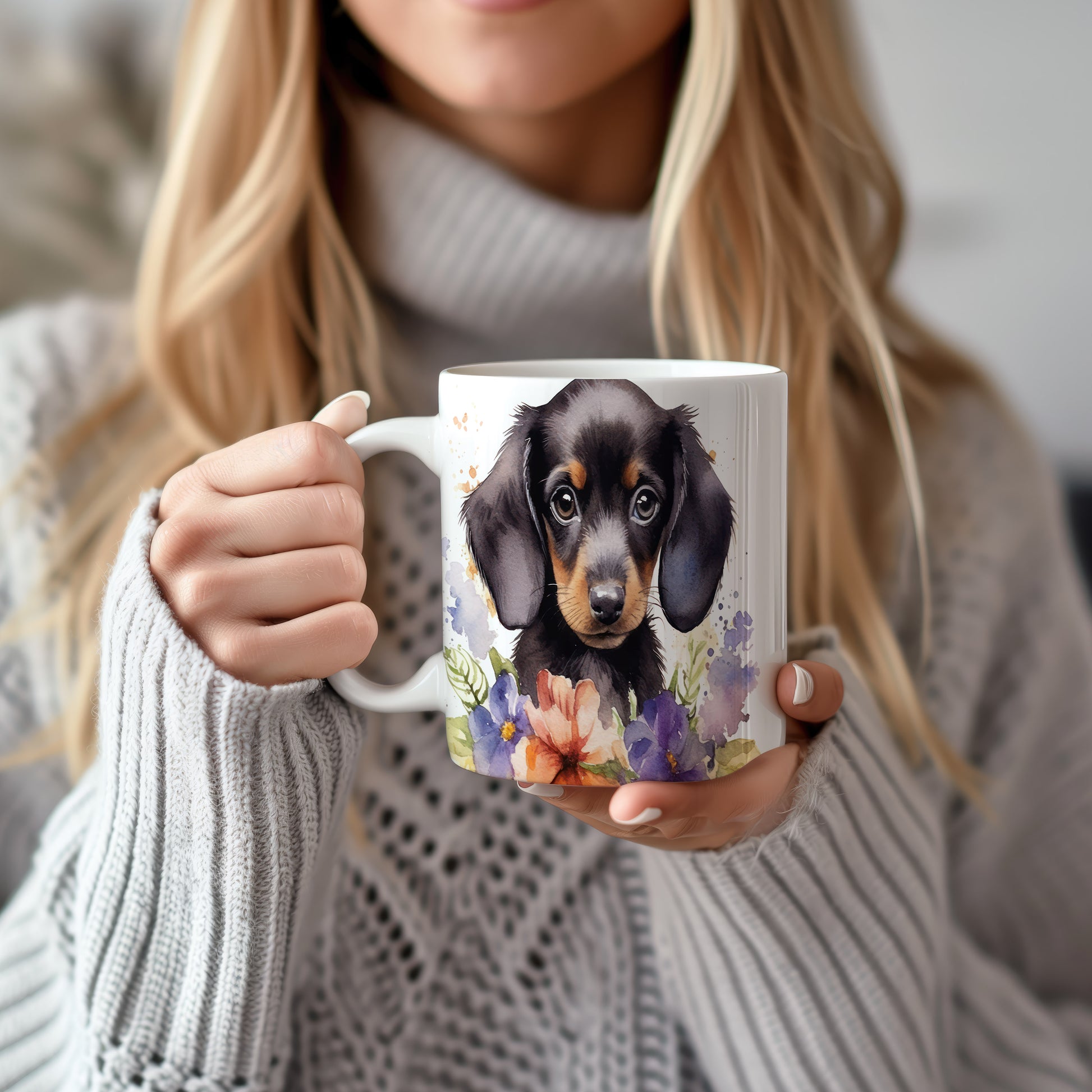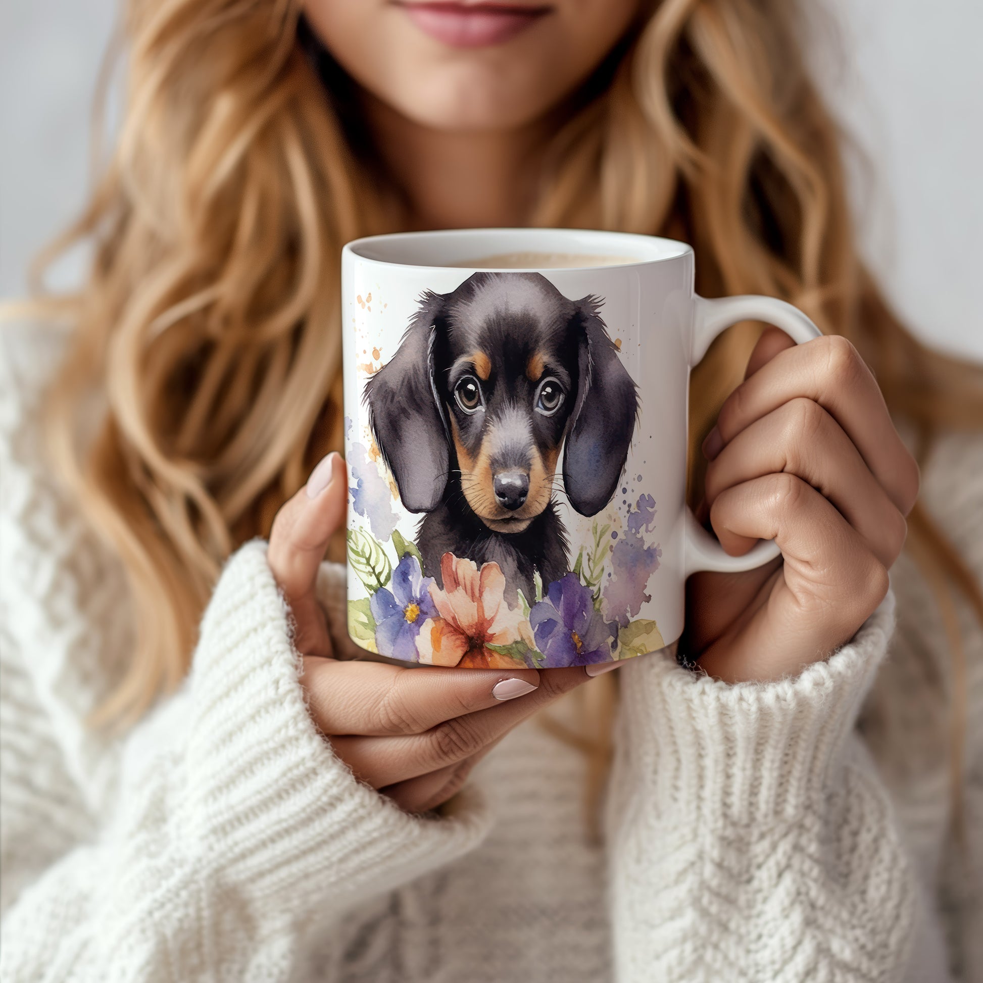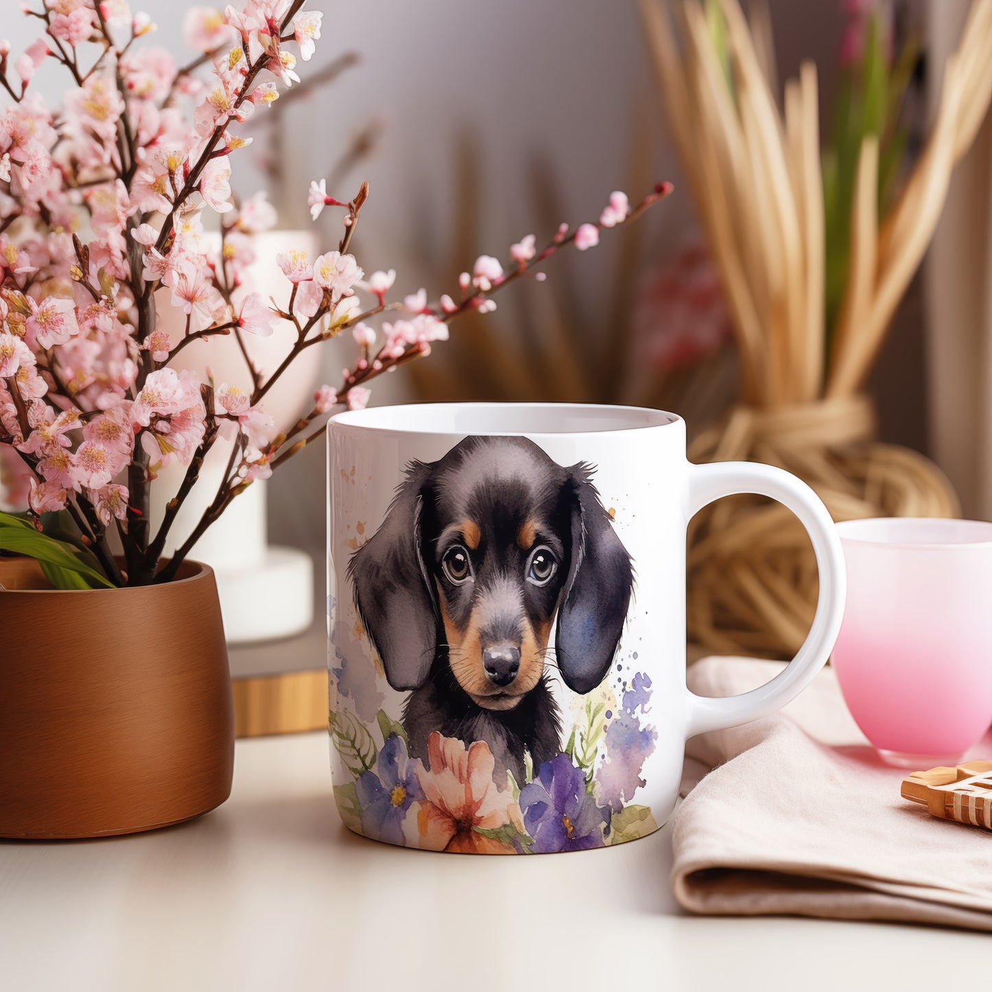 Hrnek s obrázkem roztomilého jezevčíka a květinami