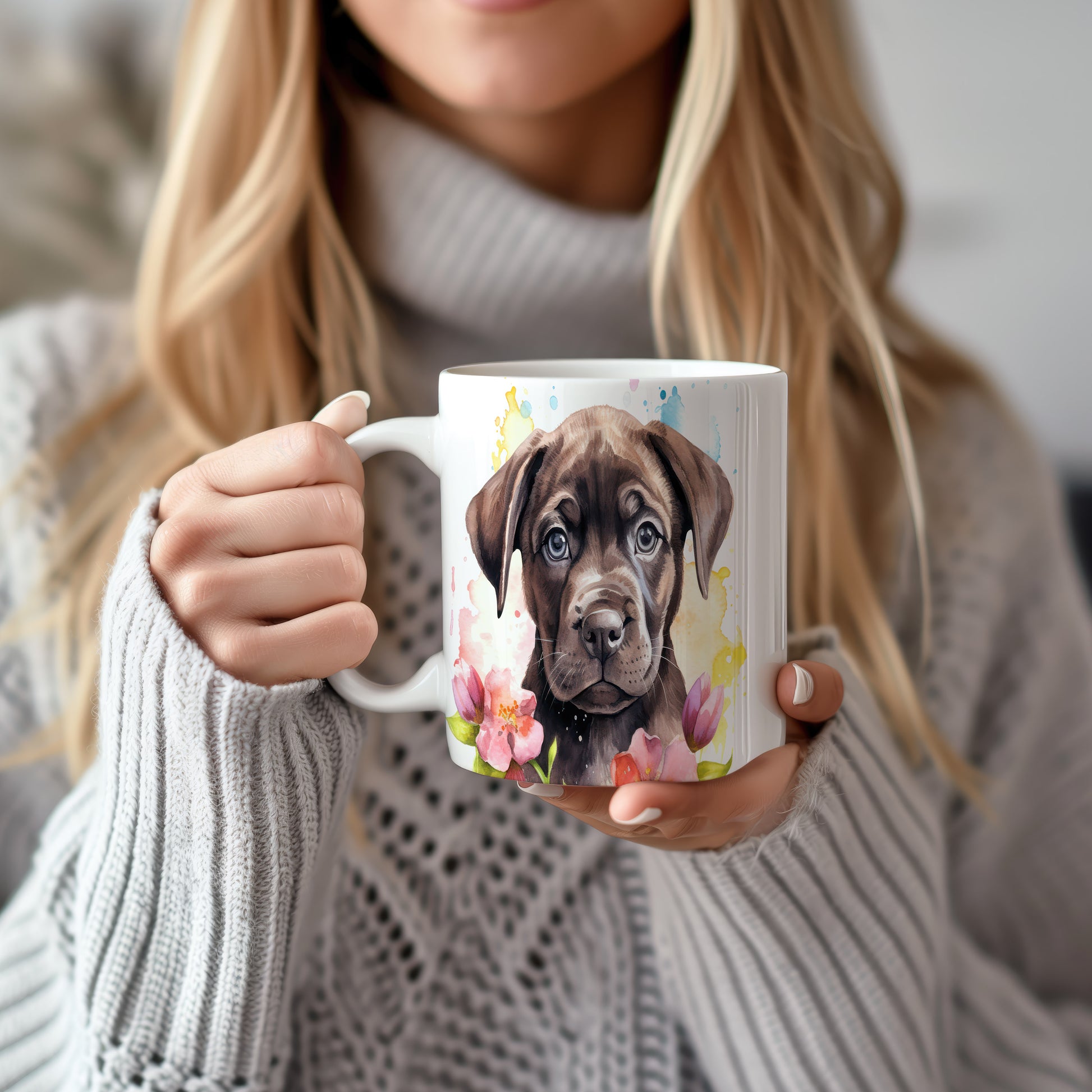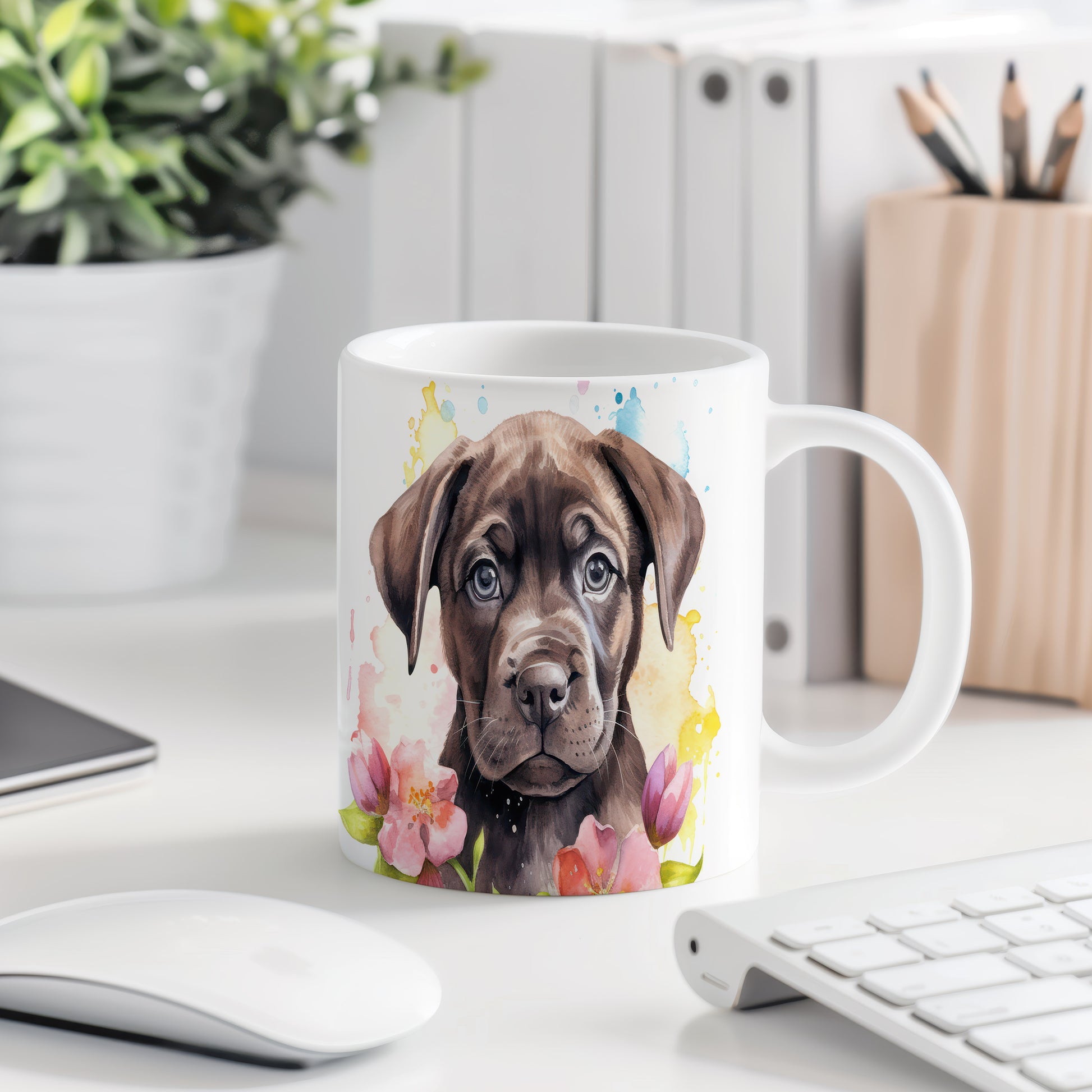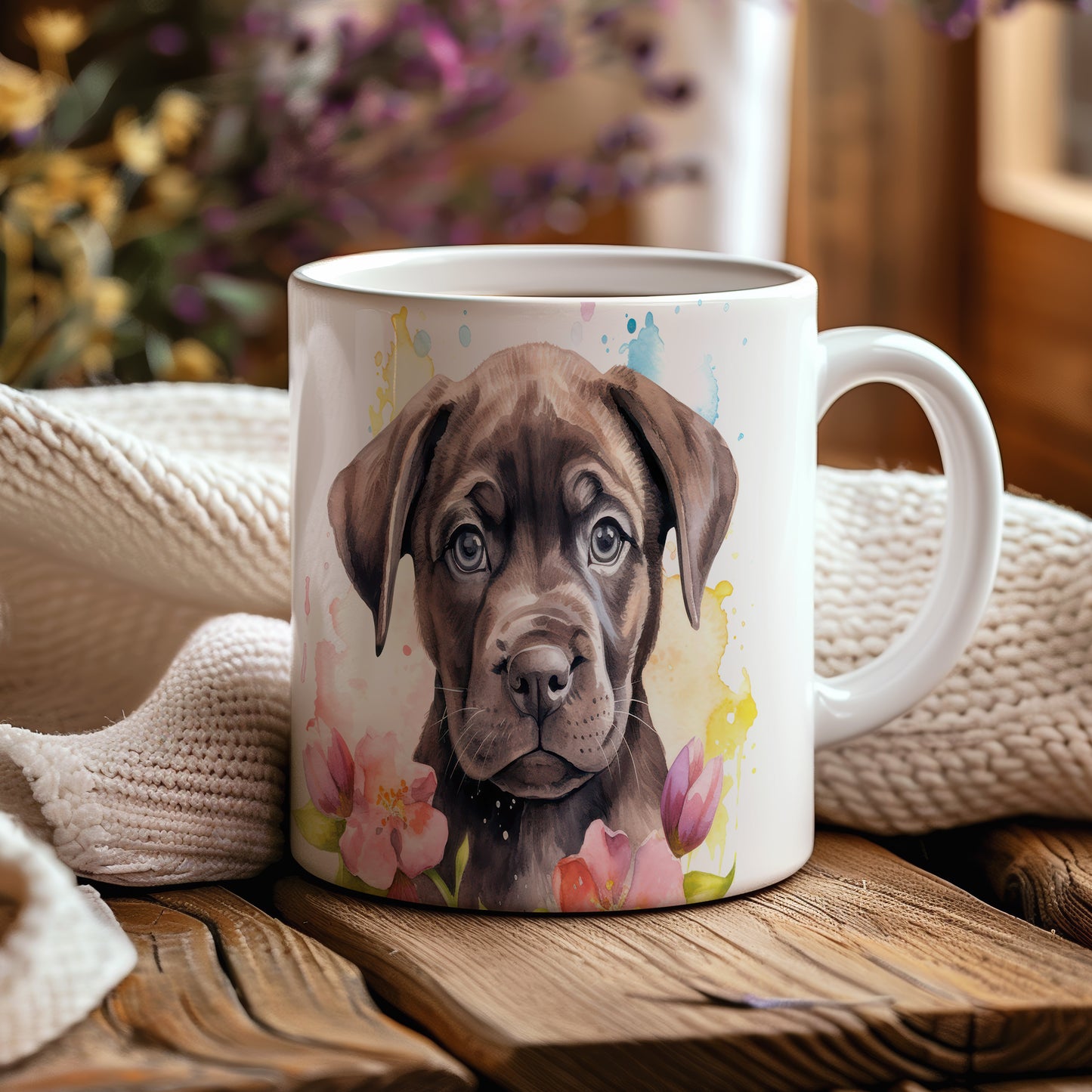 Tento hrnek s krásným portrétem štěněte labradora je ideální pro milovníky psů. S jemnými barvami a květinovým motivem dodá každému pití osobitý nádech.