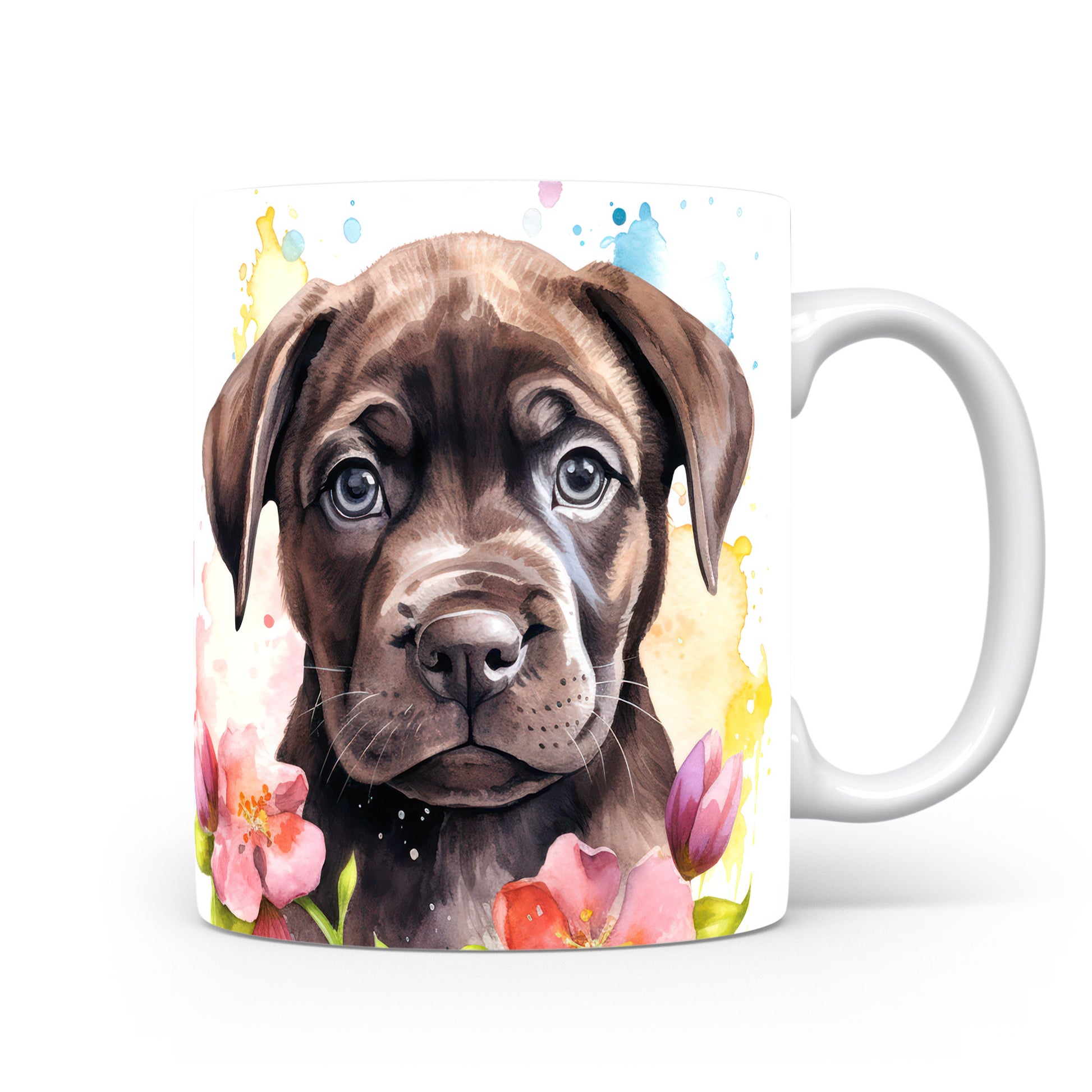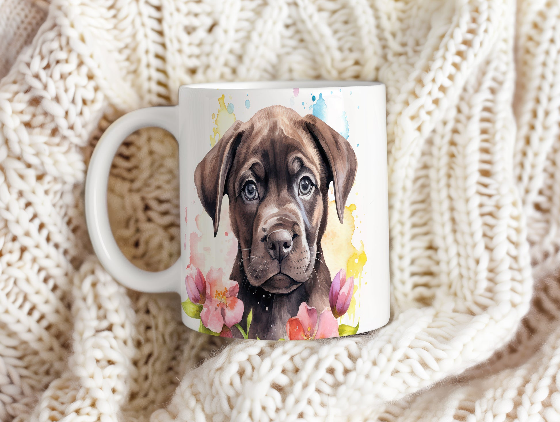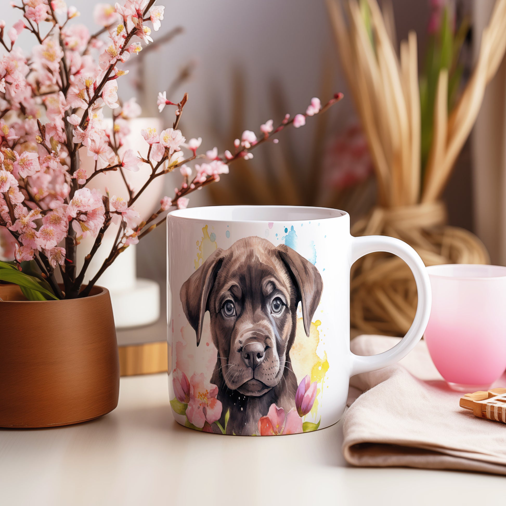 Tento hrnek s krásným portrétem štěněte labradora je ideální pro milovníky psů. S jemnými barvami a květinovým motivem dodá každému pití osobitý nádech.