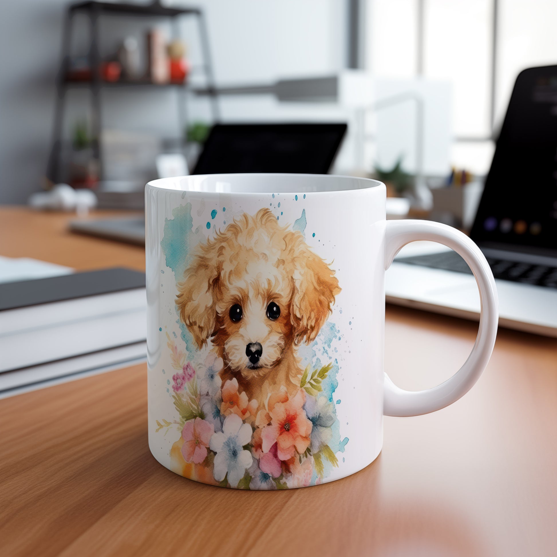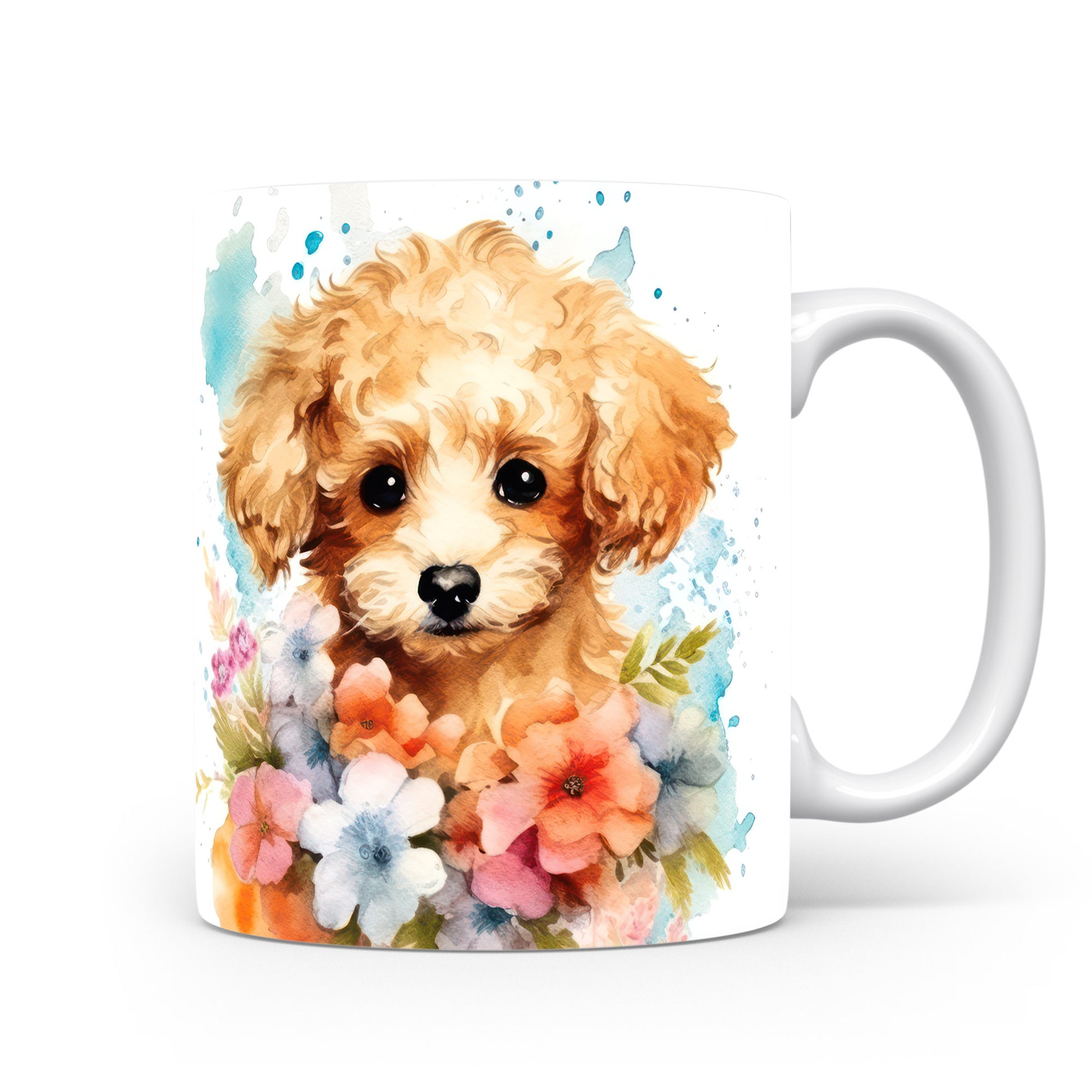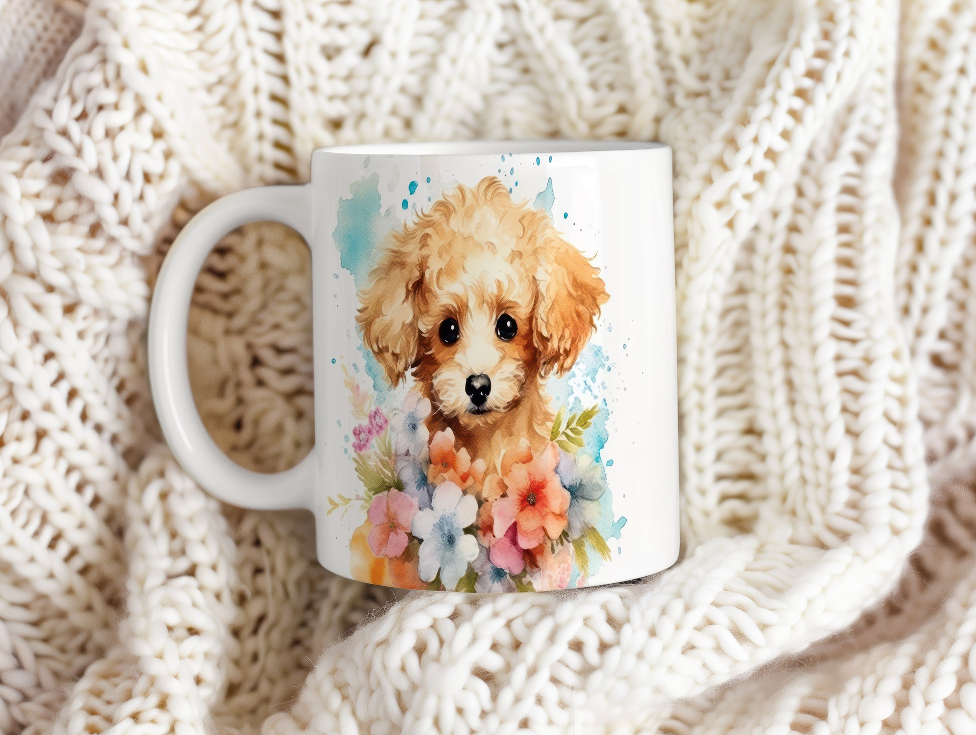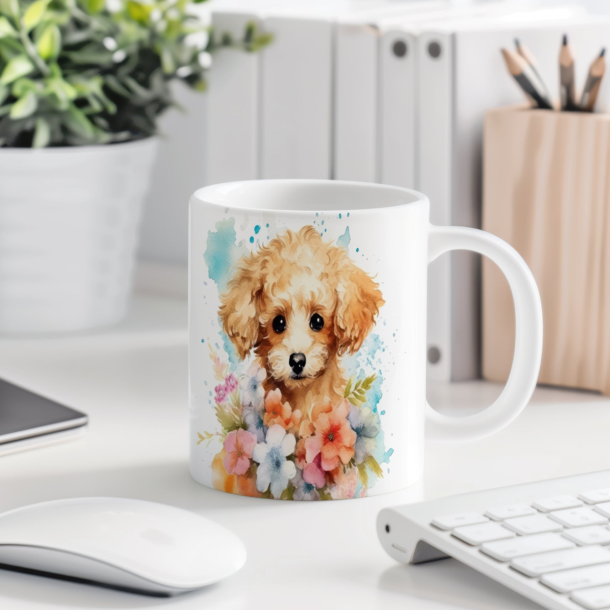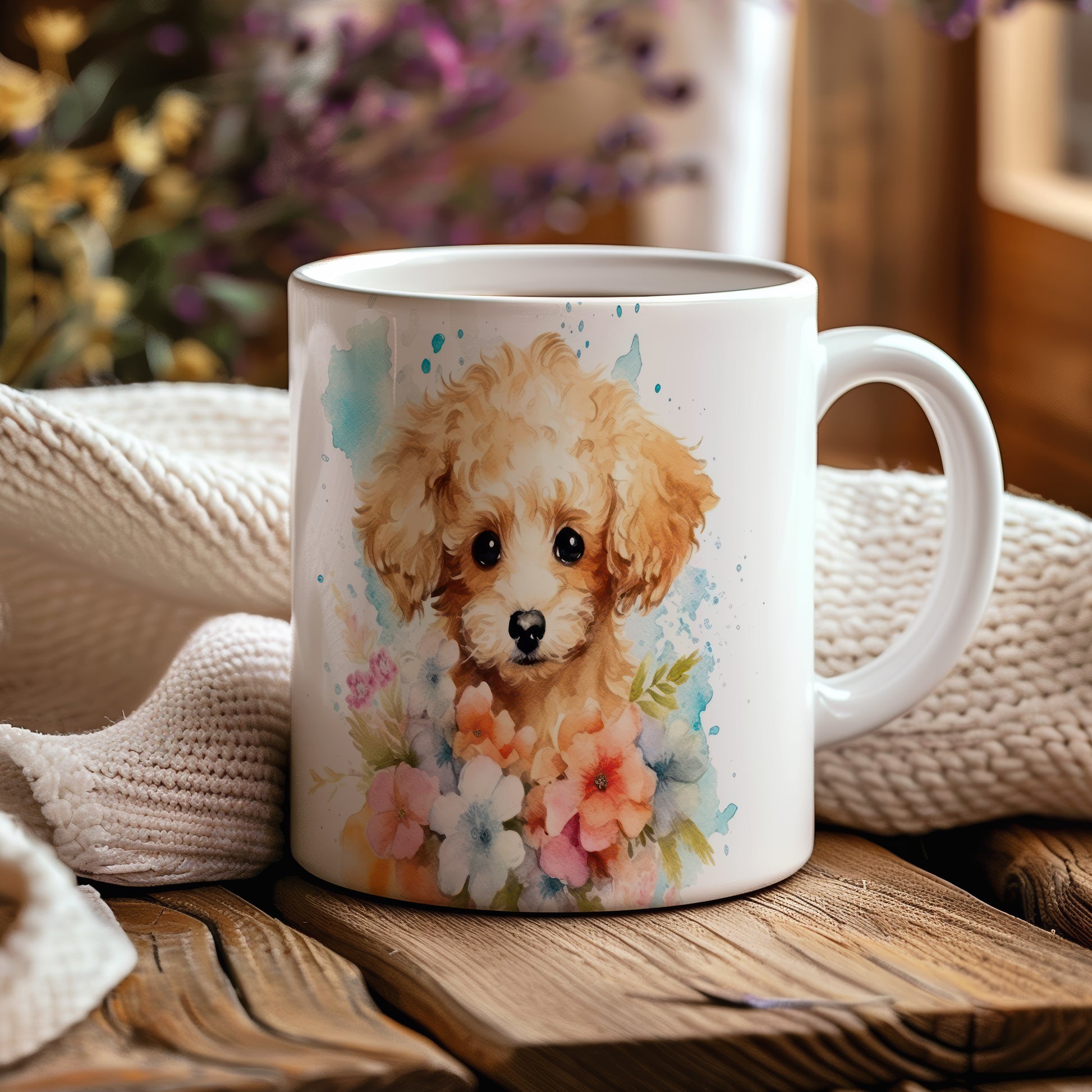 Hrnek s potiskem roztomilého štěňátka v květinovém designu