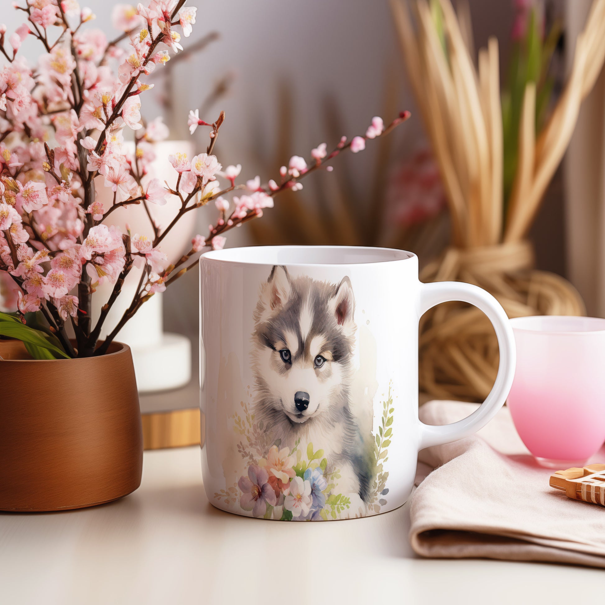 Tento hrnek se štěnětem huskyho a květinami je ideální pro milovníky psů. Vytvořte si radostné chvíle při každém doušku vašeho oblíbeného nápoje.