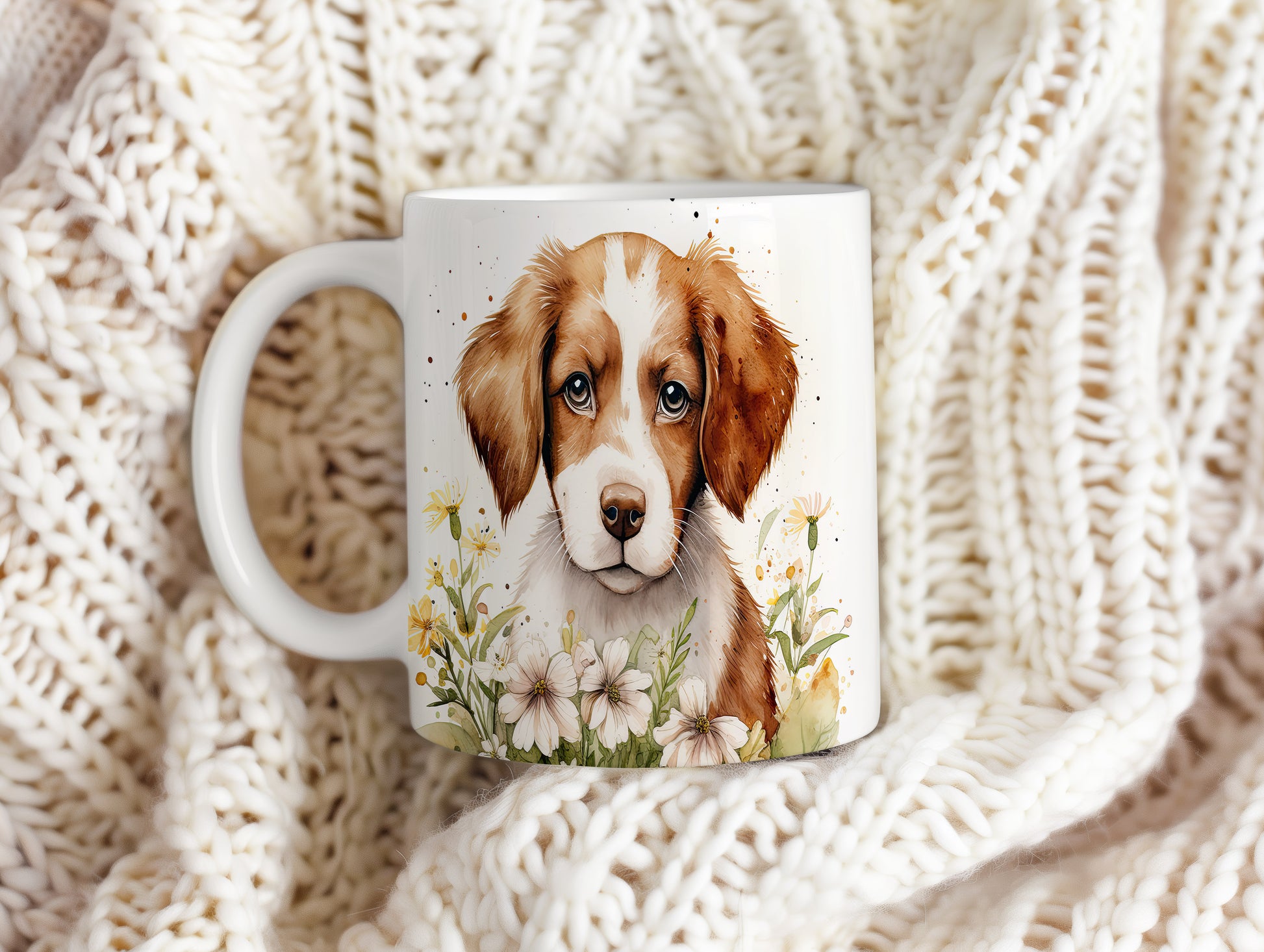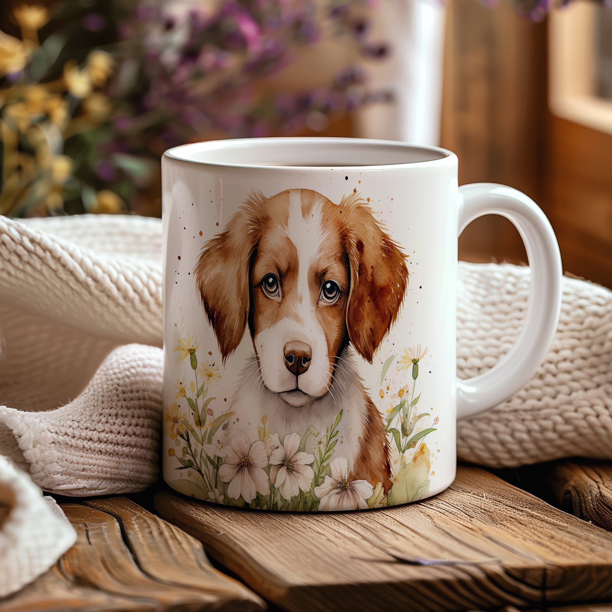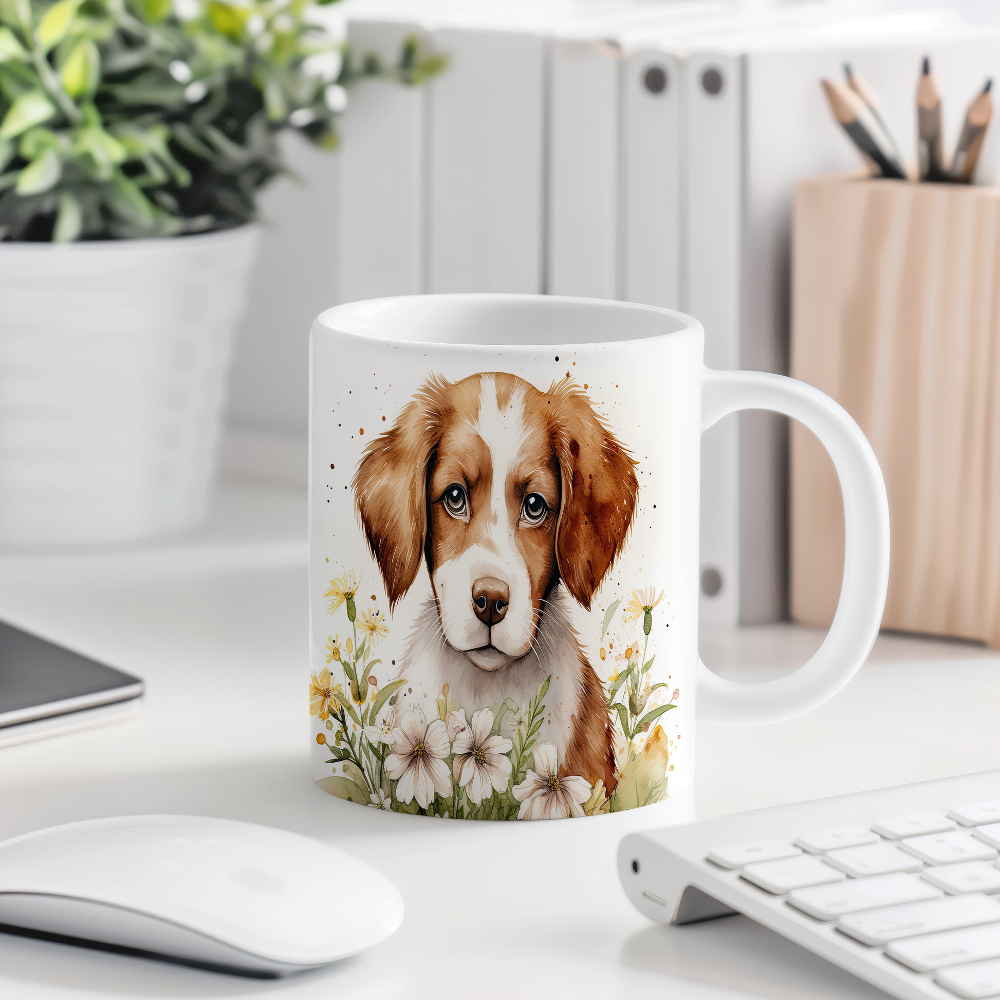 Hrnek s ilustrací roztomilého štěněte v květinovém designu