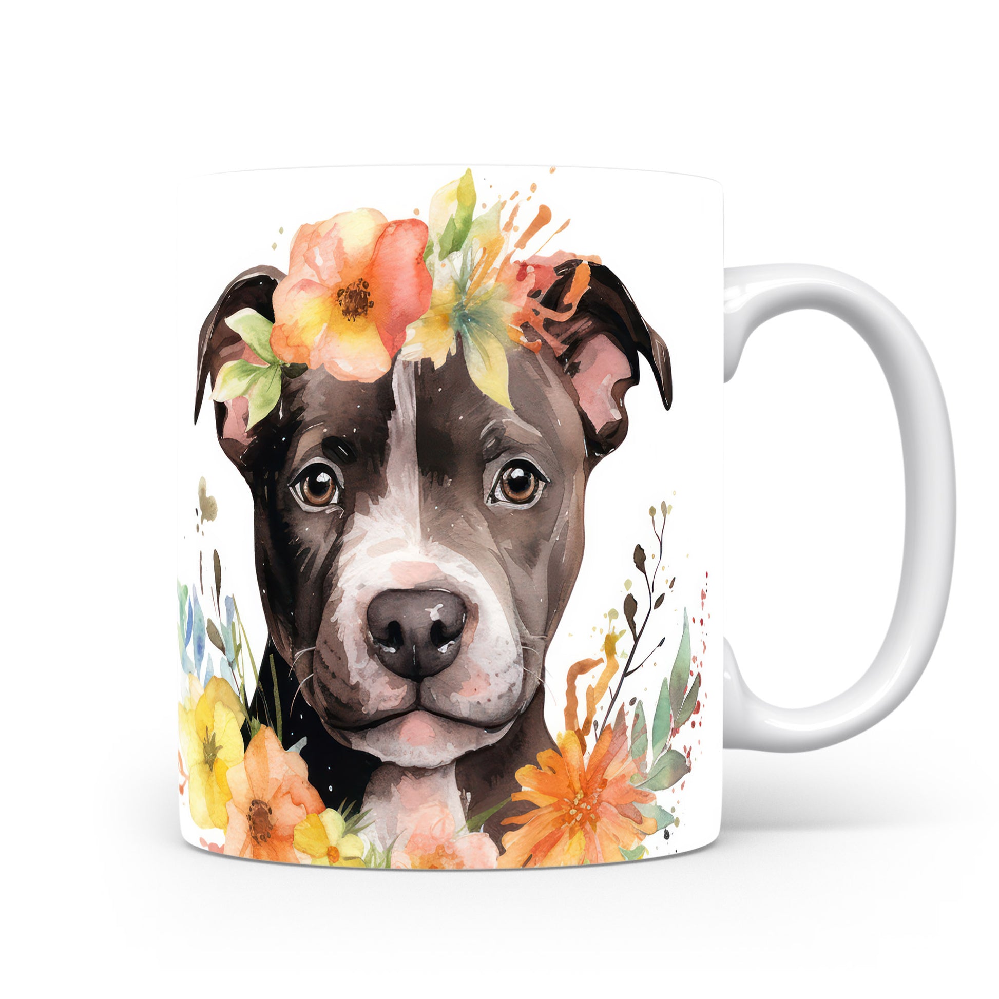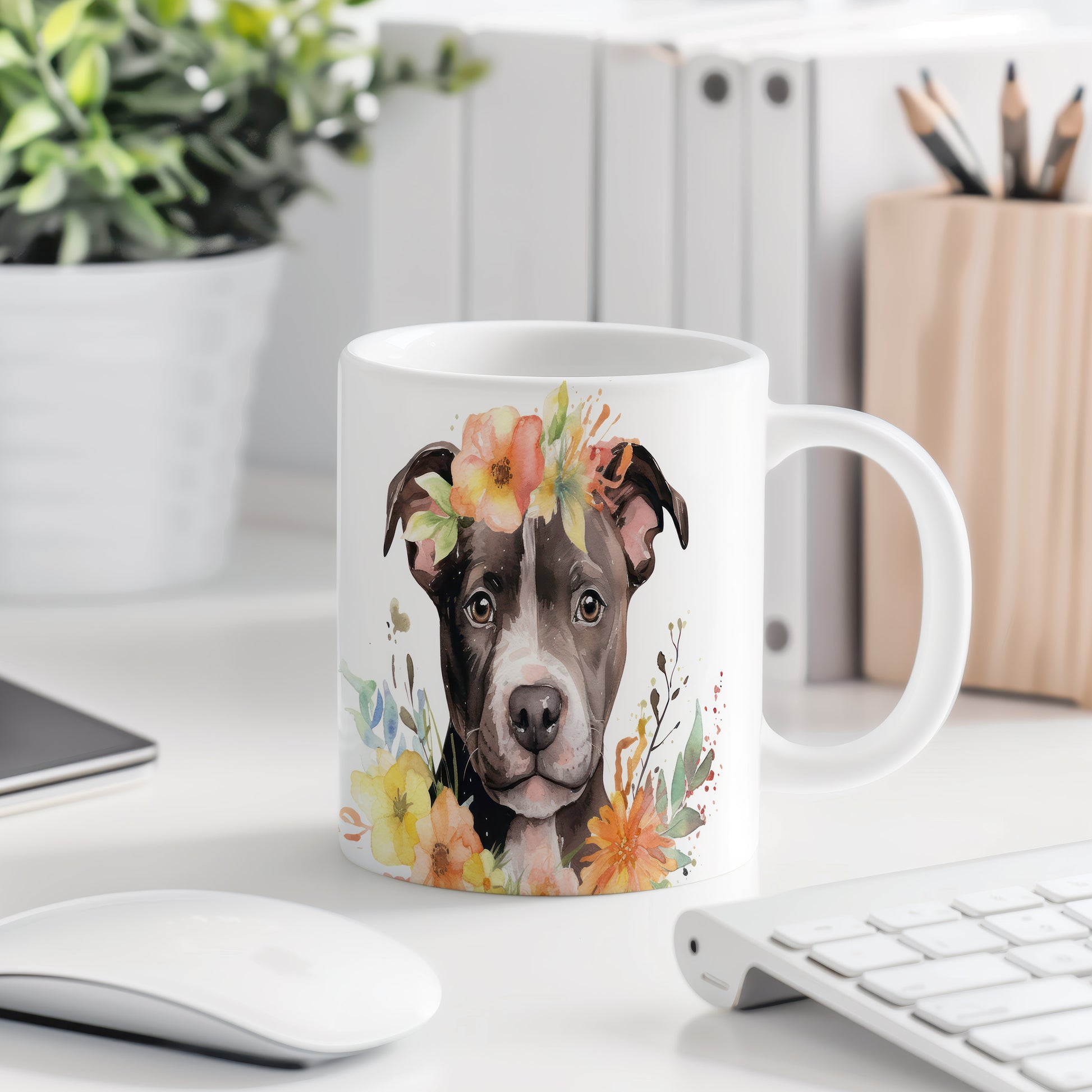 Tento hrnek s ilustrací pitbulla ozdobeného květinami je ideální pro milovníky psů. Přidejte trochu barev do svého každodenního rituálu pití kávy nebo čaje.