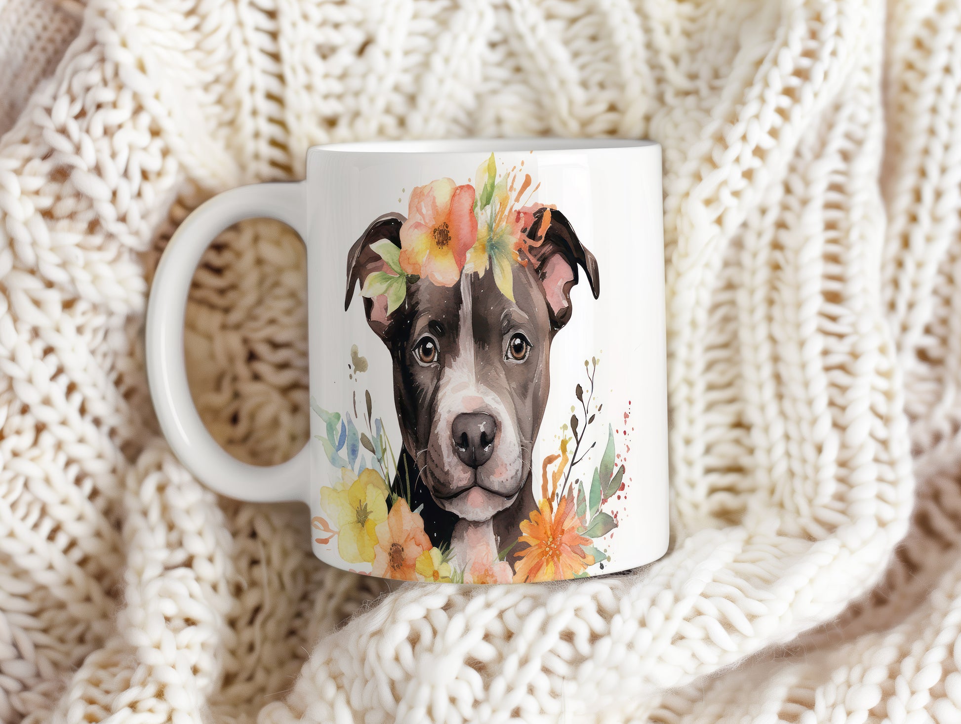Hrnek s roztomilým pitbullem a květinovým motivem