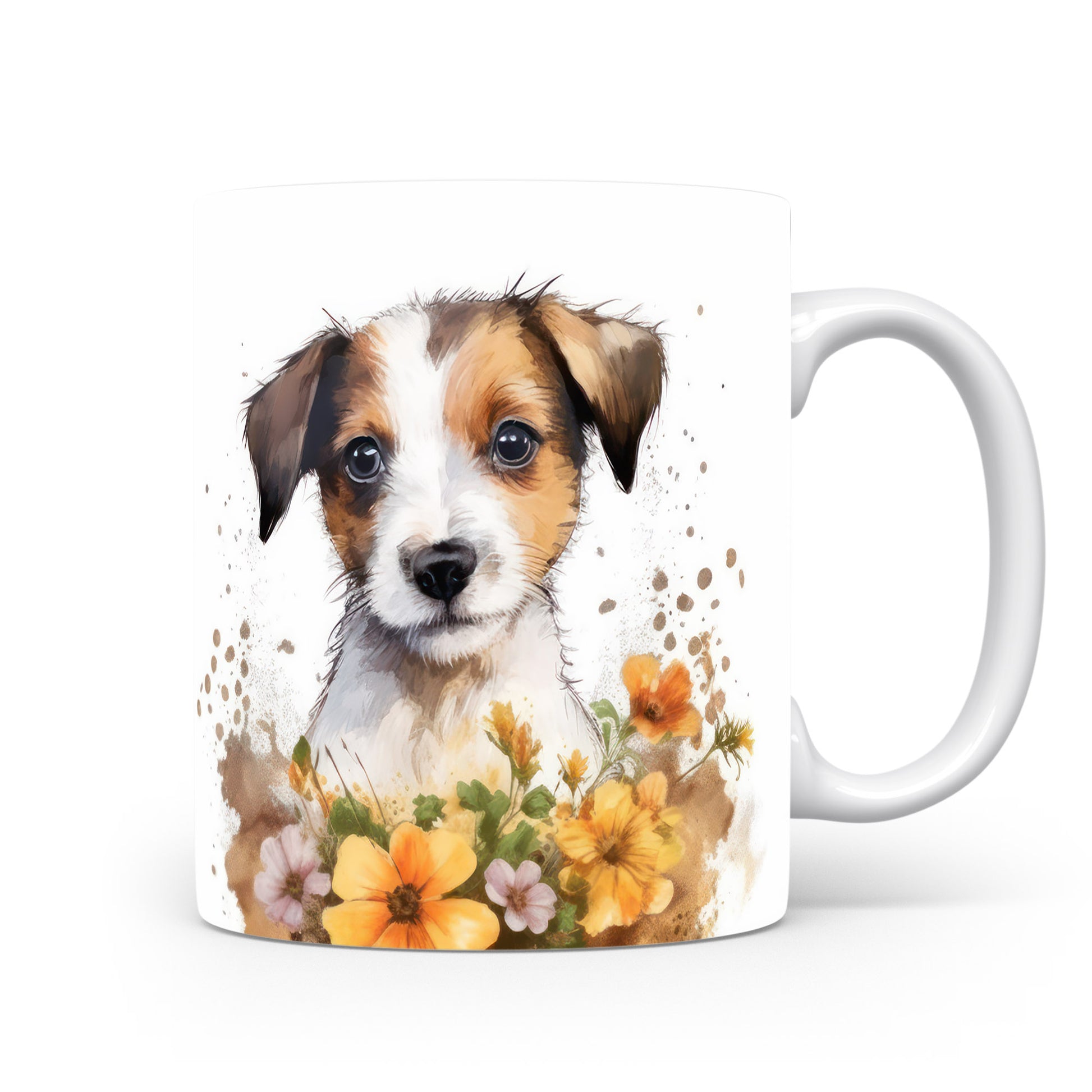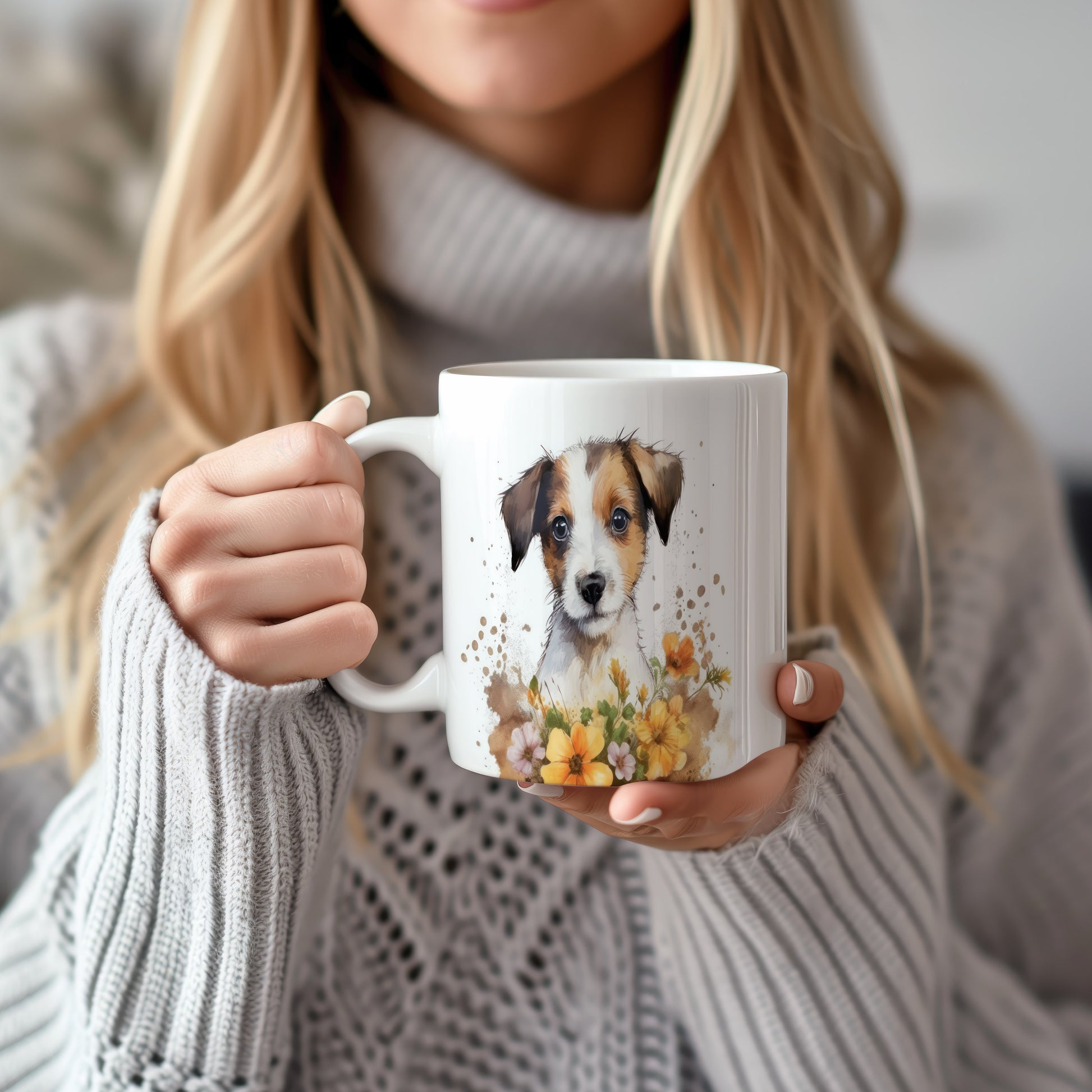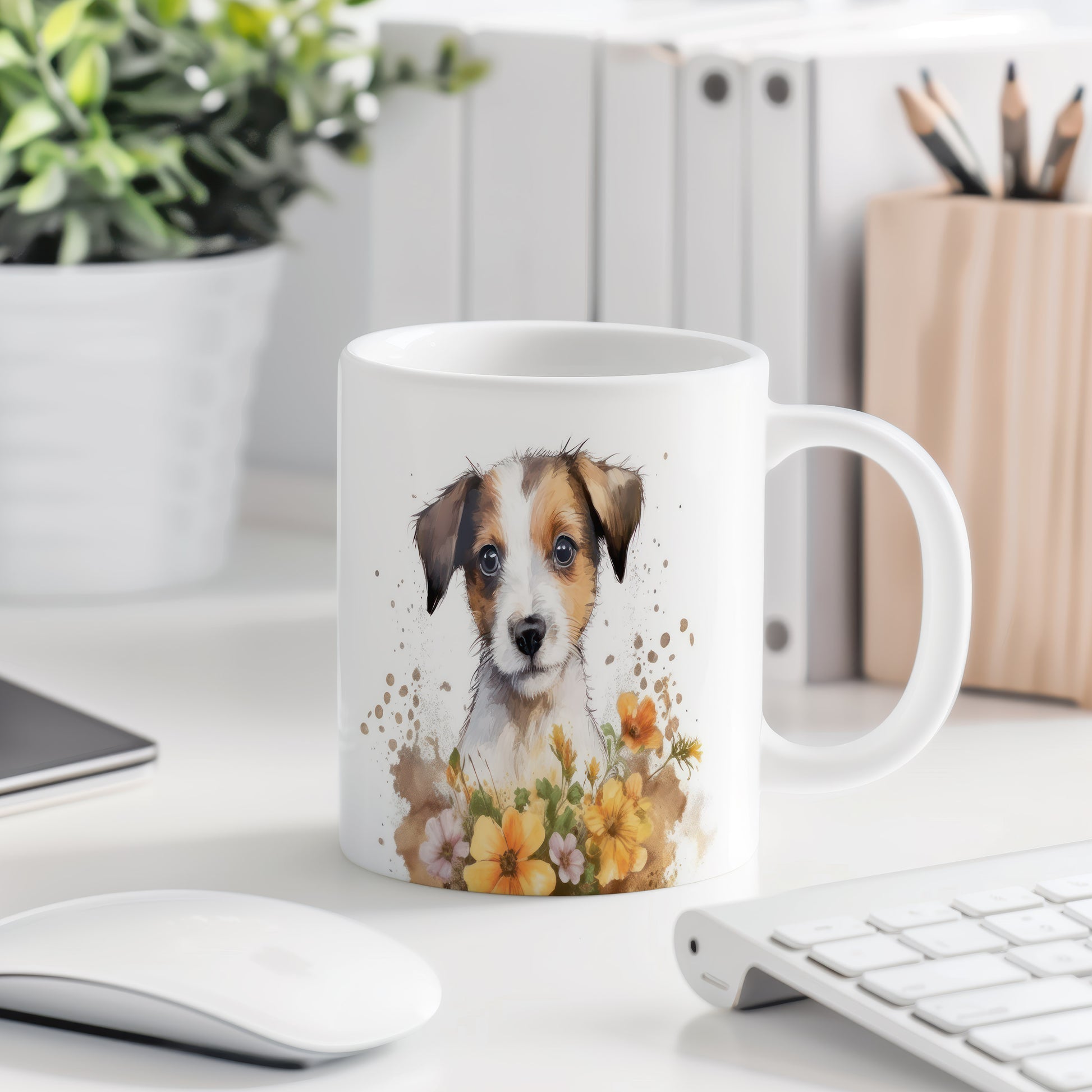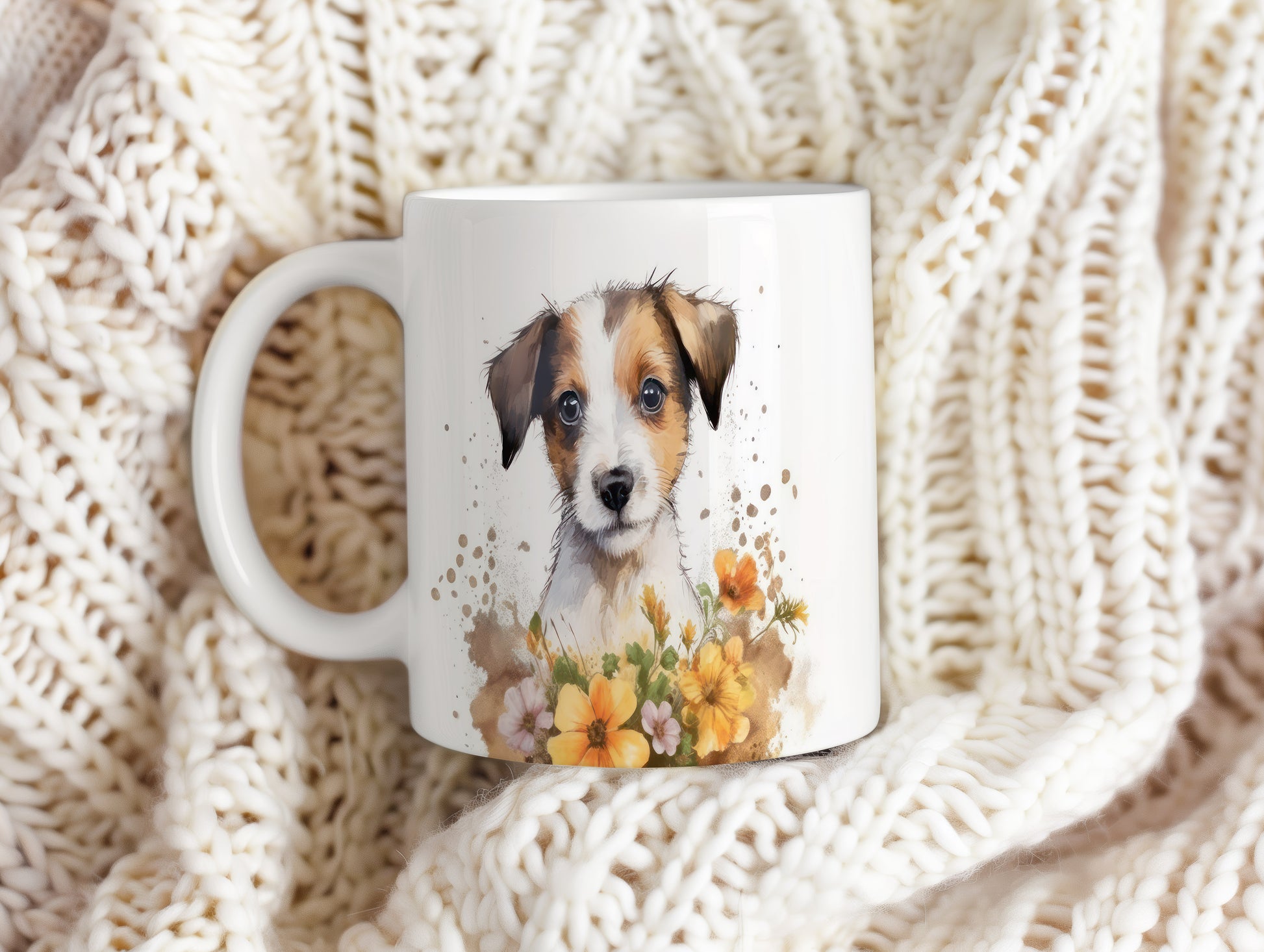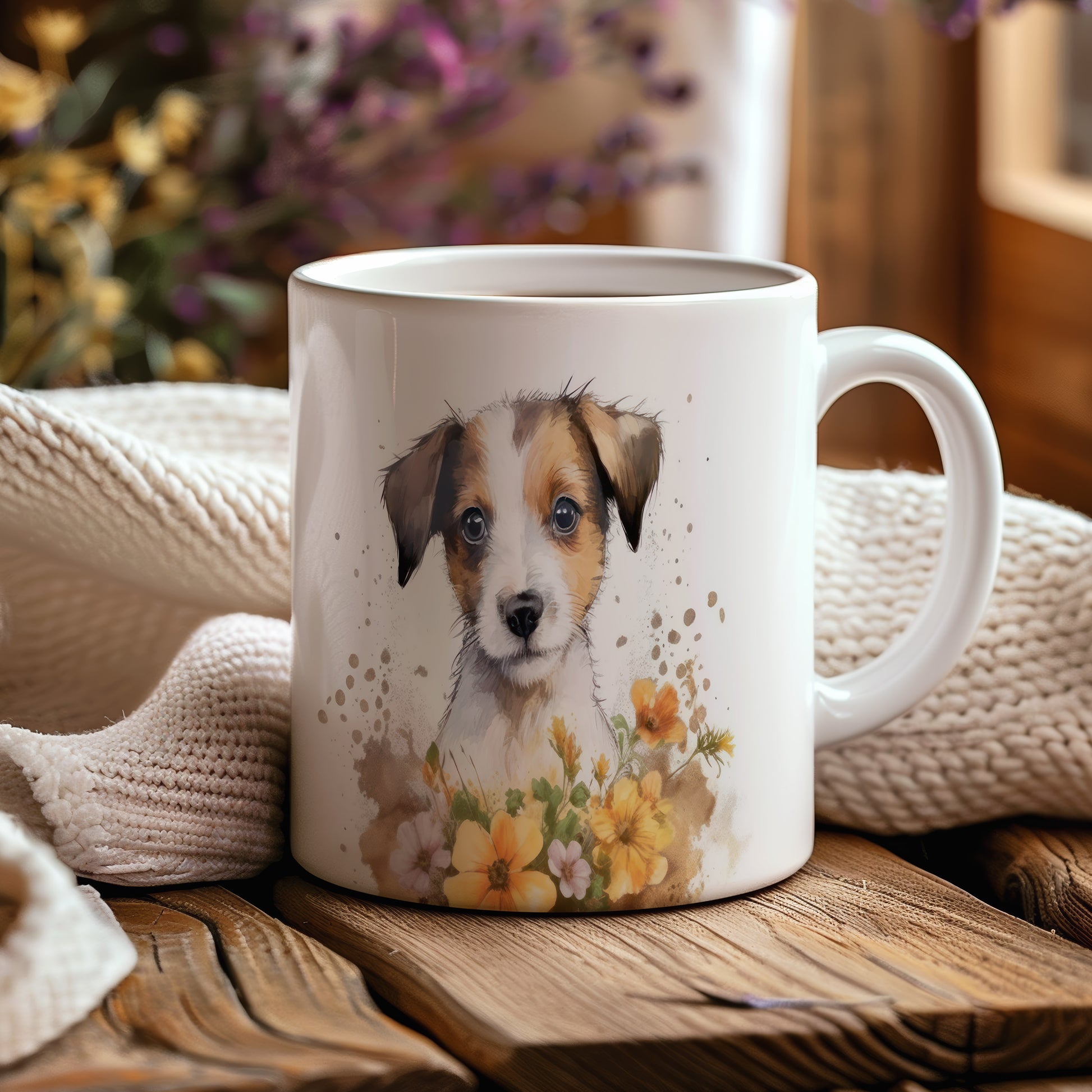 Tento hrnek s obrázkem štěněte obklopeného květinami je ideální pro milovníky psů. Užijte si svůj oblíbený nápoj s tímto stylovým kouskem, který oživí váš stůl.