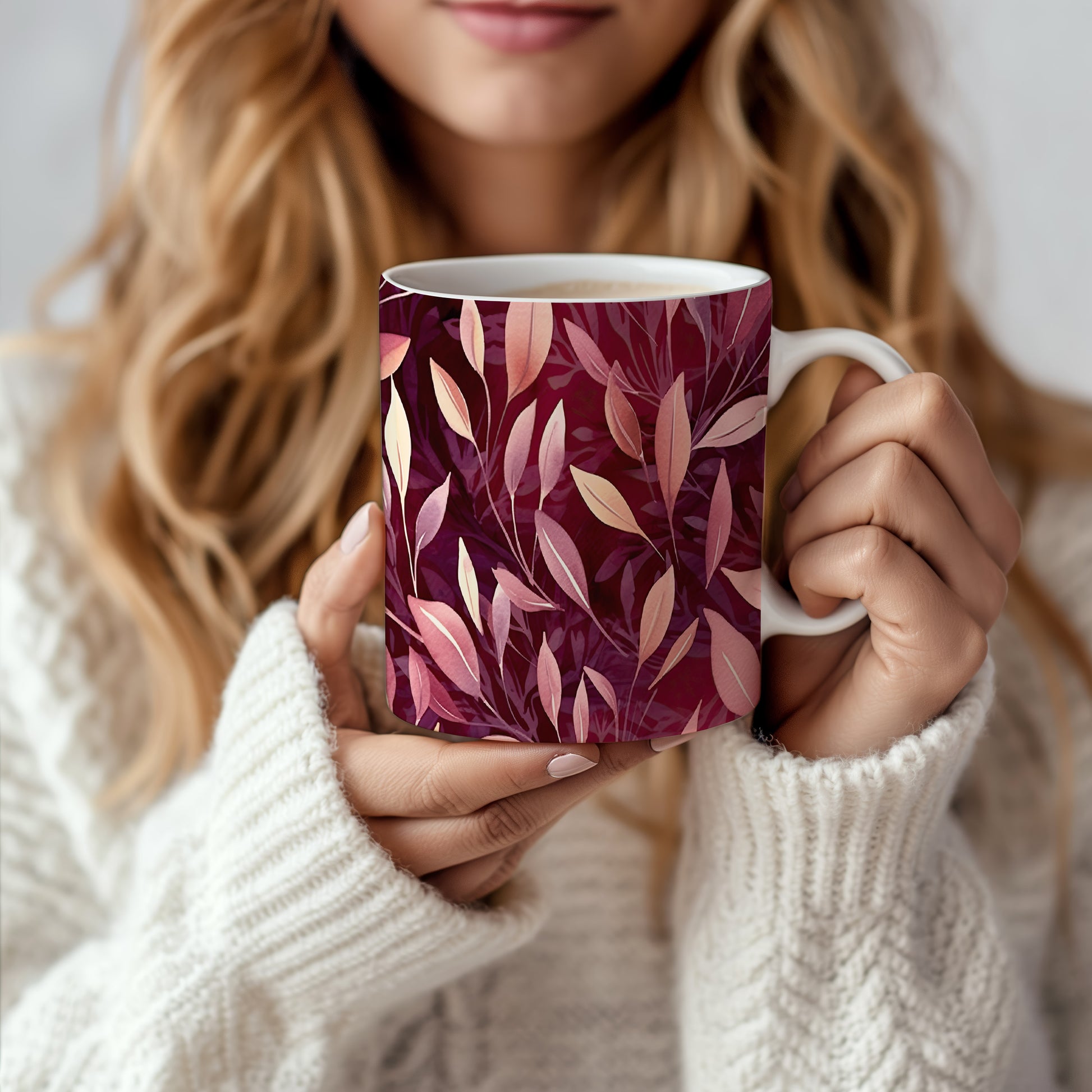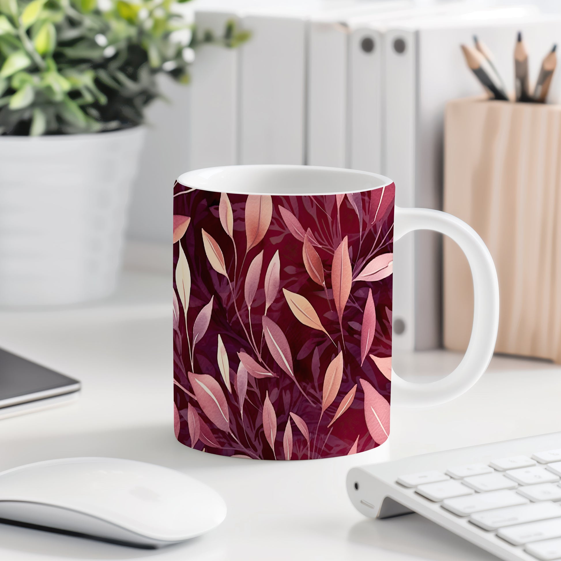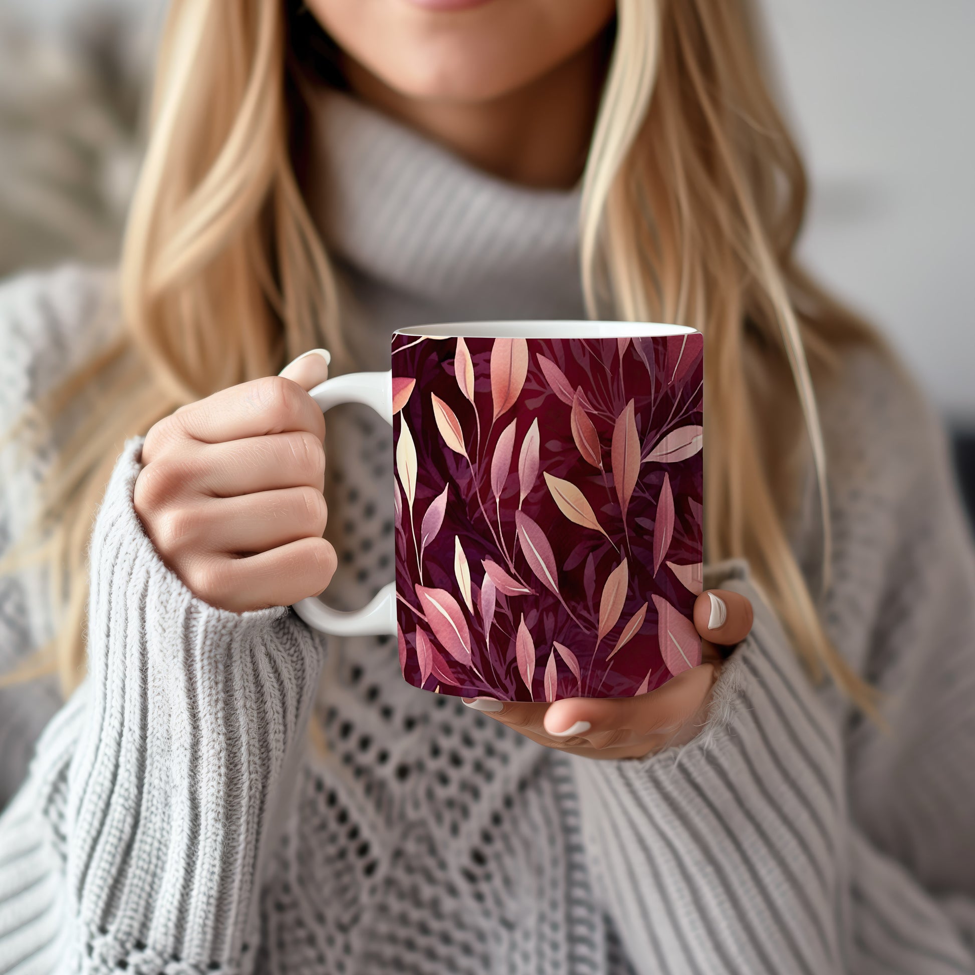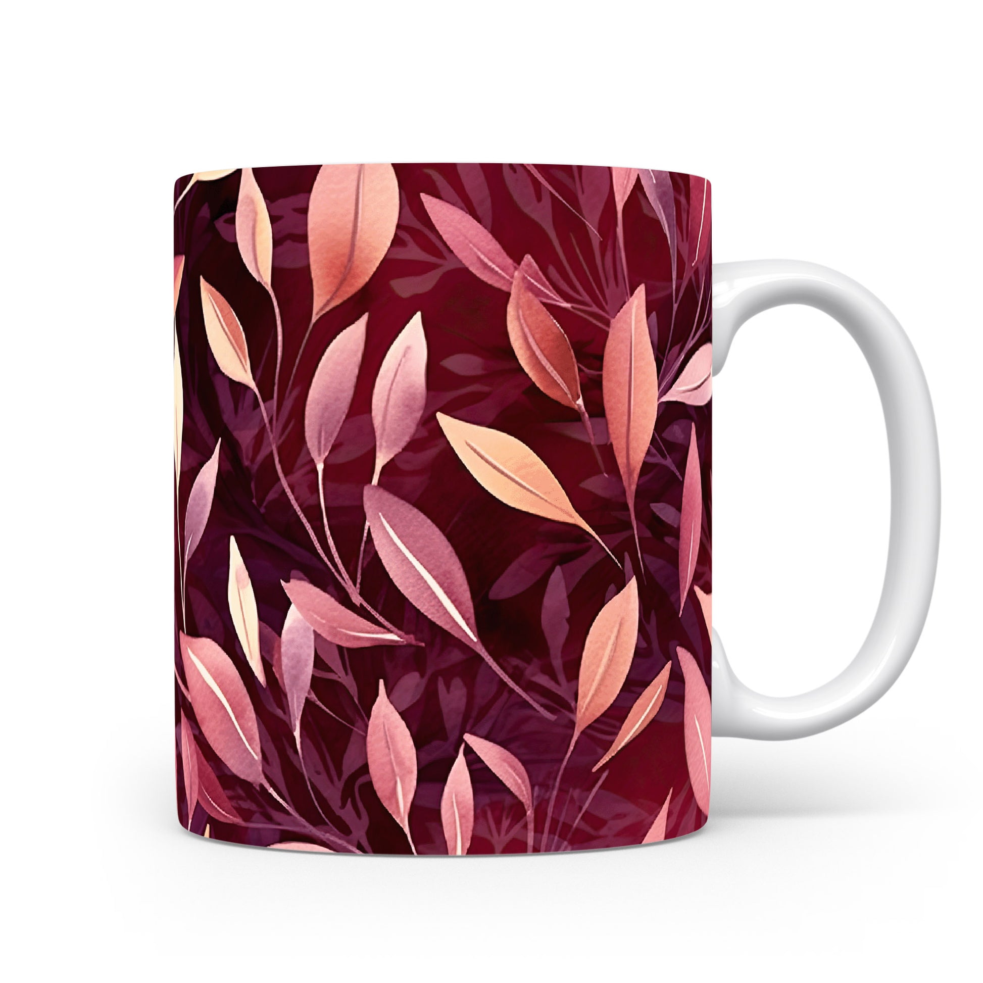 Tento hrnek s jemným designem barevných listů vyniká na tmavém pozadí. Ideální pro každodenní používání nebo jako stylový dárek.